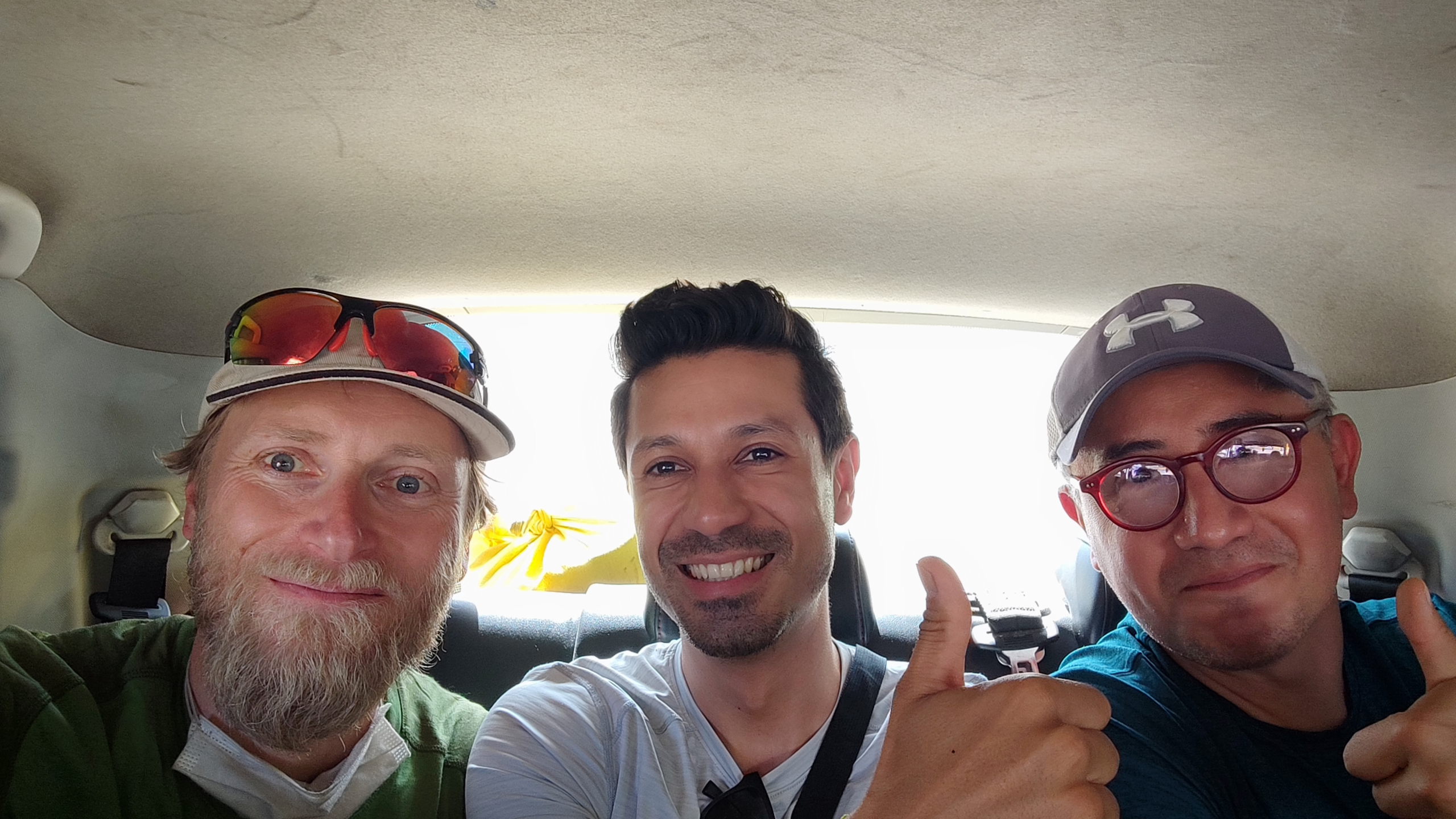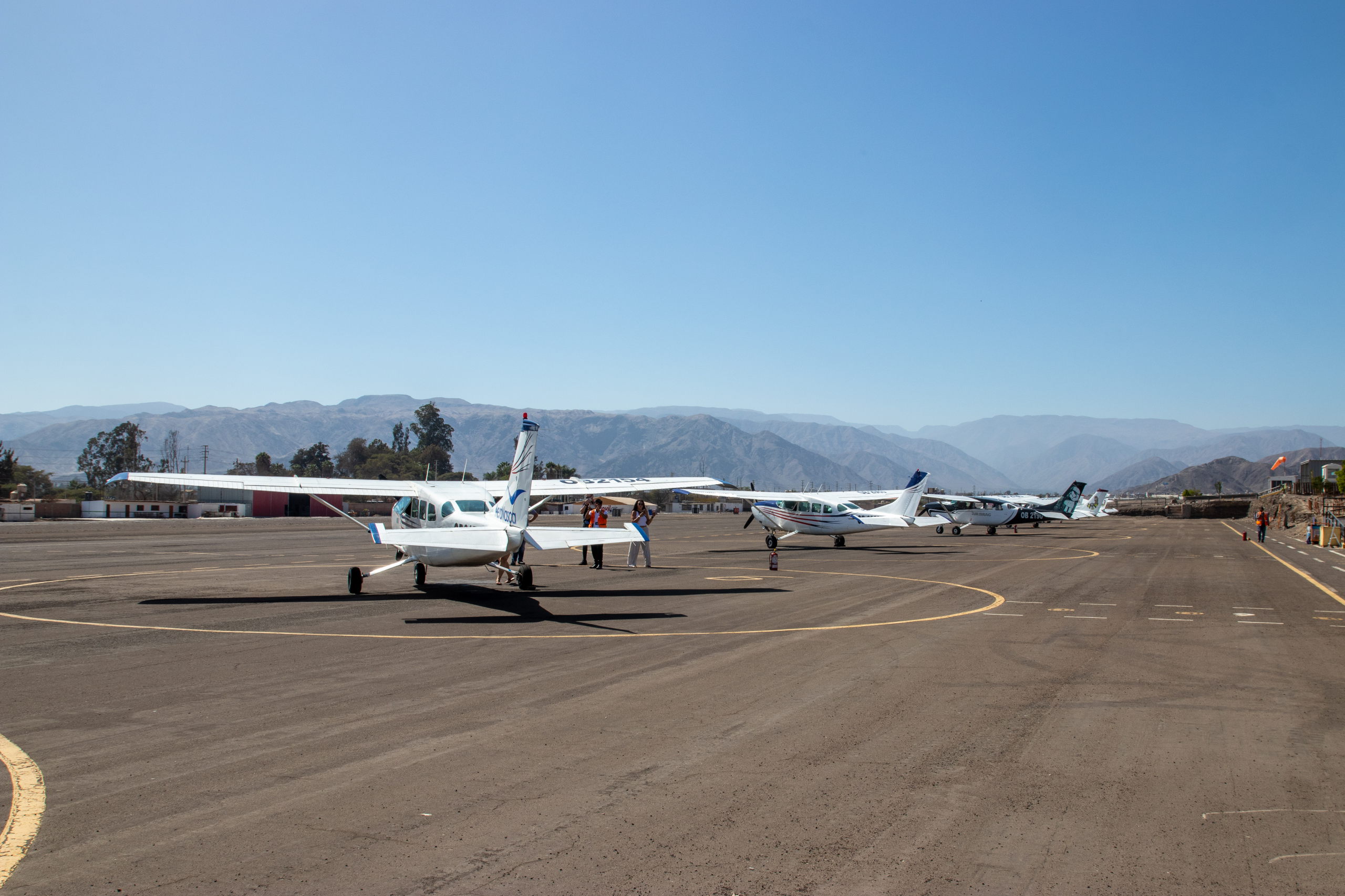 Die Musik hat mich gut eingeschläfert und so habe ich von der Höhe über 4600 m fast nichts mitbekommen. Als wir die Berge hinunter fahren werde ich wach und wir erreichen gegen neun Uhr Nazca, wo schon ein Mann mit einem Schild mit meinem Namen wartet. Super. Endlich. 😁 Alfonso und Enrique stehen auch drauf, denn sie haben ebenfalls einen Flug über die Nazca-Linien gebucht. Wir deponieren unser Gepäck, gehen frühstücken und werden zum Flughafen gefahren. Nach dem Entrichten der Gebühren lässt man uns kommentarlos warten.