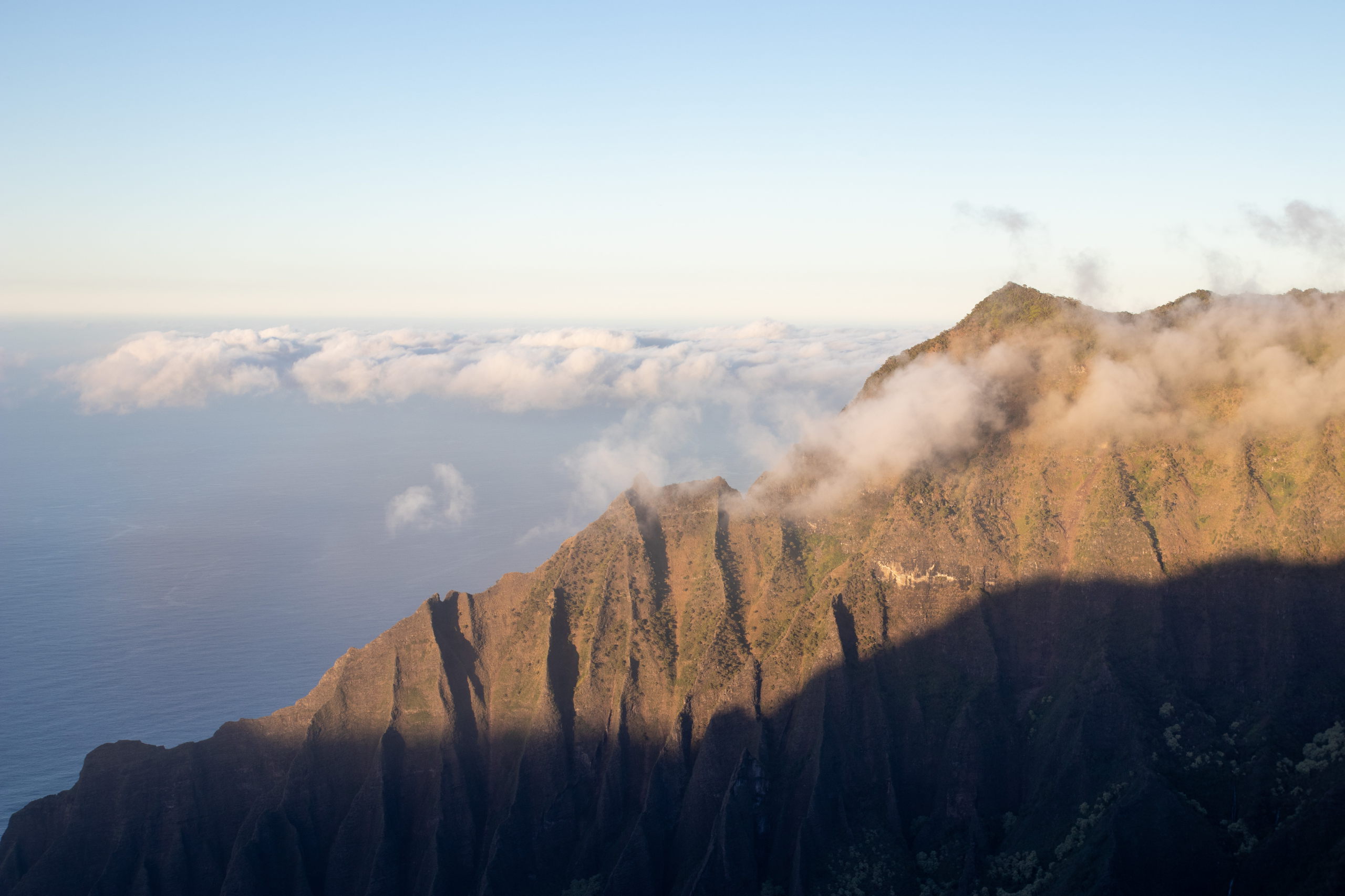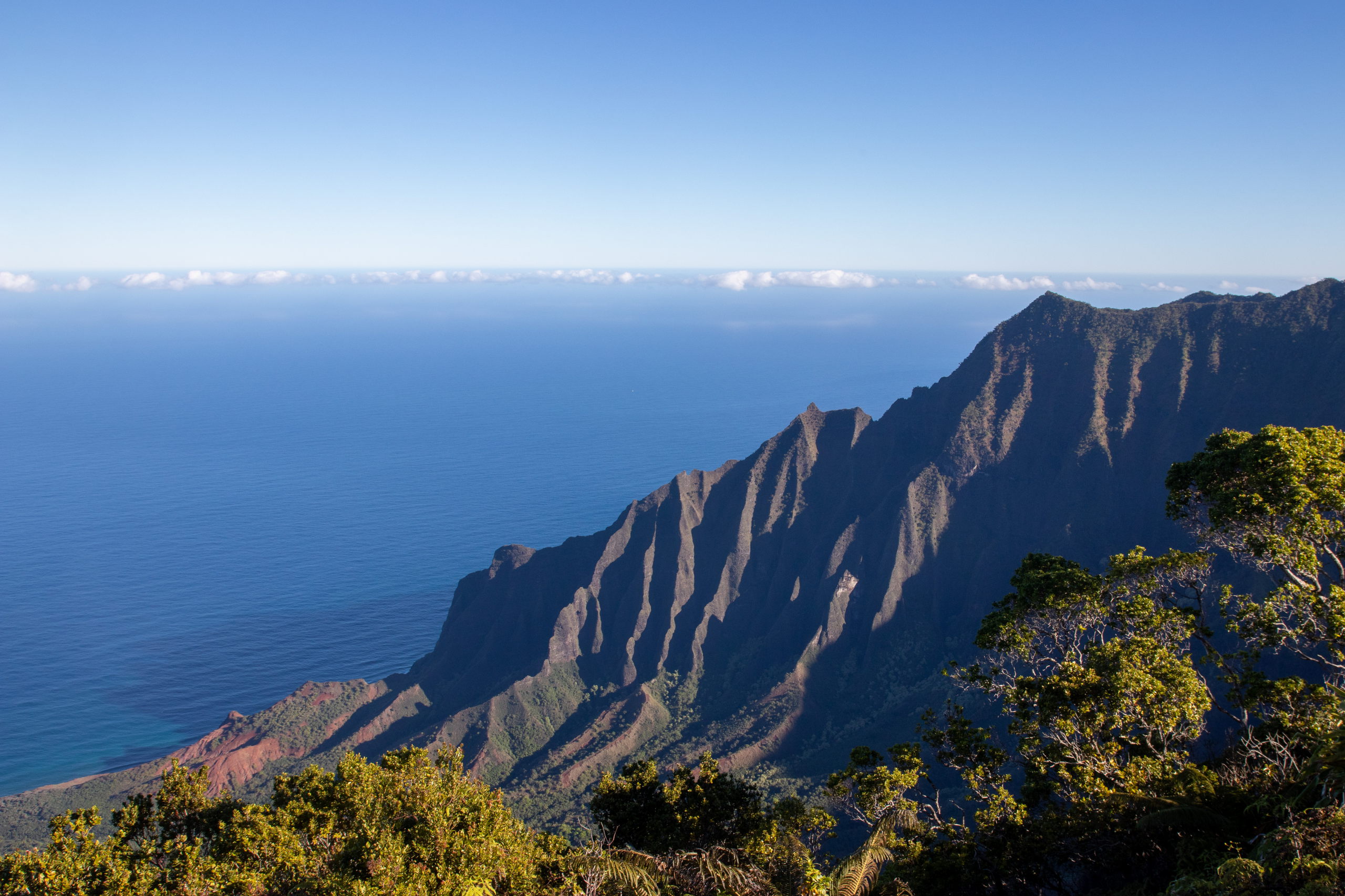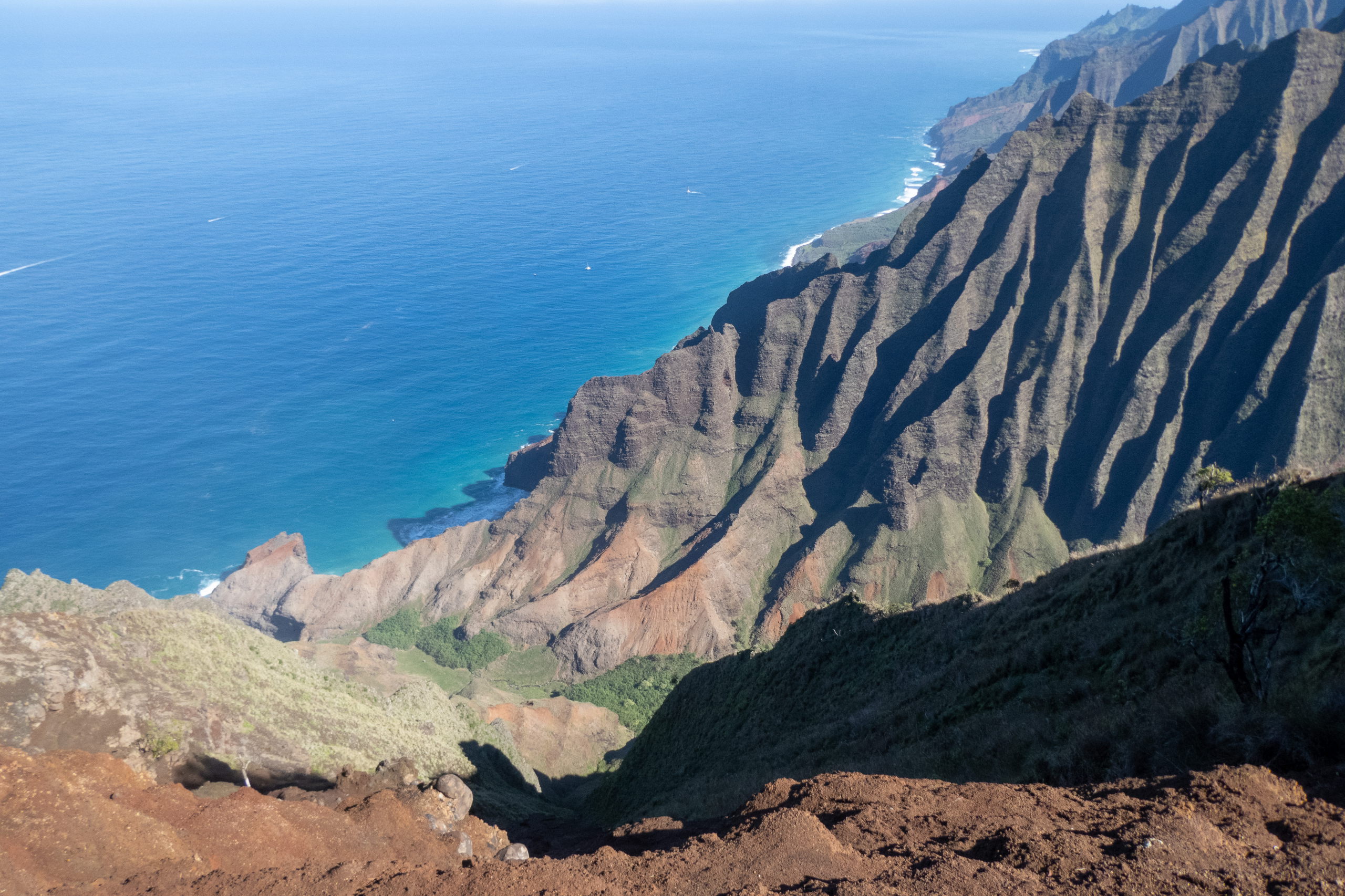 Vom Krähen der vielen Hähne werde ich je aus dem Schlaf gerissen, schaffe es aber noch eine Runde länger zu mützen. Schnell alles abgebaut, “fein säuberlich“ in den Kofferraum „geschlichtet“ und schon geht es los zum Pu’u O Kila Lookout mit super Sicht auf einen der steilen Bergrücken. Im Tal ist es noch sehr schattig, ein Morgenflug mit dem Hubschrauber wäre also nicht ideal. Ähnlich sieht es beim Kalalau Lookout aus.