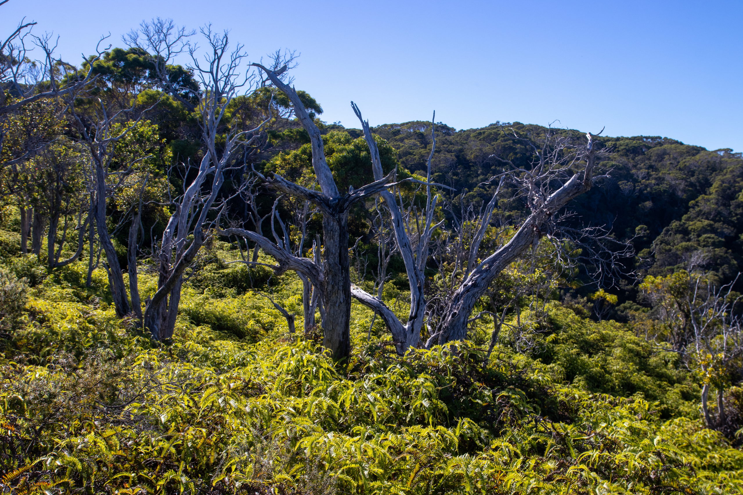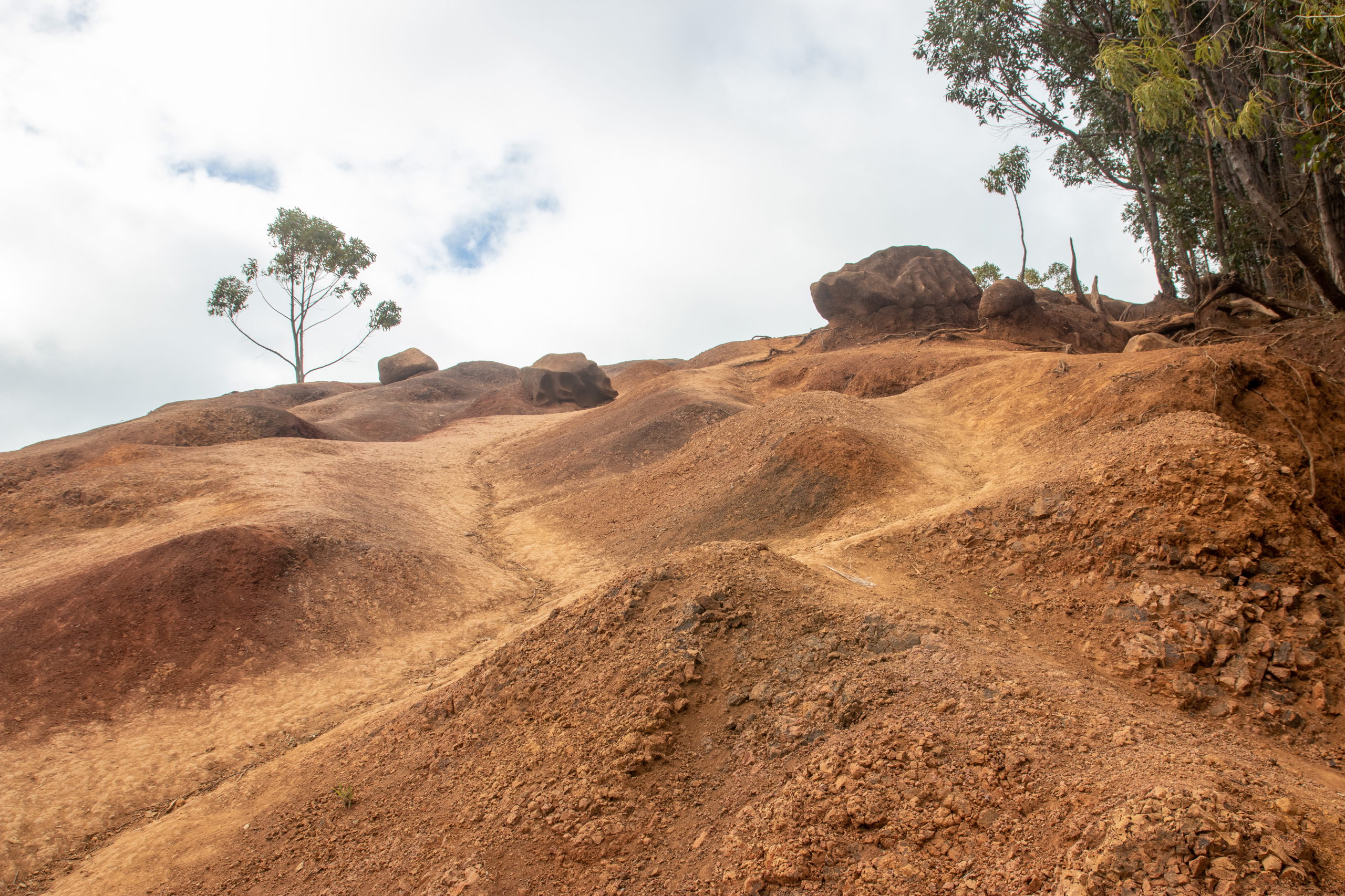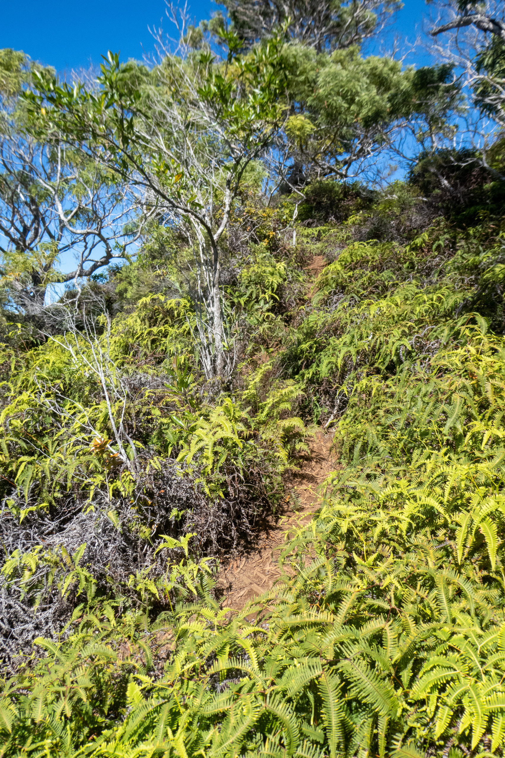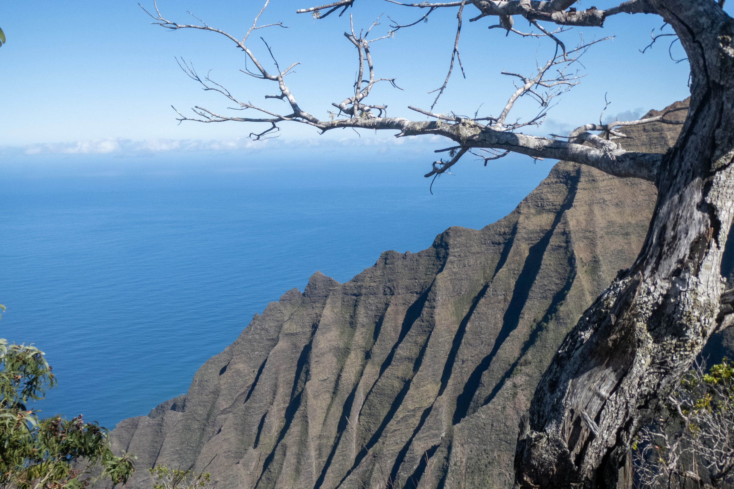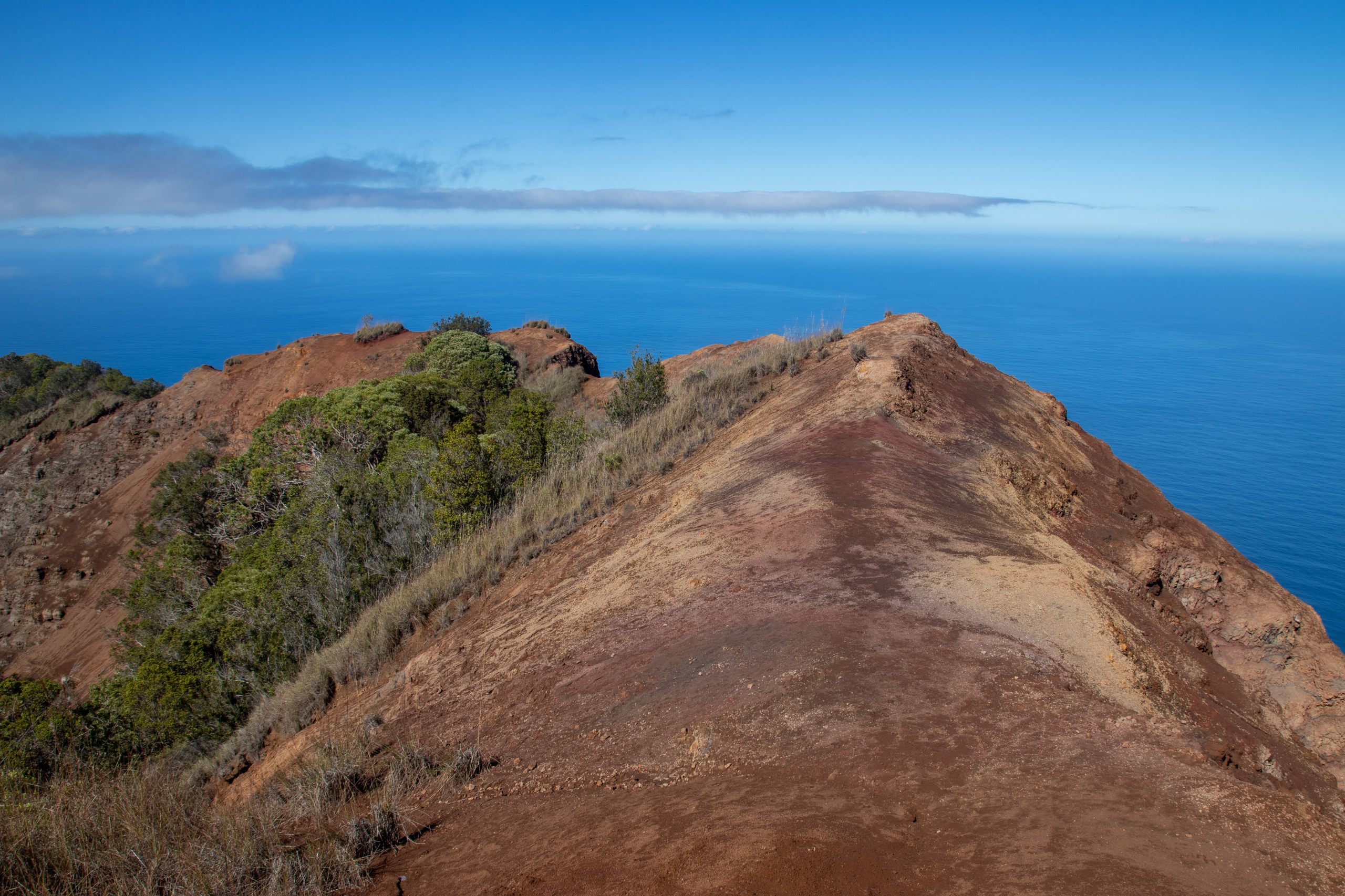 An einem unscheinbaren Parkplatz direkt an der Straße stelle ich das Auto ab, packe mein Zeug in den Rucksack und starte gegen zehn Uhr mit der Wanderung entlang dem Nua’lolo Trail. Der Weg führt die meiste Zeit durch den Wald und ist matschig und extrem rutschig. Teilweise geht es einen Zaun entlang, der zum Schutz der einheimischen Tiere und Pflanzen errichtet wurde, sodass keine Ziegen oder andere Tiere rein können und sich Krankheiten verbreiten. Sieht nach einer bescheidenen Wanderung aus. Viele umgefallene Bäume liegen am Weg. Mal geht es darüber, mal unten durch. Und dann die erste Aussicht auf einen für Kauai typischen, schroffen Bergrücken. Wow, echt genial.