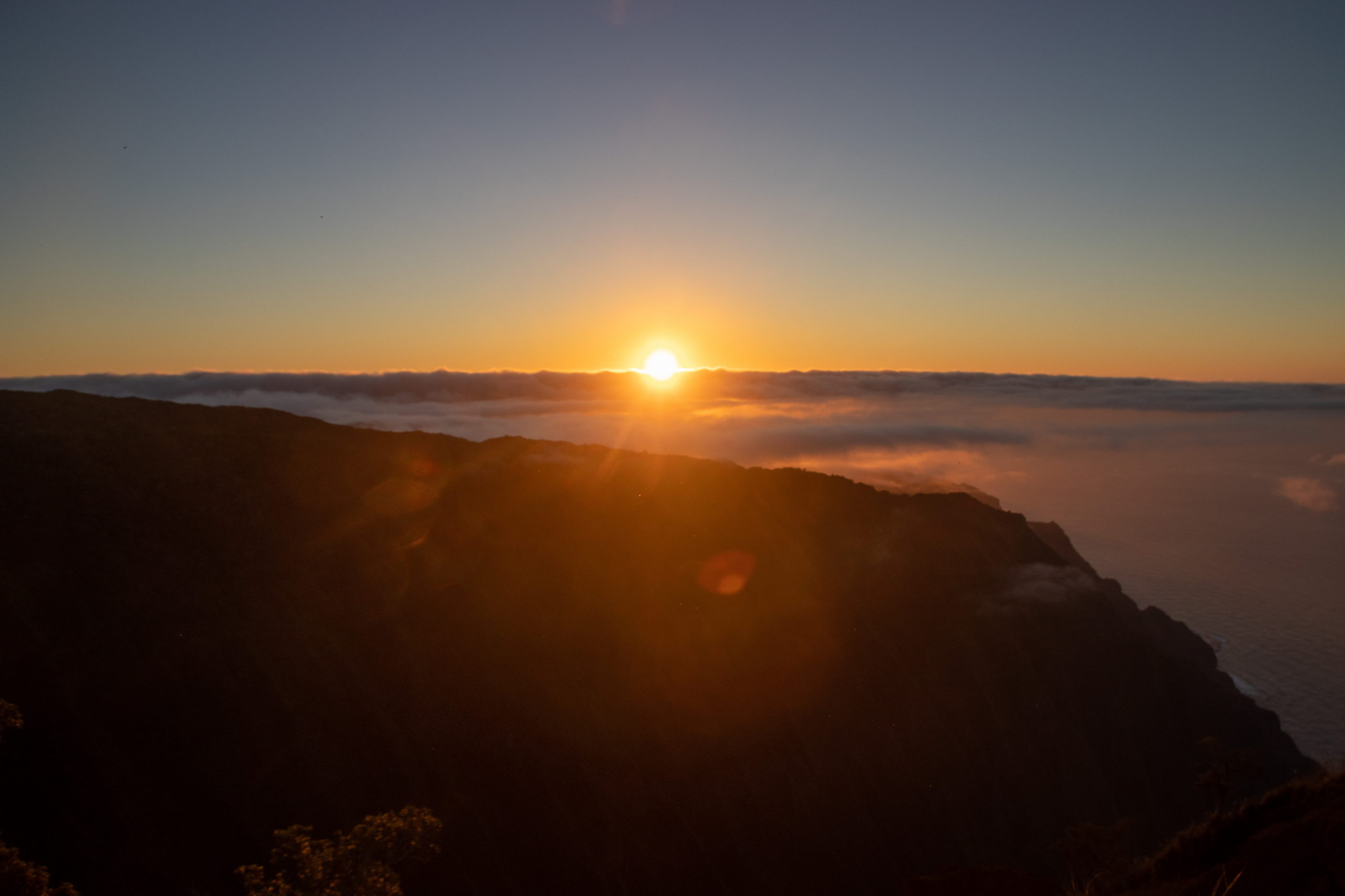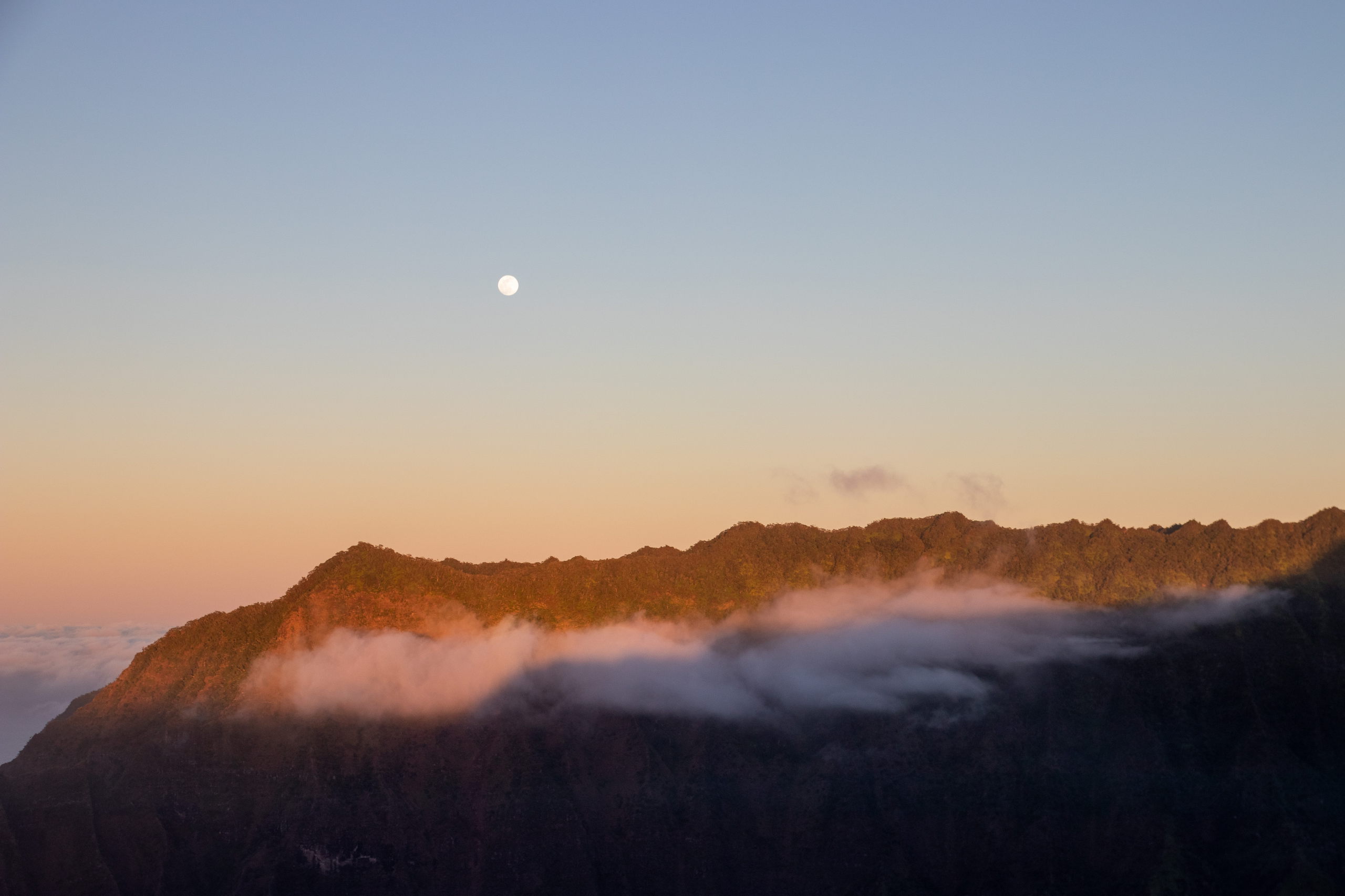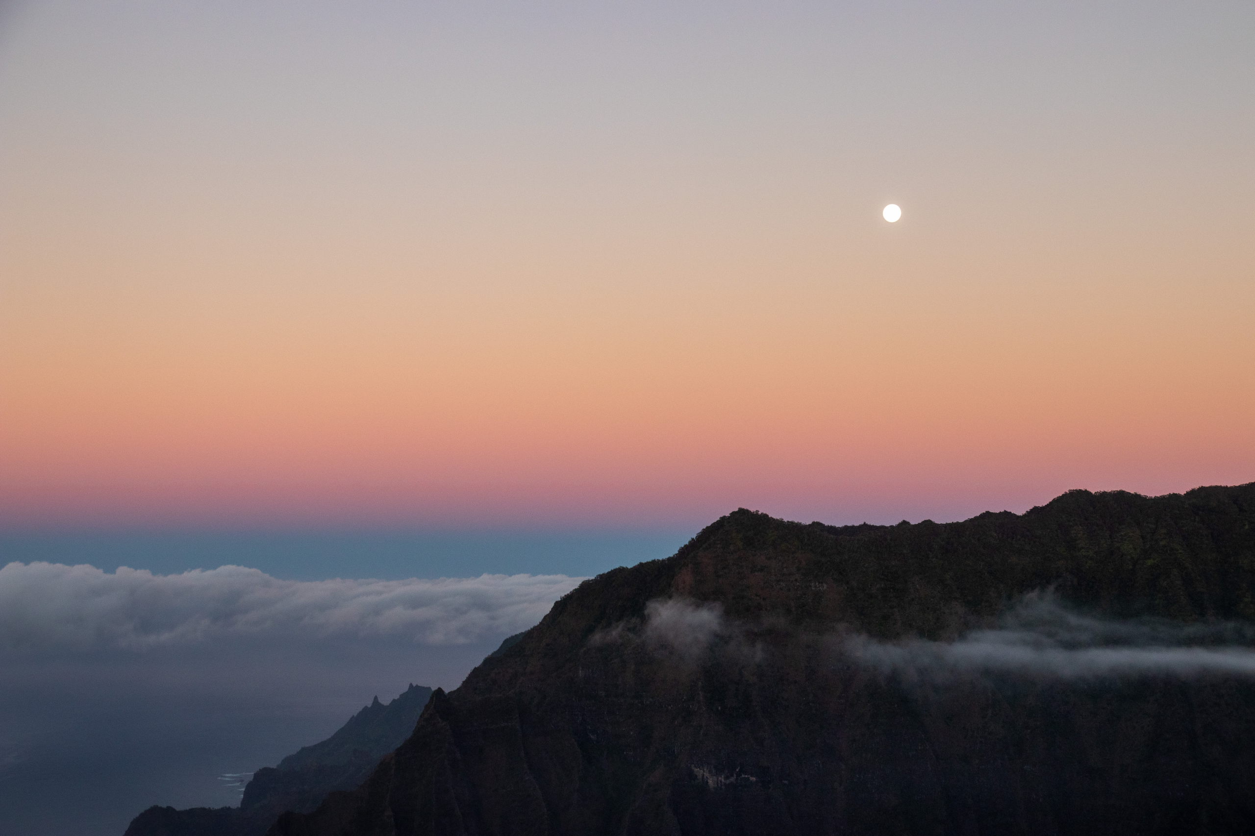 Auf der Fahrt zum Kalepa Ridge Trail bemerke ich, dass mein kleiner Finger entzündet ist. Hoffentlich legt sich das bald wieder. Ich schnappe meinen Rucksack und wandere entlang des Bergrückens los. Anscheinend hat es hier am Nachmittag geregnet, da es noch rutschiger ist als am Vormittag. Aber auch hier entschädigt der Ausblick. Das wissen außer mir auch noch sechs andere junge Leute. Fünf davon sind barfuß unterwegs. 😳 Ich frage, ob es so weniger rutschig ist. Nein, aber dafür tut es mehr weh als mit Schuhen. Ahja, ich verstehe. Als es fast finster ist, gehe ich beim letzten Licht der Dämmerung und im Schein des Vollmondes zurück zum Auto. Am Kokee Camp wasche ich mir den gröbsten Dreck ab und fülle meinen Wasservorrat auf. Hunger. Hmmm, wenn ich schon Pause mache, kann ich mir bei der Gelegenheit gleich noch zwei SPAM-Wraps reinziehen.