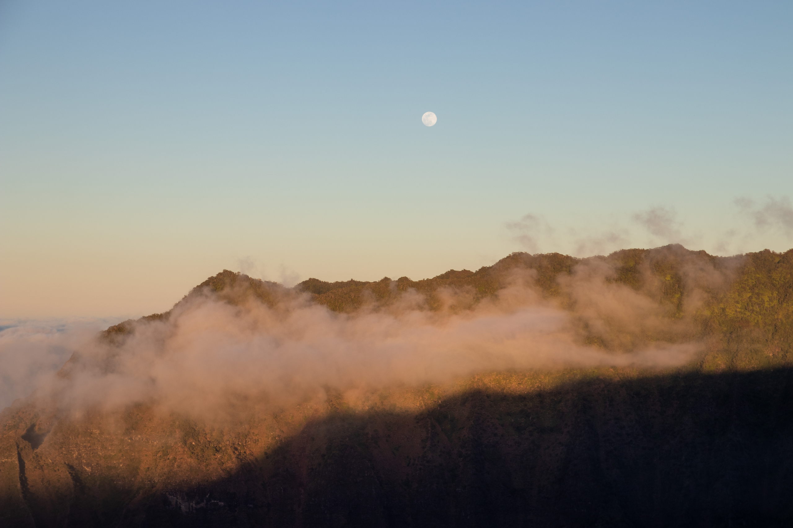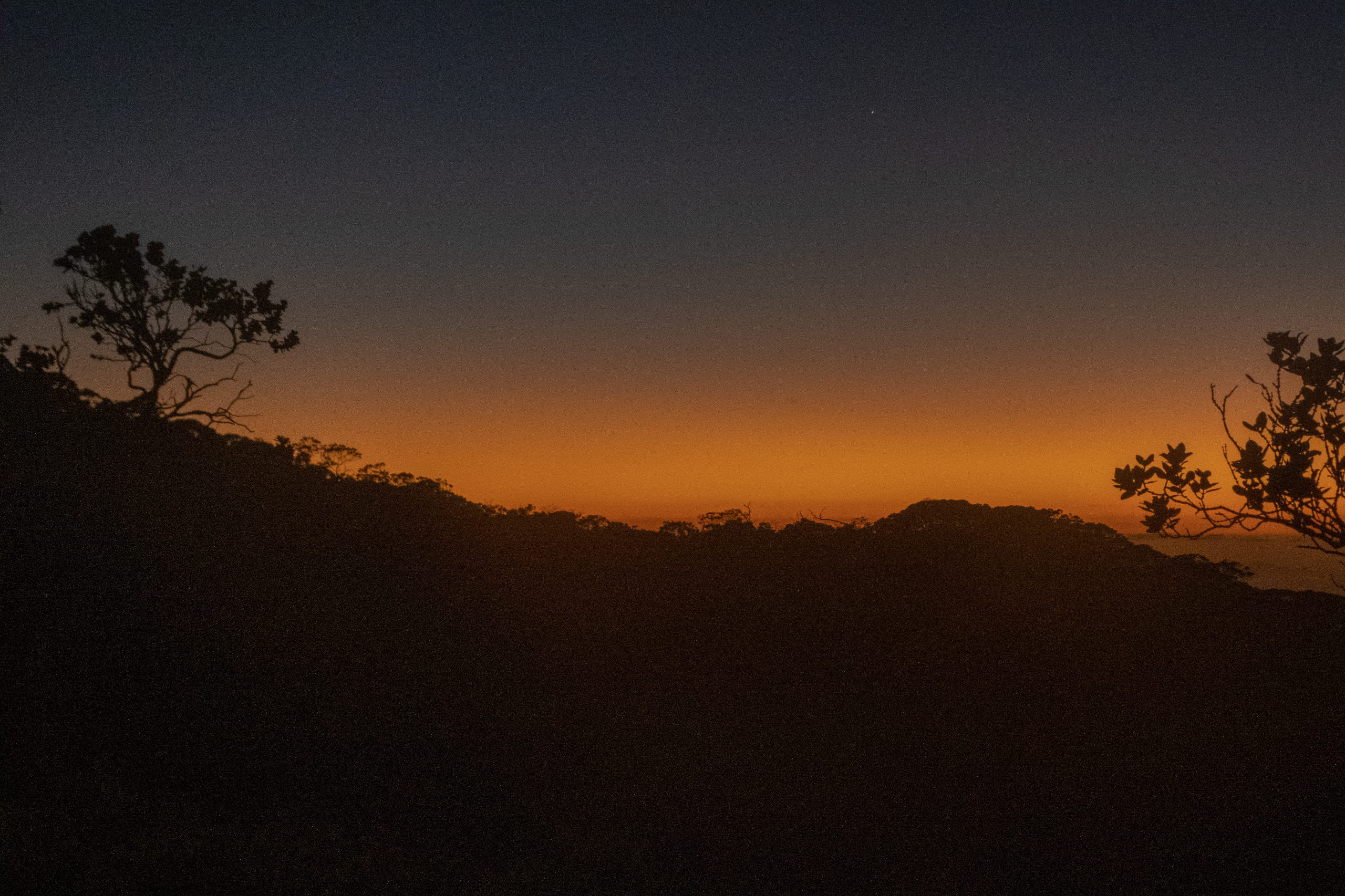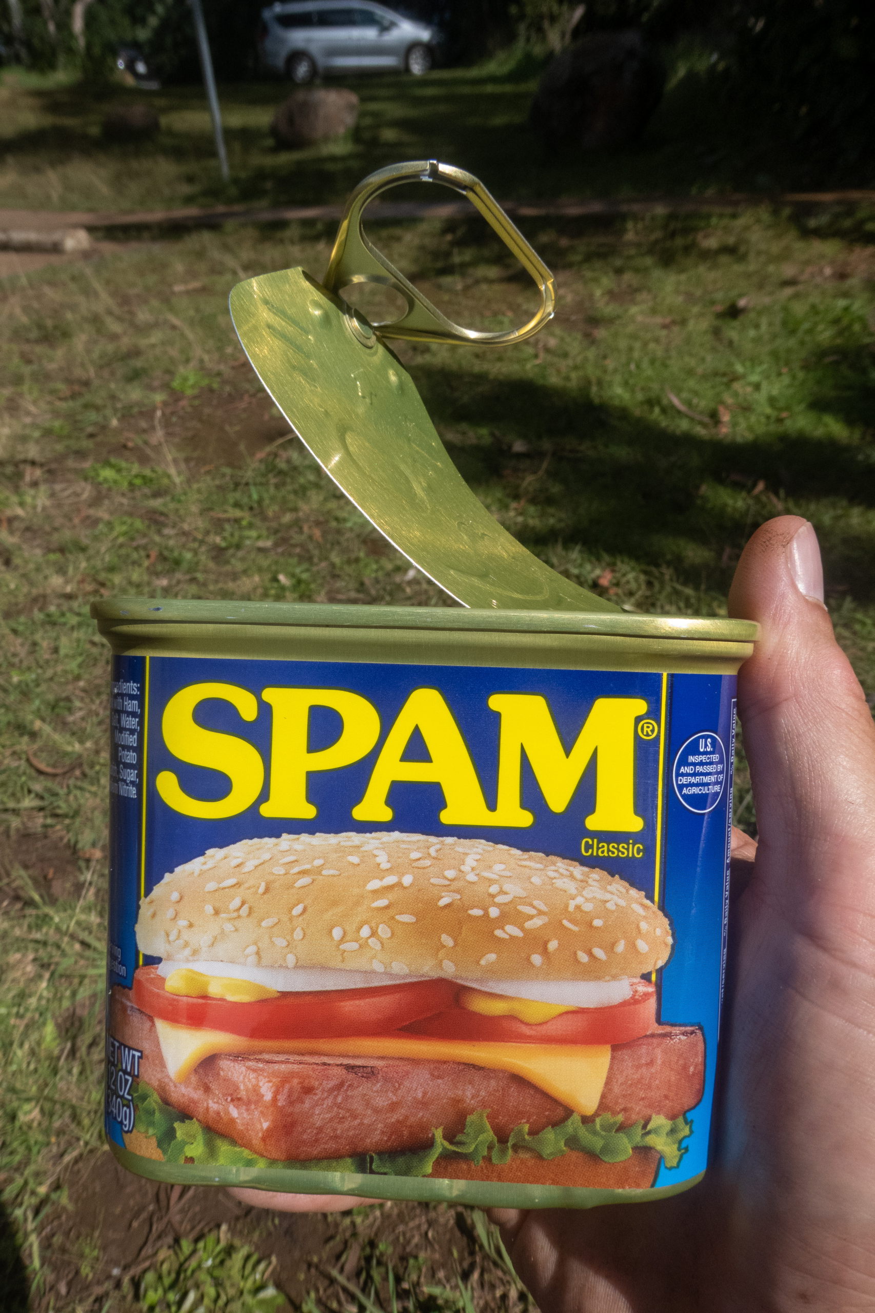 Auf der Fahrt zum Kalepa Ridge Trail bemerke ich, dass mein kleiner Finger entzündet ist. Hoffentlich legt sich das bald wieder. Ich schnappe meinen Rucksack und wandere entlang des Bergrückens los. Anscheinend hat es hier am Nachmittag geregnet, da es noch rutschiger ist als am Vormittag. Aber auch hier entschädigt der Ausblick. Das wissen außer mir auch noch sechs andere junge Leute. Fünf davon sind barfuß unterwegs. 😳 Ich frage, ob es so weniger rutschig ist. Nein, aber dafür tut es mehr weh als mit Schuhen. Ahja, ich verstehe. Als es fast finster ist, gehe ich beim letzten Licht der Dämmerung und im Schein des Vollmondes zurück zum Auto. Am Kokee Camp wasche ich mir den gröbsten Dreck ab und fülle meinen Wasservorrat auf. Hunger. Hmmm, wenn ich schon Pause mache, kann ich mir bei der Gelegenheit gleich noch zwei SPAM-Wraps reinziehen.