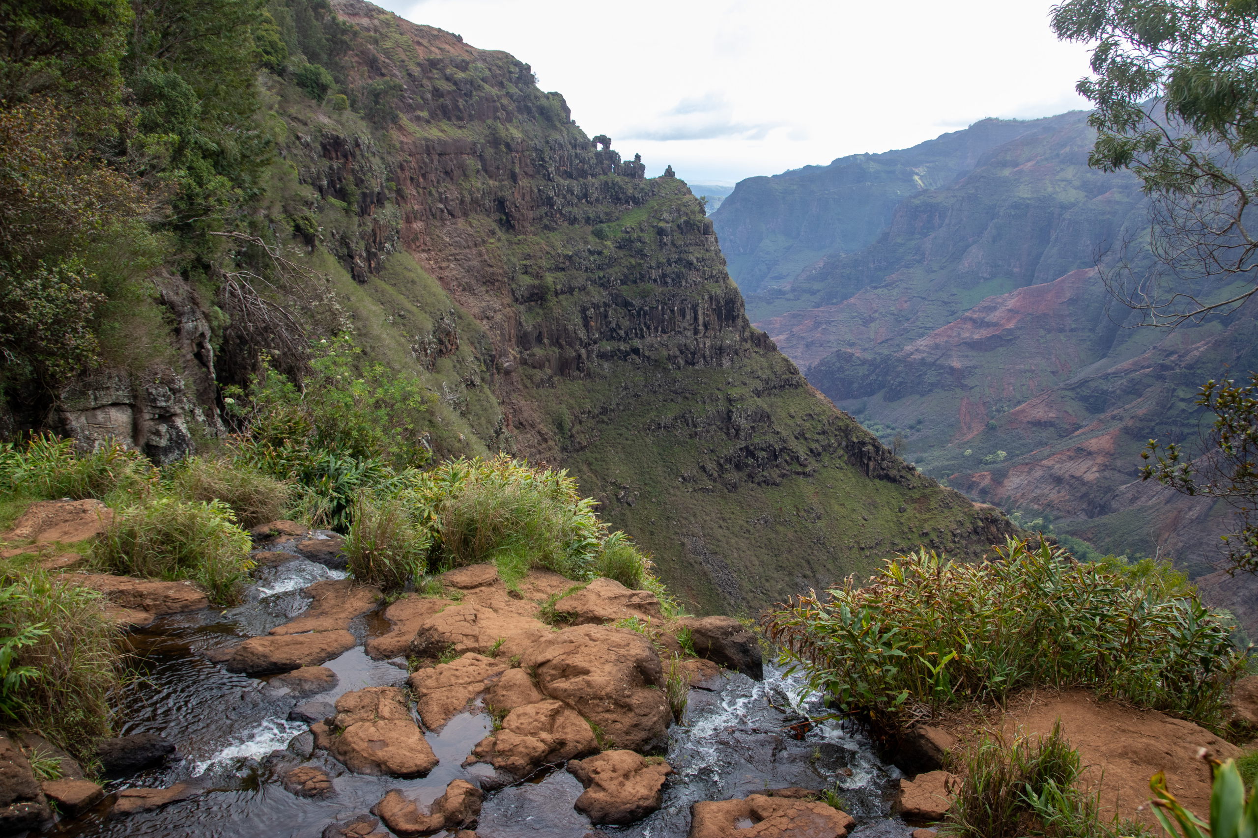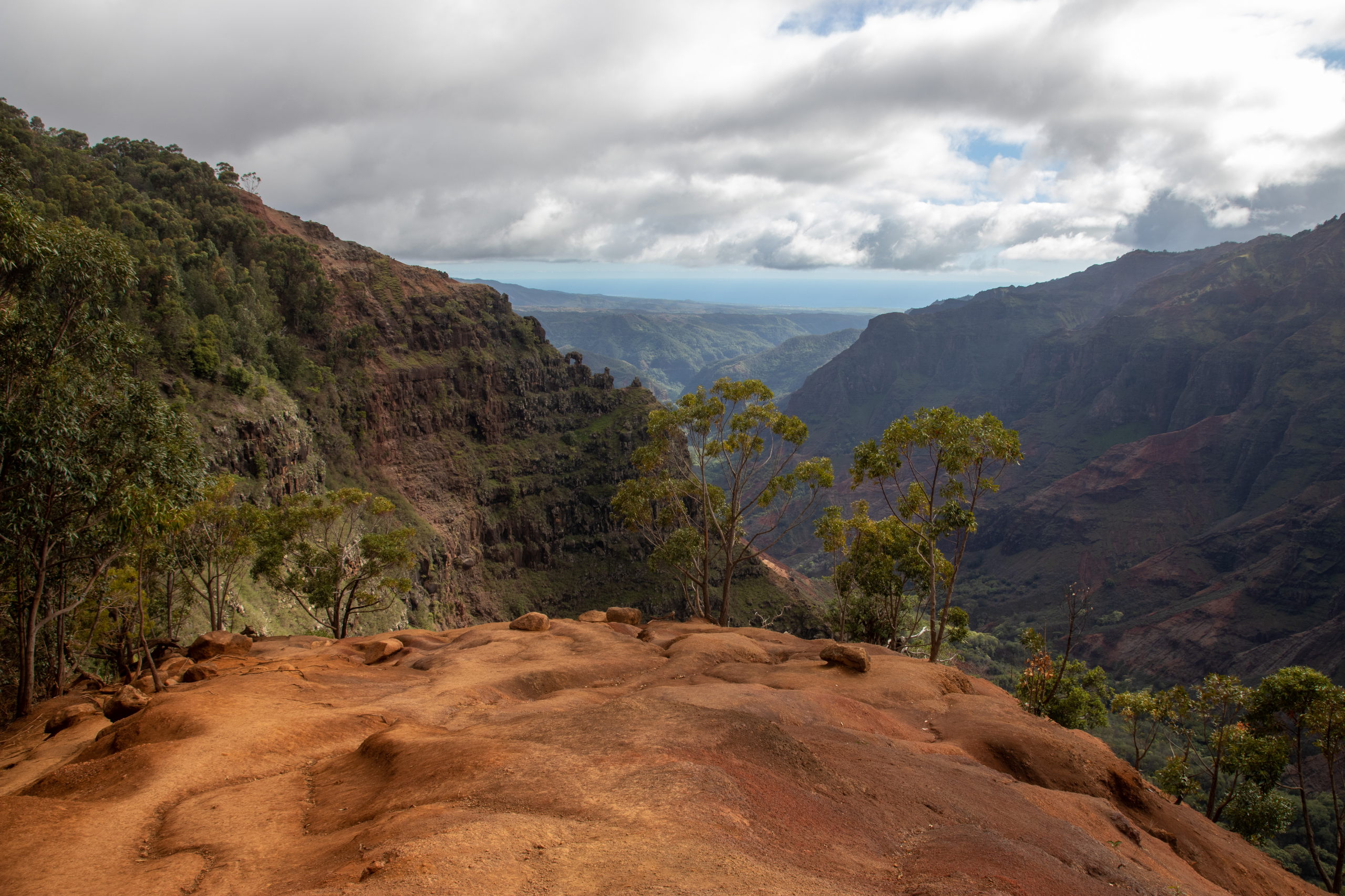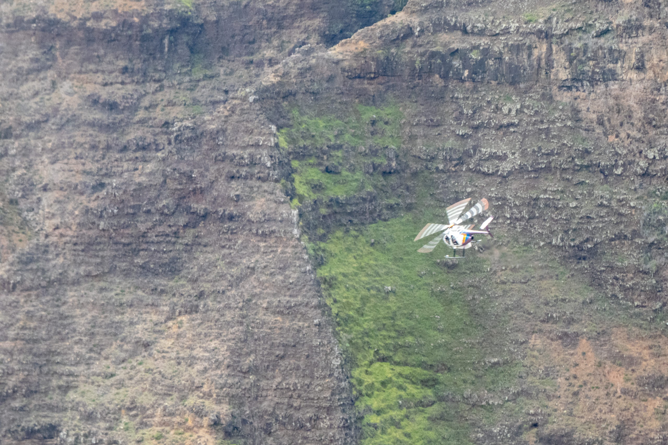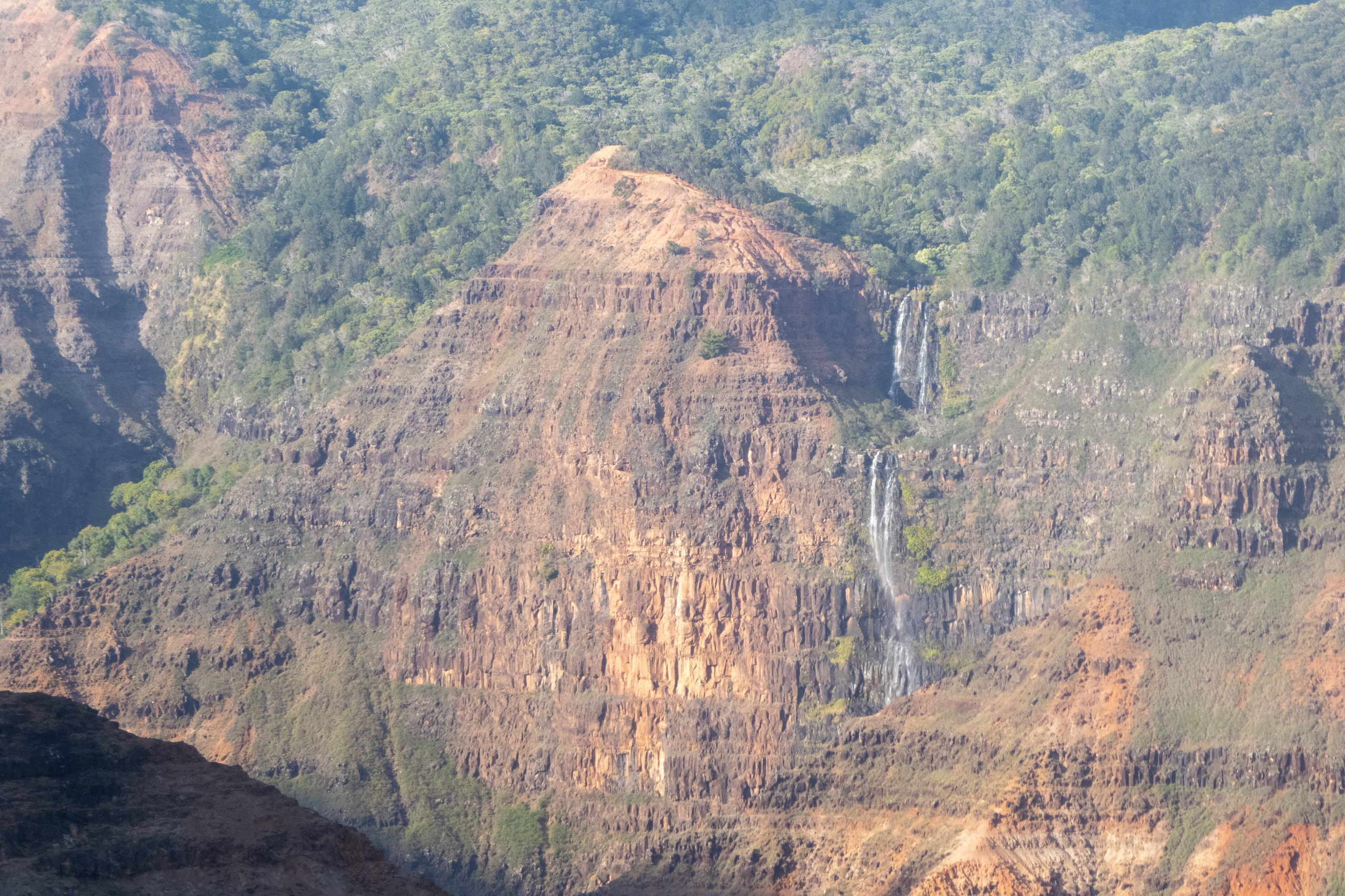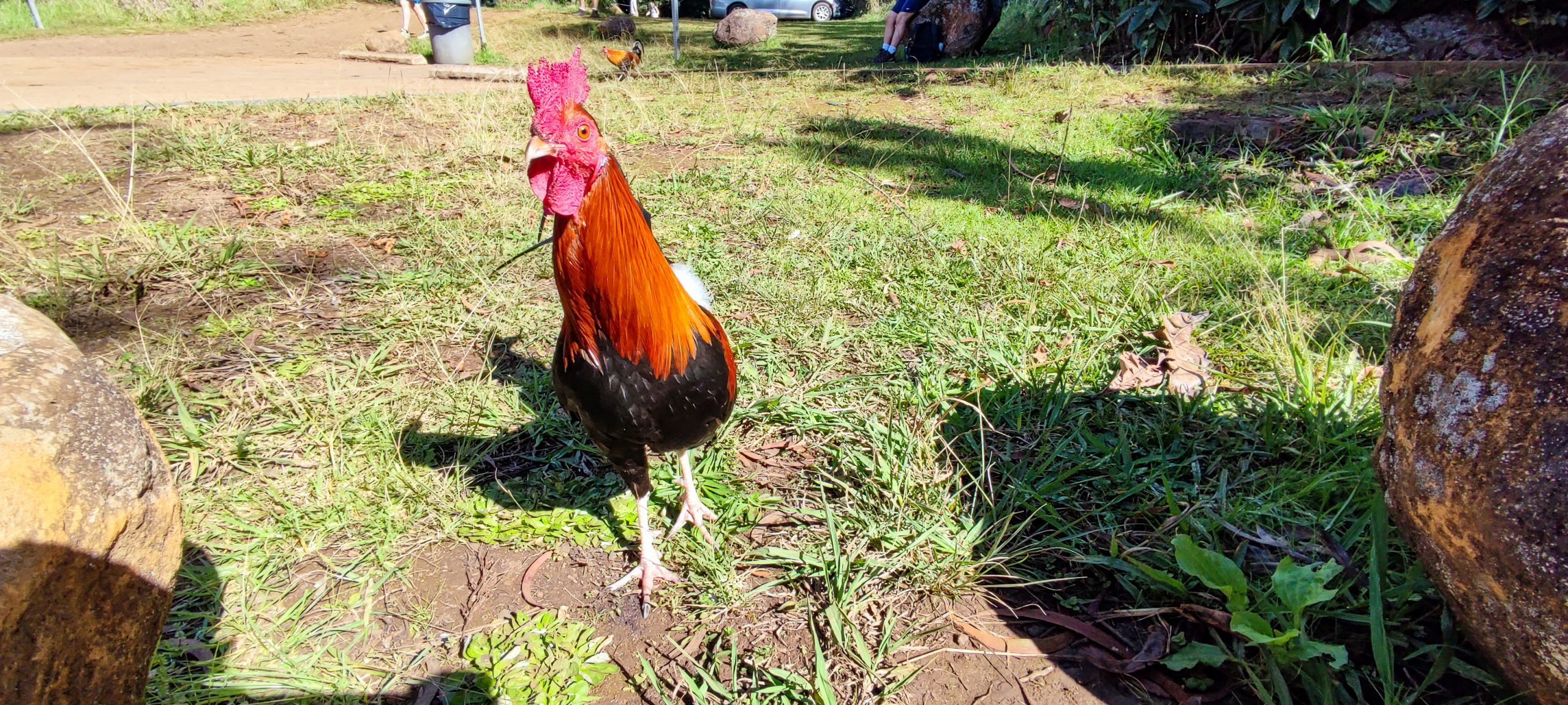 Nur eine kurze Fahrt entfernt liegt der Pu’u Hinahina Viewpoint, wo ich zu Mittag esse. Es gibt SPAM und ein aufdringlicher Hahn hätte gerne ein Stück davon. Oder zumindest vom Brot. Bevor ich mit dem Canyon Trail starte, gehe ich noch kurz zum Canyon Lookout, von dem aus man über den ganzen Waimea Canyon sieht. Wow. Entlang des Trails geht es immer abwärts bis zur Kante der Waipo’o Falls. Ich stelle mich direkt an die Kante, um nach unten zu blicken. Wow, da ist noch eine weitere Stufe zu sehen. Auch hier ist wieder reger Betrieb in der Luft und einer der Hubschrauber hupt mich an. Sieht vermutlich gefährlich aus, was ich hier mache. Am Rückweg höre ich eine Gruppe Deutsche sagen: “Der Typ am Wasserfall ist der von vorhin. Der sieht aus wie eine Bergziege, der weiß sicher, was er tut!”. Jp, so ist es. 😁