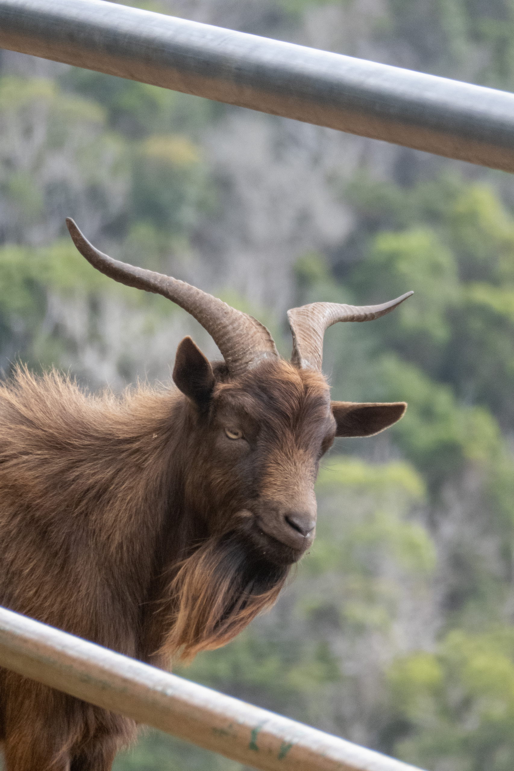 Kurz vor halb zwölf Uhr erreiche ich das Ende des Weges. Der Ausblick auf das Meer und die schroffen Bergrücken ist echt schön. Das wissen auch die Piloten der unzähligen Hubschrauber. Anscheinend ist gerade Rush Hour. Nachdem ich mich satt gesehen habe, mache ich mich auf den Rückweg. Etwas raschelt im Gebüsch. Eine Ziege sieht mich doof an. 😁