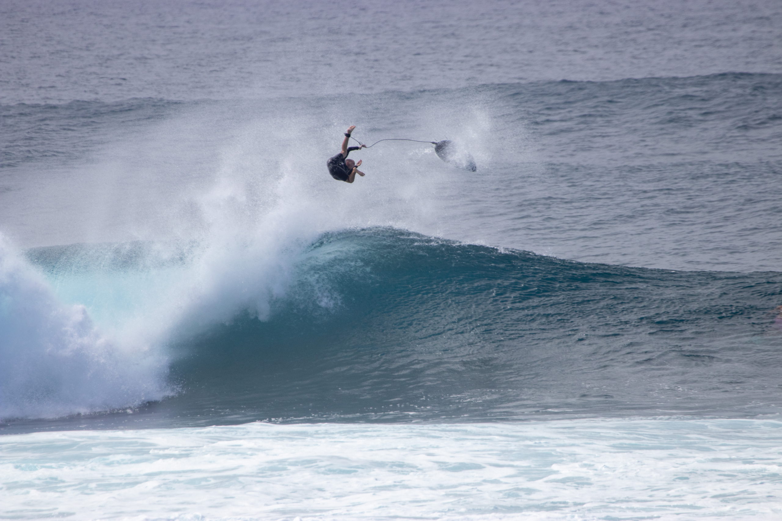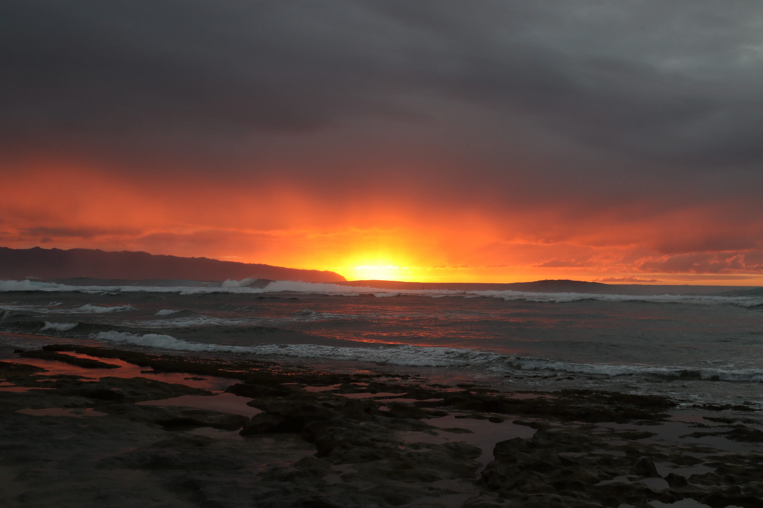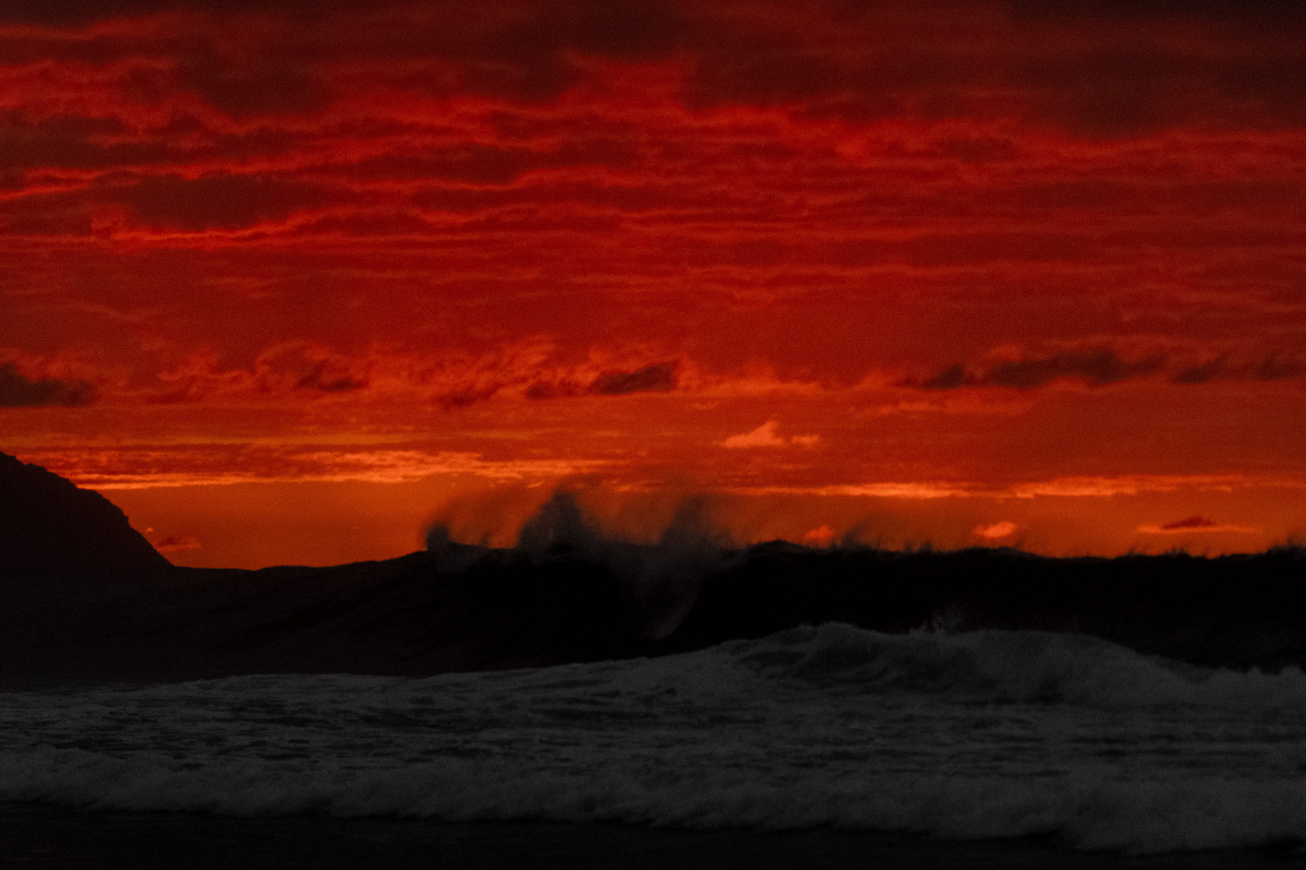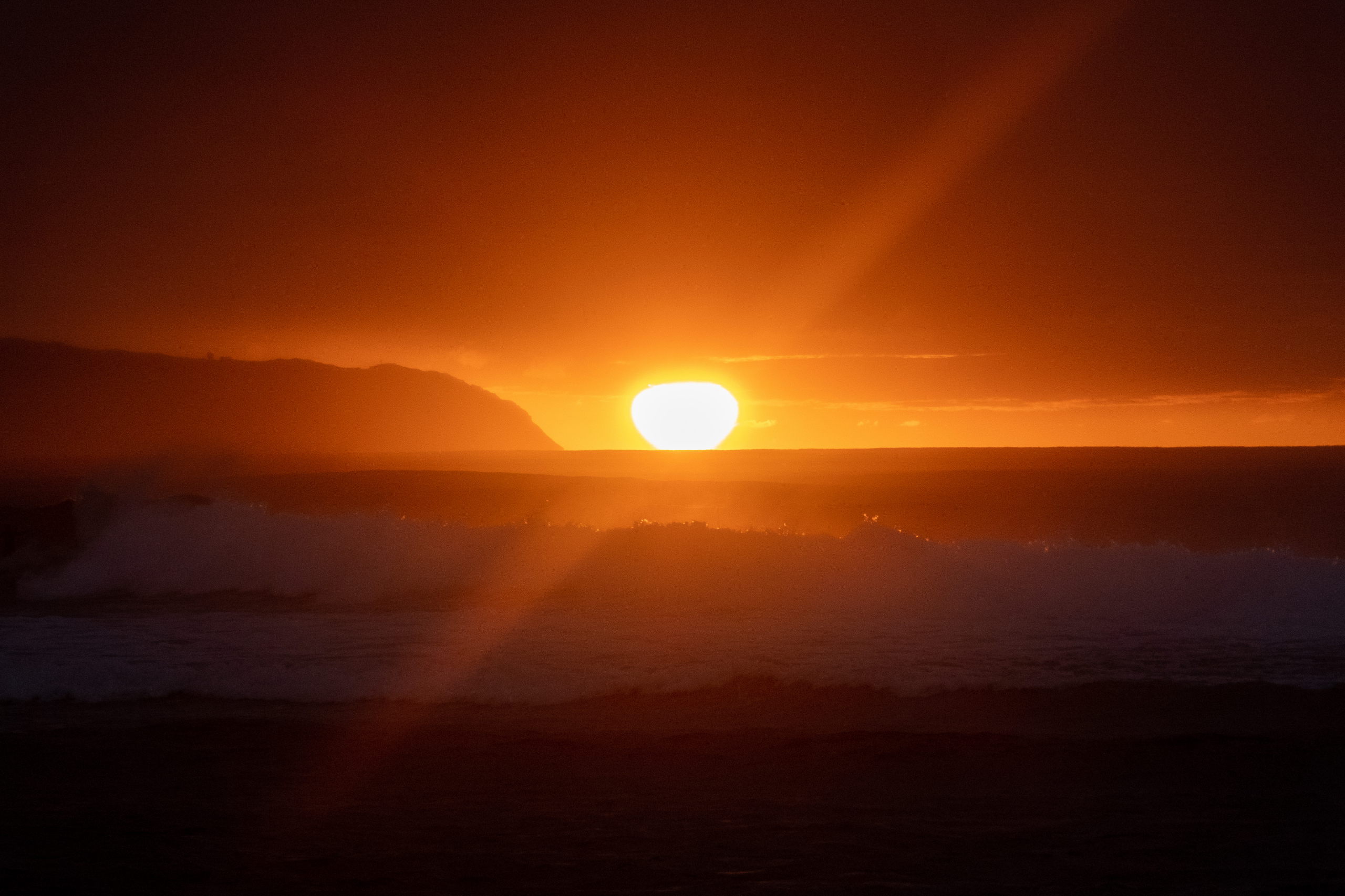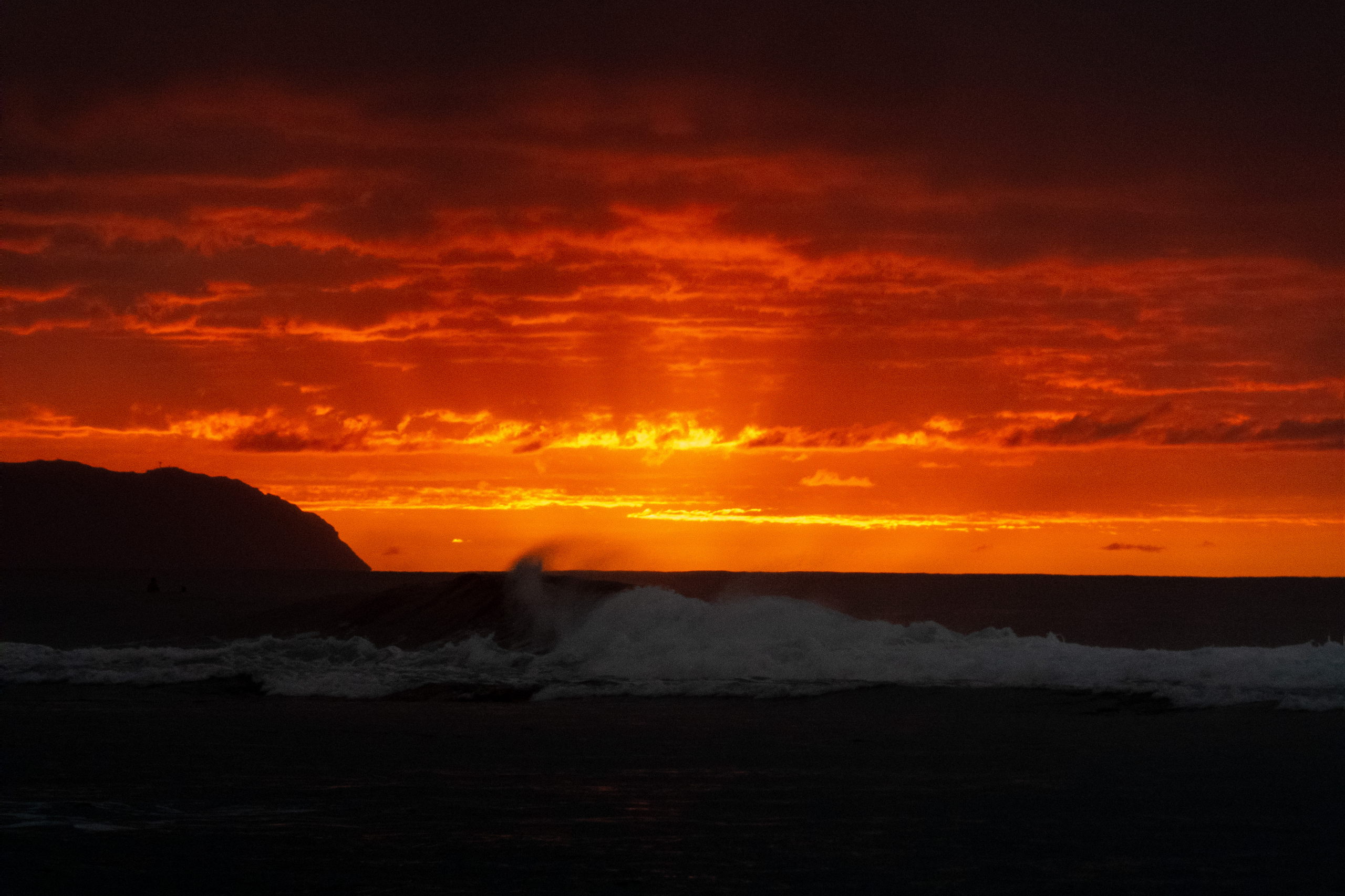 Im Anschluss düse ich erneut zum Sunset Beach und spaziere zum Sunset Point, um den Sonnenuntergang zu beobachten. Es sind noch immer Surfer und Bodyboarder draußen, obwohl die Sonne schon direkt neben den Bergen untergeht. Davor ziehen Wellen vorbei und manchmal ist sogar ein Surfer darauf zu sehen.