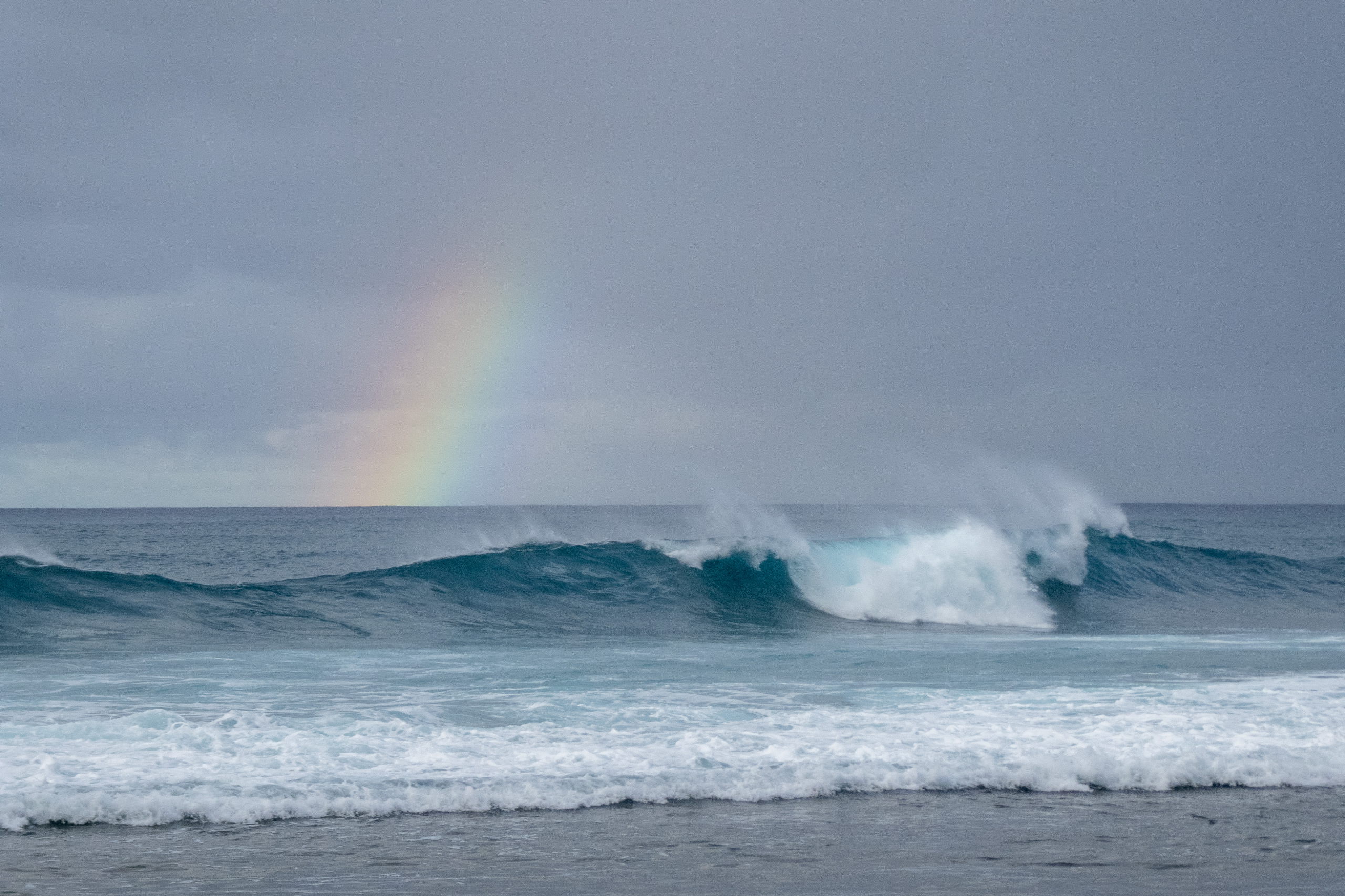 Ein Stück weiter nördlich biege ich ins Waimea Valley, wo man zu einem netten Wasserfall spazieren kann. Dafür wären allerdings 25 USD fällig, da man im Becken unterhalb des Wasserfalls baden kann. Nö, zu teuer. Das würde passen, wenn ein Bier und ein Mittagessen dabei wären. Und so fahre ich weiter nach Haleiwa, einen kleinen Ort an der Nordküste. Nach einer kurzen Erkundungstour durch den Ort fahre ich weiter zum Turtle Beach. Leider ohne Turtles, dafür mit Regen. 🙁 Da aber die Sonne etwas durch die Wolken blinzelt, ist ein schöner Regenbogen zu sehen. Jupi.