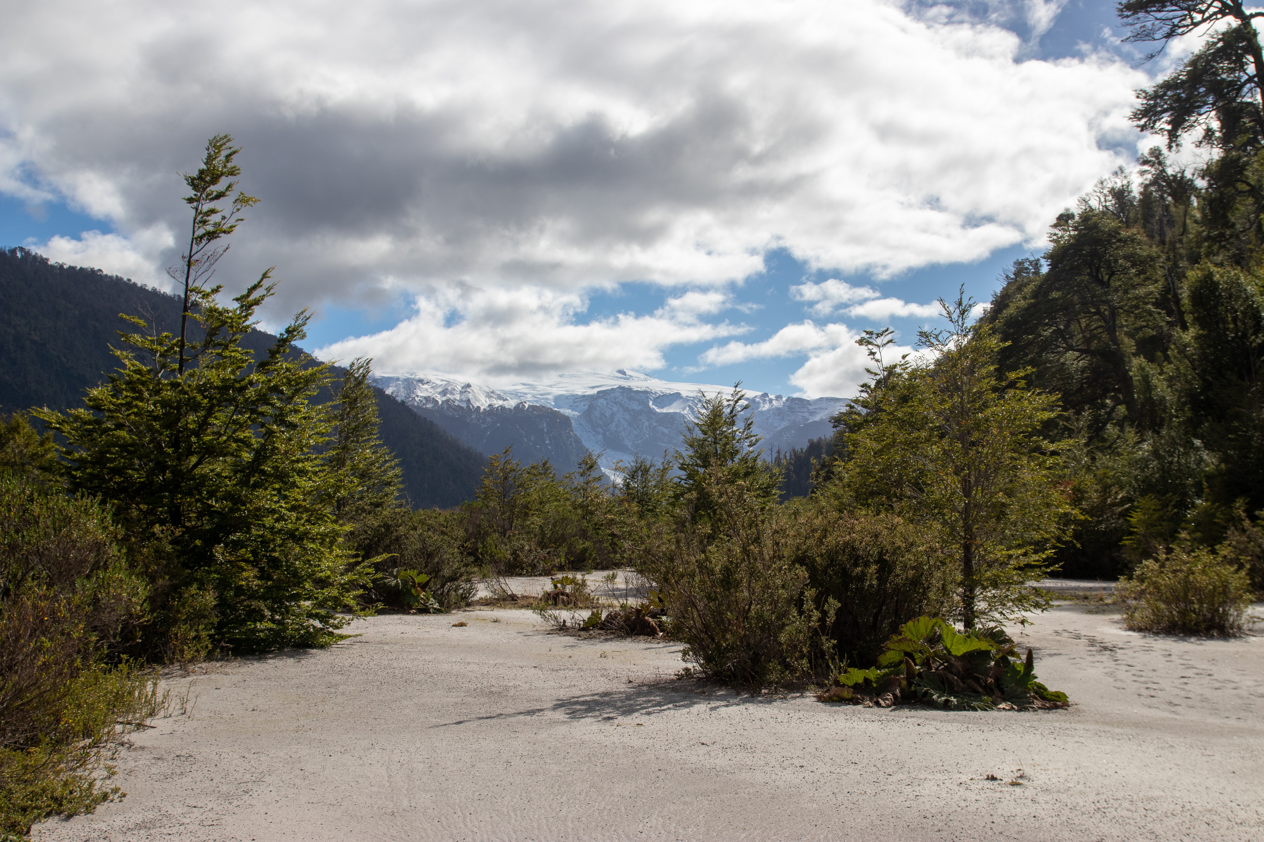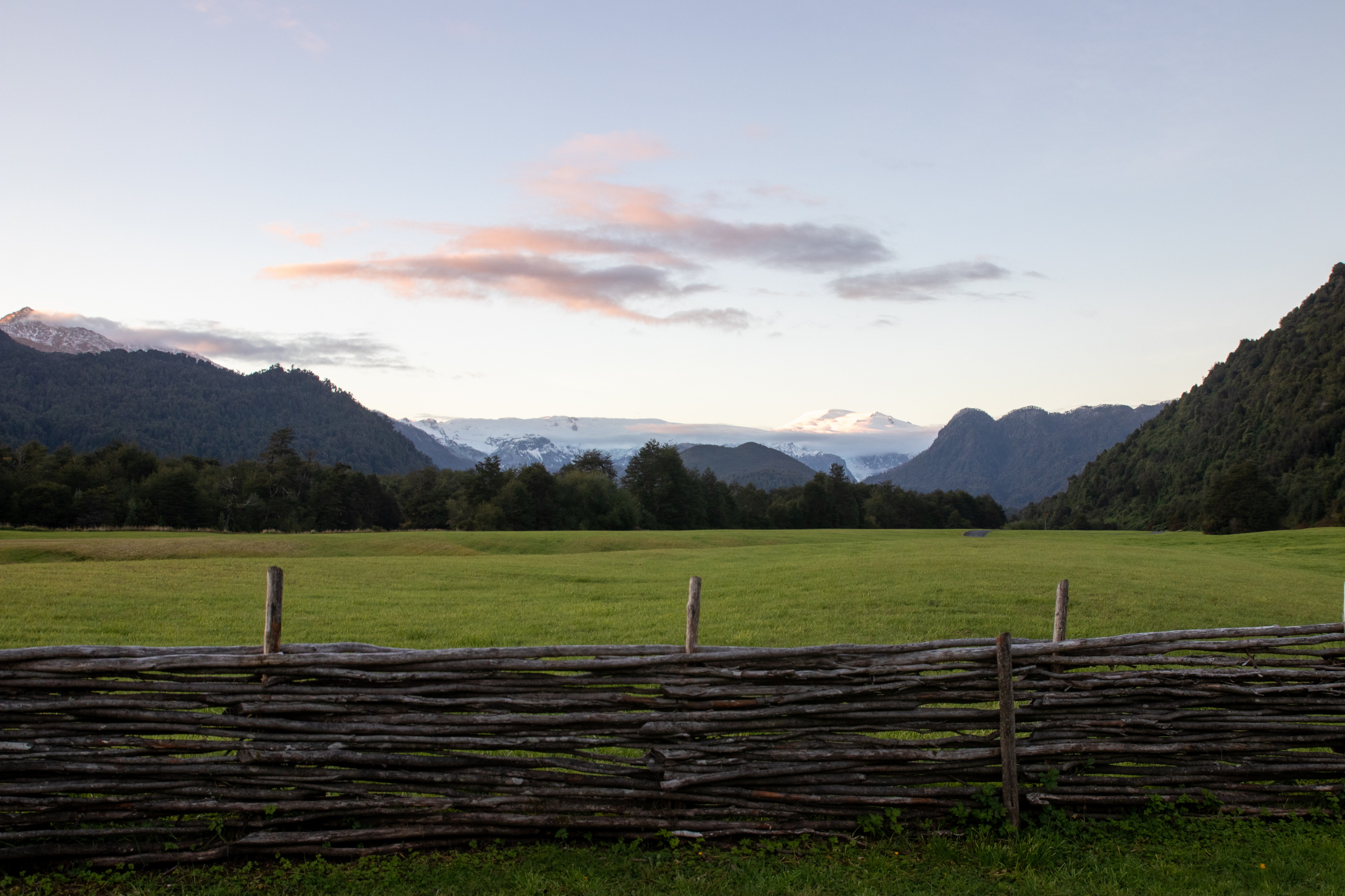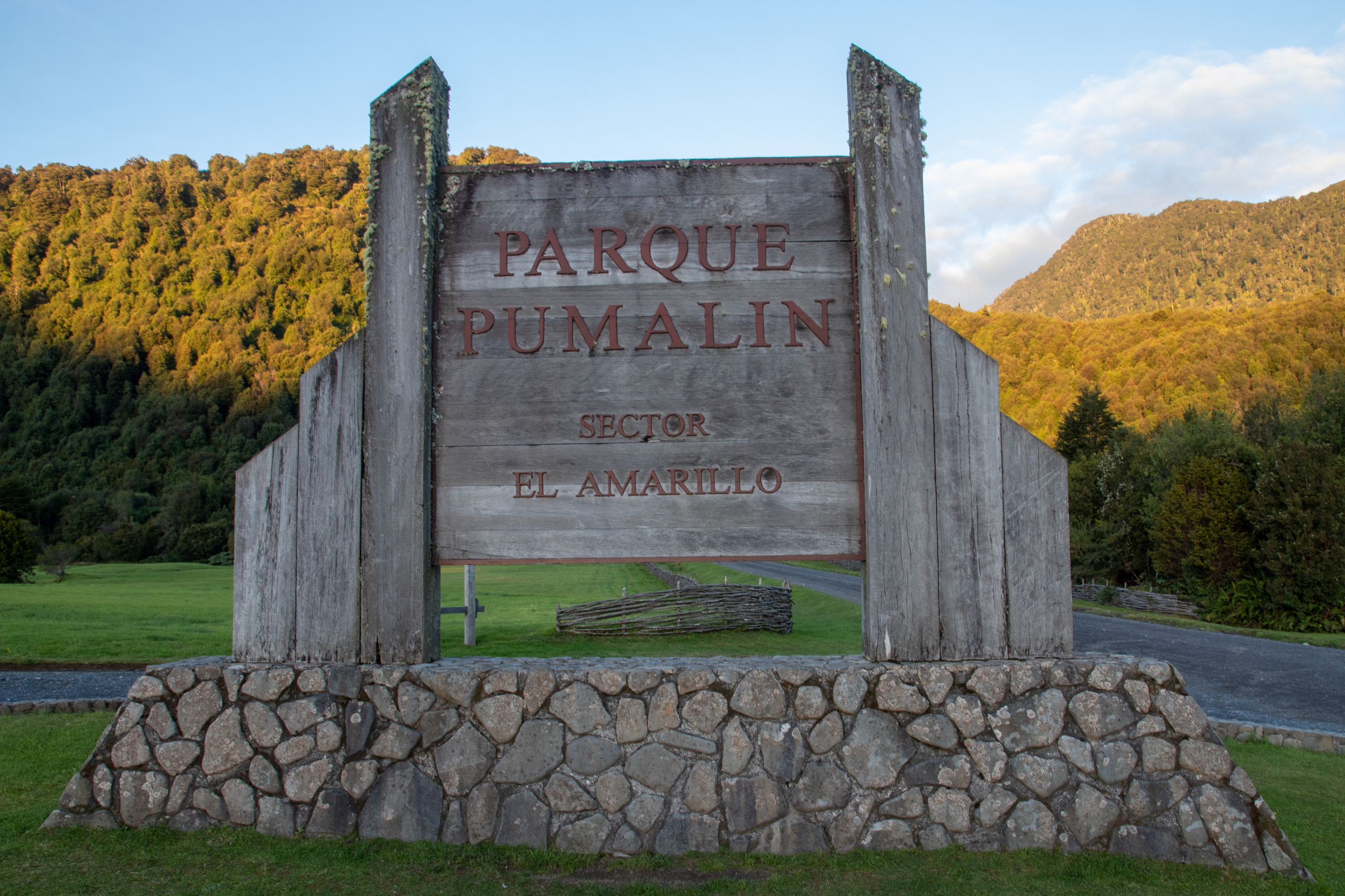 Ich schlafe hervorragend und stehe erst um neun Uhr auf. Nach dem Frühstück fahre ich zum Eingang vom Parque Nacional Pumalin Sector Amarillo. Der Ranger sagt mir, das der letzte Teil der Straße wegen Wartungsarbeiten gesperrt ist und ich nur bis zum vier Kilometer vorgelagerten Camp fahren darf. Um dreiviertel elf Uhr gehe ich los. Es geht steil die Straße hinauf und dann etwas gemütlicher weiter zum Camp Ventisquero. Von Bauarbeiten keine Spur. Grrrr. Zumindest waren es nur zwei Kilometer. Das bereits geschlossene Camp ist extrem schön und in der Ferne ist schon der Gletscher Amarillo zu sehen. Das Gras sieht aus, wie auf einem Golfplatz.