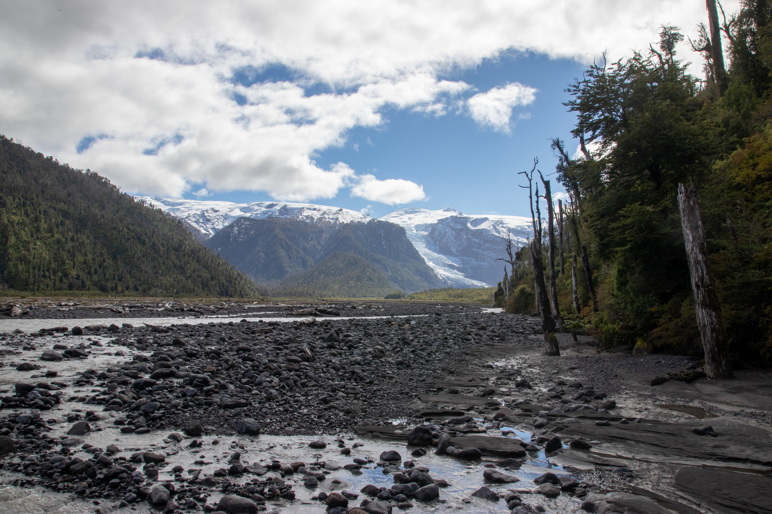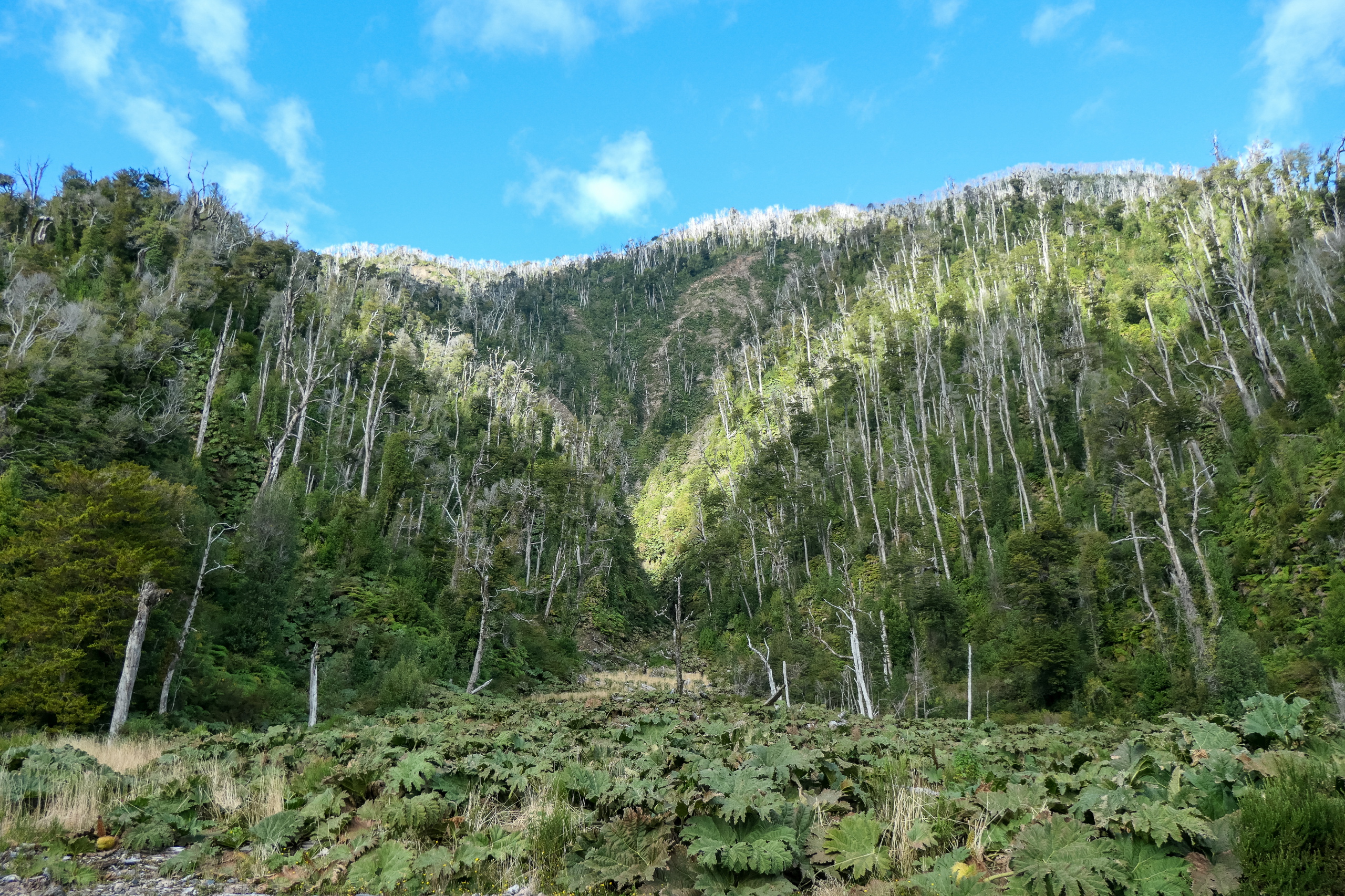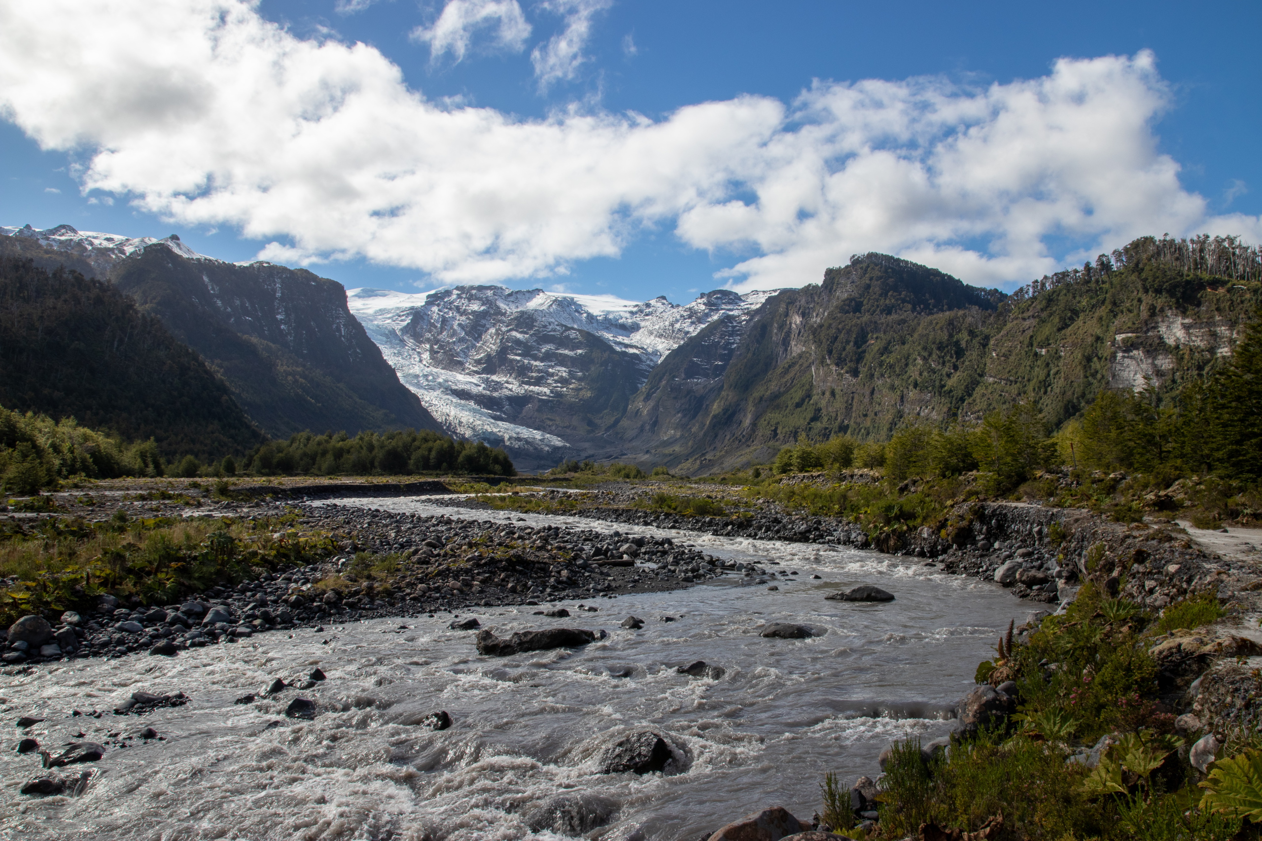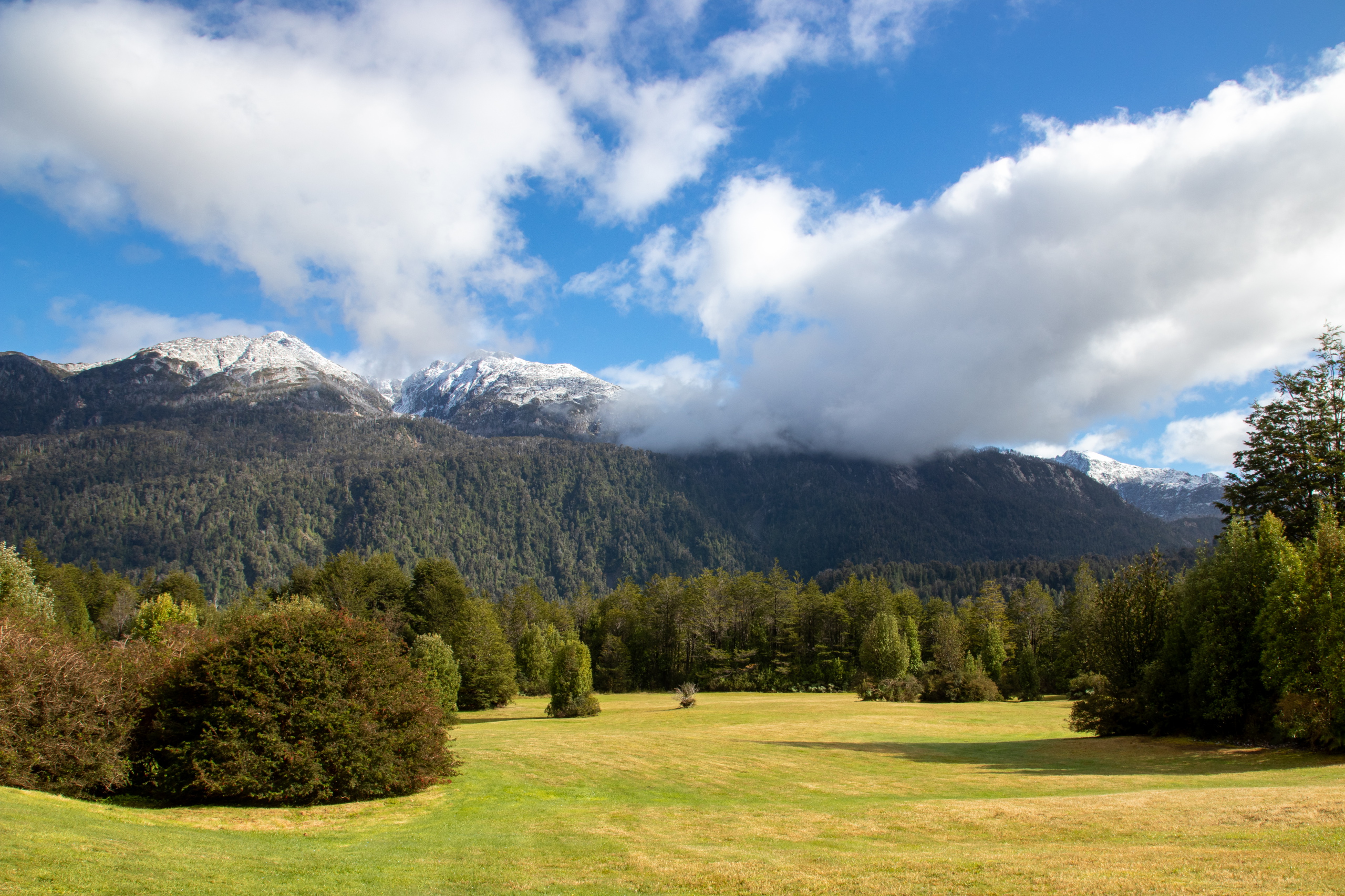 Ich schlafe hervorragend und stehe erst um neun Uhr auf. Nach dem Frühstück fahre ich zum Eingang vom Parque Nacional Pumalin Sector Amarillo. Der Ranger sagt mir, das der letzte Teil der Straße wegen Wartungsarbeiten gesperrt ist und ich nur bis zum vier Kilometer vorgelagerten Camp fahren darf. Um dreiviertel elf Uhr gehe ich los. Es geht steil die Straße hinauf und dann etwas gemütlicher weiter zum Camp Ventisquero. Von Bauarbeiten keine Spur. Grrrr. Zumindest waren es nur zwei Kilometer. Das bereits geschlossene Camp ist extrem schön und in der Ferne ist schon der Gletscher Amarillo zu sehen. Das Gras sieht aus, wie auf einem Golfplatz.