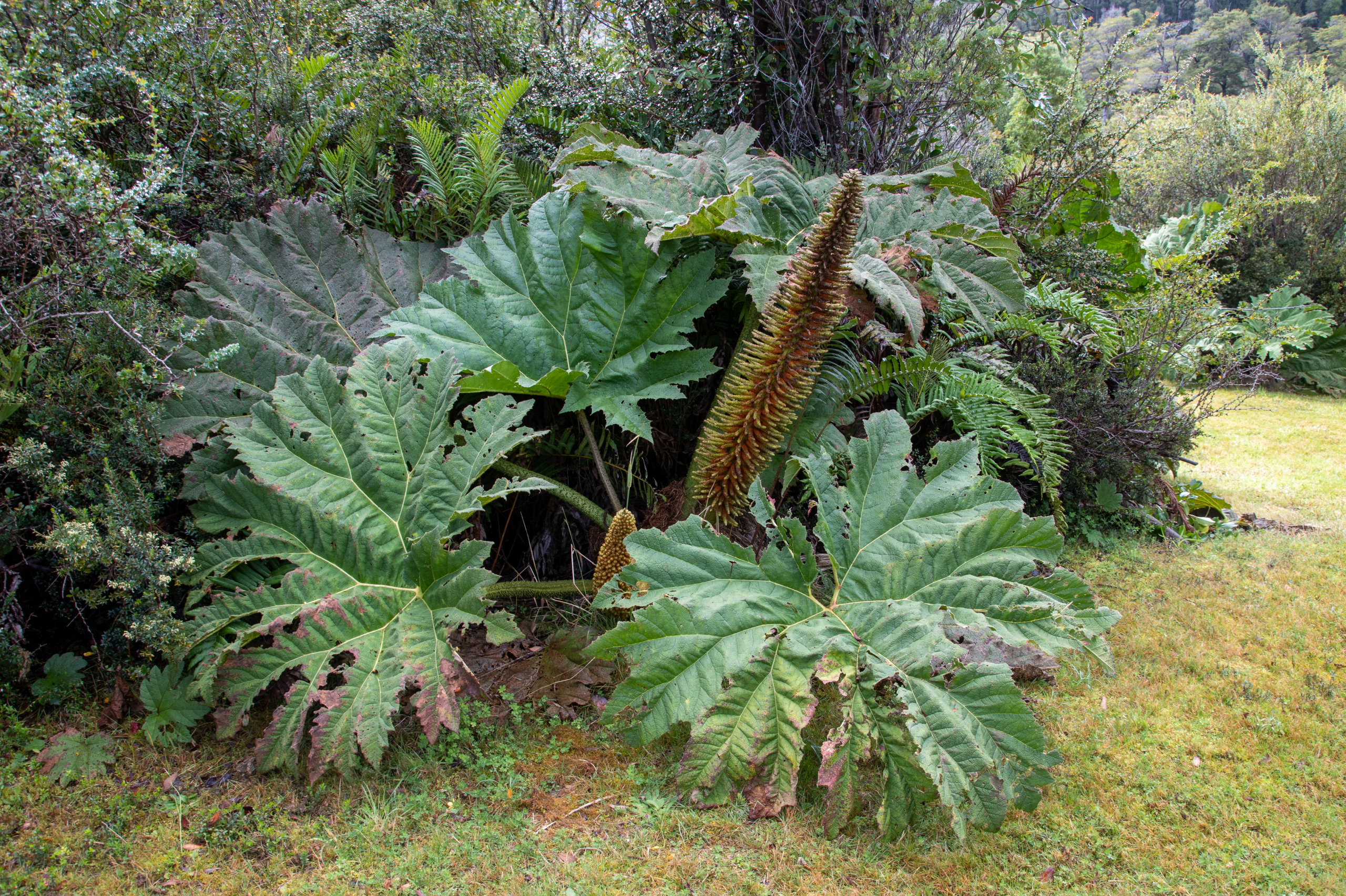 Du hast da einmal das Mammutblatt (oder Riesen-Rhabarber, klingt spektakulärer) und einmal die violette Torfbeere.