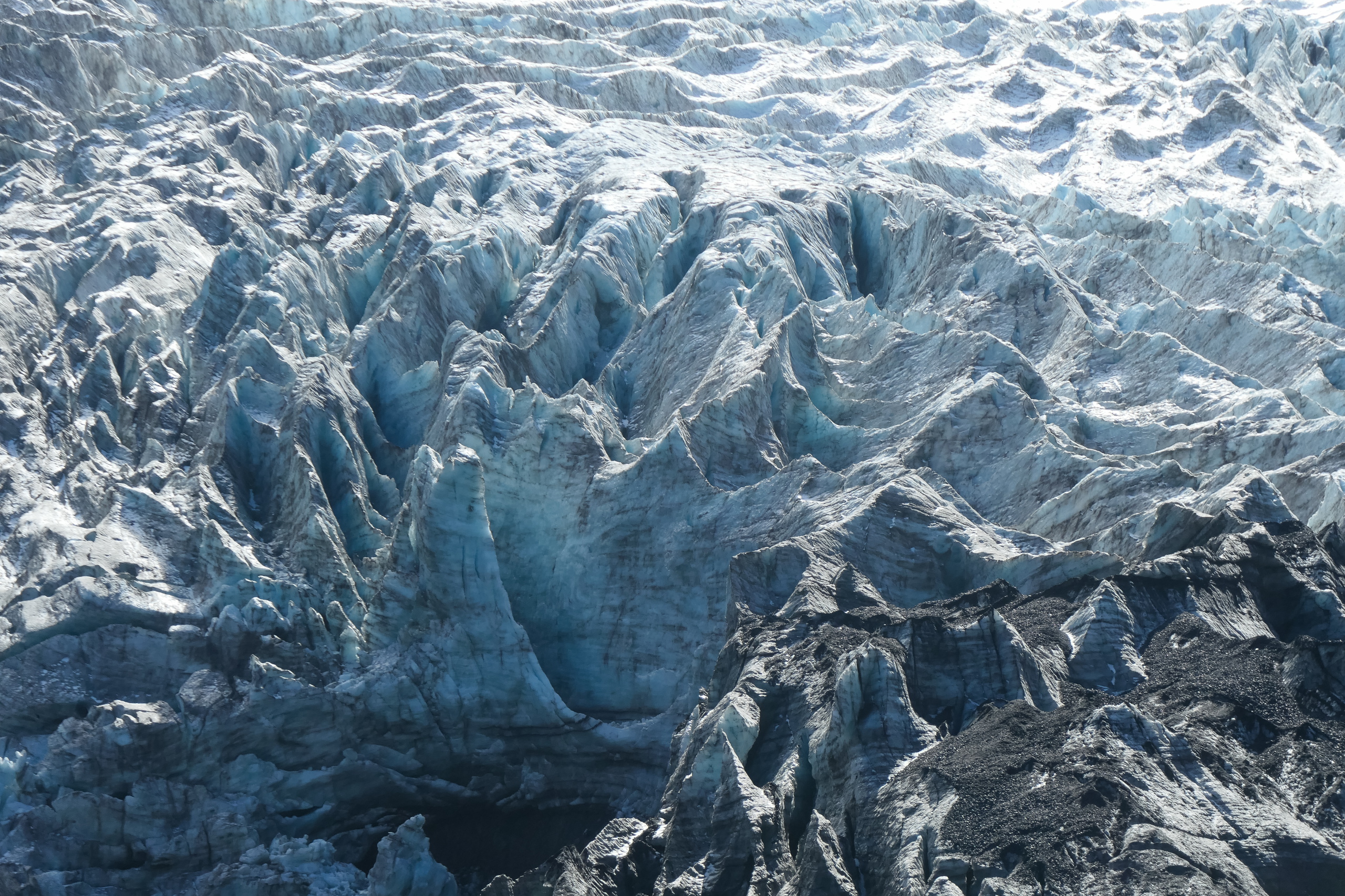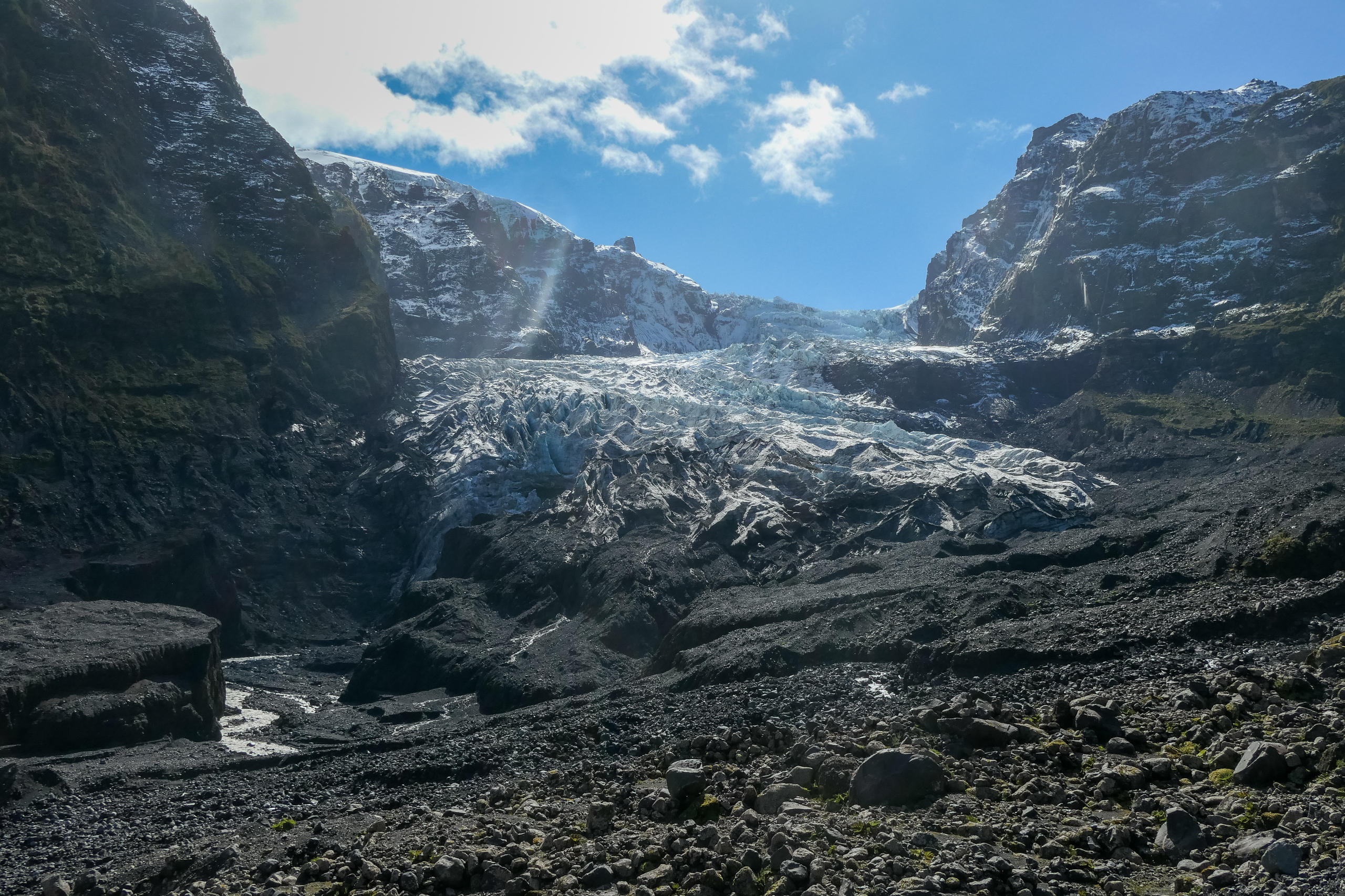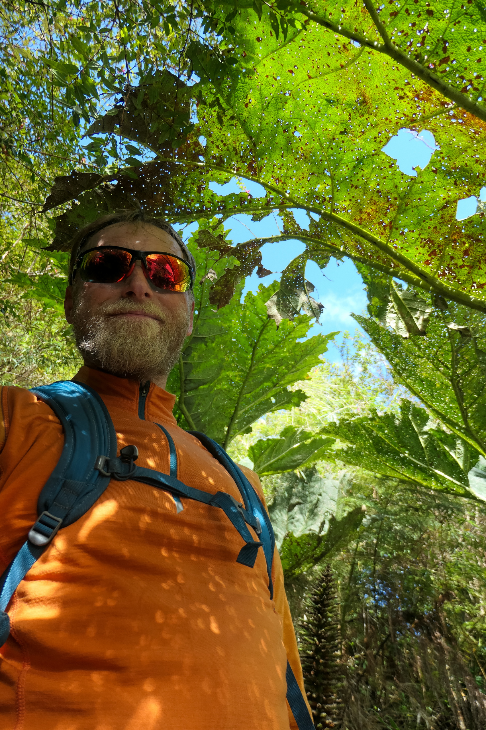 Ab nun geht es flach dem Fluss entlang, wobei immer wieder über wackelige Steine oder Äste Wasser zu überqueren ist. Der Weg führt rechts in den Wald und geht permanent auf und ab. Riesiges Farn und etwas das aussieht wie riesiger Huflattich wachsen hier. So muss es zu Zeiten der Dinosaurier ausgesehen haben. Kurz nachdem der Weg wieder aus dem Wald hinaus führt ist der breite Fluss zu überqueren. Brücke oder Steine gibt es nicht. Also raus aus den Schuhen und durch. Scheiß die Wand an, ist das kalt. Kein Wunder, das Wasser kommt ja direkt vom Gletscher. Das letzte Stück geht es noch leicht bergauf bis zum Schild “Fin del Sendero”. Der Gletscher ist nur wenige hundert Meter entfernt.