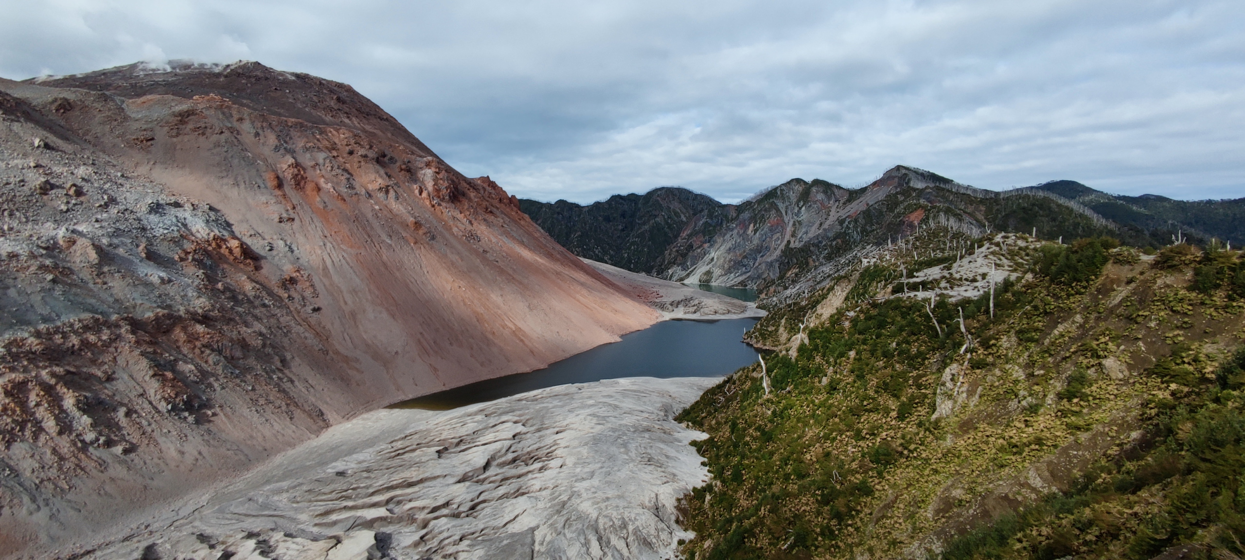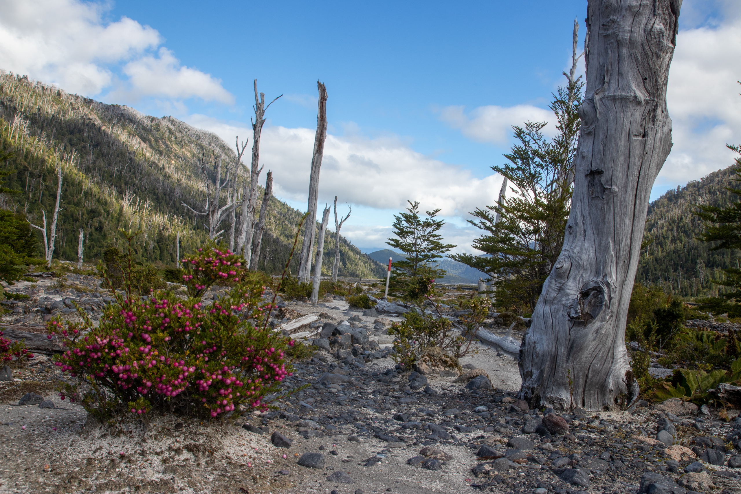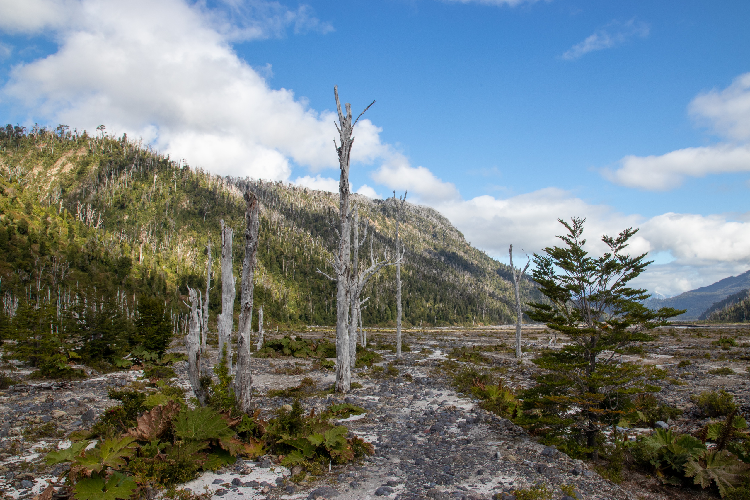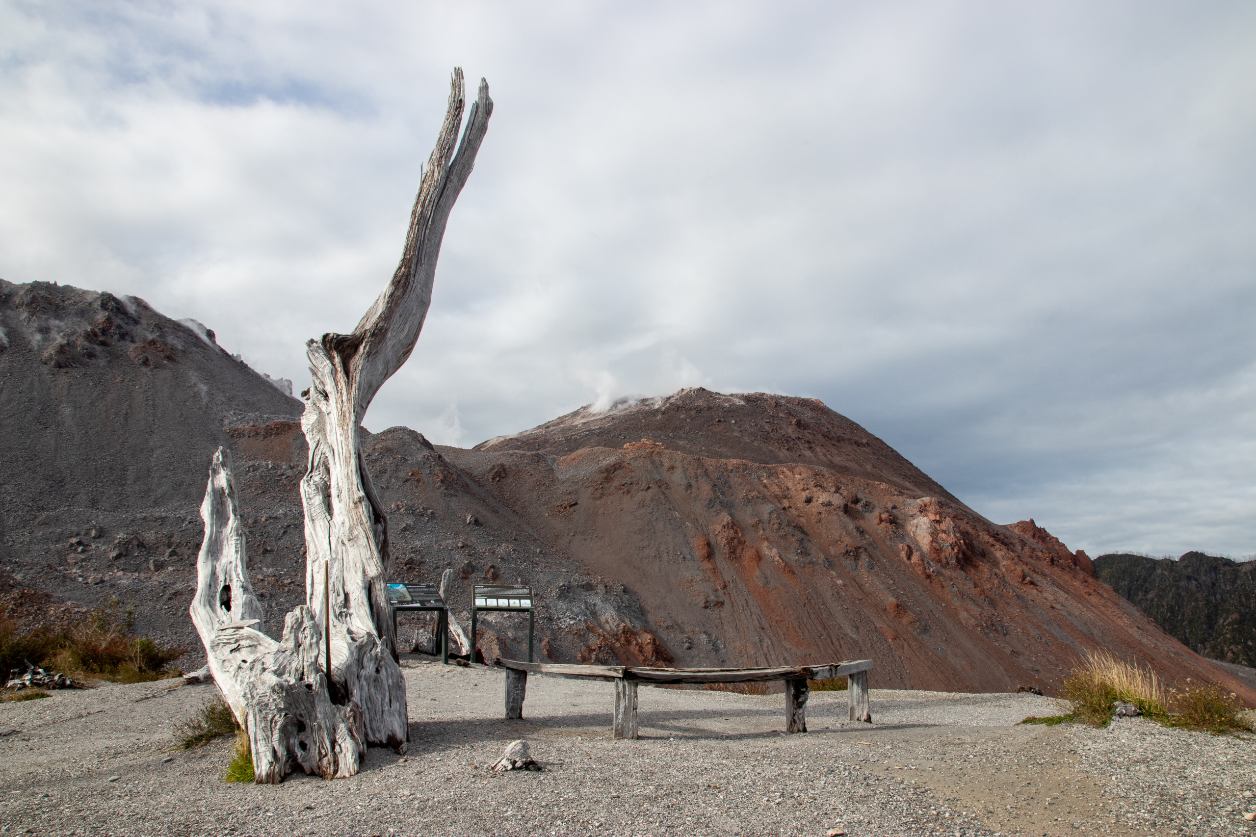 Wir starten um zehn Uhr. Die beiden Burschen legen ein äußerst flottes Tempo vor. Kein Wunder, sie sind nur halb so alt wie ich. Uns wird schnell warm und nachdem wir uns einiger Schichten entledigt haben geht es mit Affenzahn weiter. Nach nur etwas mehr als einer Stunde stehen wir am Aussichtspunkt. Viel länger hätte ich das Tempo auch nicht mehr mithalten können. 😅 Das Wetter ist herrlich und die Aussicht auf die beiden dampfenden Gipfel sehr beeindruckend. 2007 hat ein Ausbruch teile des Parks und einen großen Teil von Chaitén zerstört. Und das obwohl der Vulkan nicht gerade riesig ist. Bei dem Ausbruch ist er aber immerhin um 200 Meter gewachsen. Um Mittag gehen wir wieder hinunter und ich fahre die beiden noch zu ihrem Camp, da um diese Zeit fast keine Autos mehr unterwegs sind.