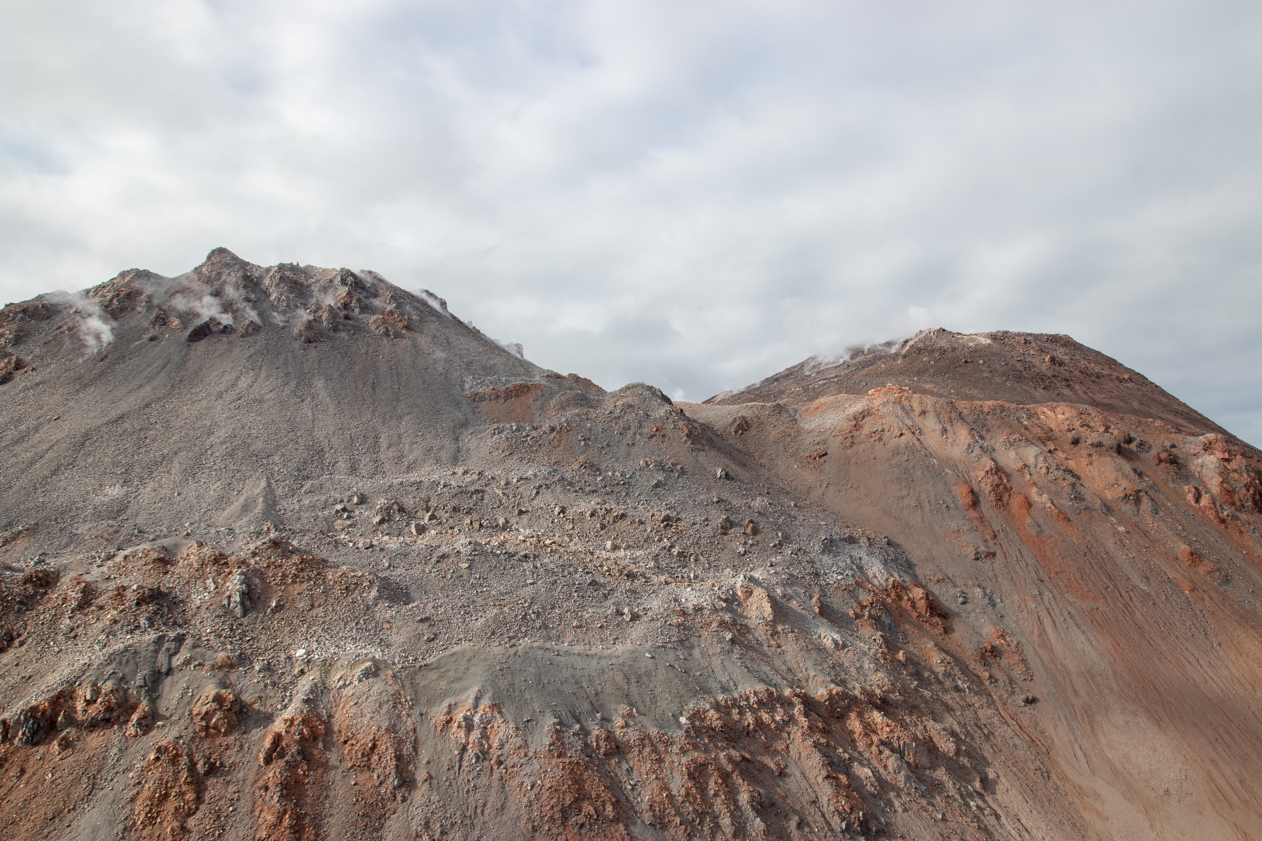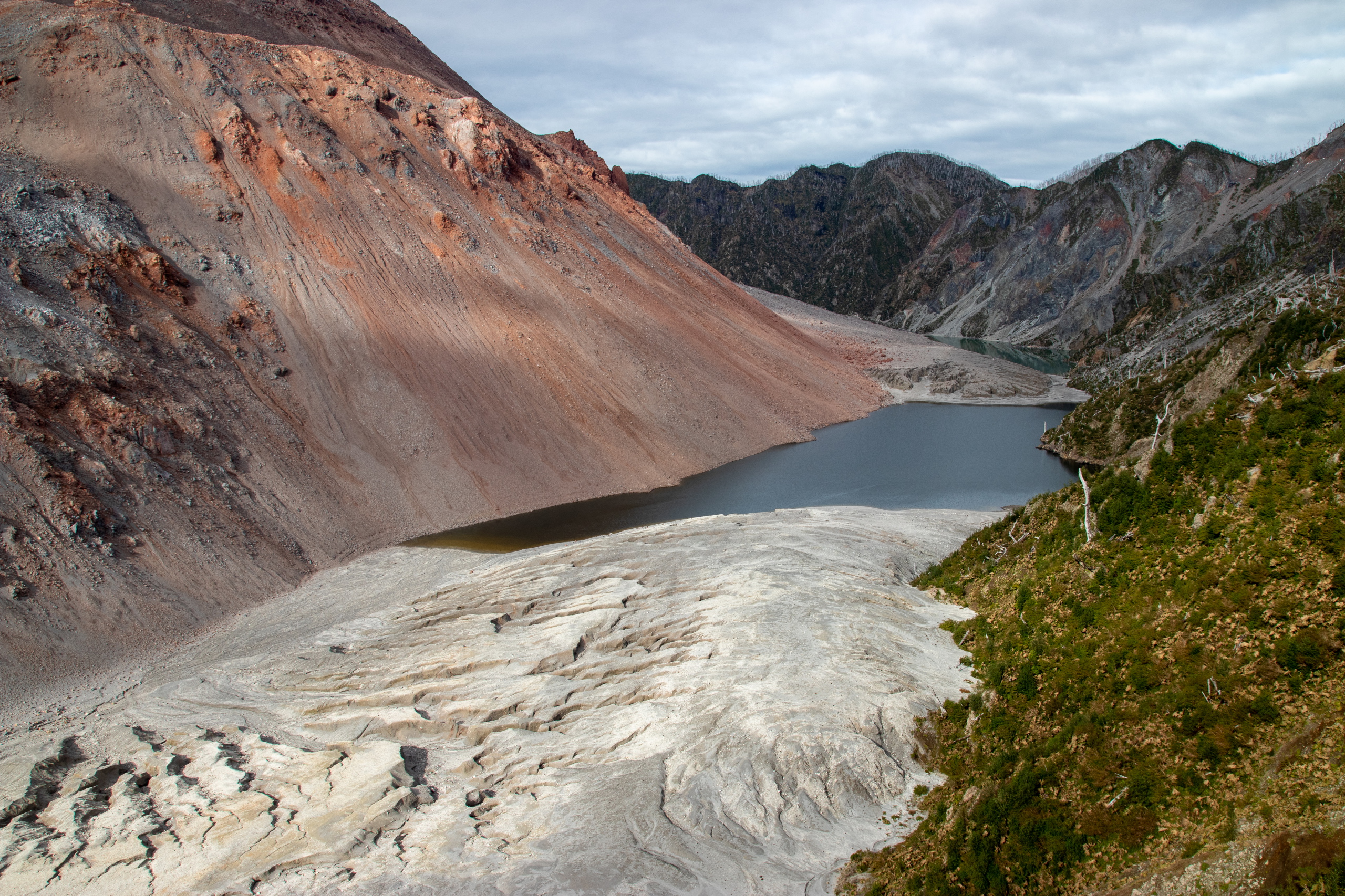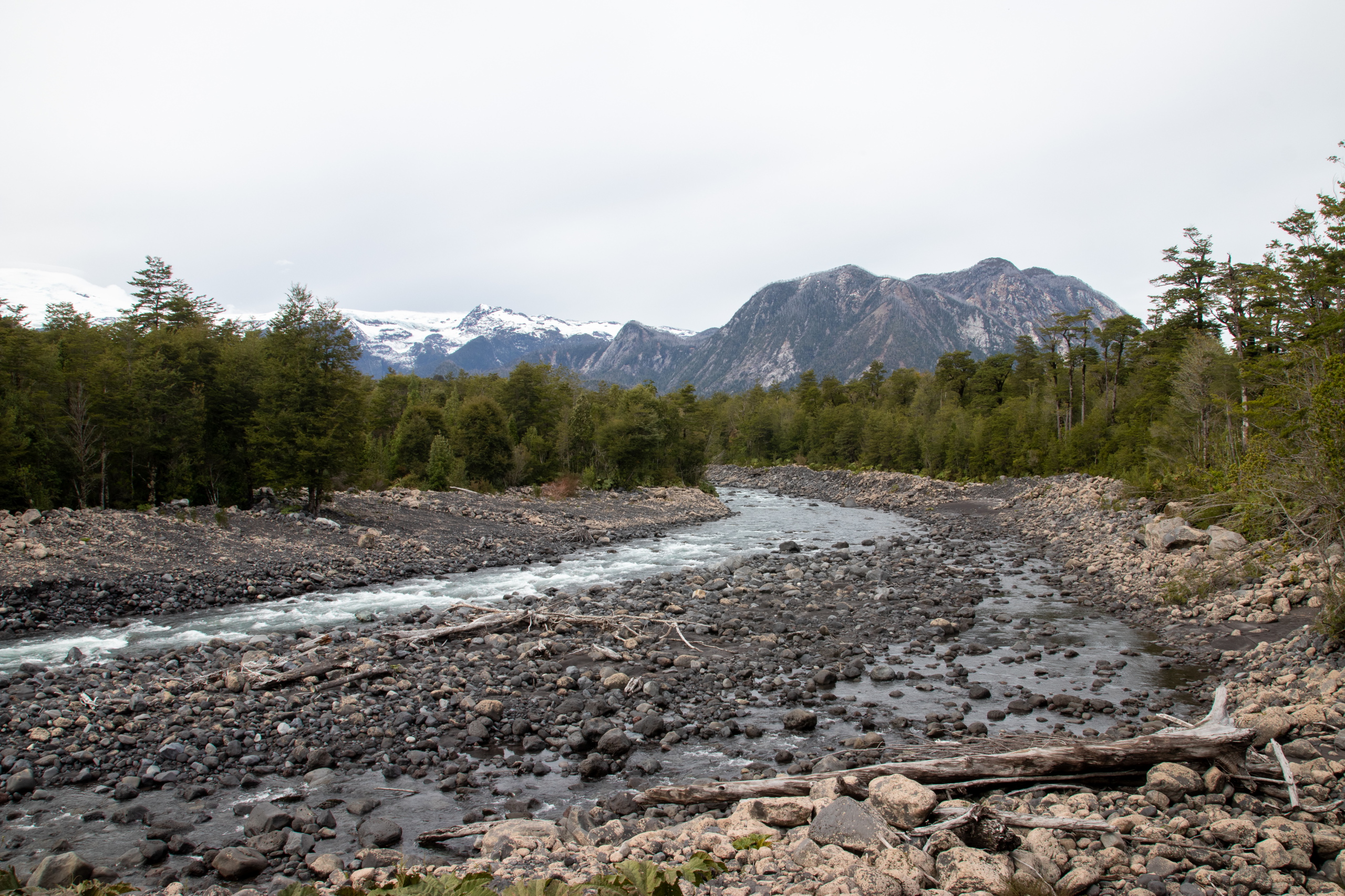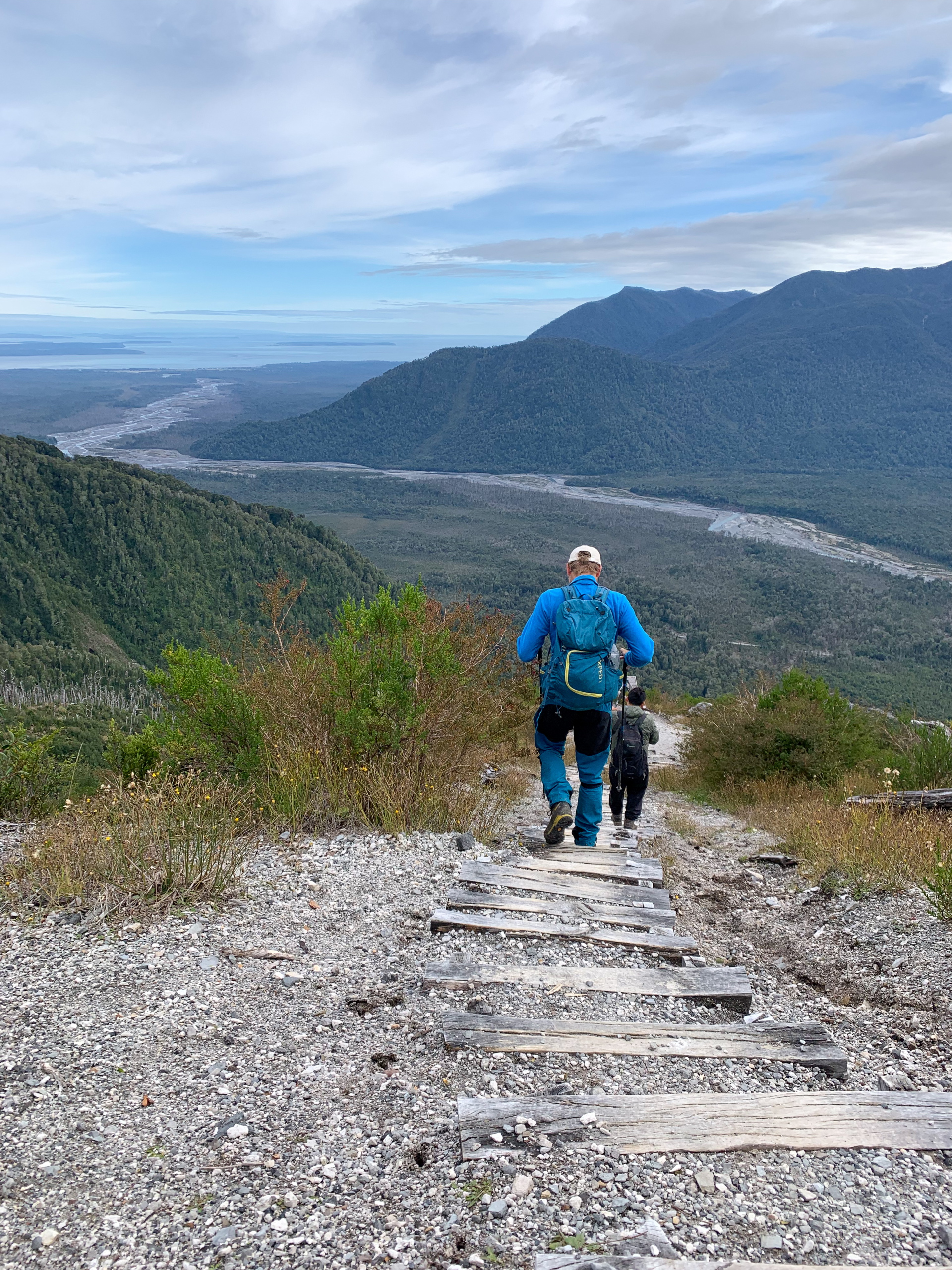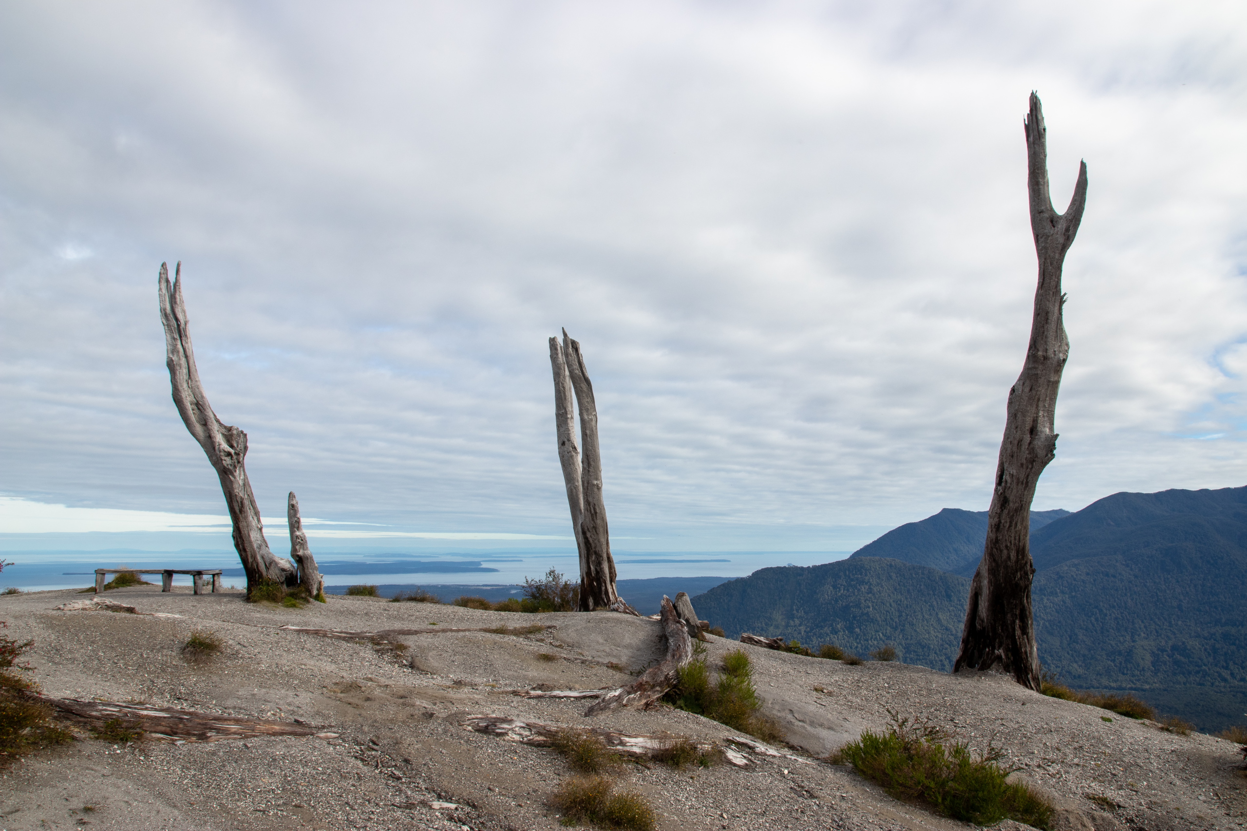 Wir starten um zehn Uhr. Die beiden Burschen legen ein äußerst flottes Tempo vor. Kein Wunder, sie sind nur halb so alt wie ich. Uns wird schnell warm und nachdem wir uns einiger Schichten entledigt haben geht es mit Affenzahn weiter. Nach nur etwas mehr als einer Stunde stehen wir am Aussichtspunkt. Viel länger hätte ich das Tempo auch nicht mehr mithalten können. 😅 Das Wetter ist herrlich und die Aussicht auf die beiden dampfenden Gipfel sehr beeindruckend. 2007 hat ein Ausbruch teile des Parks und einen großen Teil von Chaitén zerstört. Und das obwohl der Vulkan nicht gerade riesig ist. Bei dem Ausbruch ist er aber immerhin um 200 Meter gewachsen. Um Mittag gehen wir wieder hinunter und ich fahre die beiden noch zu ihrem Camp, da um diese Zeit fast keine Autos mehr unterwegs sind.