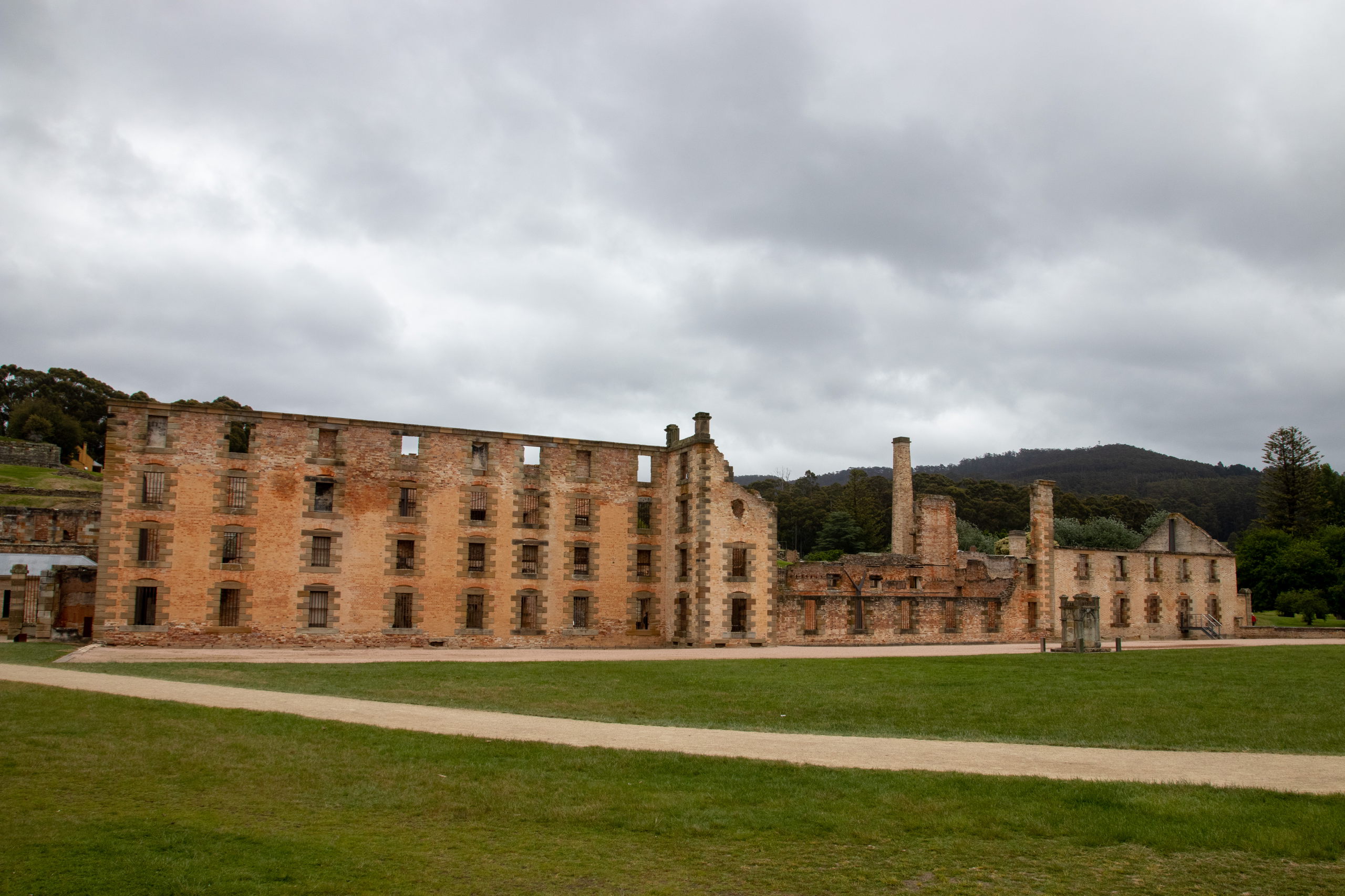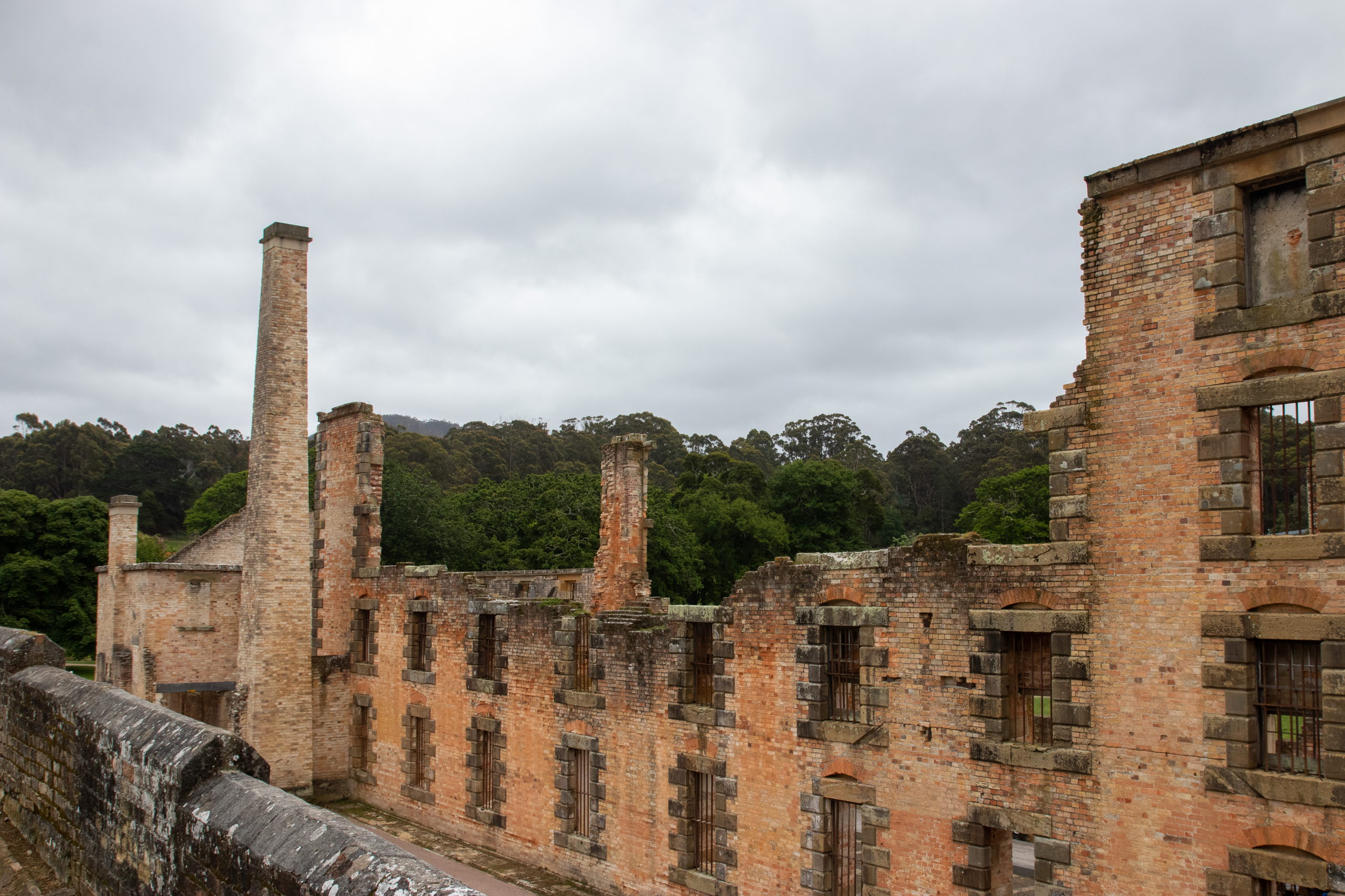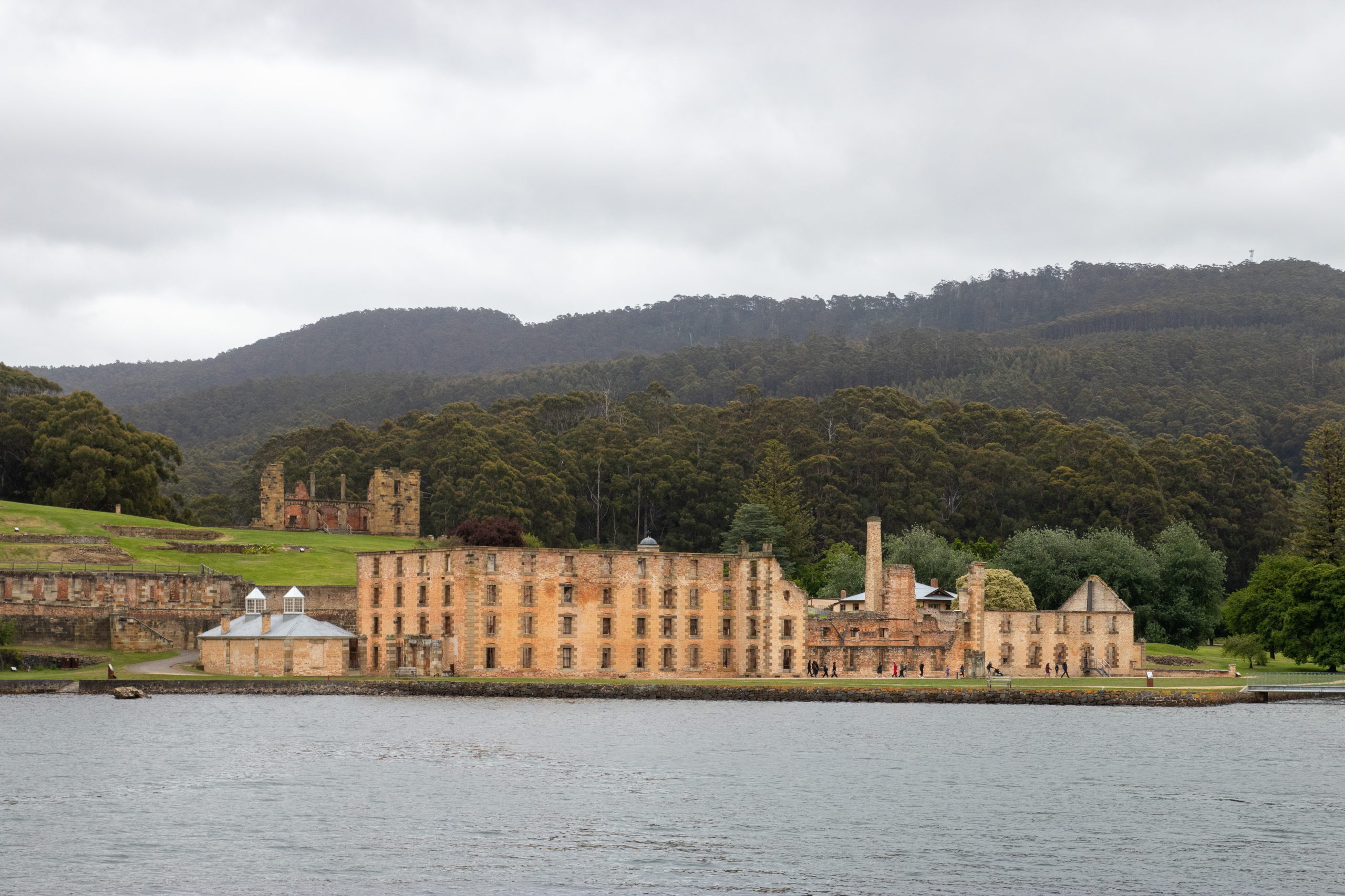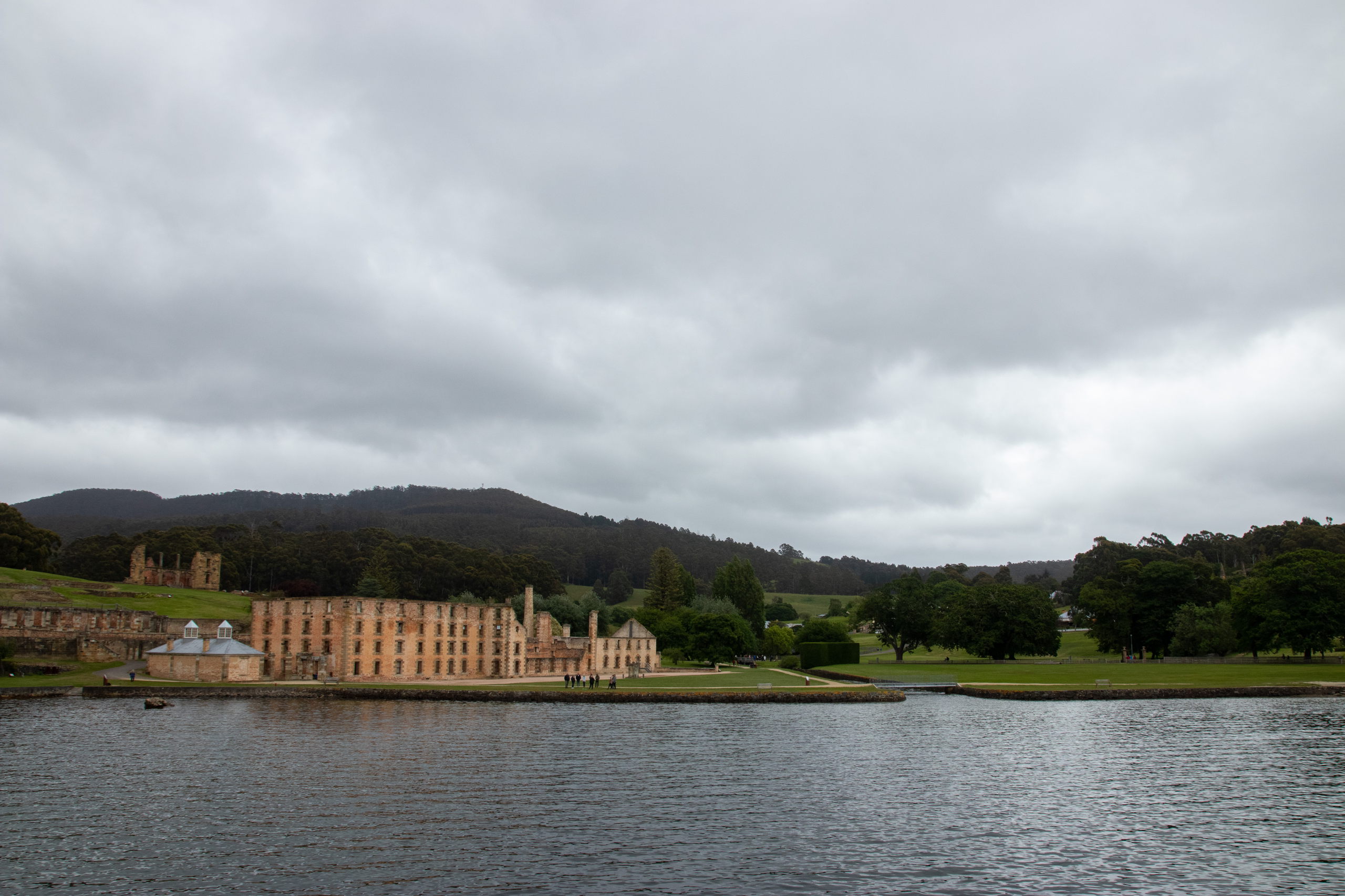 Viel zu früh für die Besichtigung von Port Arthur werde ich munter, weshalb ich noch eine Runde schlafe. Nach einer kurzen Fahrt parke ich in Pole Position und ergattere die erste Walking Tour. Nach einer Dreiviertelstunde Rundgang und Unmengen an Informationen über das ehemalige Gefängnis ist etwas Zeit bis zur Hafenrundfahrt, um das riesige Gelände zu erkunden. Mit dem Boot drehen wir eine 20-minütige Runde und bekommen noch mehr Infos. Z.B. über die vorgelagerte Insel, auf der über 1000 Häftlinge begraben sind. Das Wetter ist leider trüb und so sieht alles etwas trist aus. Passt aber auch für solch einen Ort. Später wurden hier von den Gefangenen Schiffe für die britische Marine gebaut. Wer brav war, durfte einen Beruf lernen. War man es nicht, war harte Arbeit, wie z.B. das Schleppen von Baumstämmen angesagt.