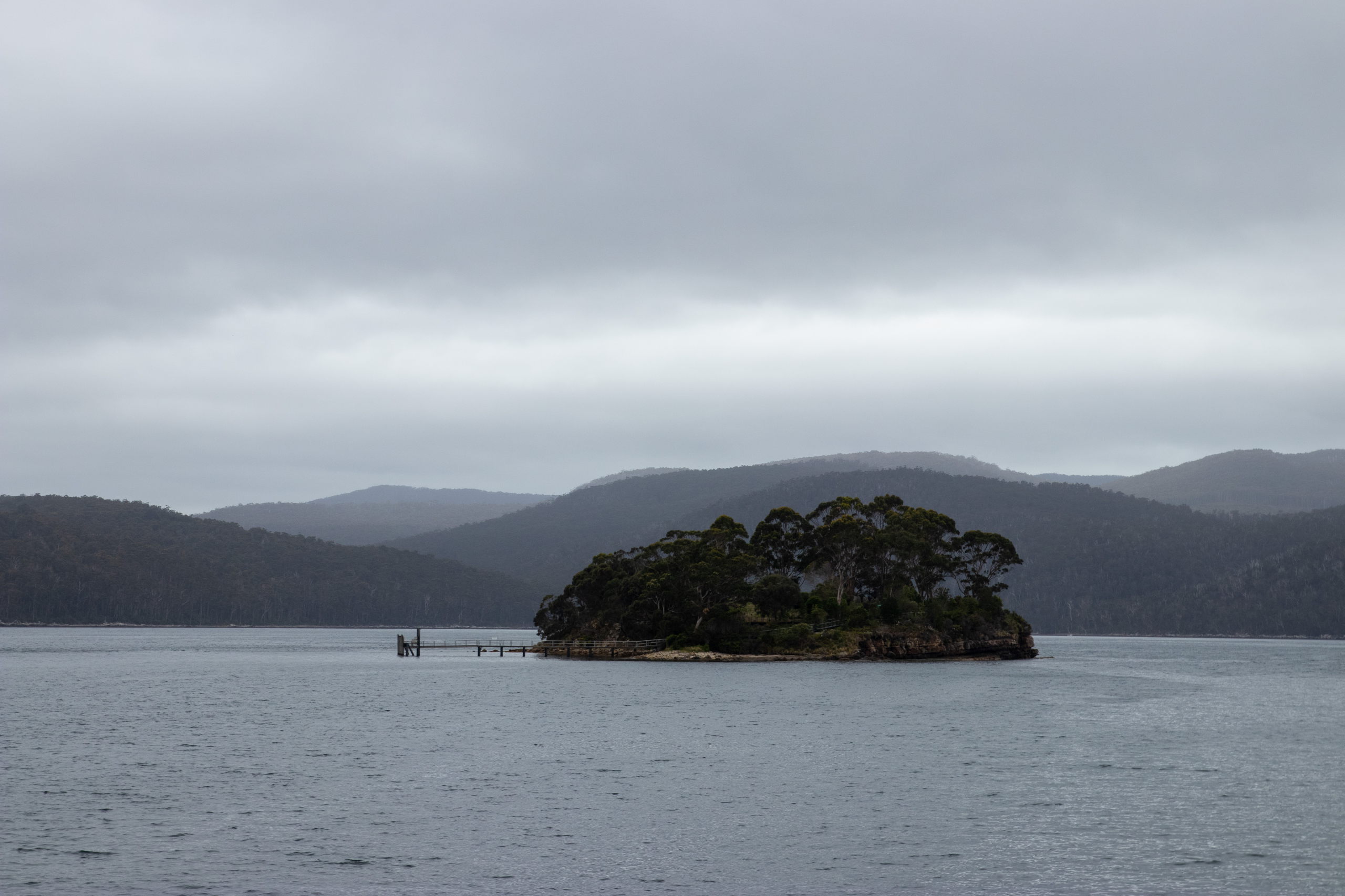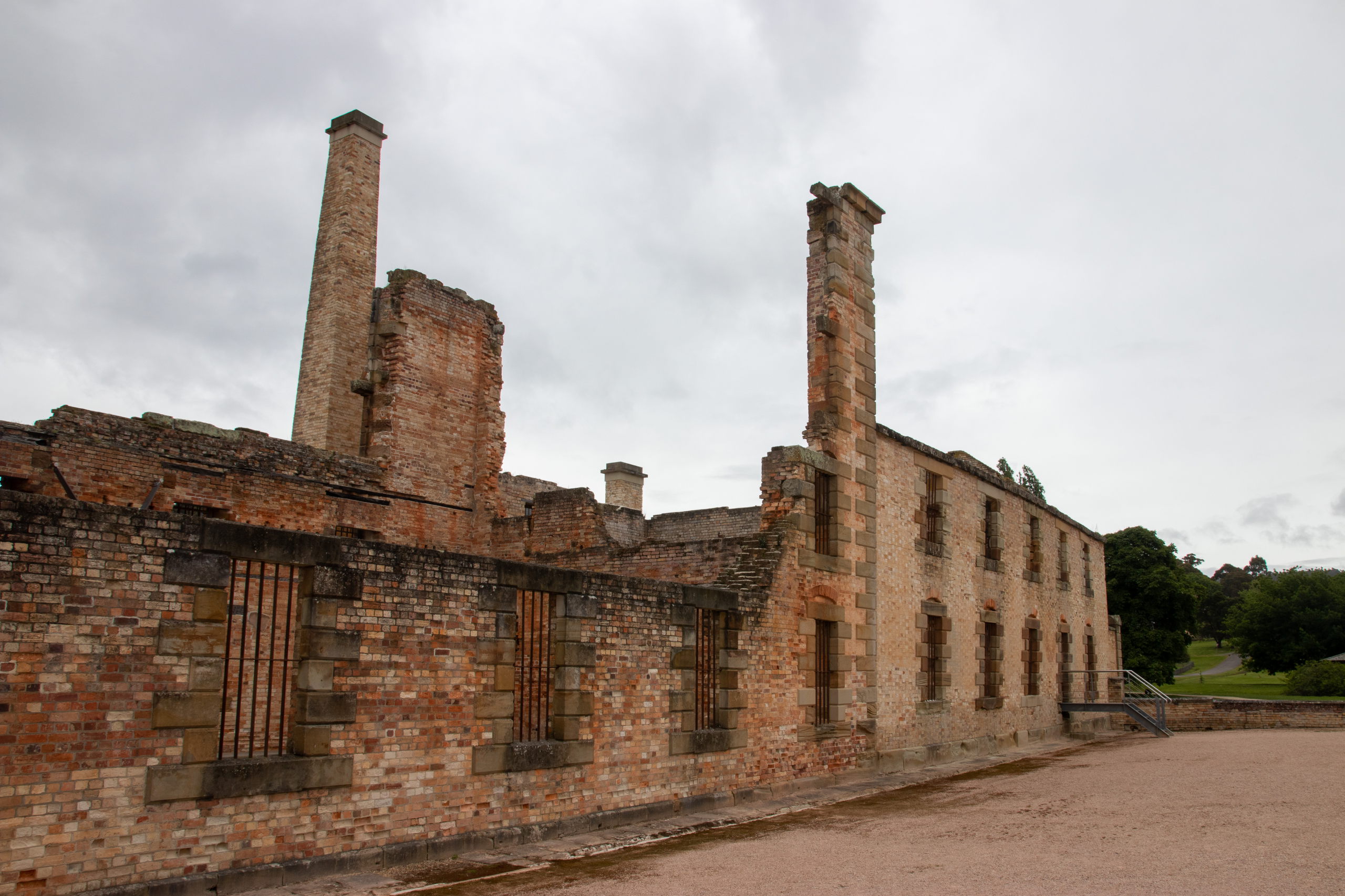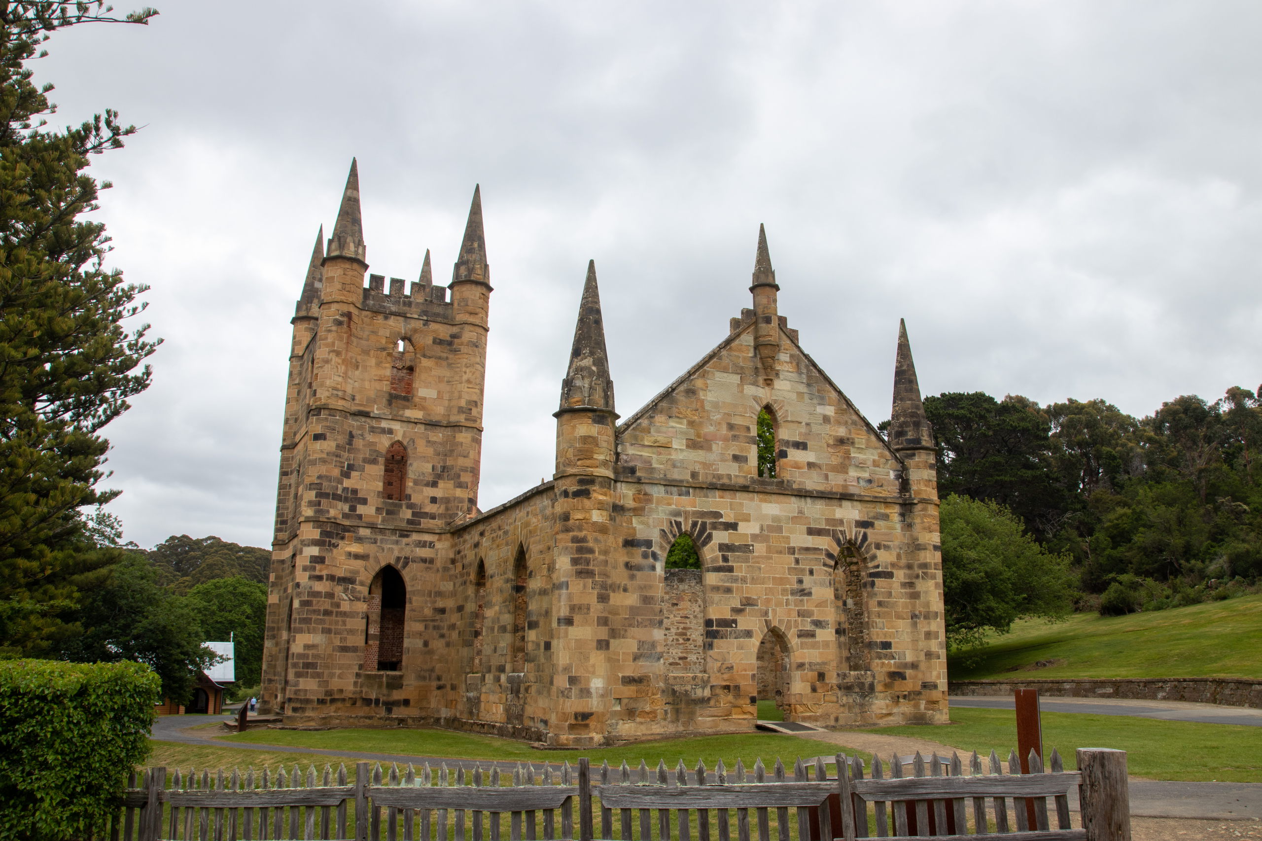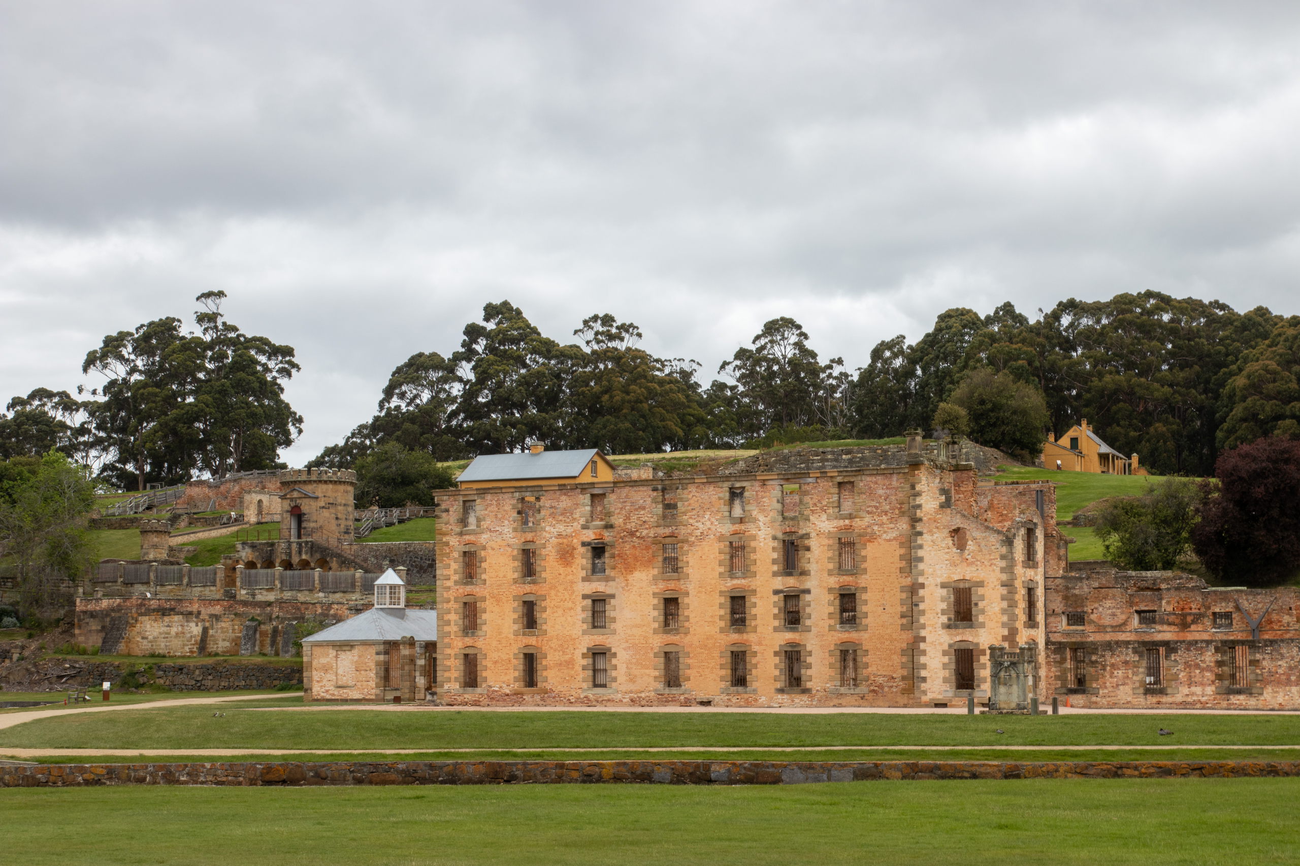Viel zu früh für die Besichtigung von Port Arthur werde ich munter, weshalb ich noch eine Runde schlafe. Nach einer kurzen Fahrt parke ich in Pole Position und ergattere die erste Walking Tour. Nach einer Dreiviertelstunde Rundgang und Unmengen an Informationen über das ehemalige Gefängnis ist etwas Zeit bis zur Hafenrundfahrt, um das riesige Gelände zu erkunden. Mit dem Boot drehen wir eine 20-minütige Runde und bekommen noch mehr Infos. Z.B. über die vorgelagerte Insel, auf der über 1000 Häftlinge begraben sind. Das Wetter ist leider trüb und so sieht alles etwas trist aus. Passt aber auch für solch einen Ort. Später wurden hier von den Gefangenen Schiffe für die britische Marine gebaut. Wer brav war, durfte einen Beruf lernen. War man es nicht, war harte Arbeit, wie z.B. das Schleppen von Baumstämmen angesagt.