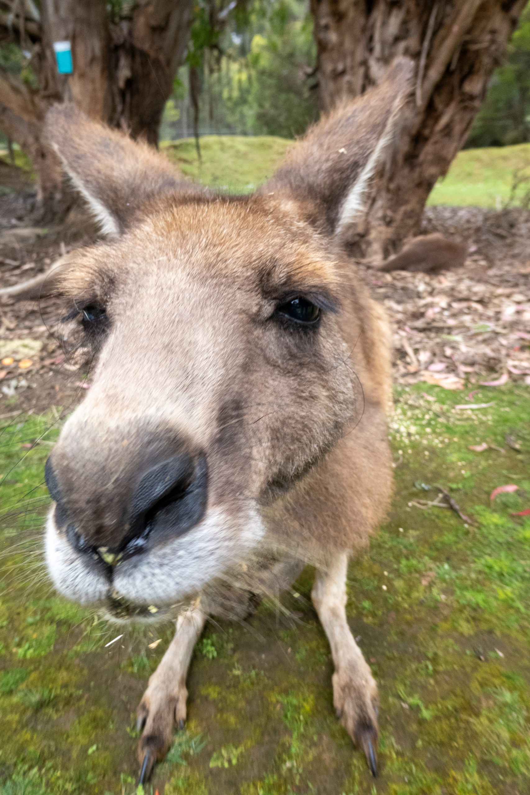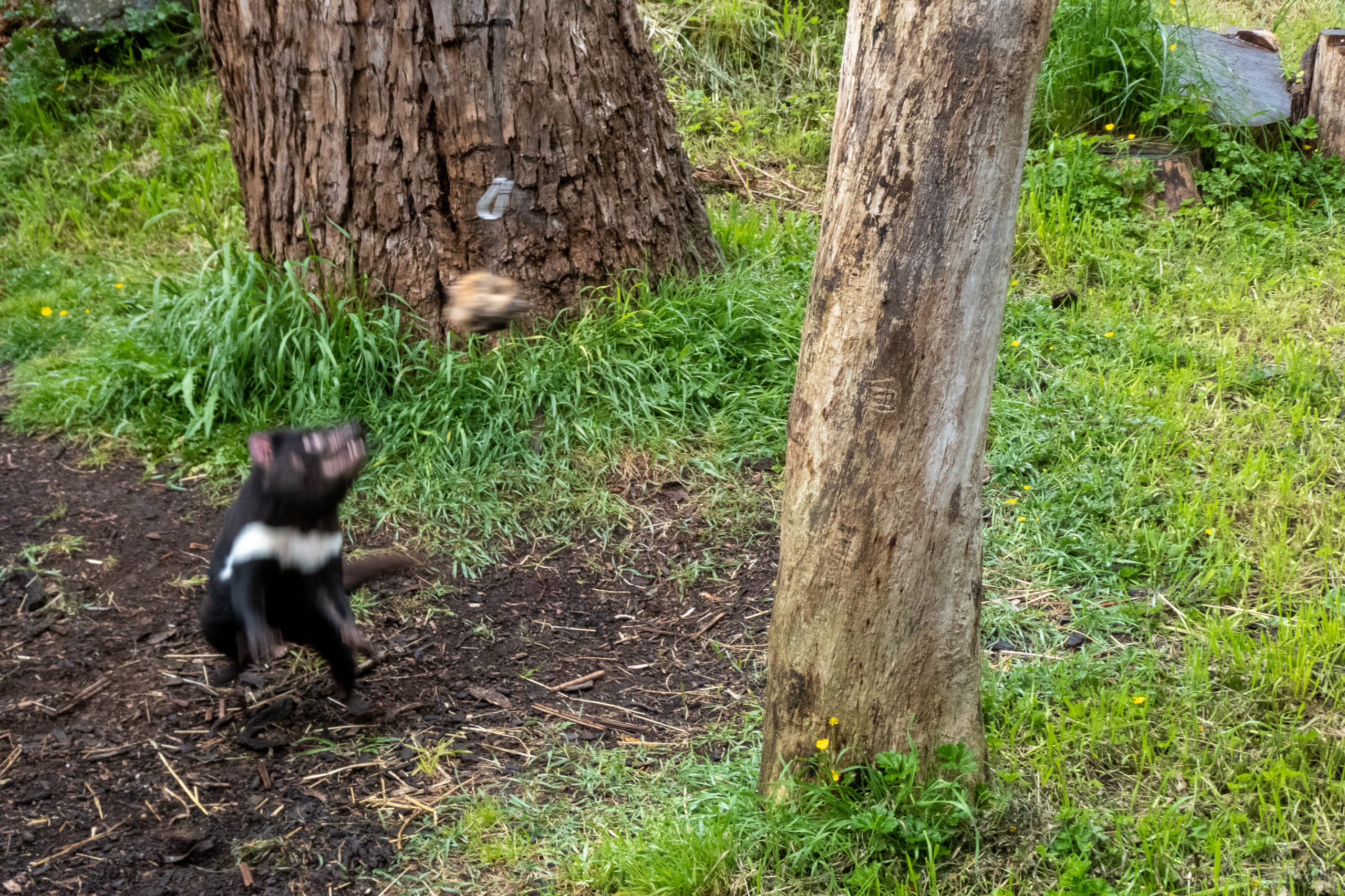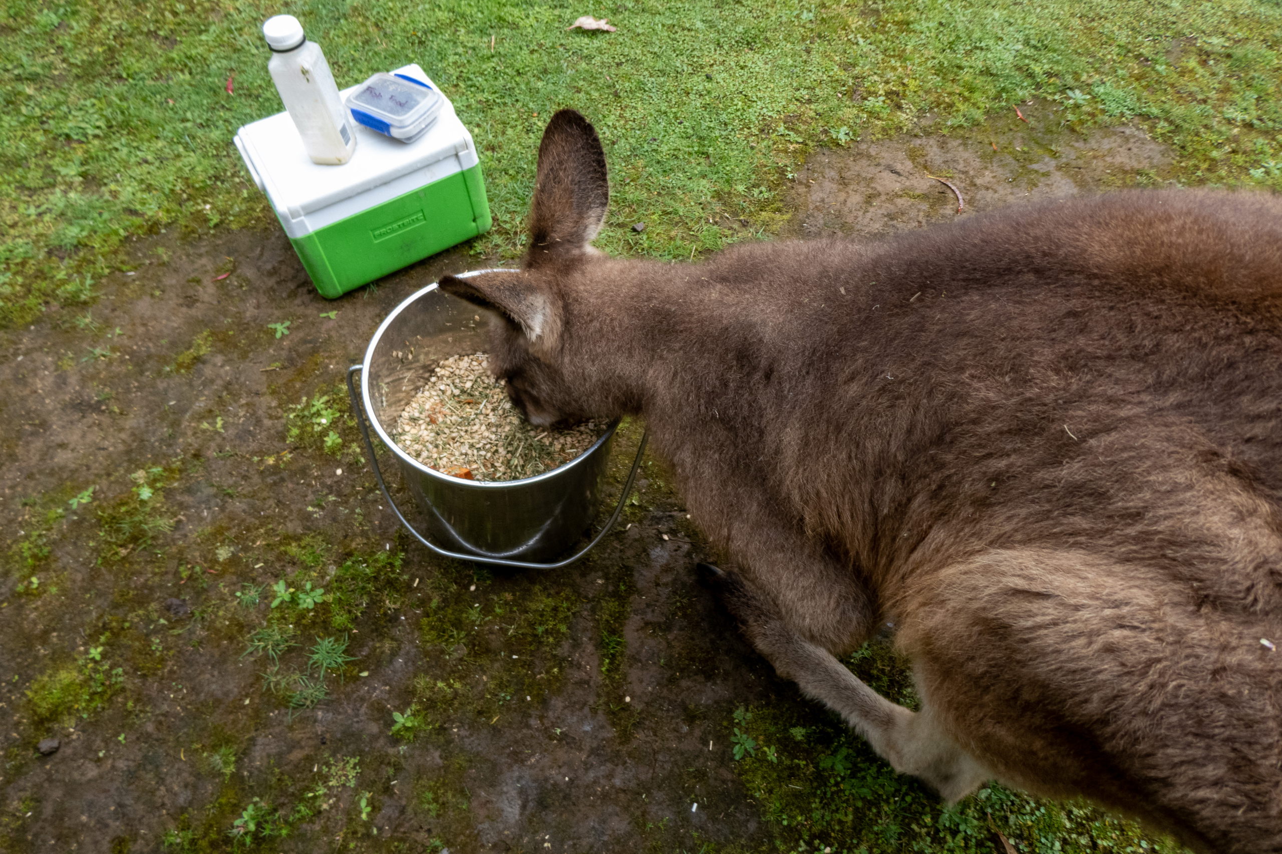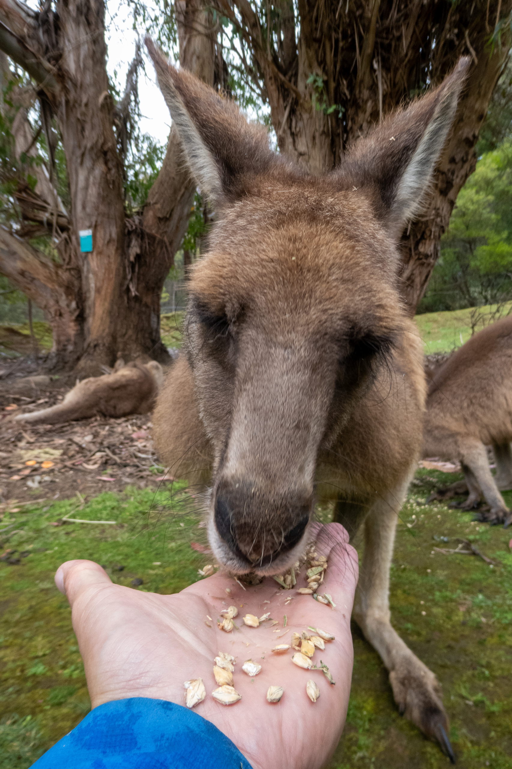 Auf der Fahrt zum Cape Houy beginnt es zu regnen. So macht die Wanderung sicher keinen Spaß und sehen werde ich auch nicht viel. Planänderung. Am Folder vom Tasmanian Devil Unzoo steht das Füttern von Kängurus auf dem Plan. Cool. Nicht viel später füttere ich die niedlichen Tiere schon mit der Hand. Ein besonders schlaues frisst direkt aus dem Kübel. 😁 Da es immer noch regnet, sehe ich mir noch einmal die Fütterung der Tasmanischen Teufel an. Den Namen haben sie übrigens aufgrund ihres Rufes, der sich echt gruselig anhört. Zufällig treffe ich die Frau, die neben mir im Flugzeug saß. Wie klein die Welt doch ist.
