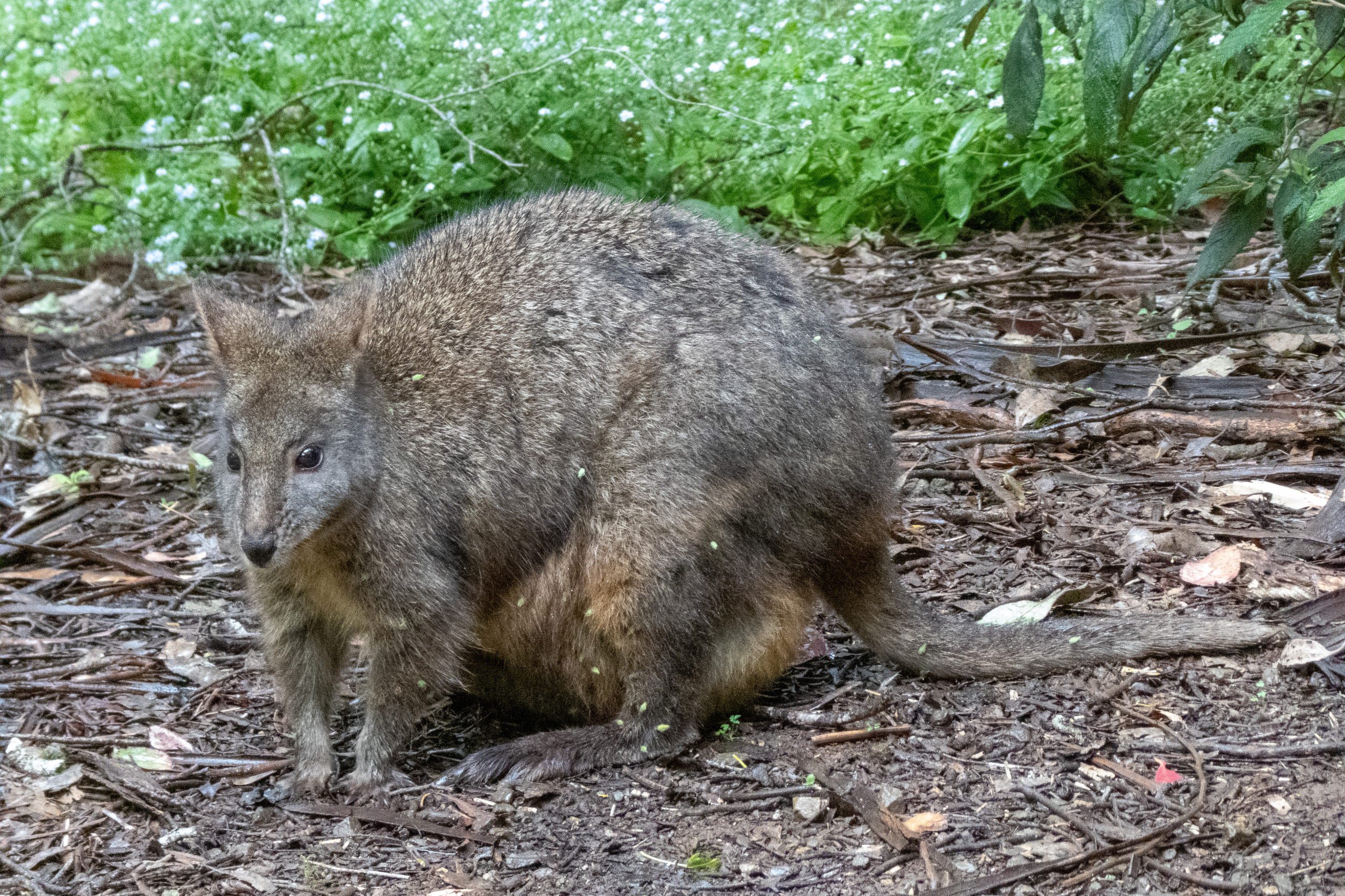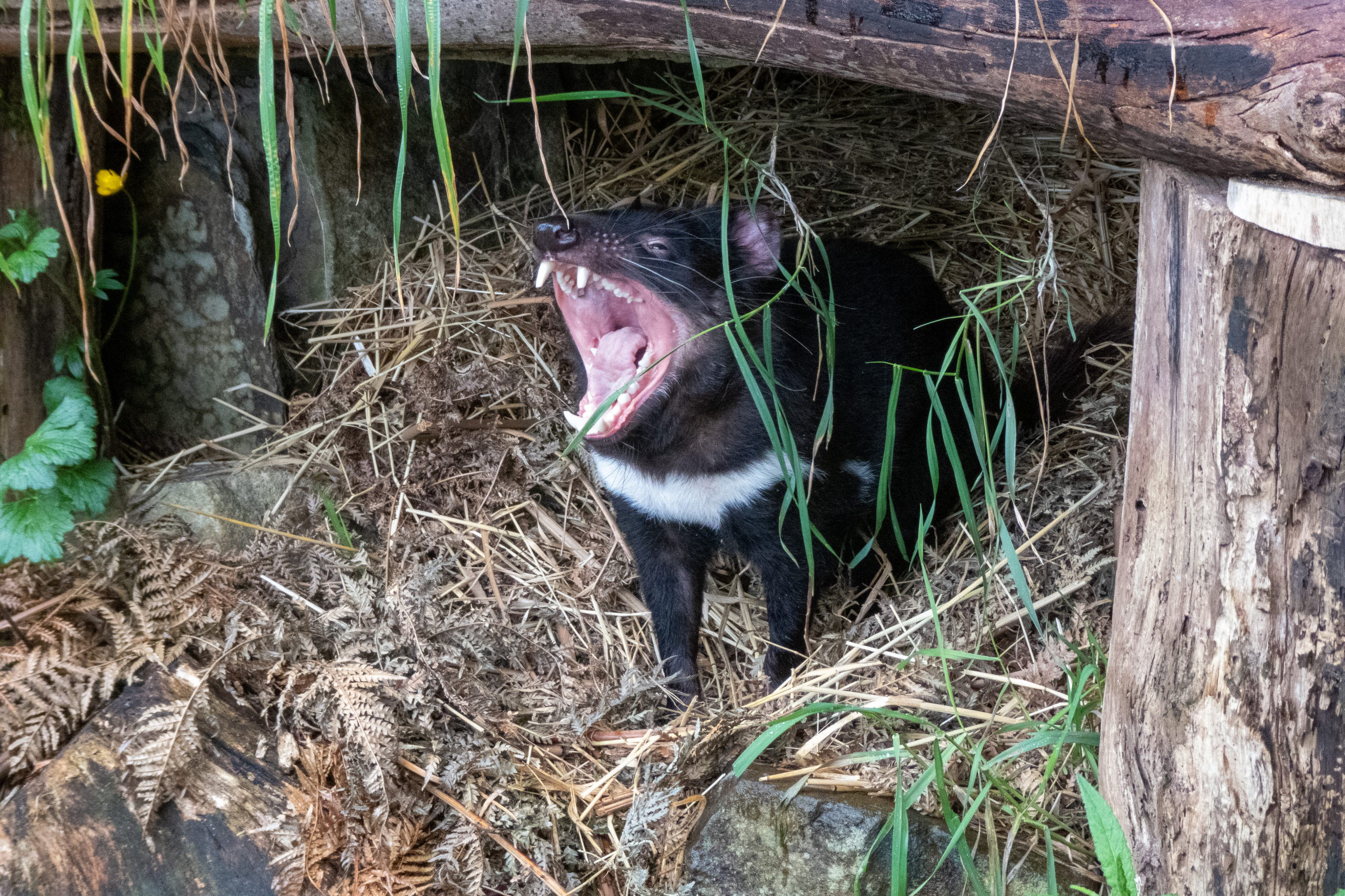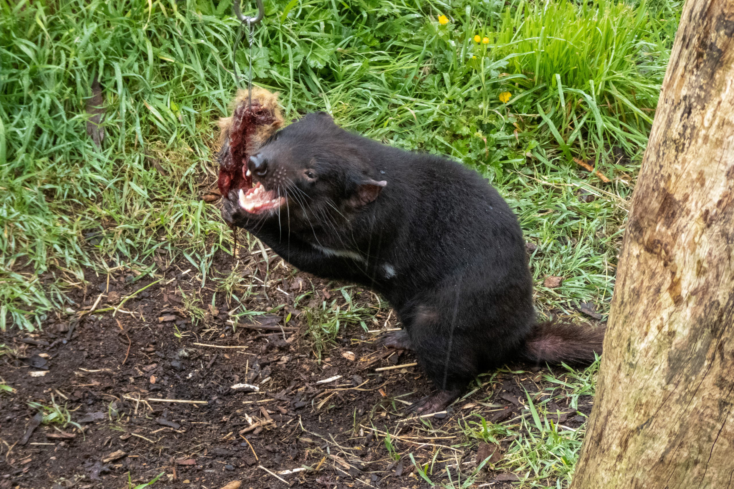 Auf der Fahrt zum Cape Houy beginnt es zu regnen. So macht die Wanderung sicher keinen Spaß und sehen werde ich auch nicht viel. Planänderung. Am Folder vom Tasmanian Devil Unzoo steht das Füttern von Kängurus auf dem Plan. Cool. Nicht viel später füttere ich die niedlichen Tiere schon mit der Hand. Ein besonders schlaues frisst direkt aus dem Kübel. 😁 Da es immer noch regnet, sehe ich mir noch einmal die Fütterung der Tasmanischen Teufel an. Den Namen haben sie übrigens aufgrund ihres Rufes, der sich echt gruselig anhört. Zufällig treffe ich die Frau, die neben mir im Flugzeug saß. Wie klein die Welt doch ist.