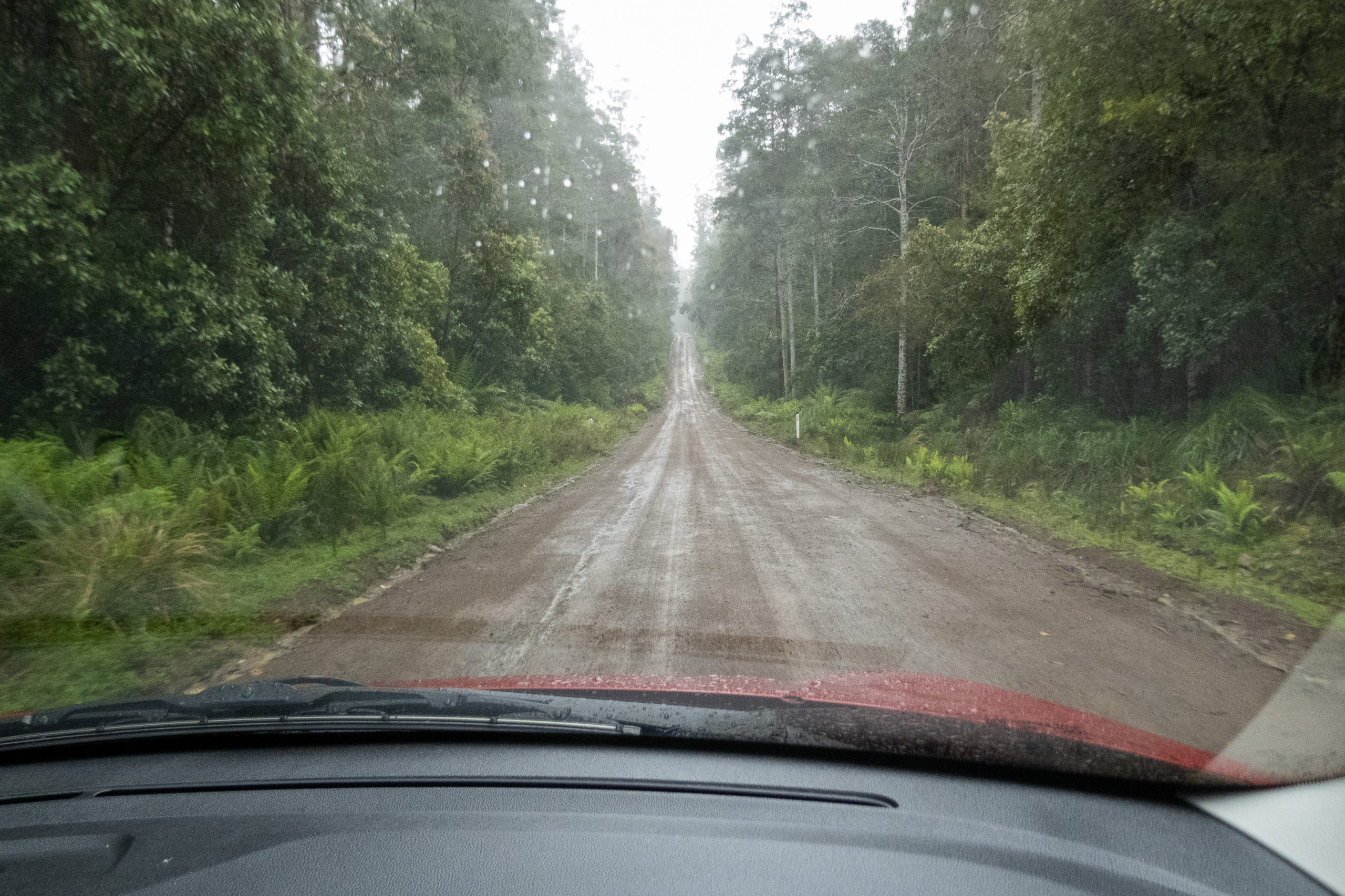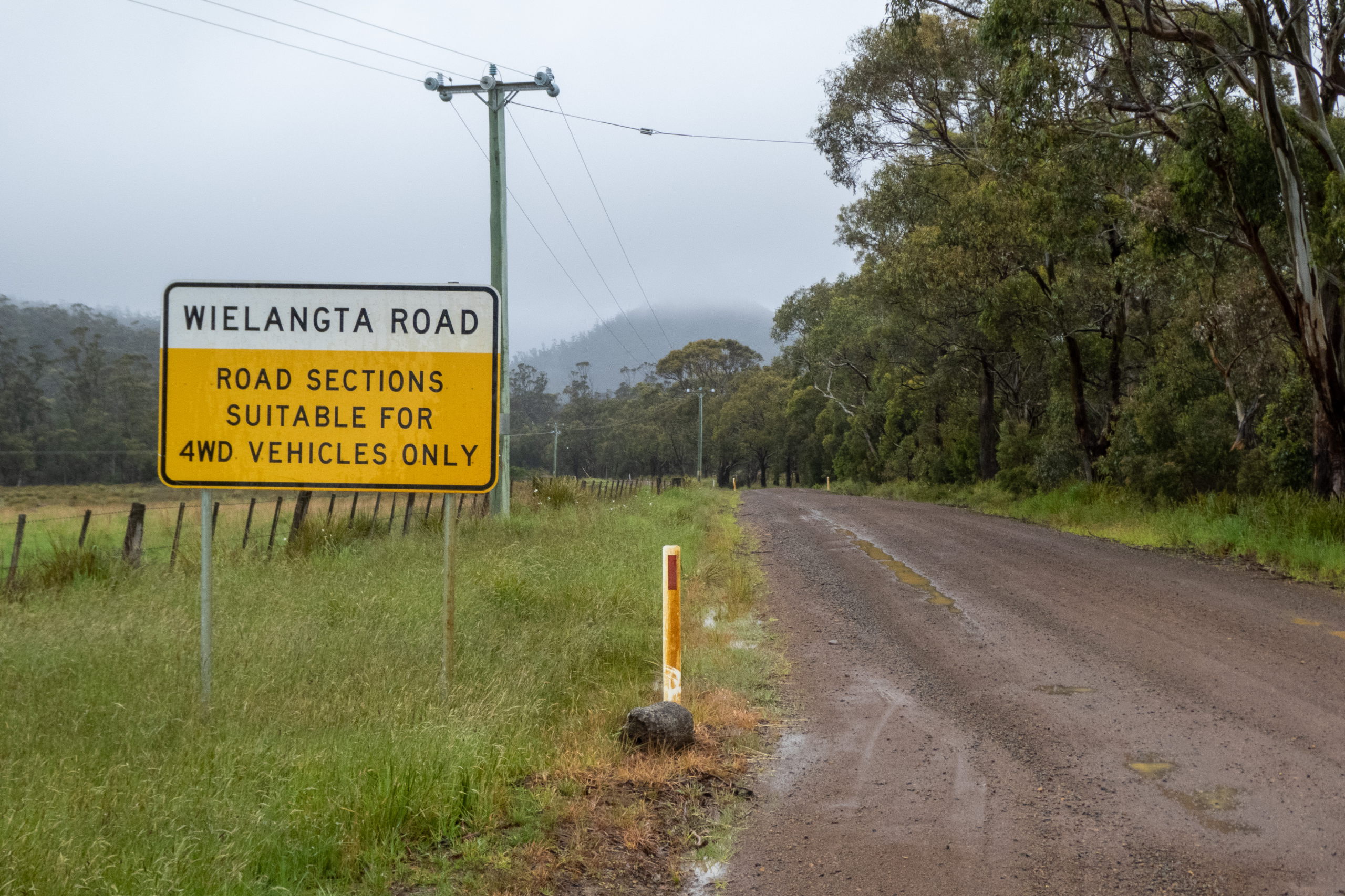 Am Nachmittag geht es bei Regen weiter. Für morgen ist ebenfalls Schlechtwetter gemeldet. Hoffentlich irrt sich der Wetterbericht, denn ich möchte den ganzen Tag auf Maria Island verbringen. Laut Desiree ein Wombat-Paradies. Plötzlich ein Schild: Straße nur für Allradfahrzeuge. Hmmm, die Schotterstraße sieht aber ziemlich gut aus. Also weiter. Bis auf ein paar Schlaglöcher und einer rutschigen Stelle ist alles easy. Links und rechts Gehoppel. Wallabies treiben sich herum. Smile.
