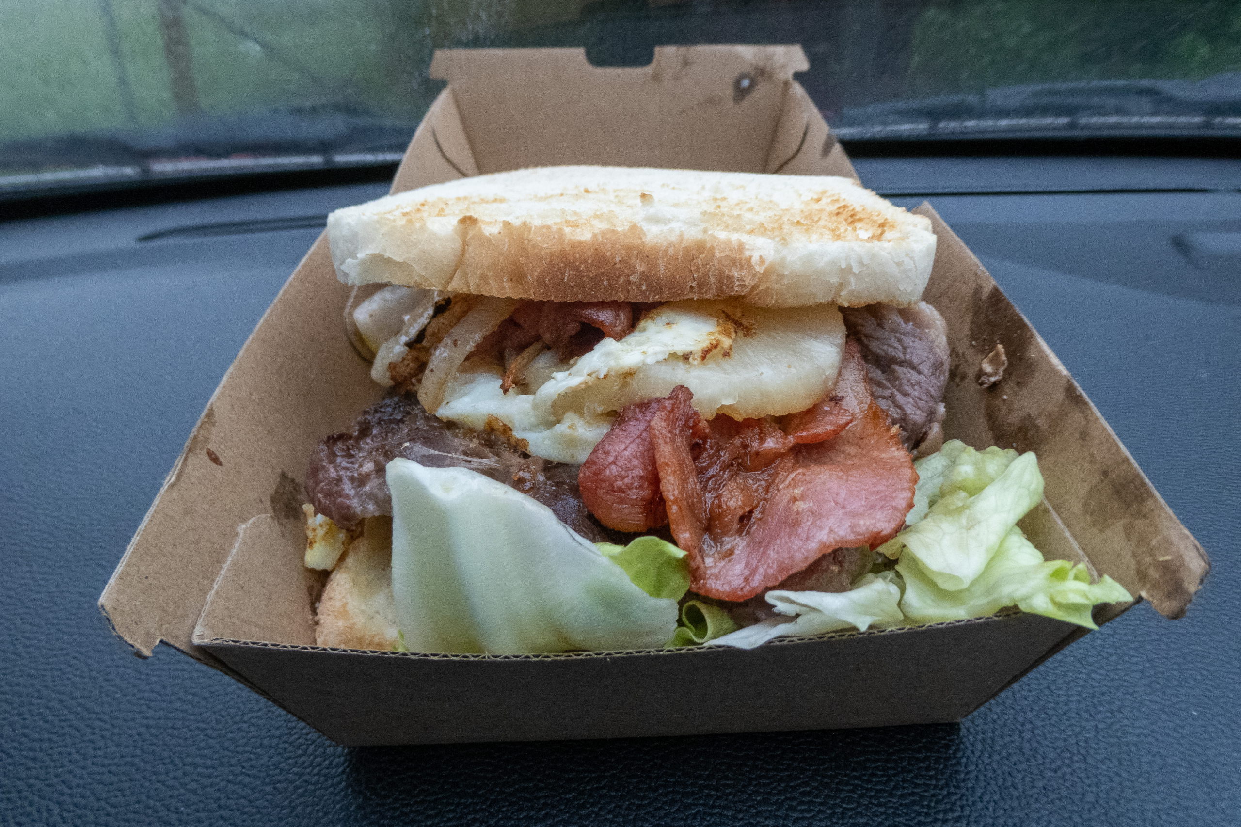 In Orford wandern Erdnussbutter und French Onion Aufstrich in meinen Essensvorrat. Klingt scheußlich, aber mal gucken. Etwas später erreiche ich Triabunna und parke auf dem kostenlosen Campground hinter dem Spring Bay Hotel, das heute leider geschlossen ist. Sonntag. Schade, ich hätte sie mit einem Bier gesponsert. Nach einer kurzen Erkundungsrunde gönne ich mir bei einem kleinen Essensstand ein Steak Sandwich with “The Lot”. “The Lot” besteht aus Salat, Tomaten, Käse, Schinken, Rote Rübe, Ananas, Zwiebeln und Ei. Also allem, was die Küche so hergibt. Normalerweise mag ich Ananas in warmem Essen nicht, aber nach sechs Wochen Jause, ist ein Steak Toast, egal in welcher Kombination, eine geniale Abwechslung.