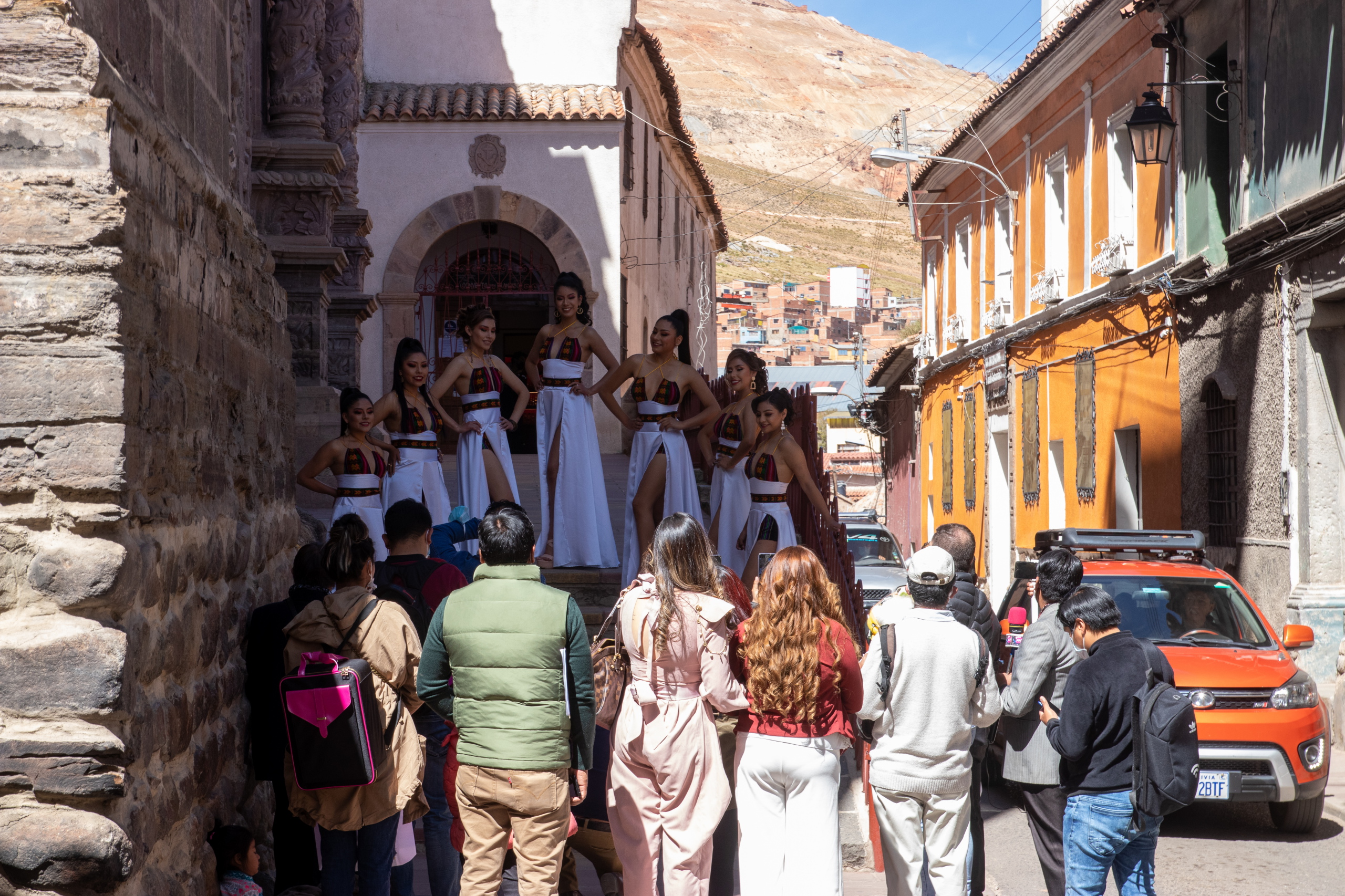 Durch die reichen Silbervorkommen im Cerro Rico war die Stadt vor langer Zeit eine der reichsten Städte der Welt. Das ist heute noch anhand der schönen Kolonialbauten zu sehen. Es herrscht das volle Gewusel und im Zentrum finden kleinere Proteste der indigenen Bevölkerung statt. Vermutlich für bessere Bedingungen in den Minen. An einer Kirche posen die hübschen Mädels vom Schönheitswettbewerb der Region Potosí.