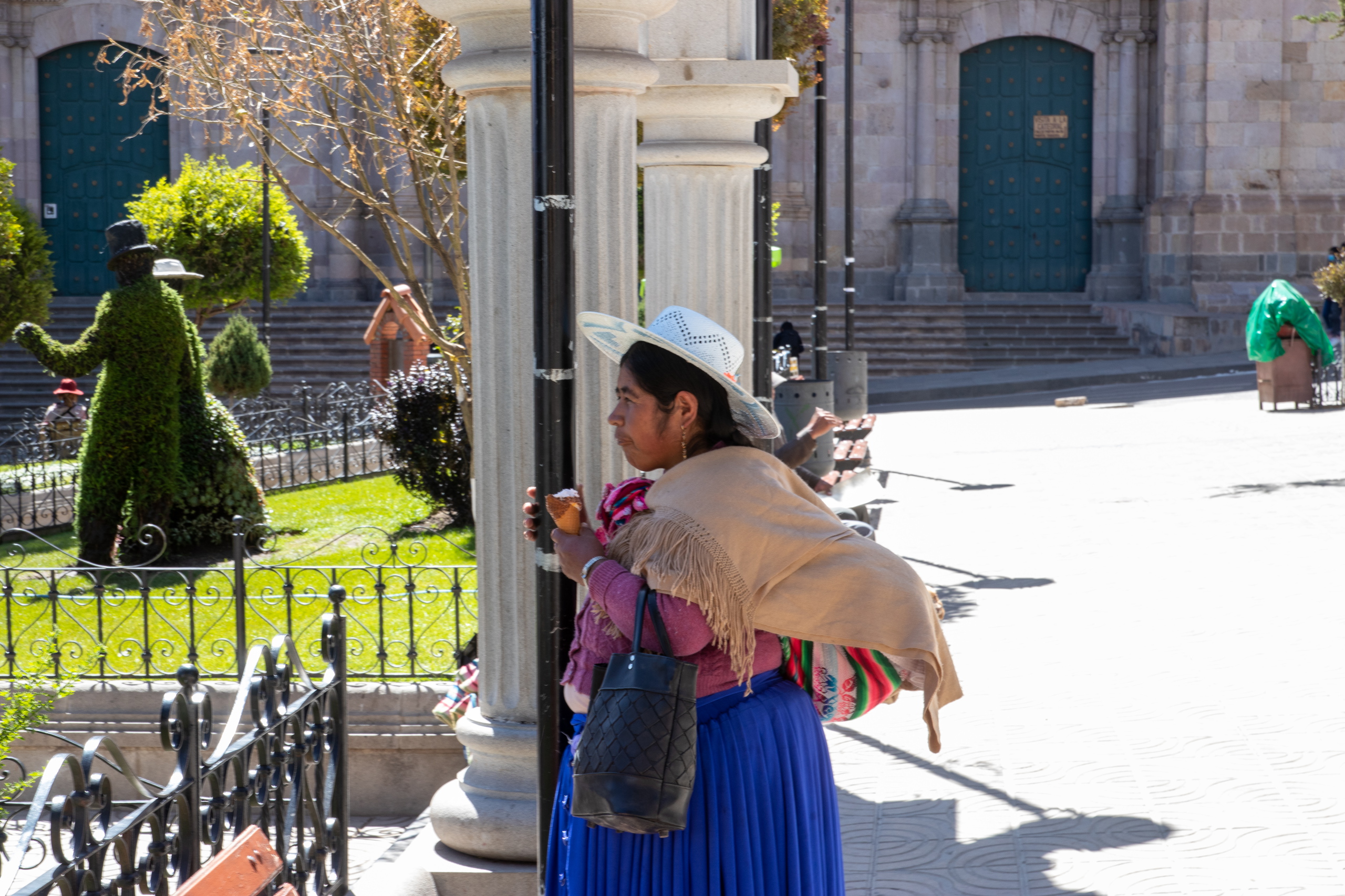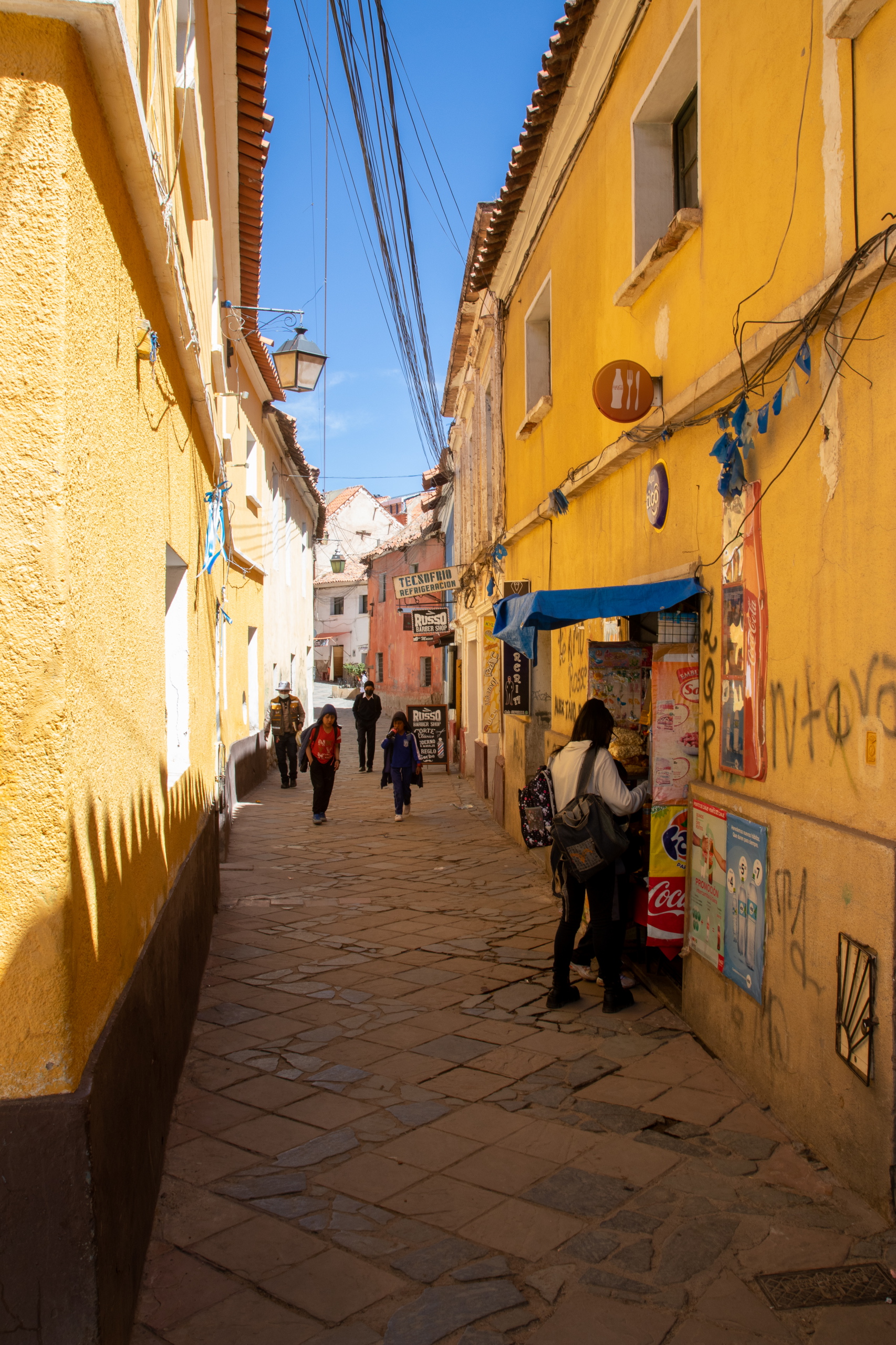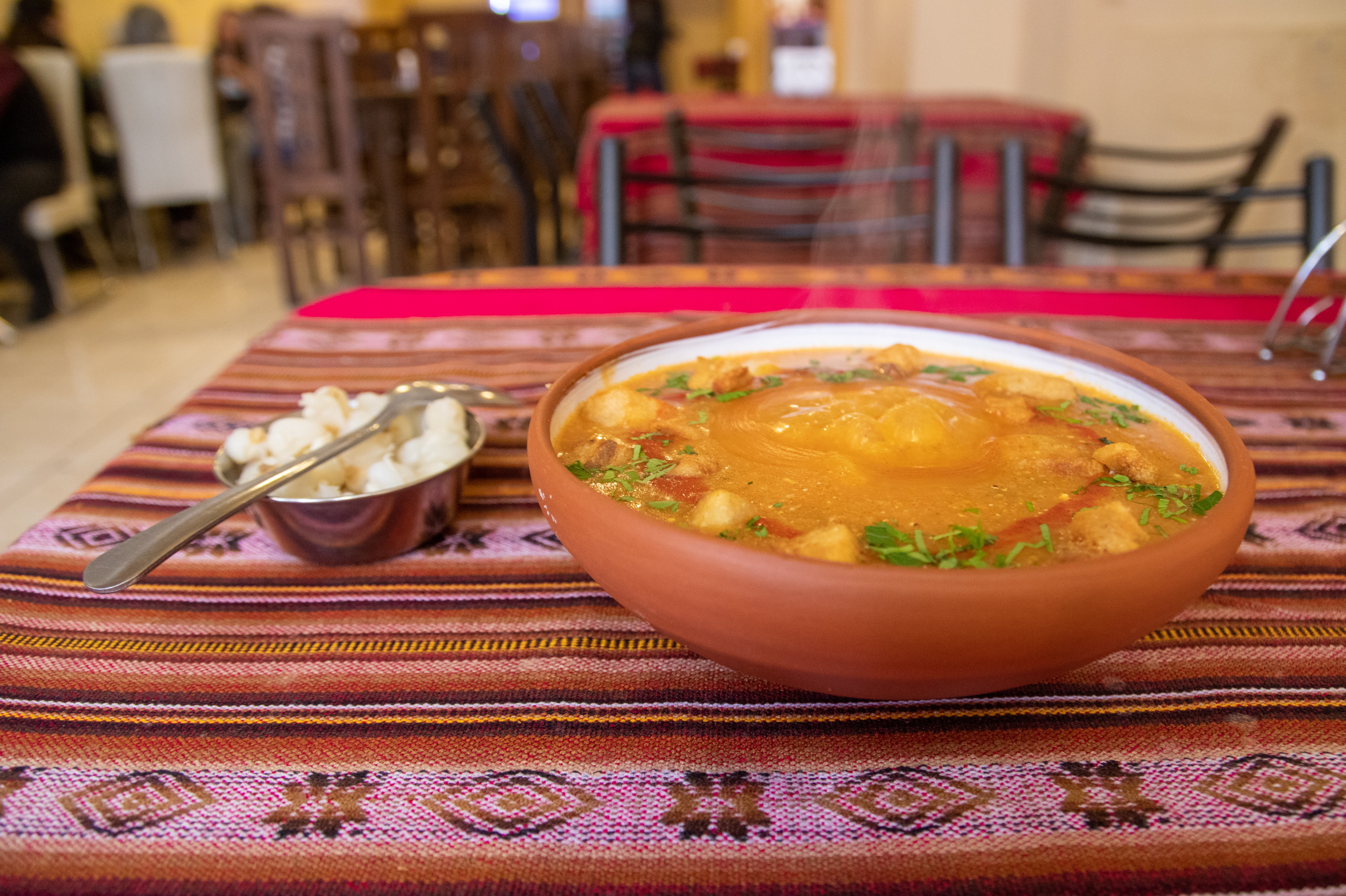 Ich folge der Empfehlung der Agentur und esse in einem Restaurant die lokale Spezialität K’alaphurka, eine kräftige, dicke Suppe mit Grammeln, Fleisch und Erdäpfel. Das Besondere ist der heiße Vulkanstein, der in die Mitte kommt, wodurch die Suppe brodelt und raucht. Auf dem Weg zur Agentur komme ich an einer Bank vorbei, vor der ein Typ mit Shotgun steht. Auf ein Foto verzichte ich. 😄 Das Kopfweh bleibt aus. Alles richtig gemacht für’s Akklimatisieren.