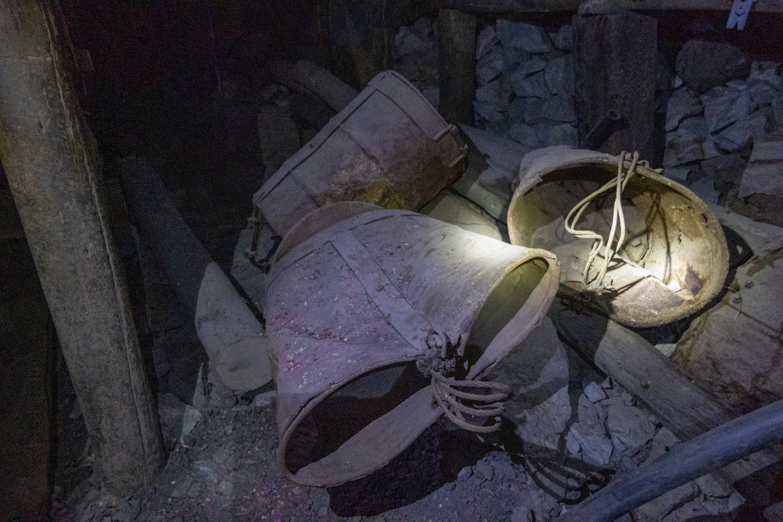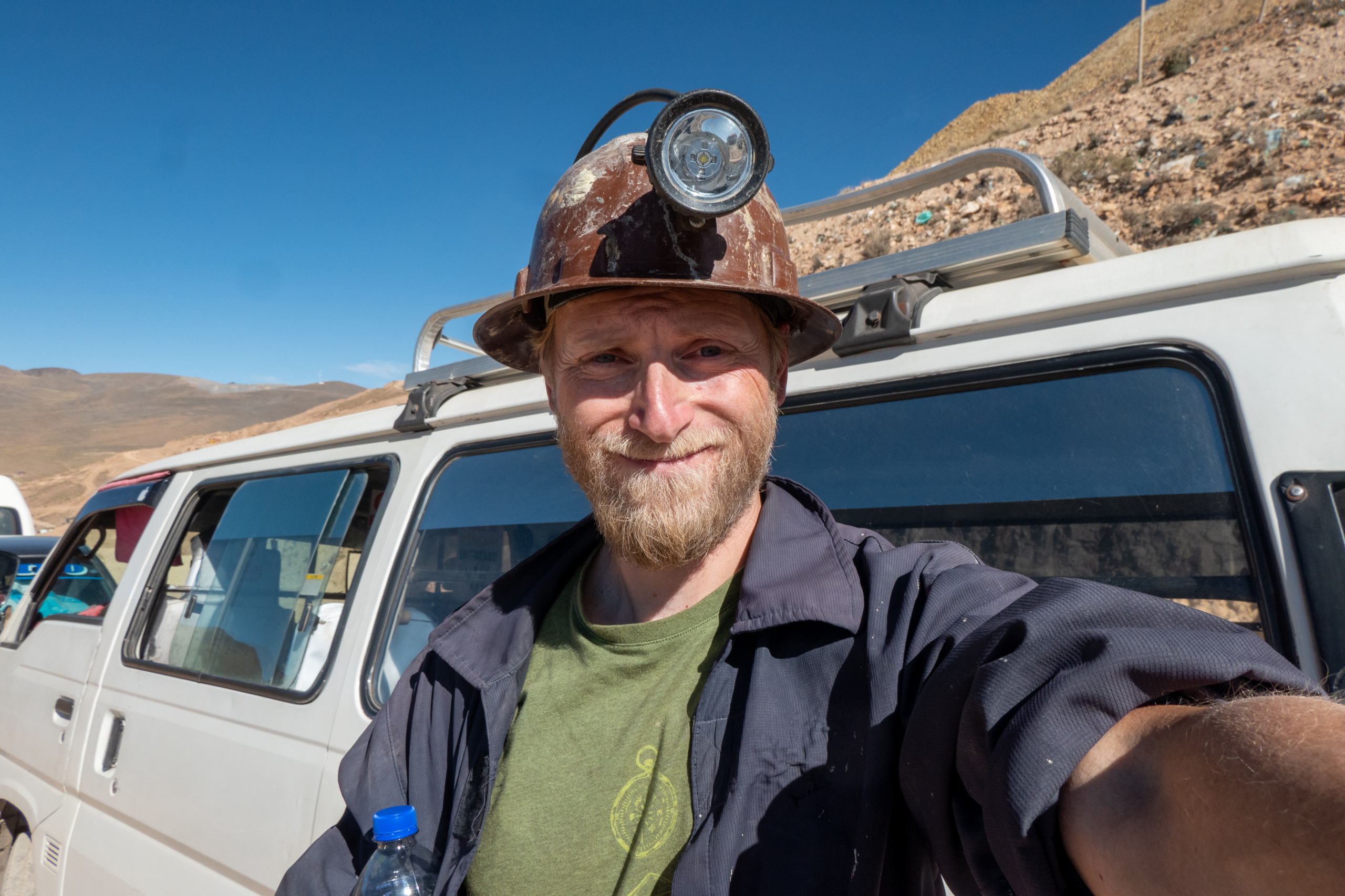 Um dreiviertel zwei Uhr fahren wir zum Ausrüstungslager und bekommen unser Outfit. Es gibt authentische Kleidung und wir sehen nun aus, wir die “echte” Minenarbeiter. Weiter geht es zum Mercado Minero, wo es alles gibt, das ein Minenarbeiter so braucht. Wir kaufen Wasser, Alkohol, Handschuhe und Coca-Blätter als Geschenk für die Minenarbeiter. Nun geht es den Cerro Rico hinauf bis zur Mina Caracoles auf 4400 m.