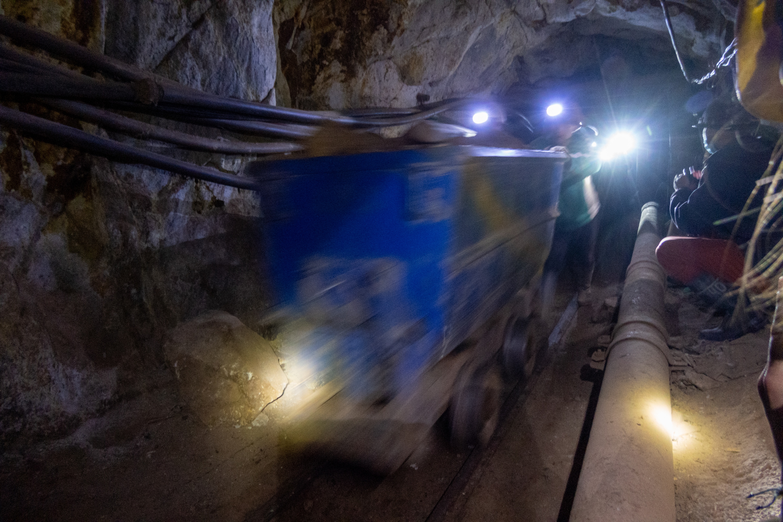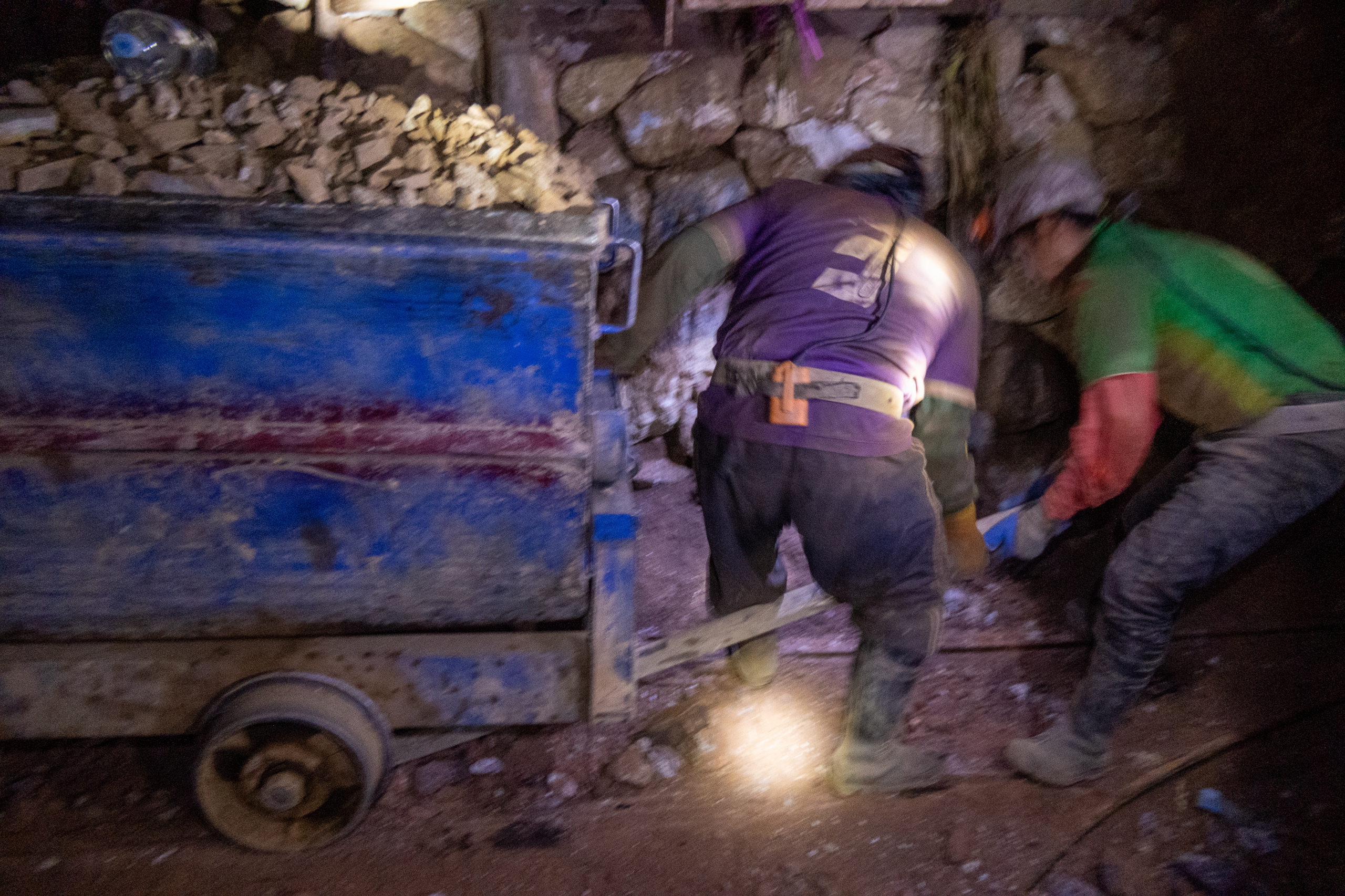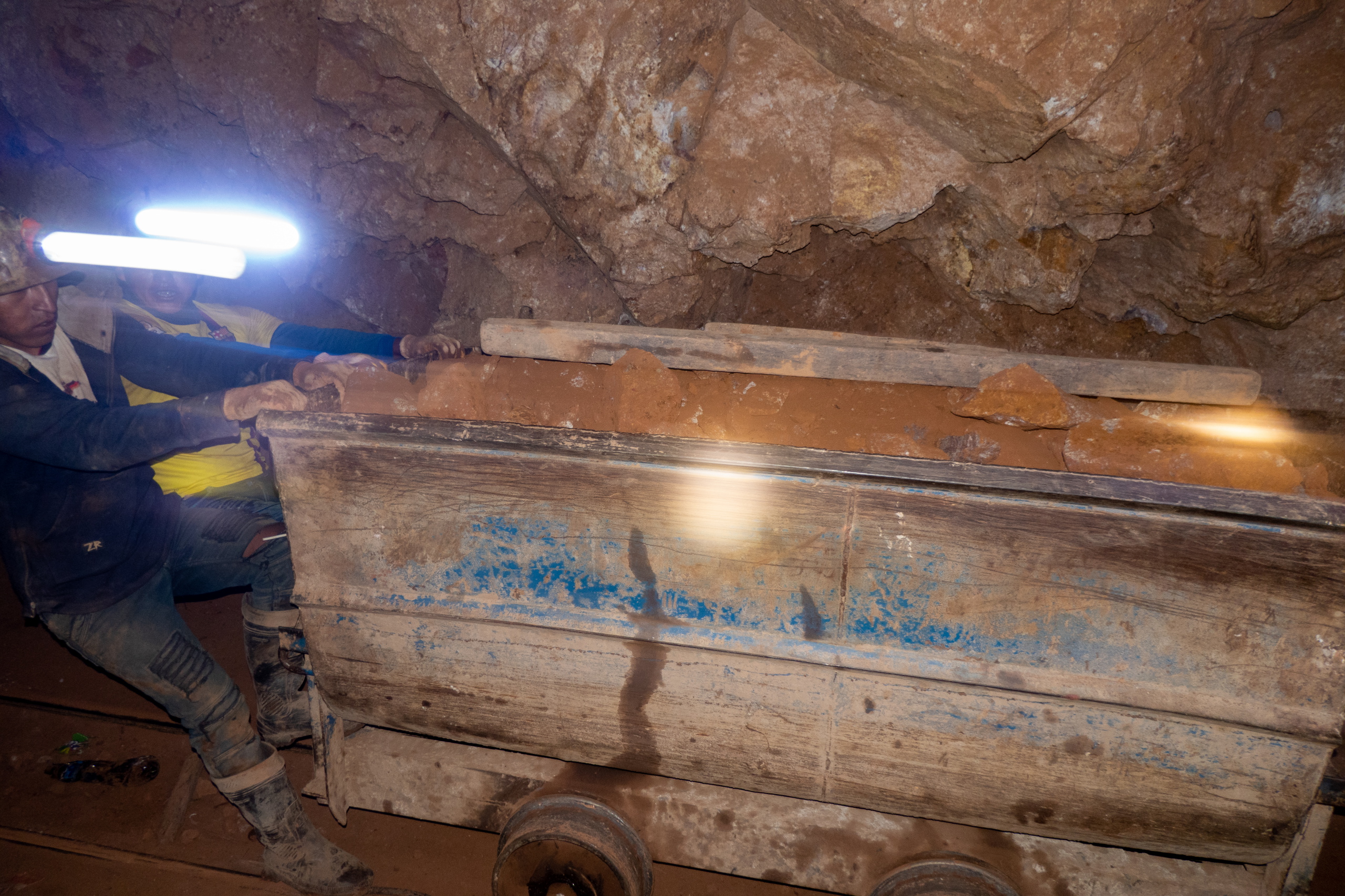 Wir gehen in die Mine und müssen immer wieder den Wagen ausweichen, die von zwei meist jungen Männern geschoben werden. Bremsen gibt es keine. Wir gehen ca. 500 m in die Mine und der Guide erzählt über die geförderten Rohstoffe, die Arbeitsbedingungen und El Tito, dem Geist der im Berg lebt. Die Mineros glauben, dass es schlecht für den Körper ist, in der Mine zu essen. Es gibt nur Getränke und jede Menge Coca-Blätter. Manche Arbeiter haben am Ende der Schicht bis zu 200 im Mund und eine dicke Backe wie nach einer Zahn-OP. Der Guide spricht mit einigen Minenarbeitern und übersetzt für uns. Keiner der Mineros wird älter als 45 Jahre. Werden sie nicht verschüttet, oder haben einen Unfall, sterben sie an Staublunge. Das ist echt ein Knochenjob.