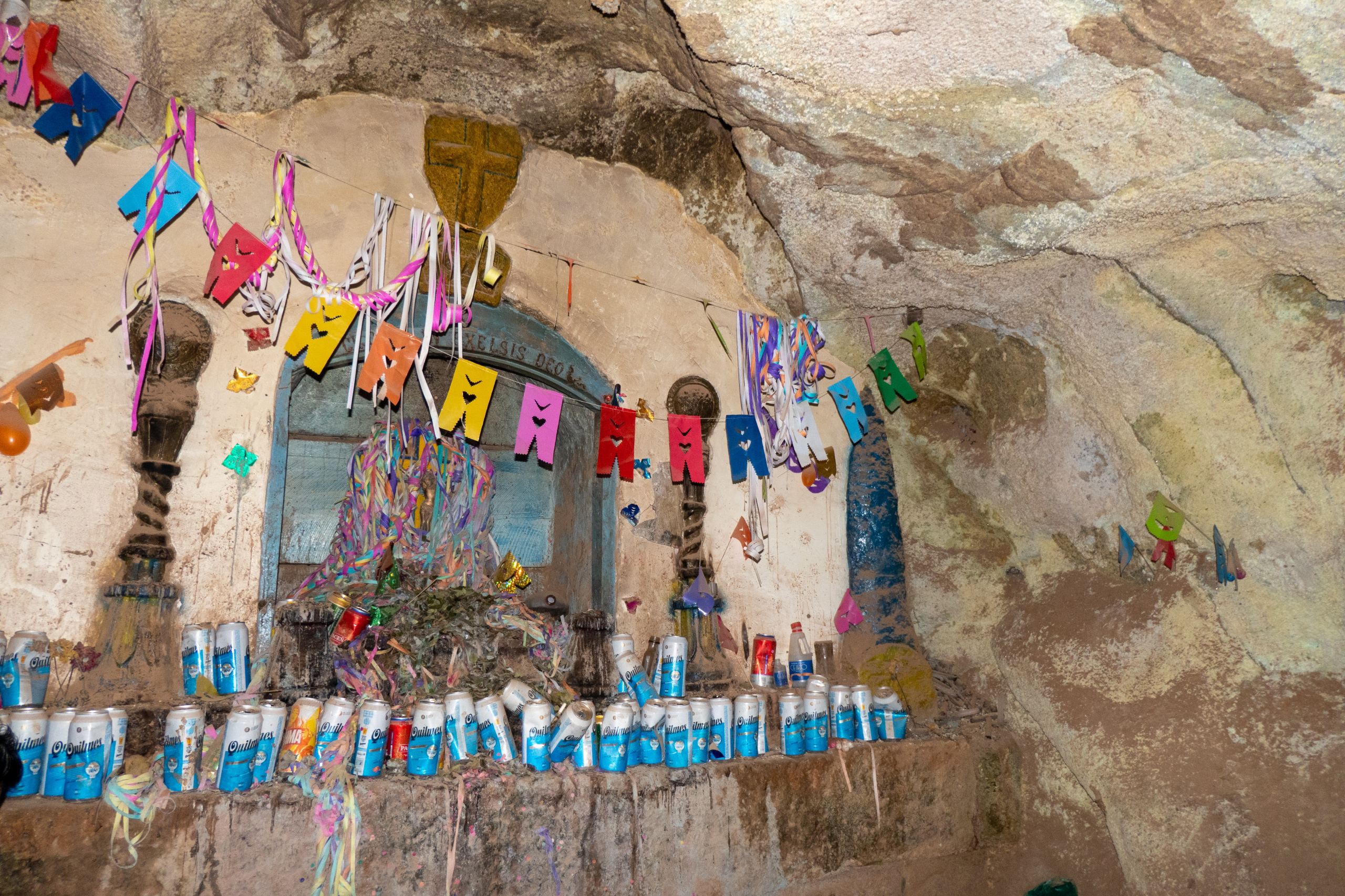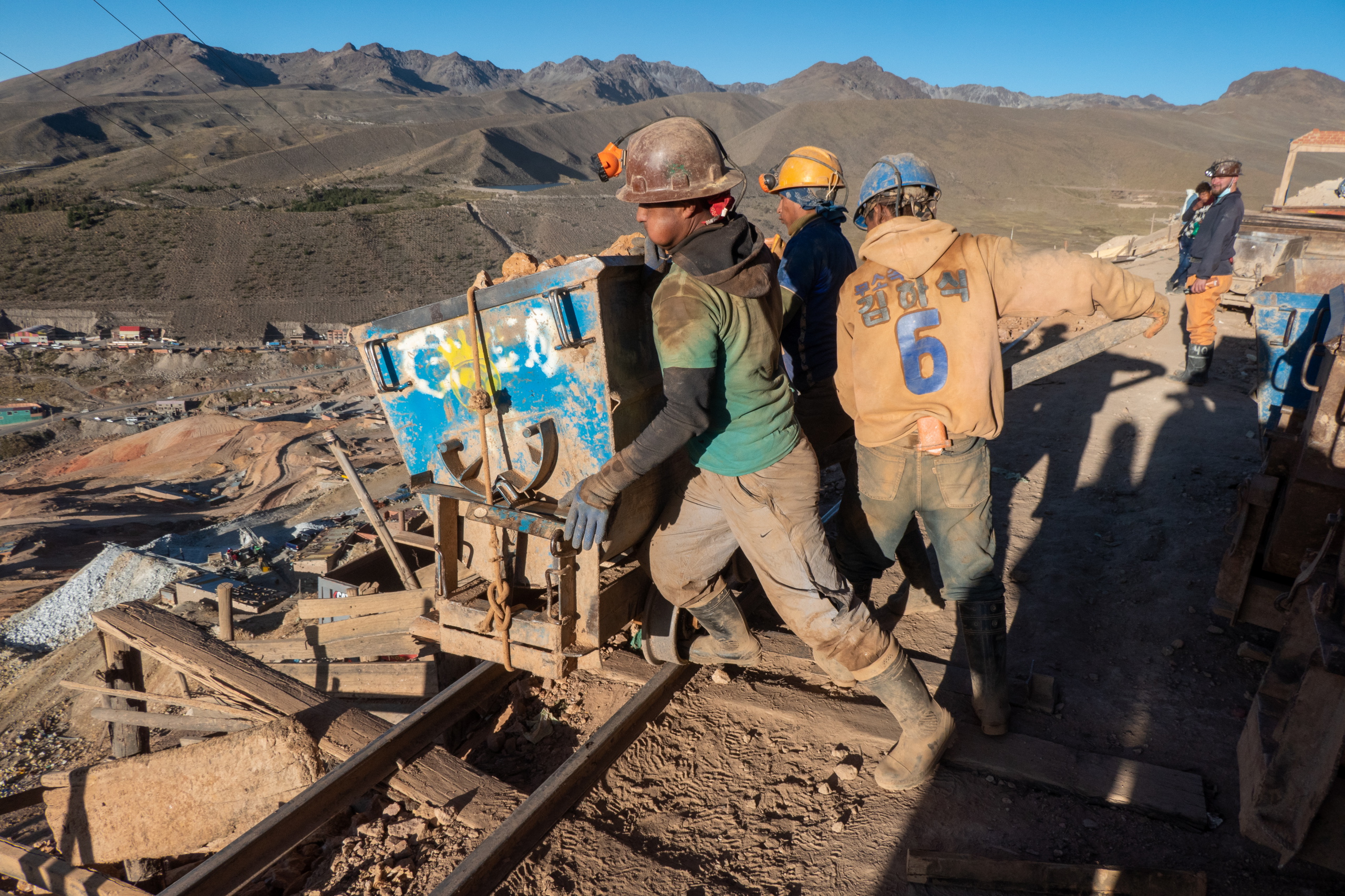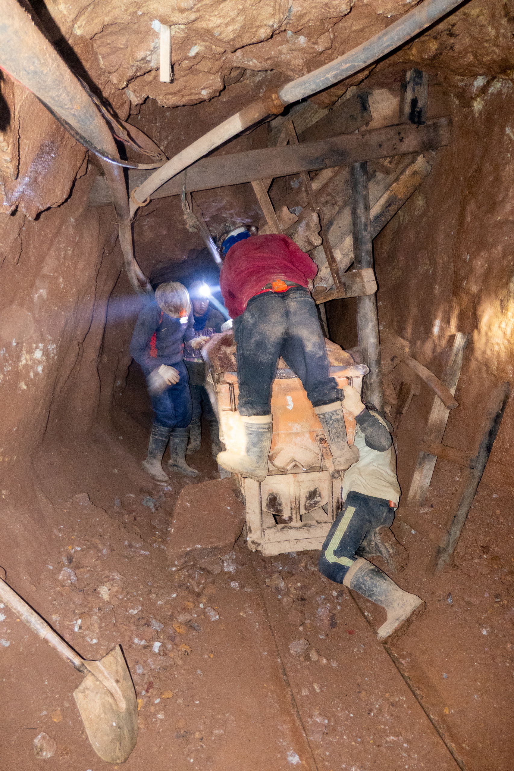 Wir gehen in die Mine und müssen immer wieder den Wagen ausweichen, die von zwei meist jungen Männern geschoben werden. Bremsen gibt es keine. Wir gehen ca. 500 m in die Mine und der Guide erzählt über die geförderten Rohstoffe, die Arbeitsbedingungen und El Tito, dem Geist der im Berg lebt. Die Mineros glauben, dass es schlecht für den Körper ist, in der Mine zu essen. Es gibt nur Getränke und jede Menge Coca-Blätter. Manche Arbeiter haben am Ende der Schicht bis zu 200 im Mund und eine dicke Backe wie nach einer Zahn-OP. Der Guide spricht mit einigen Minenarbeitern und übersetzt für uns. Keiner der Mineros wird älter als 45 Jahre. Werden sie nicht verschüttet, oder haben einen Unfall, sterben sie an Staublunge. Das ist echt ein Knochenjob.