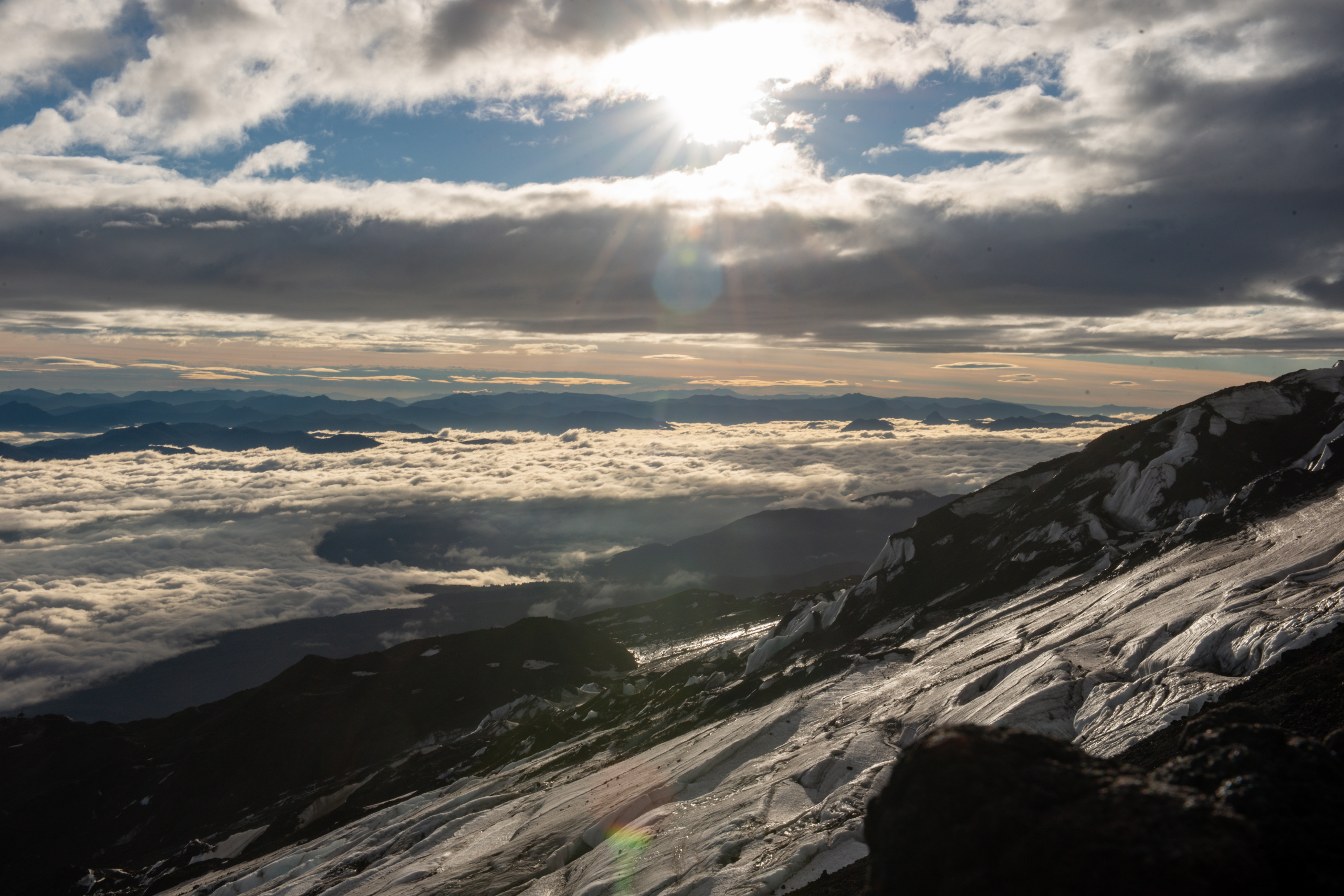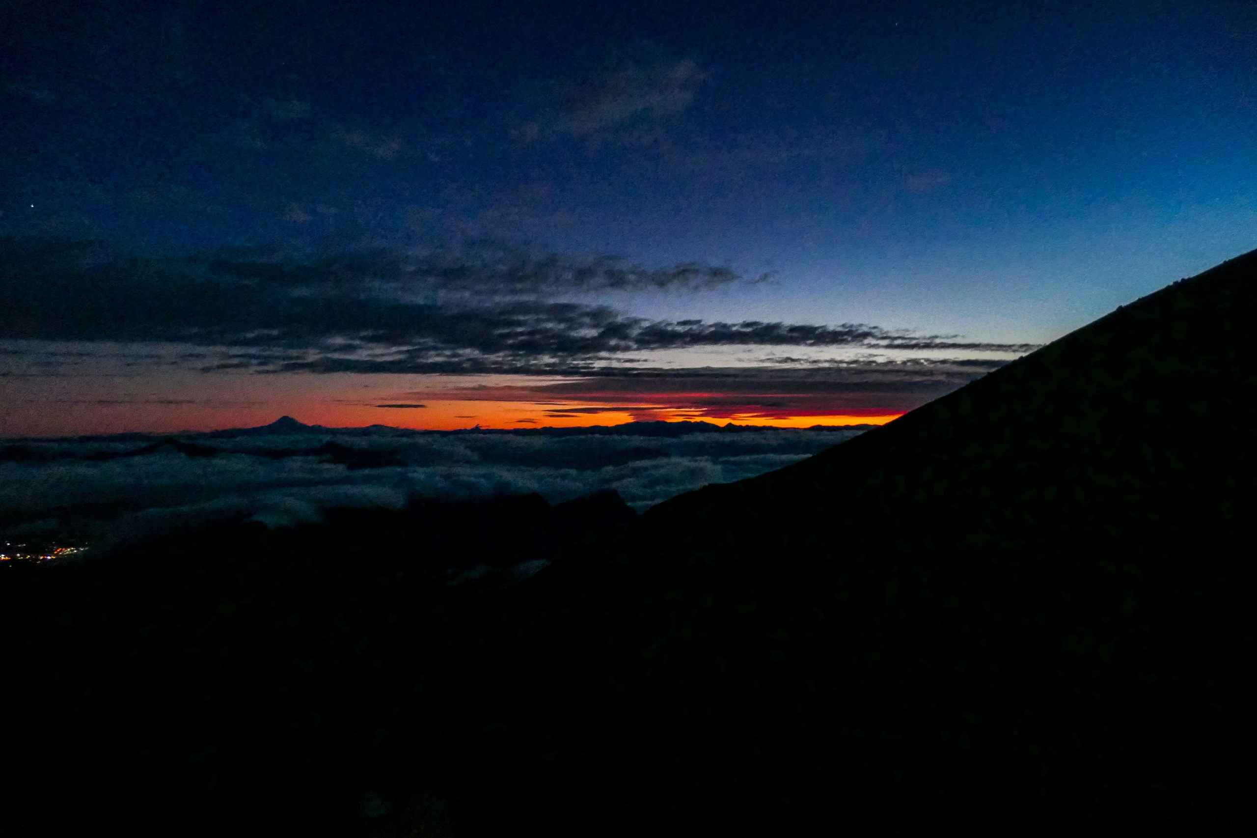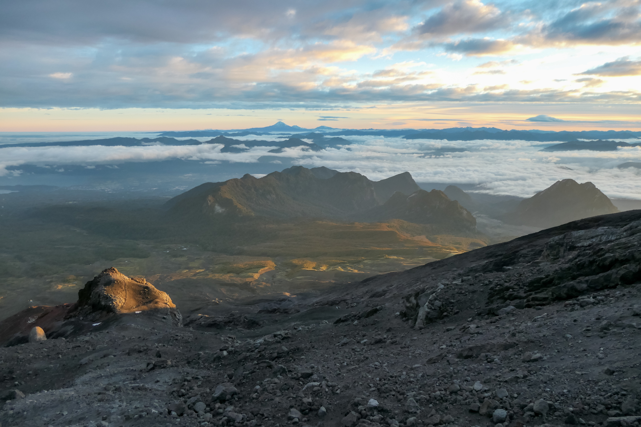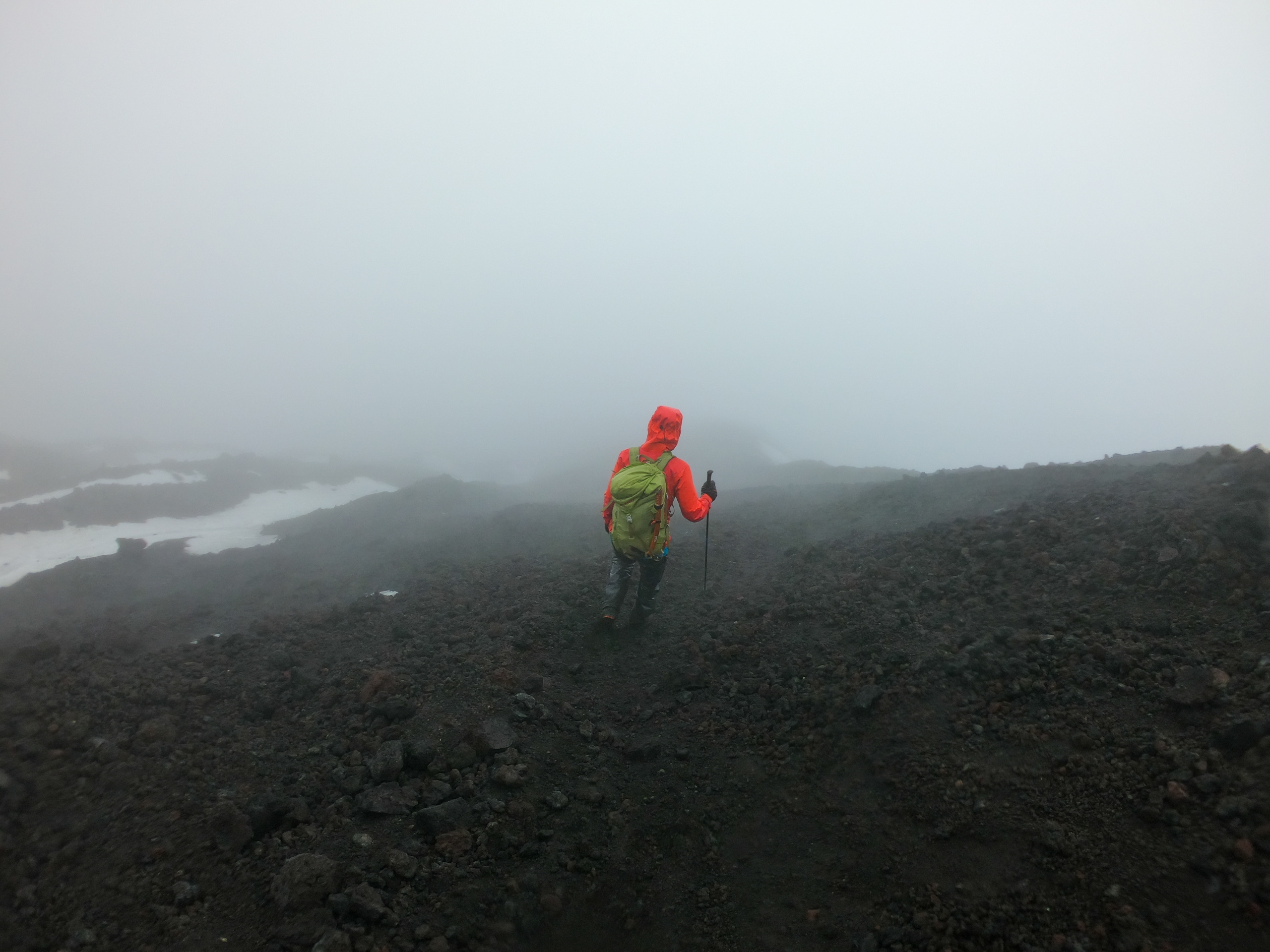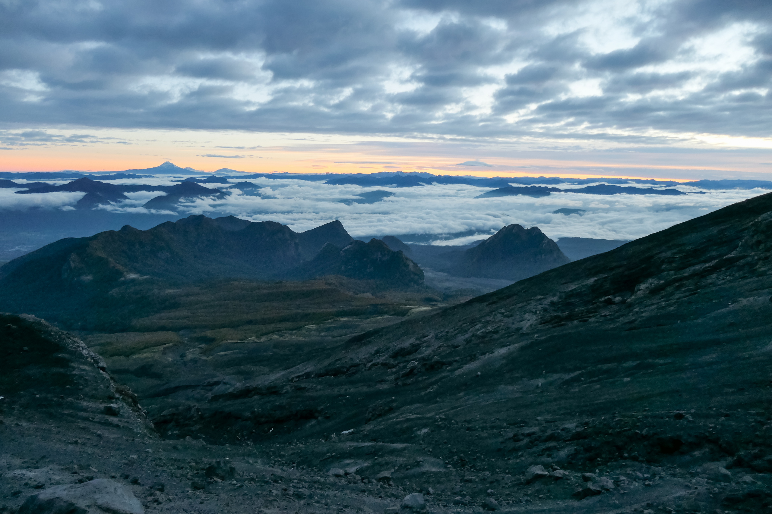 Nach einer sehr unruhigen Nacht reißt mich der Wecker um dreiviertel fünf Uhr aus dem Schlaf. Nach einer halben Stunde gehen wir los. Die ersten 400 Höhenmeter im losen Vulkansand sind für mich und meine angeschlagene Verdauung extrem stark. Ich überlege mir so weit mitzugehen, solange ich alleine zurück gehen kann. Sollte der Weg schwieriger werden, drehe ich um, damit die beiden ohne mich auf den Gipfel gehen können. Nach einer gefühlten Ewigkeit erreichen wir die Bergstation vom Lift. Diese ist nicht nur defekt, sondern total zerstört. Eine halbe Tafel Schokolade und eine ausgedehnte Pause zaubern mir wieder Farbe ins Gesicht und ich fühle mich deutlich besser. Nur das Wetter spielt nicht sonderlich mit.
