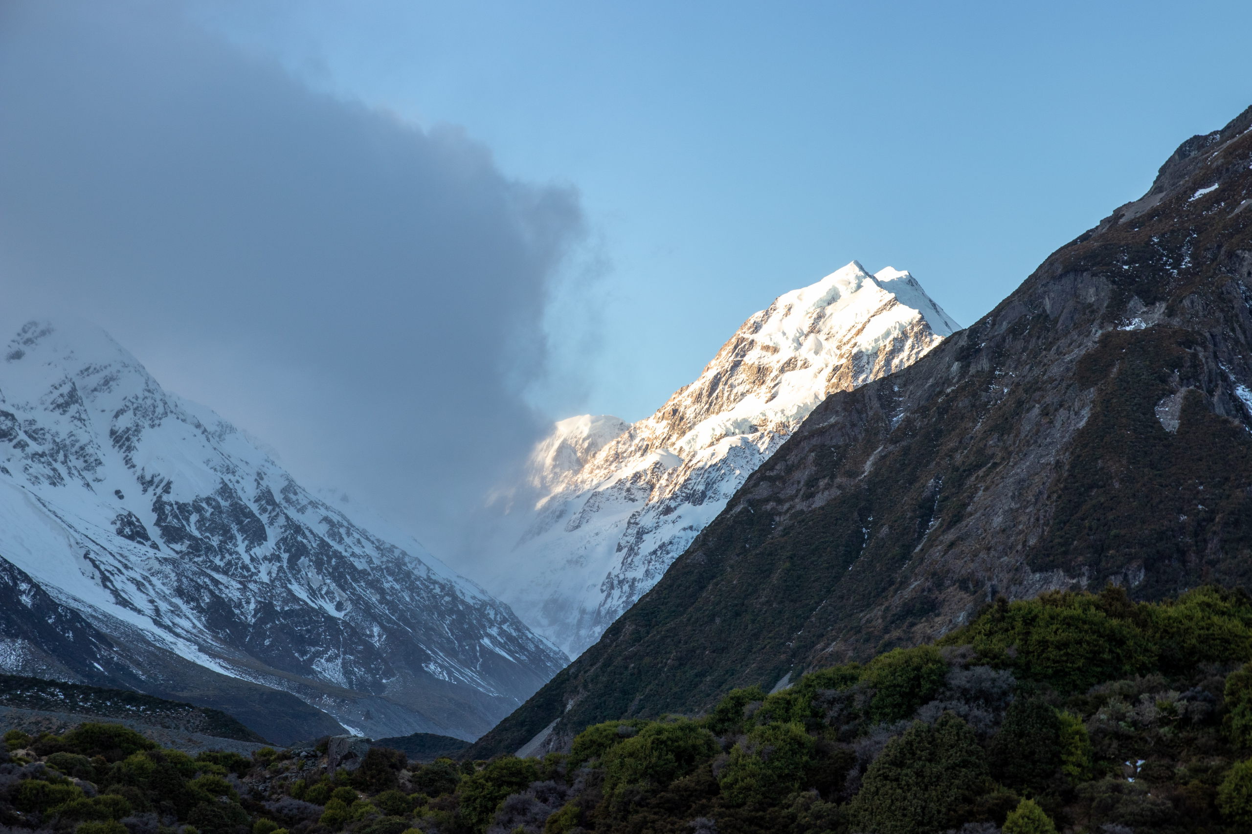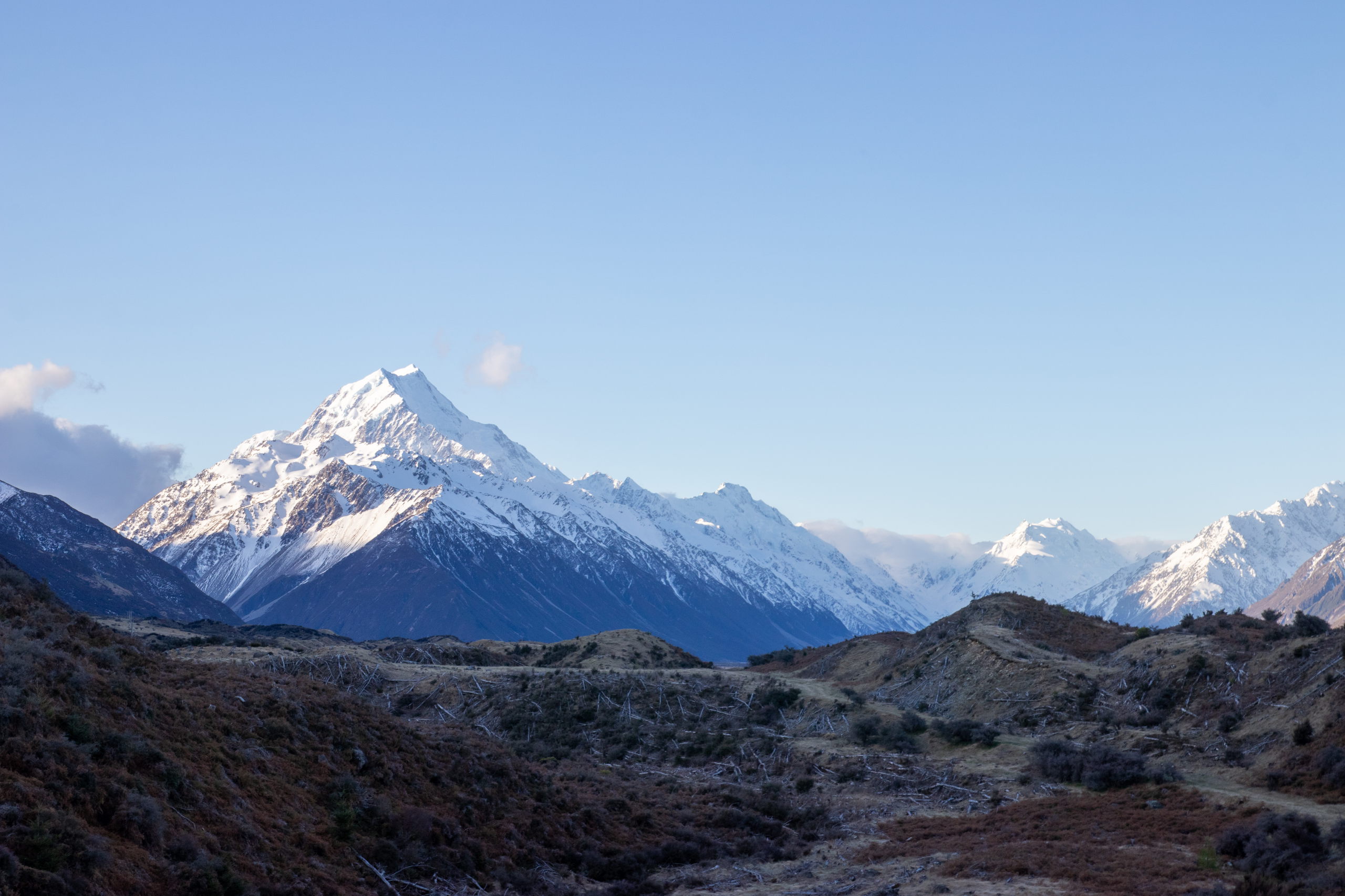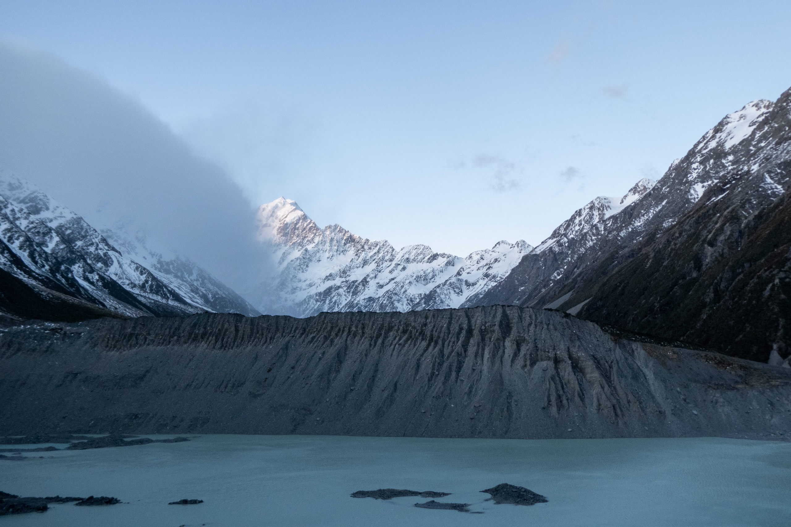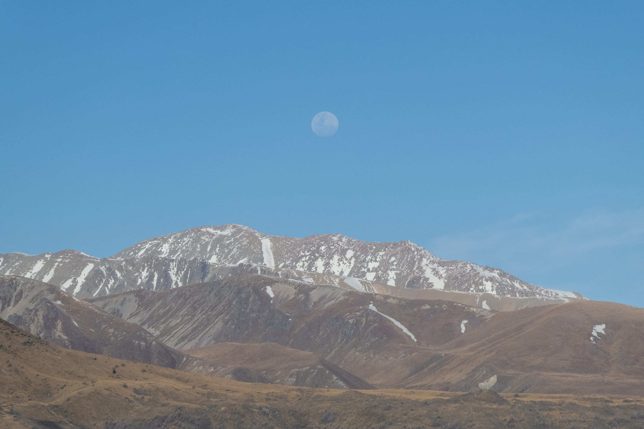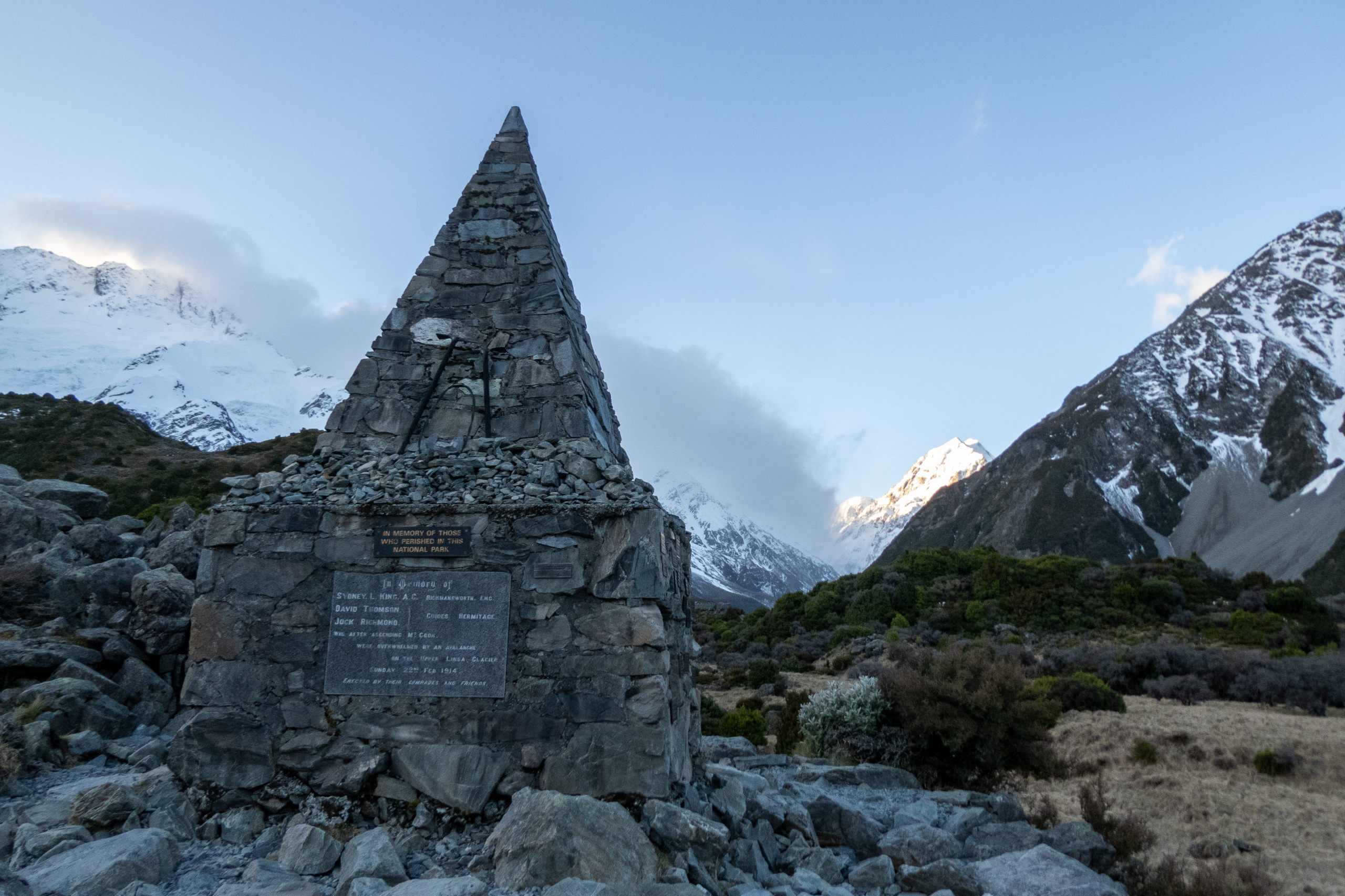 Immer am Lake Pukaki entlang geht es zur White Horse Hill Campsite im Mount Cook National Park bis auf nicht ganz 800 Meter hoch. Hinter einem Hügel blinzelt der Namensgeber des Nationalparks hervor. Ich beeile mich und gehe zum Gedenkstein der verunglückten Bergsteiger hoch, von wo aus der Mount Cook in den letzten Sonnenstrahlen zu sehen ist. Im Anschluss rausche ich noch zum Kea Point hoch, da ich mir von dort ebenfalls eine gute Sicht erwarte. Hinter der Moräne ist der Gipfel gut zu sehen, jedoch ist die Sonne schon untergegangen. In und um das Camp treiben sich einige Hoppelhasen herum. Sie sorgen zusätzlich für gute Stimmung.
