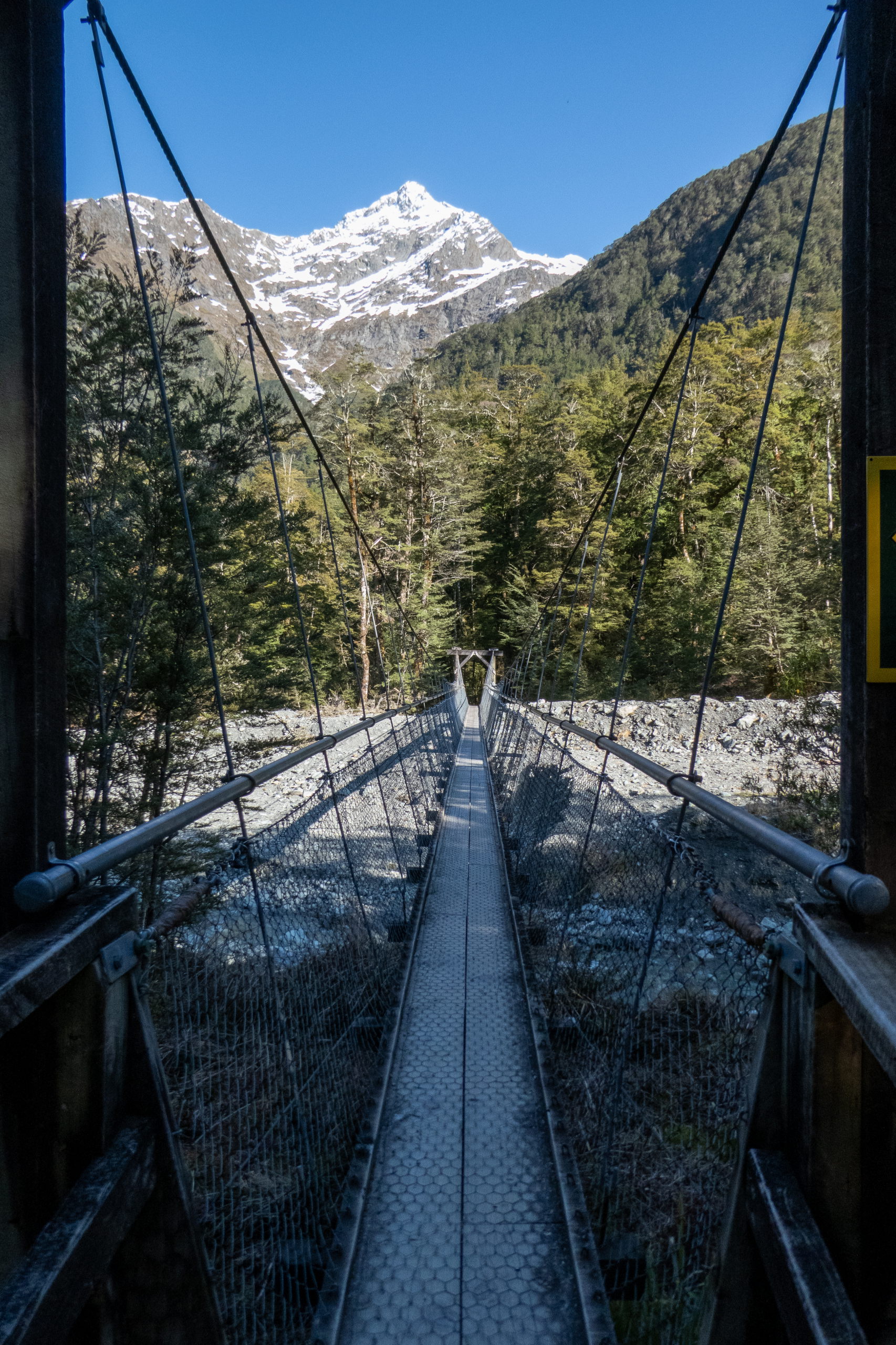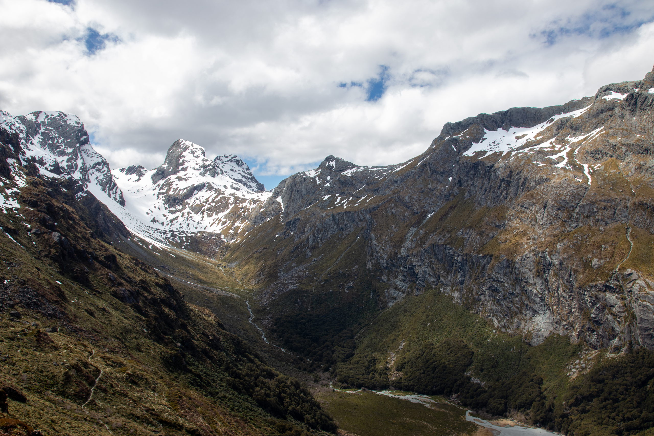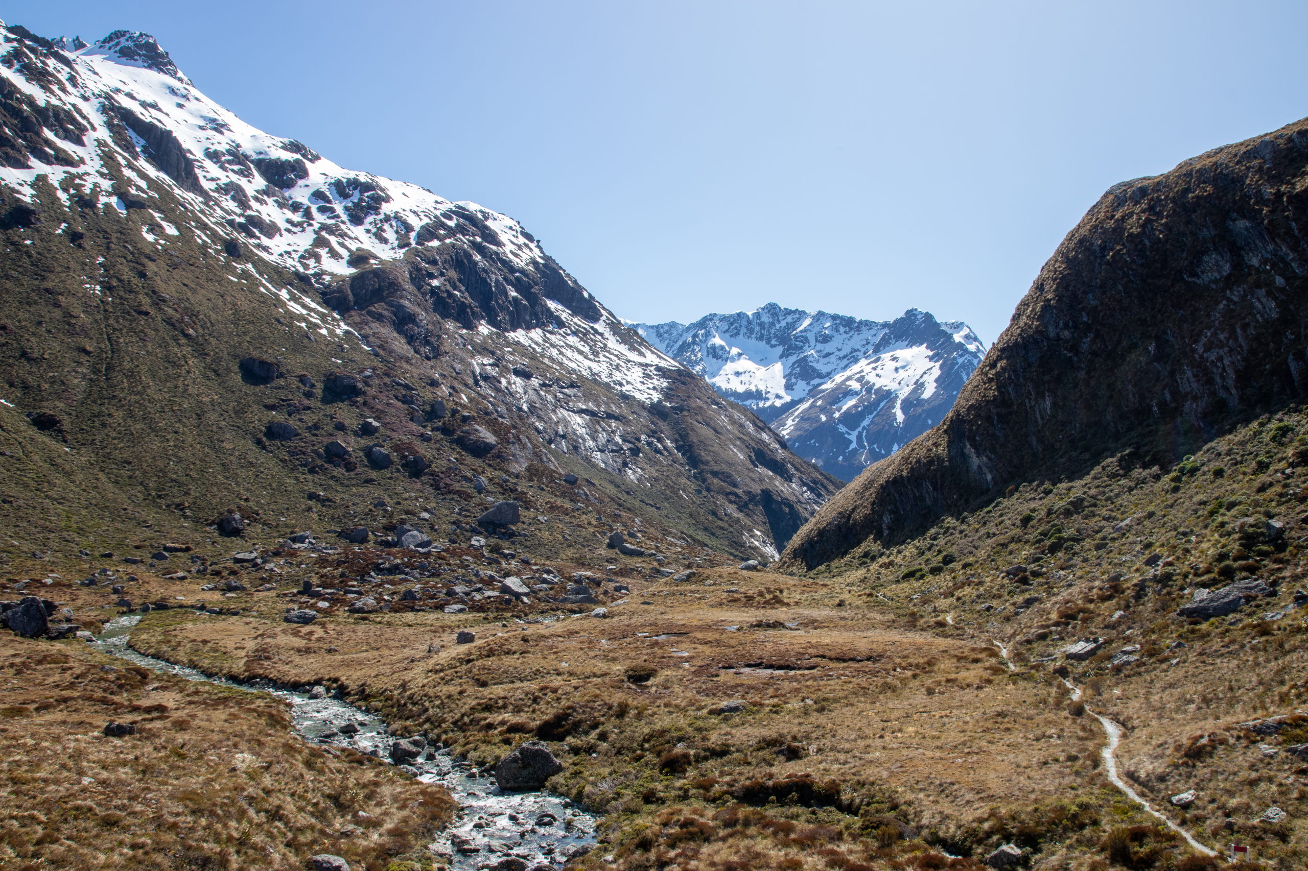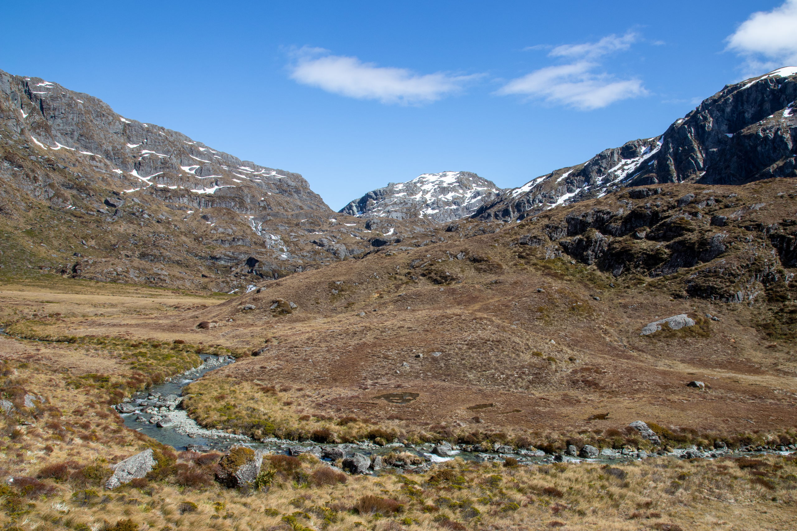 Zu Beginn geht es flach und relativ langweilig im Wald dahin. Zwar folgt der Weg dem schönen Routeburn River, jedoch hat man nur sehr selten einen Blick auf den Fluss. Nach einer Hängebrücke und vorbei an der Routeburn Flats Hut zieht der Weg etwas an und ich komme hinauf zur Routeburn Falls Hut, die an den gleichnamigen Wasserfällen liegt. Über einen guten Wanderweg geht es hinauf in Richtung Harris Saddle. Kurz vorher ist ein Schneefeld zu queren. Easy drüber, fertig. War das schon das “gefährliche” Schneefeld, von dem die Typen vom DOC gesprochen haben? Vermutlich ja. Kurz darauf kommt schon das Harris Saddle Shelter. Es geht gut dahin und ich beschließe, noch weiter zu gehen, lege aber gedanklich eine Uhrzeit fest, zu der ich definitiv umdrehe. Mal gucken, wie lange ich Lust habe.