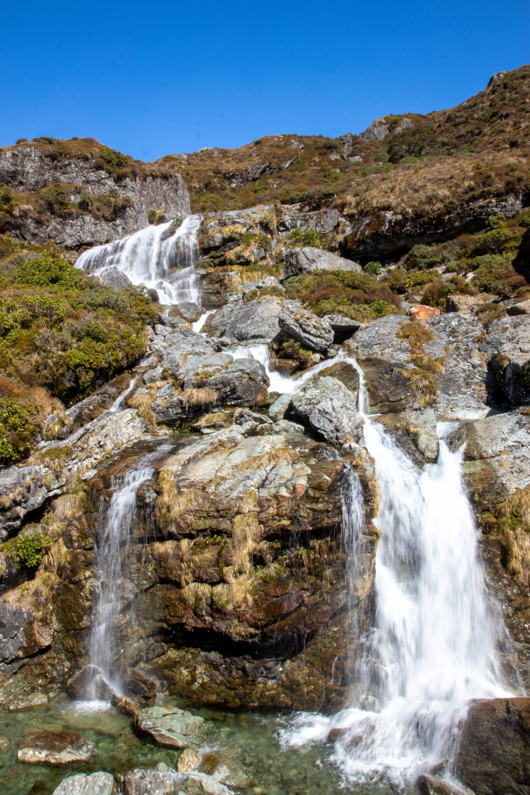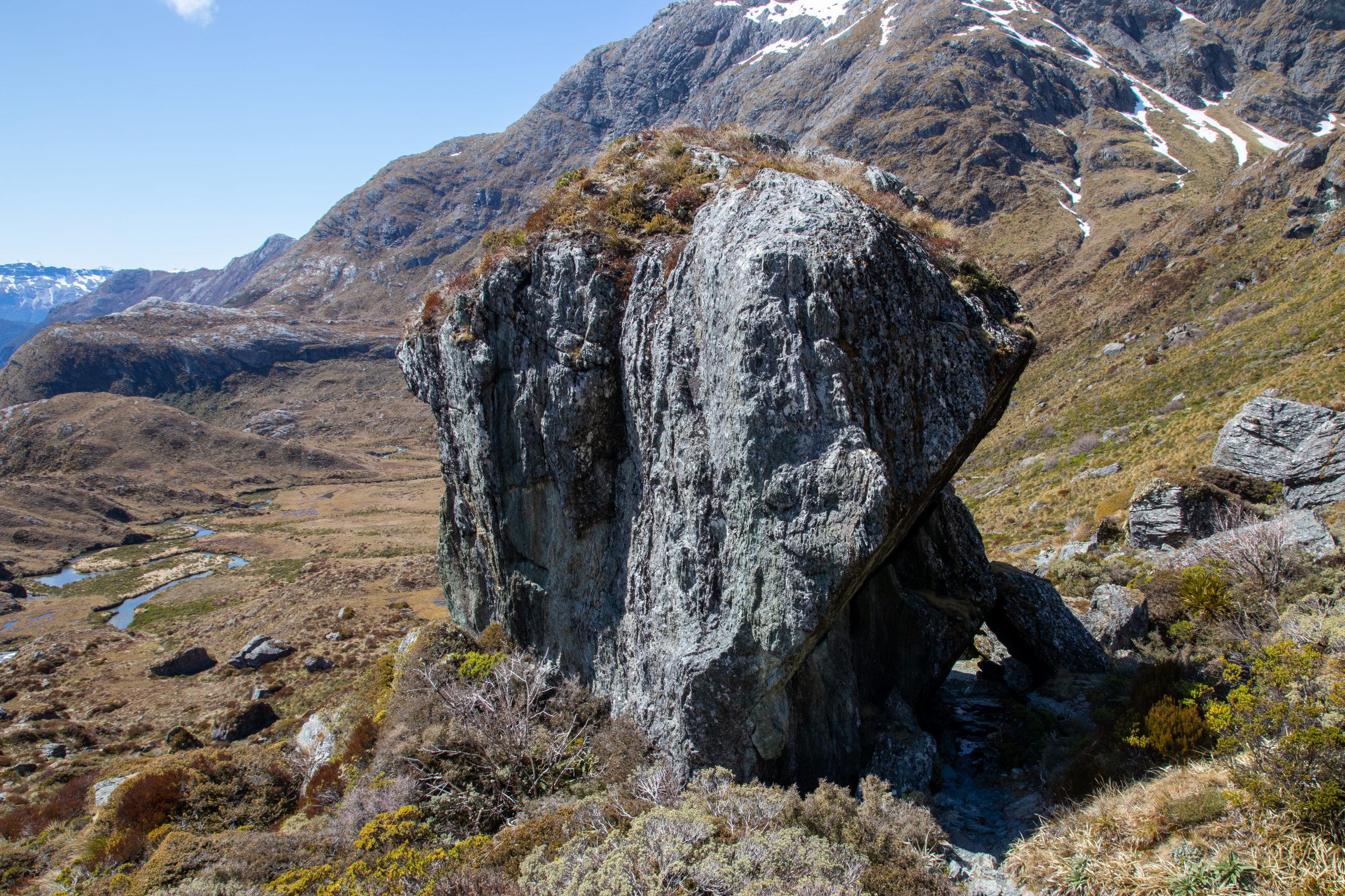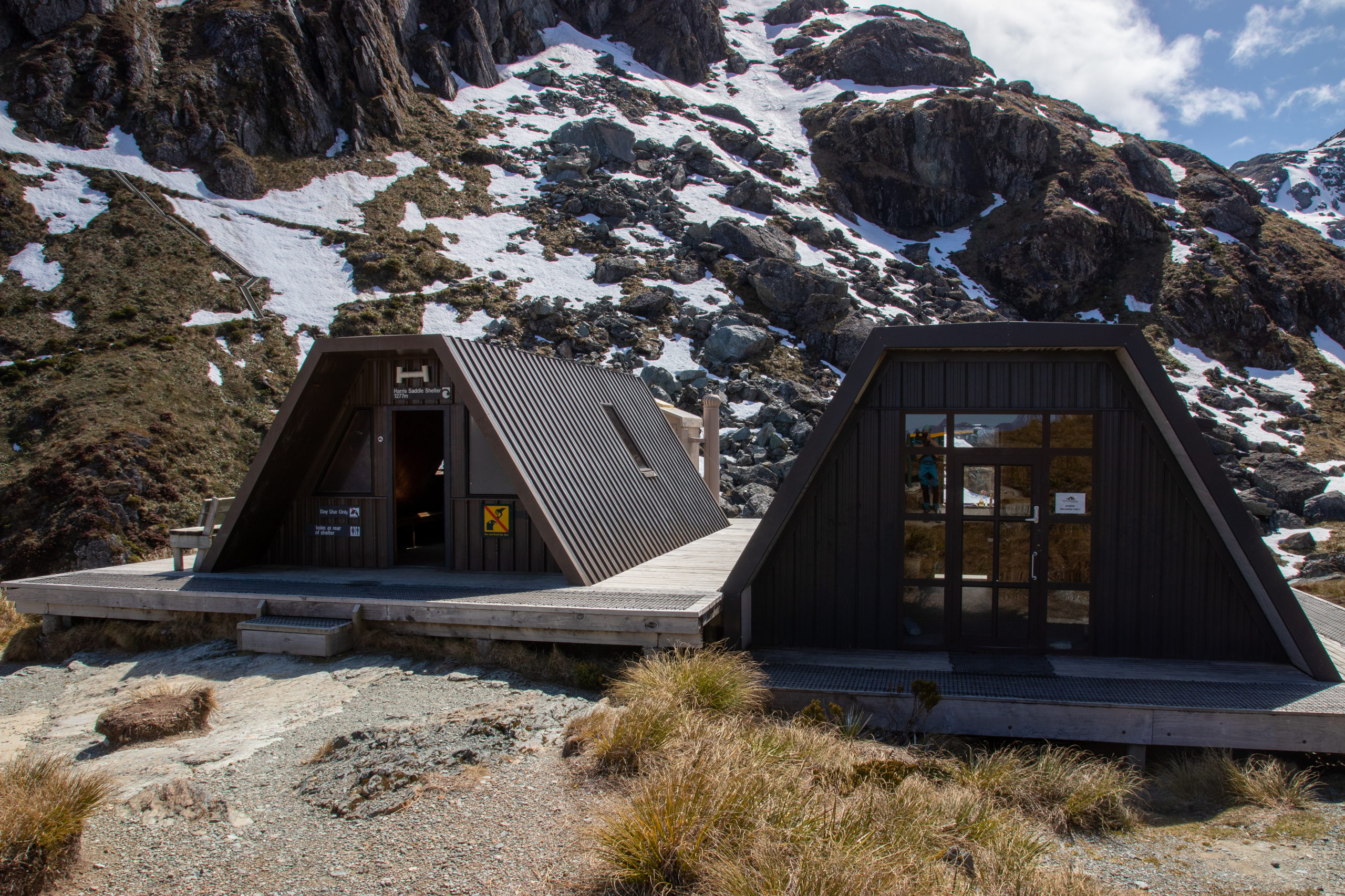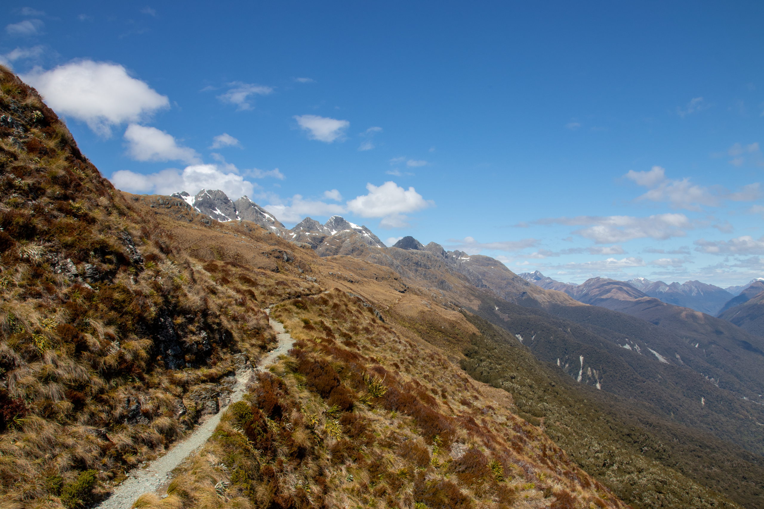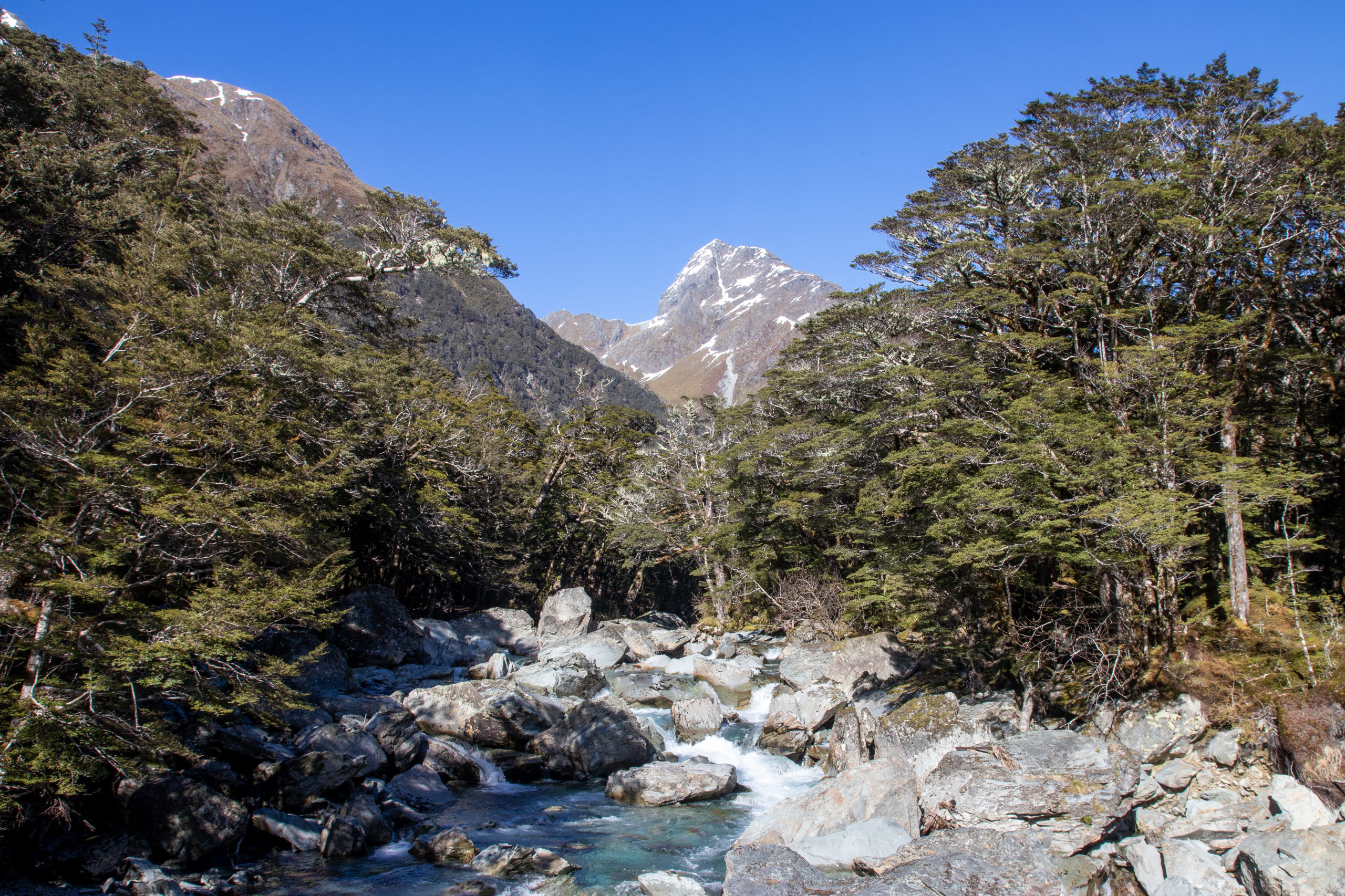 Zu Beginn geht es flach und relativ langweilig im Wald dahin. Zwar folgt der Weg dem schönen Routeburn River, jedoch hat man nur sehr selten einen Blick auf den Fluss. Nach einer Hängebrücke und vorbei an der Routeburn Flats Hut zieht der Weg etwas an und ich komme hinauf zur Routeburn Falls Hut, die an den gleichnamigen Wasserfällen liegt. Über einen guten Wanderweg geht es hinauf in Richtung Harris Saddle. Kurz vorher ist ein Schneefeld zu queren. Easy drüber, fertig. War das schon das “gefährliche” Schneefeld, von dem die Typen vom DOC gesprochen haben? Vermutlich ja. Kurz darauf kommt schon das Harris Saddle Shelter. Es geht gut dahin und ich beschließe, noch weiter zu gehen, lege aber gedanklich eine Uhrzeit fest, zu der ich definitiv umdrehe. Mal gucken, wie lange ich Lust habe.