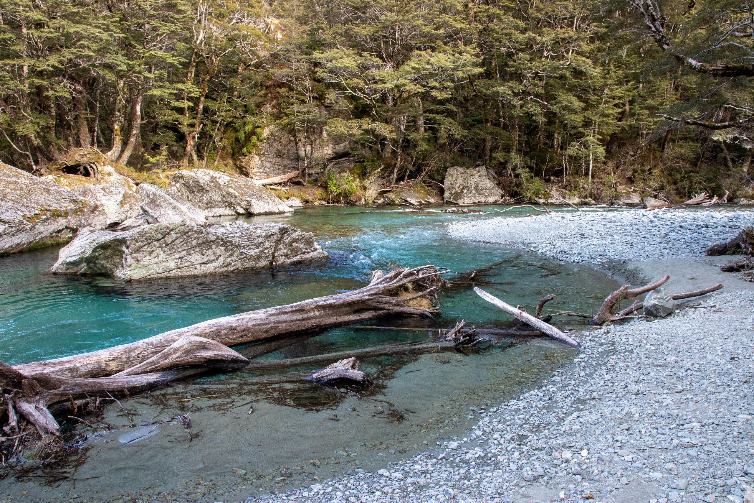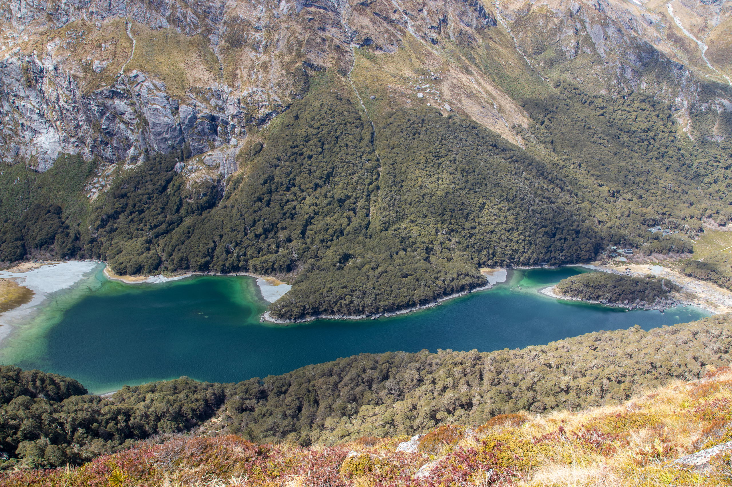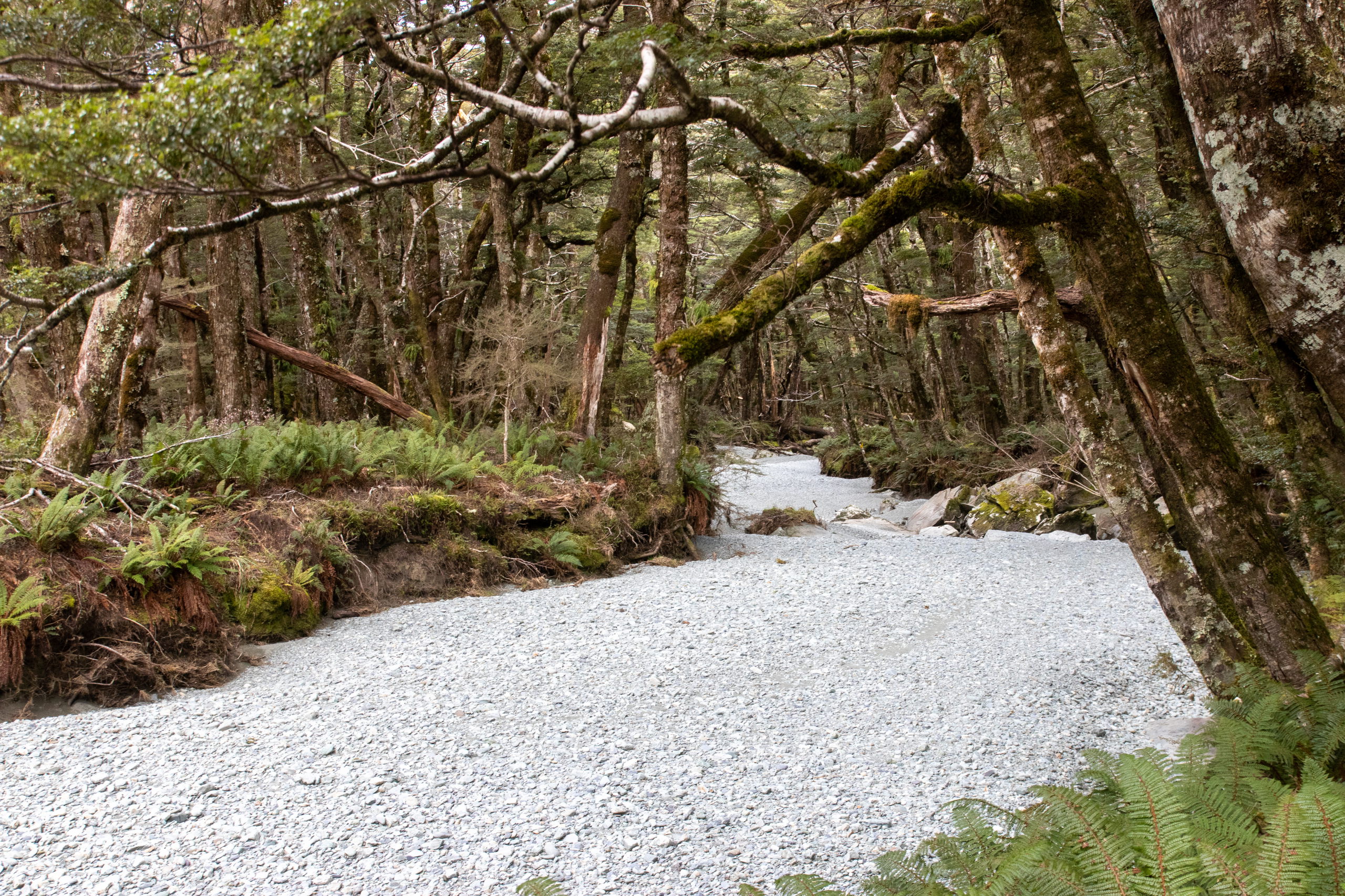 An einem Bach entsorge ich das chlorierte Stadtwasser und nehme etwas frisches Gebirgswasser mit. Am Rückweg werde ich die Flaschen voll machen. Mjam, frisches Gebirgswasser schmeckt einfach köstlich. An zwei Stellen ist der Weg ein wenig abgerutscht, aber auch das ist kein Drama. Das waren die Hangrutsche, welche ebenfalls von der DOC viel gefährlicher dargestellt wurden. Hmmm, mein ursprünglicher Plan wäre also möglich gewesen. Schade. Aber gut, die von der DOC wissen ja nicht, ob ein erfahrener Wandersmann anfragt, oder ein mit Flipflops bewaffneter Vollhonk. Ich gehe den schönen Weg weiter und komme zu einer Stelle, von der man bereits zum Ziel der zweiten Tagesetappe, der Lake Mackenzie Hut am gleichnamigen See sieht. Von hier wären es nur mehr 300 Höhenmeter hinunter. Ich entscheide mich aber für eine gemütliche Jause bei toller Aussicht und mache mich zur gedanklich festgelegten Zeit auf den Rückweg. Voll beladen mit frischem Gebirgswasser komme ich am Harris Saddle Shelter vorbei und nach der Routeburn Falls Hut geht es wieder in den Wald zum langweiligen Teil. Ich bin schon relativ KO und das Auf und Ab zieht sich. Da kommt der kurze Abstecher zu den idyllischen Forge Flat gerade recht.