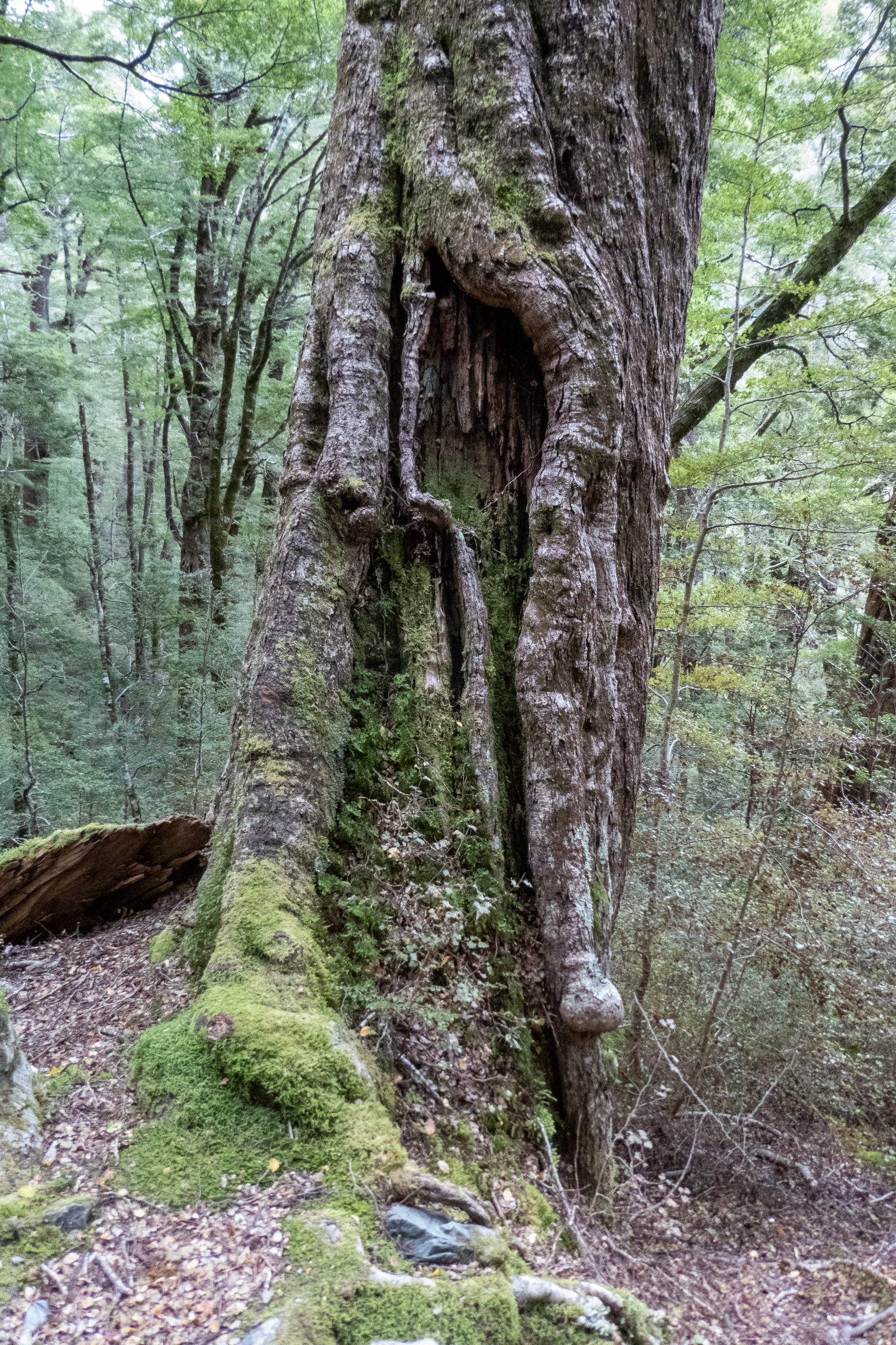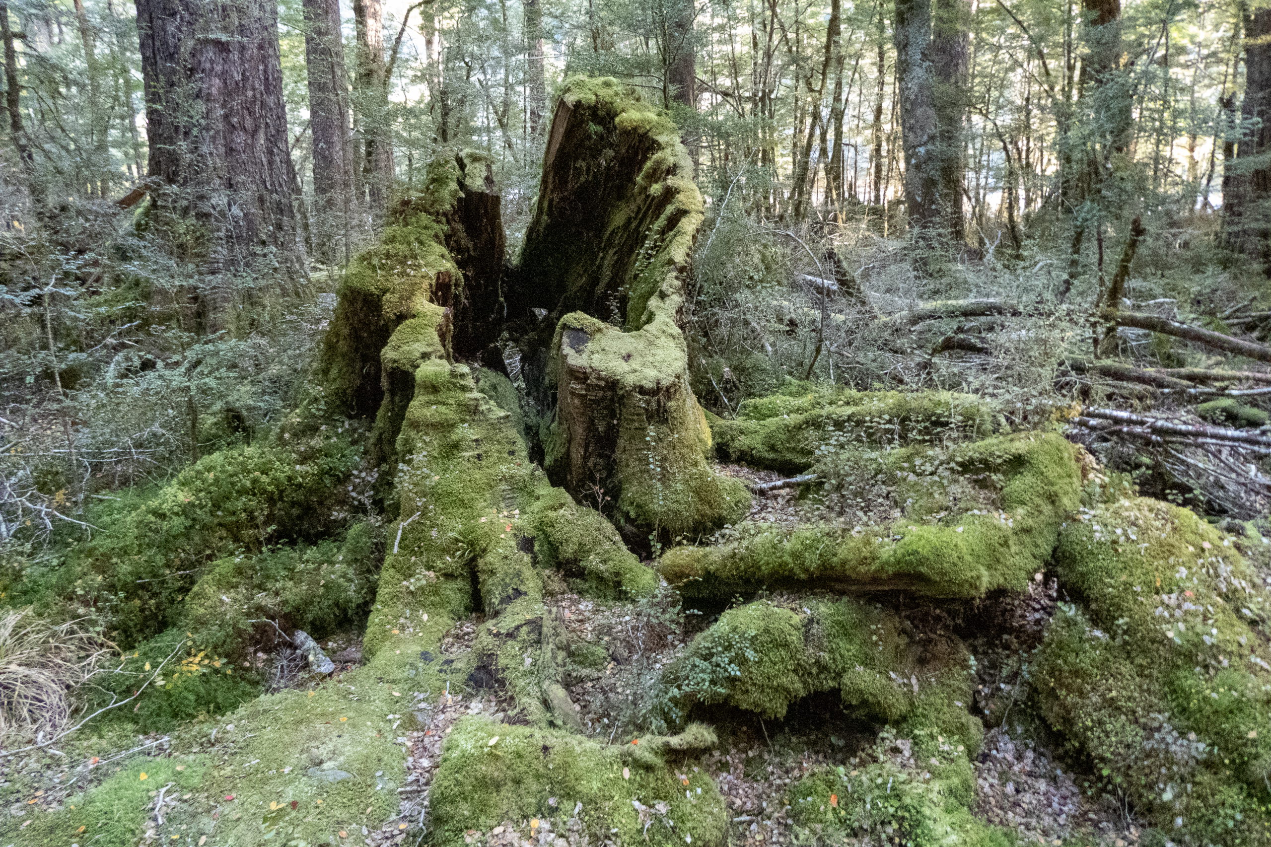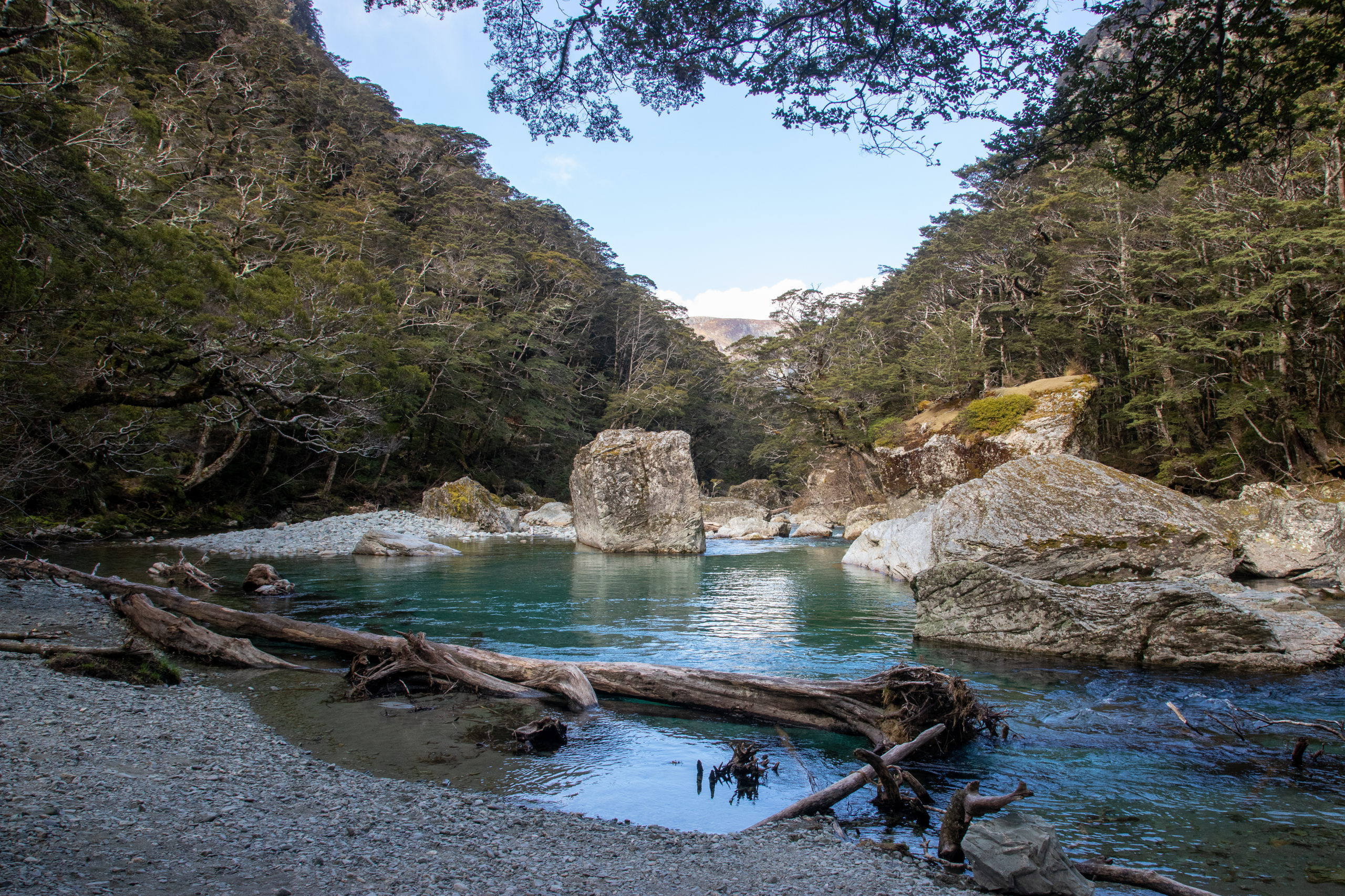 An einem Bach entsorge ich das chlorierte Stadtwasser und nehme etwas frisches Gebirgswasser mit. Am Rückweg werde ich die Flaschen voll machen. Mjam, frisches Gebirgswasser schmeckt einfach köstlich. An zwei Stellen ist der Weg ein wenig abgerutscht, aber auch das ist kein Drama. Das waren die Hangrutsche, welche ebenfalls von der DOC viel gefährlicher dargestellt wurden. Hmmm, mein ursprünglicher Plan wäre also möglich gewesen. Schade. Aber gut, die von der DOC wissen ja nicht, ob ein erfahrener Wandersmann anfragt, oder ein mit Flipflops bewaffneter Vollhonk. Ich gehe den schönen Weg weiter und komme zu einer Stelle, von der man bereits zum Ziel der zweiten Tagesetappe, der Lake Mackenzie Hut am gleichnamigen See sieht. Von hier wären es nur mehr 300 Höhenmeter hinunter. Ich entscheide mich aber für eine gemütliche Jause bei toller Aussicht und mache mich zur gedanklich festgelegten Zeit auf den Rückweg. Voll beladen mit frischem Gebirgswasser komme ich am Harris Saddle Shelter vorbei und nach der Routeburn Falls Hut geht es wieder in den Wald zum langweiligen Teil. Ich bin schon relativ KO und das Auf und Ab zieht sich. Da kommt der kurze Abstecher zu den idyllischen Forge Flat gerade recht.
