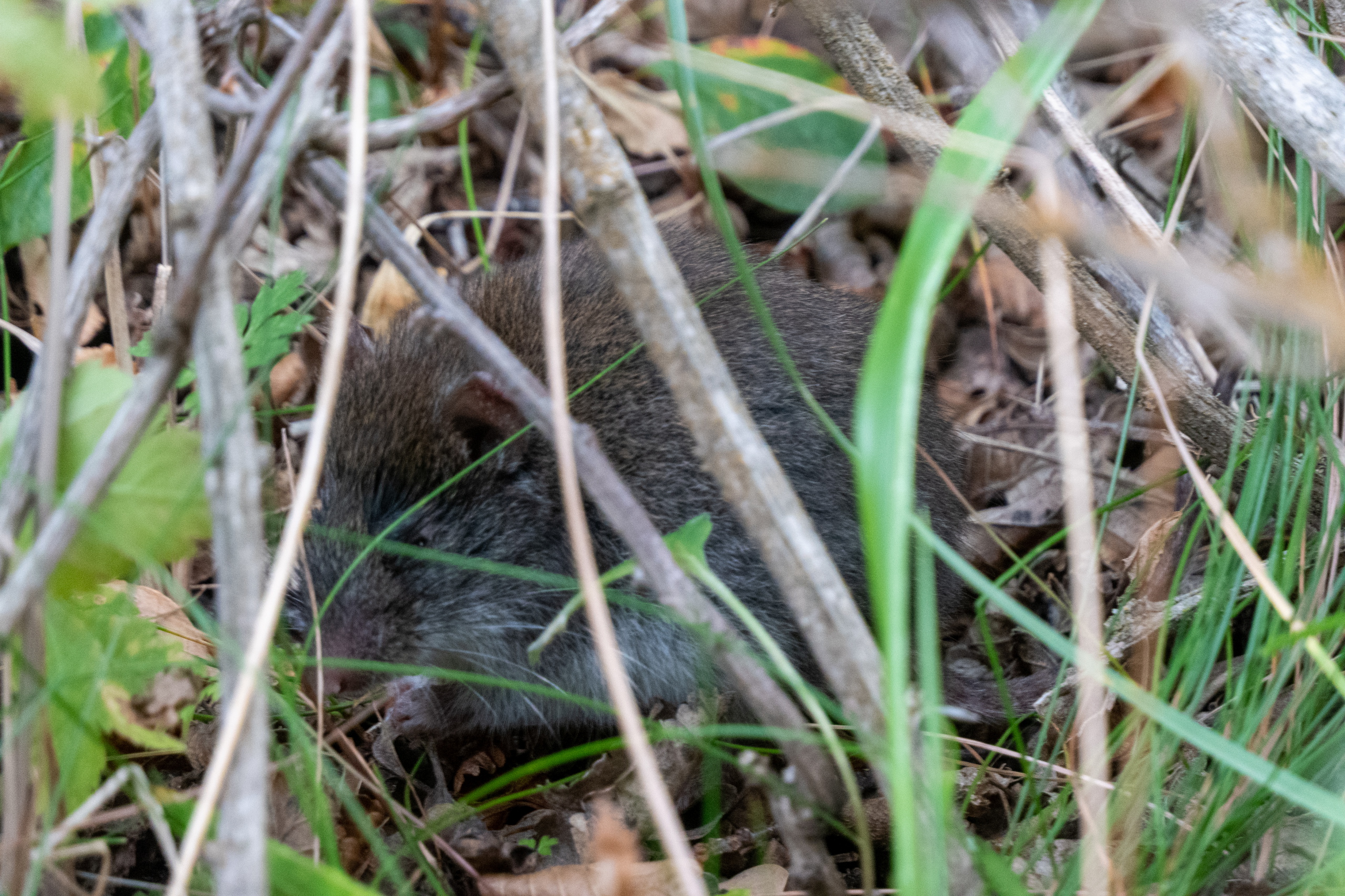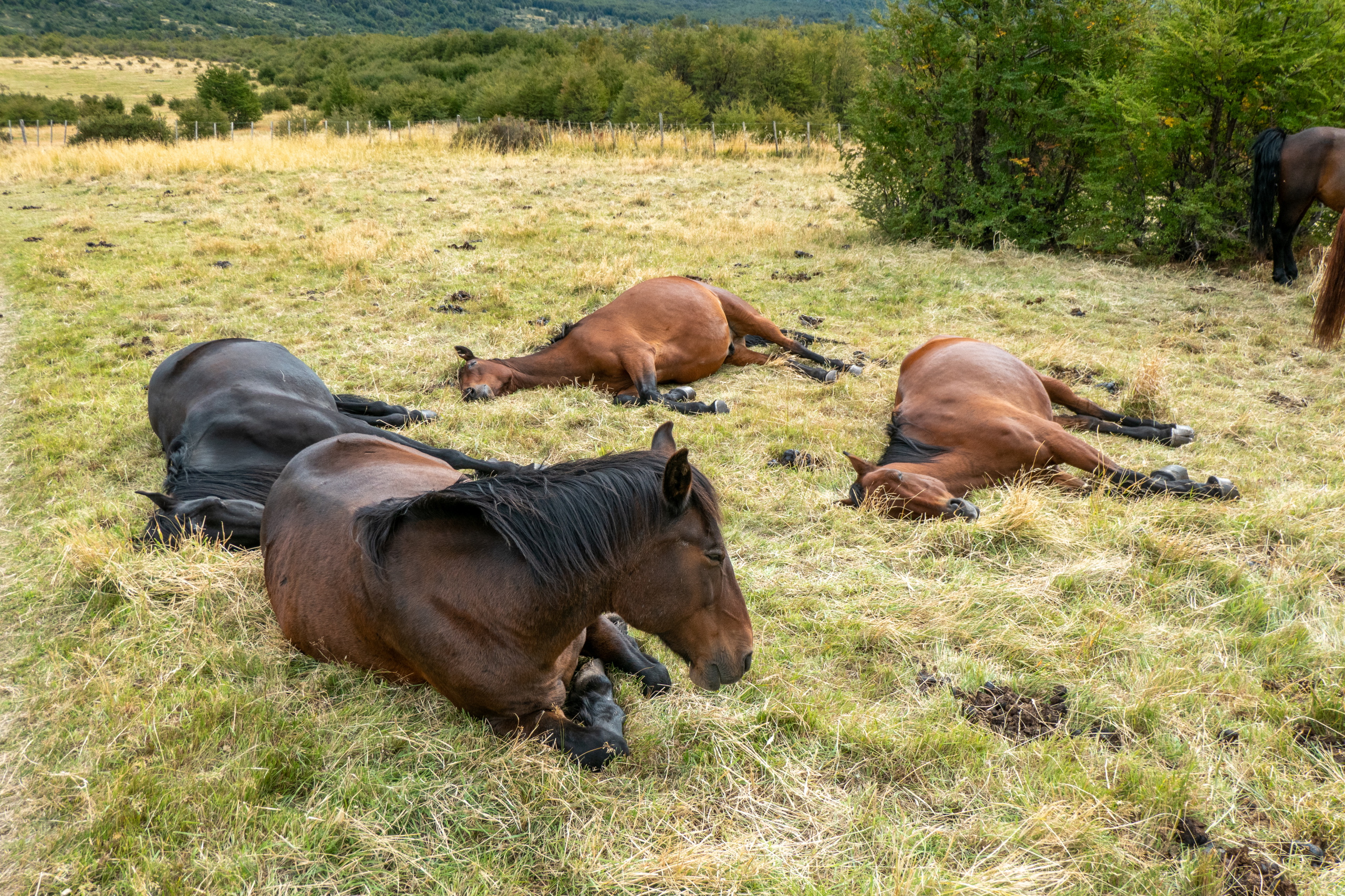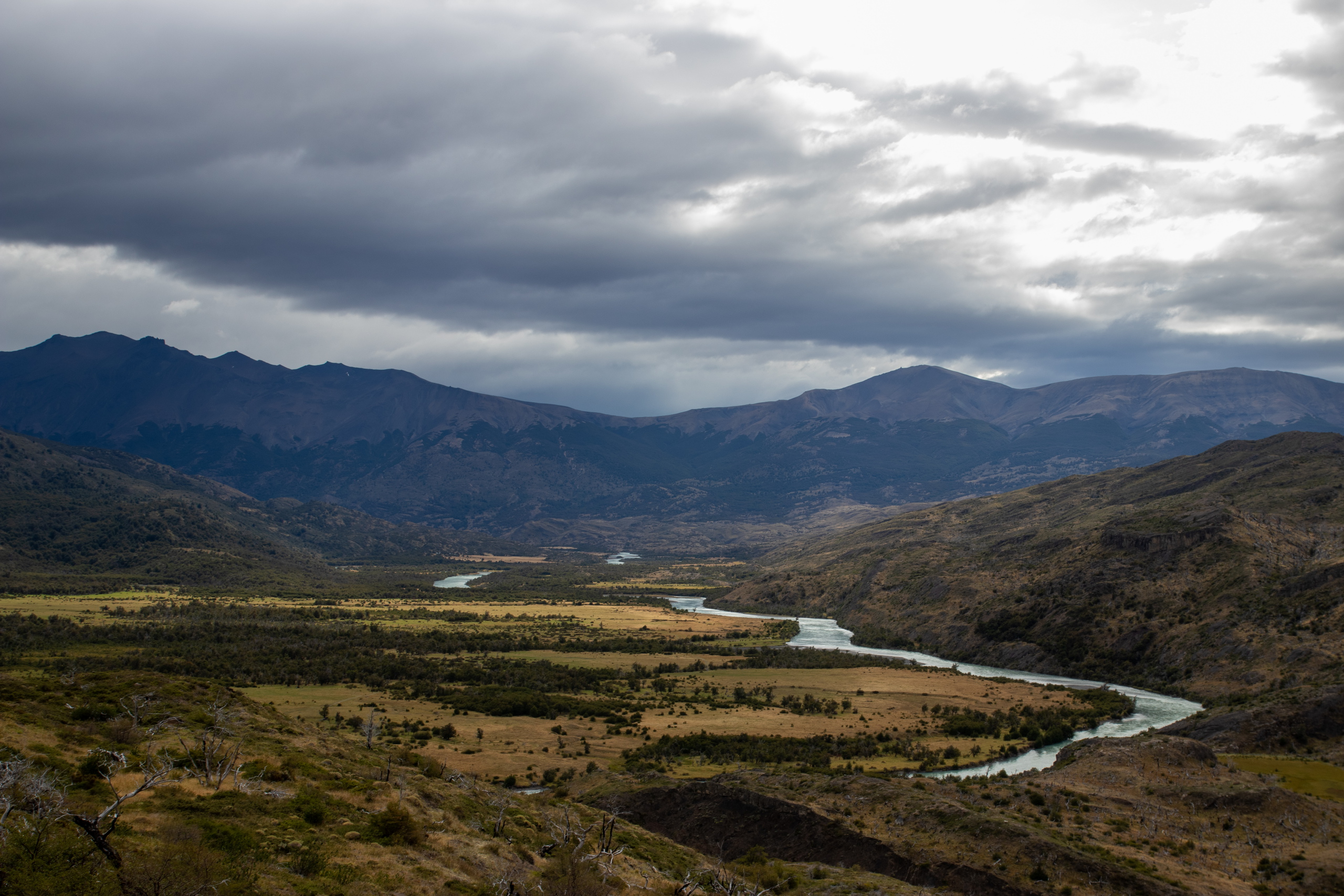 Am weiteren Weg beginnt es zuziehen. Im Unterholz raschelt etwas. Eine Maus. Das erste Säugetier, das ich im Park sehe. Bis auf ein paar Vögel ist nicht viel los. Im lichten Wald geht es immer einer Offroadpiste entlang. Sieht nach einem langweiligen Hadscher aus. Hier irrt der Wandersmann, den wenig später habe ich eine grandiose Aussicht über das Tal und den weiteren Weg. Auf einer offenen Fläche grasen weit über 50 Pferde, einige liegen auch nur faul herum und dösen. Der restliche Weg führt durch gelbgrünes Gras flach entlang dem Tal. Rechts der Fluss, von vorne Regen und Wind.