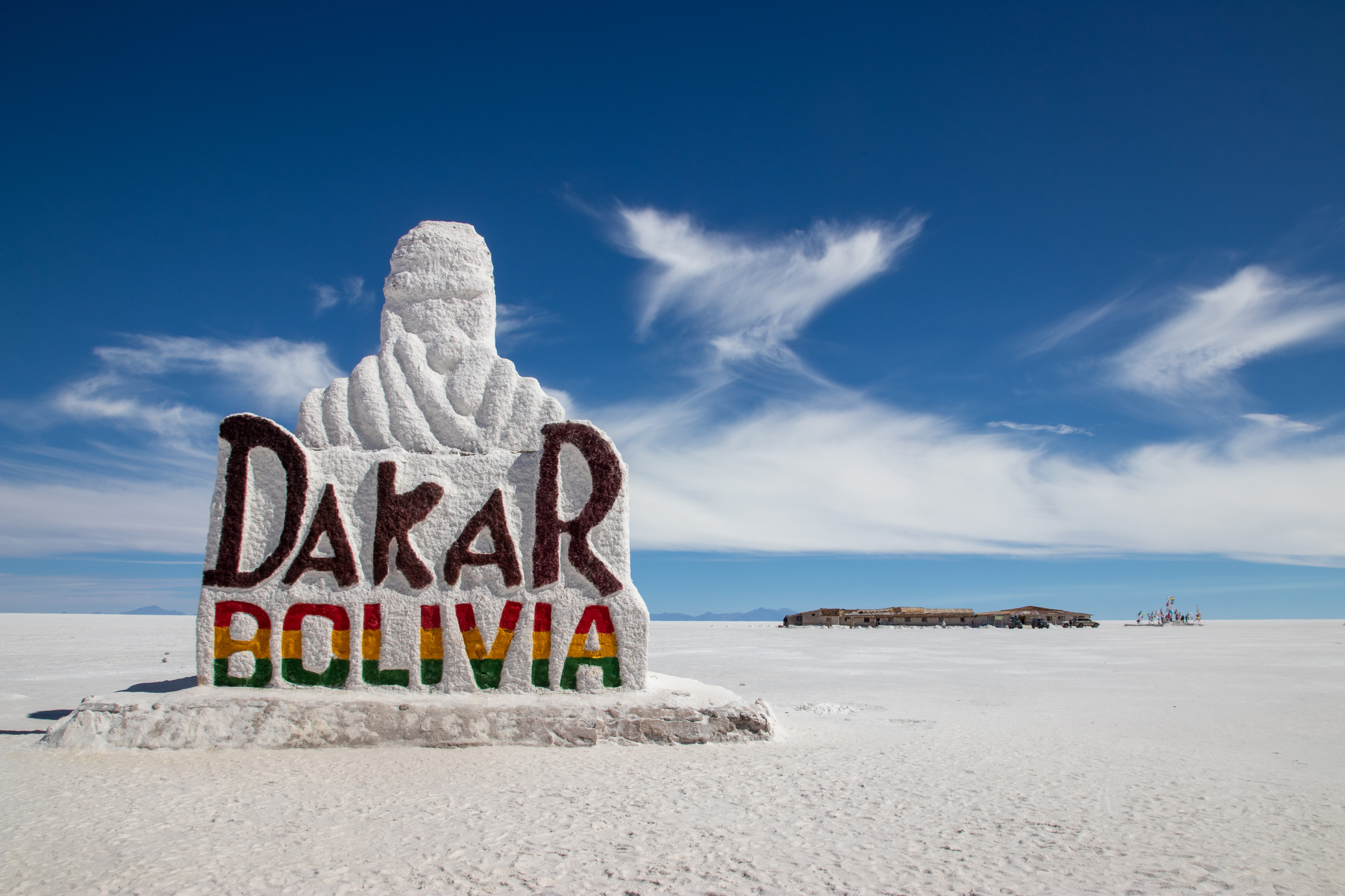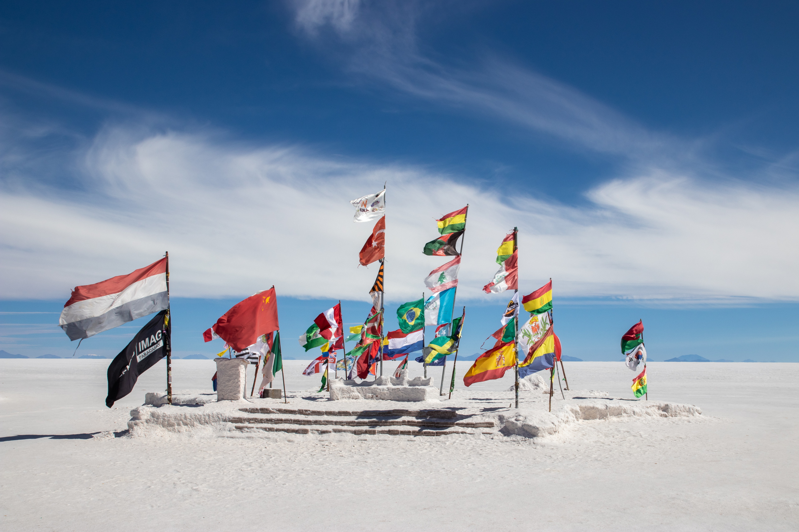 Um kurz vor elf Uhr geht es los und wir fahren zum nahegelegenen Cementerio de los Trenes, wo jede Menge über hundert Jahre alte Dampfloks zu sehen sind. Früher wurden Güter bis nach Antofagasta transportiert. Im War of the Pacific 1879 hat Chile diese Region eingenommen und die Strecke wurde eingestellt. Wir fahren weiter in die kleine Ortschaft Colchani, wo in einem winzigen Museum gezeigt wird, wie Salz gewonnen wird. Der restliche Ort besteht aus Verkaufsständen. Um halb zwei Uhr erreichen wir das Monumento al Dakar, das im Zuge der Rally Dakar 2014 aus 5000 Salzblöcken errichtet wurde. Nur wenige Meter entfernt steht das ehemalige Salzhotel, wo wir Mittagessen. Auf einer kleinen Plattform sind jede Menge Flaggen. Diese wurden im Laufe der Zeit von den Wanderern oder Radfahrern hier aufgestellt. Die österreichische fehlt, ich habe allerdings auch keine dabei.