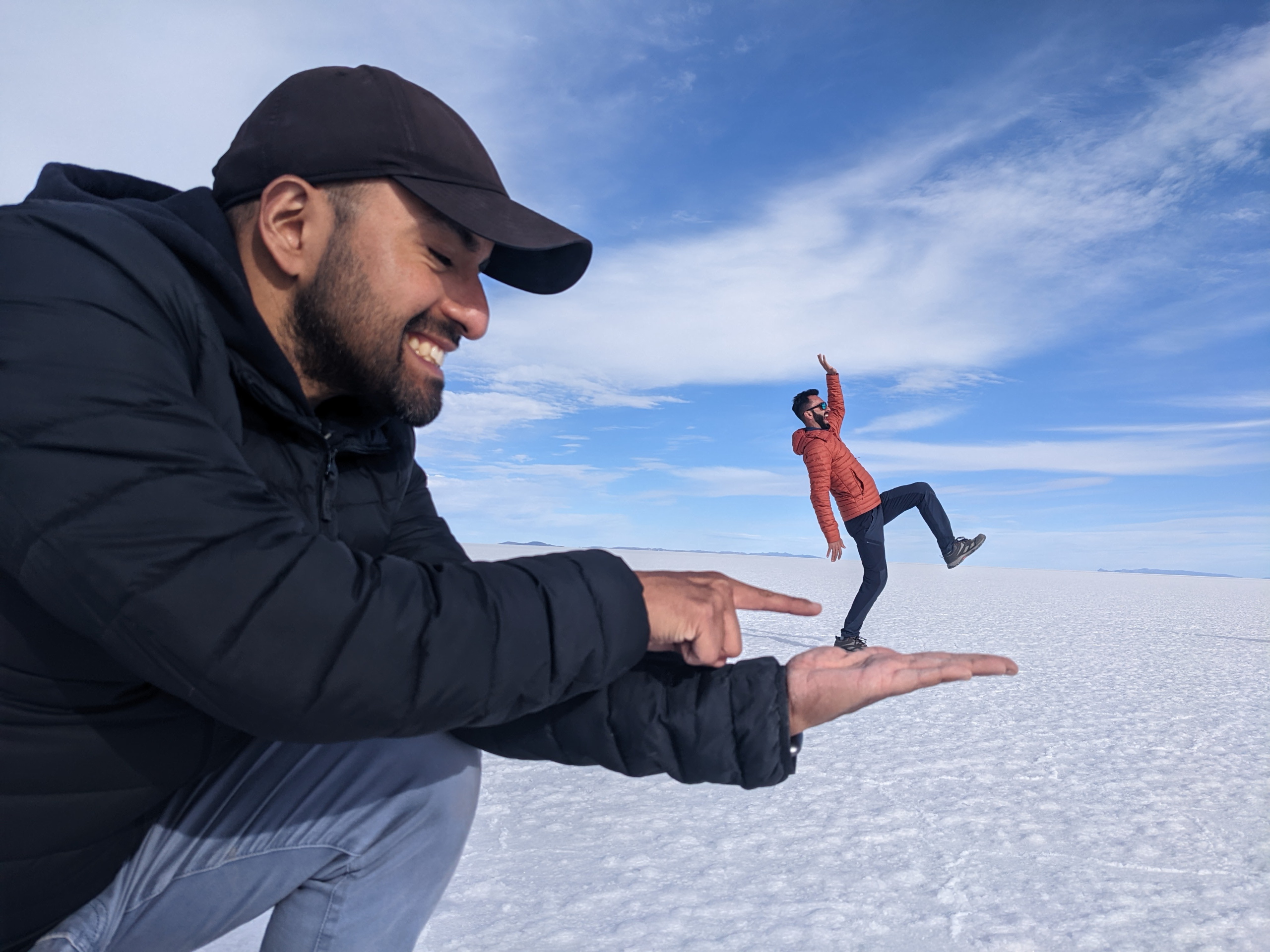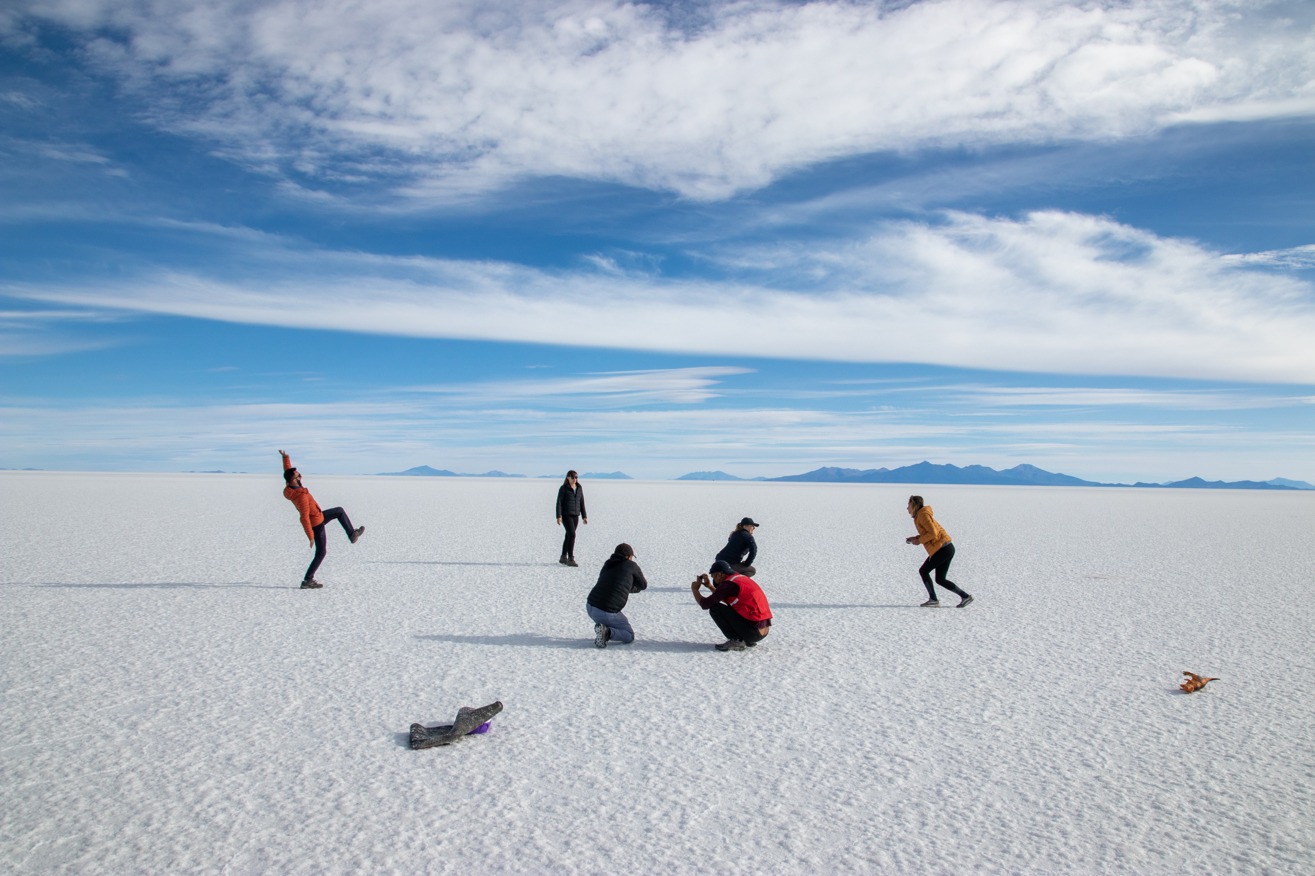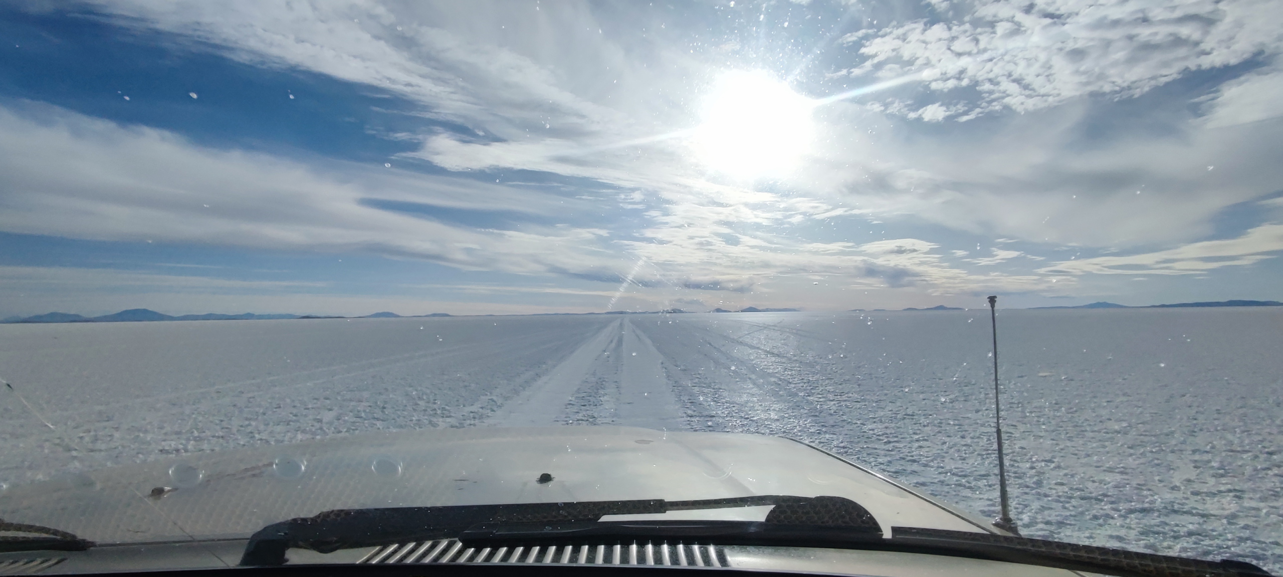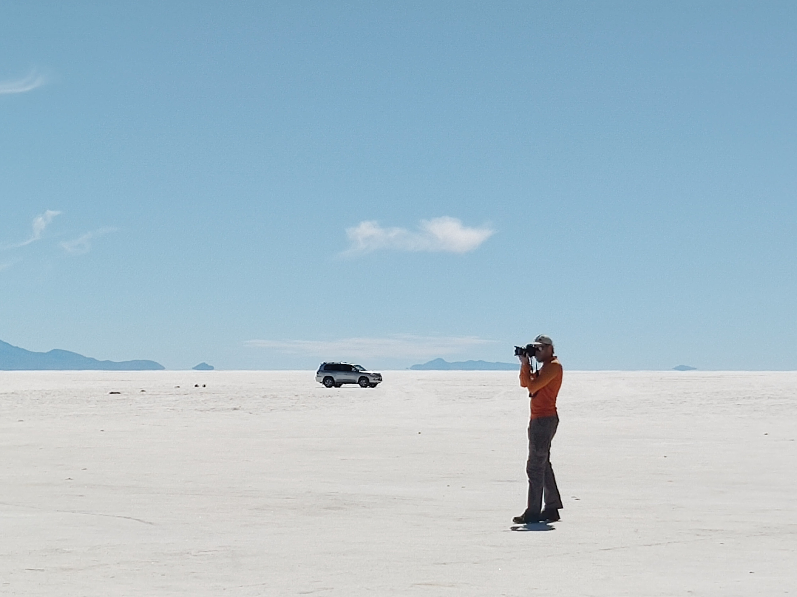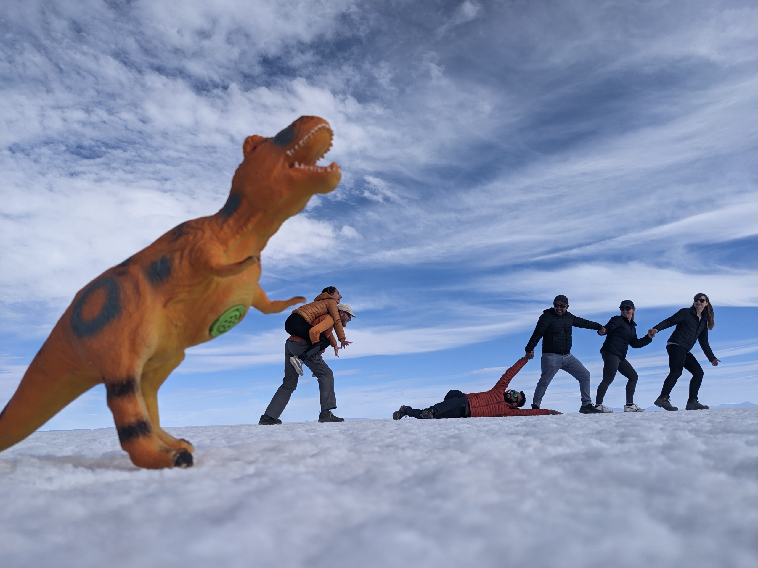 Nach einem sehr guten und umfangreichen Mittagessen fahren wir tief in die Salar und halten für einen längeren Fotostopp. Wir spielen uns mit der Perspektive und machen die obligatorischen Fotos und sogar zwei Videos.