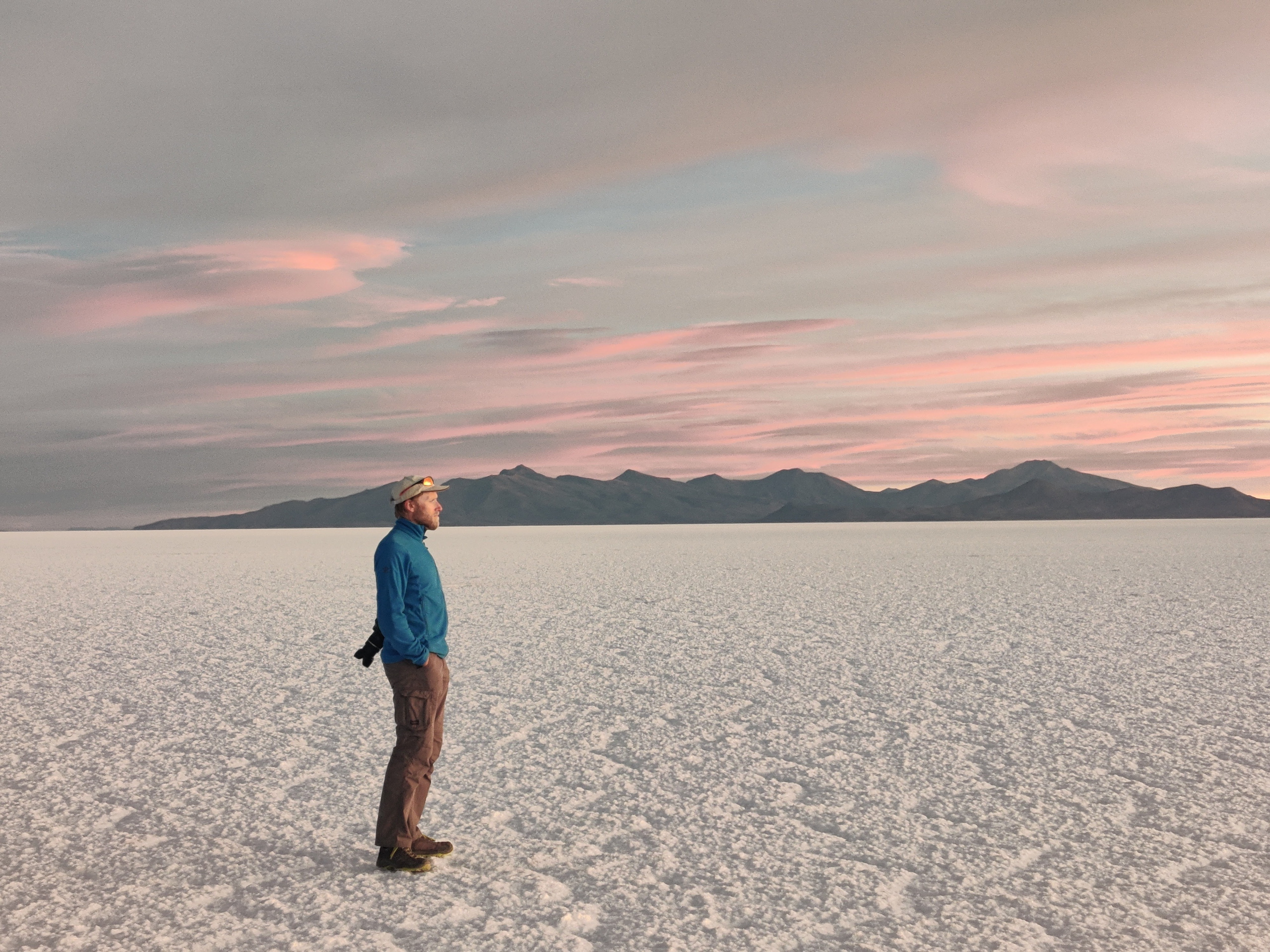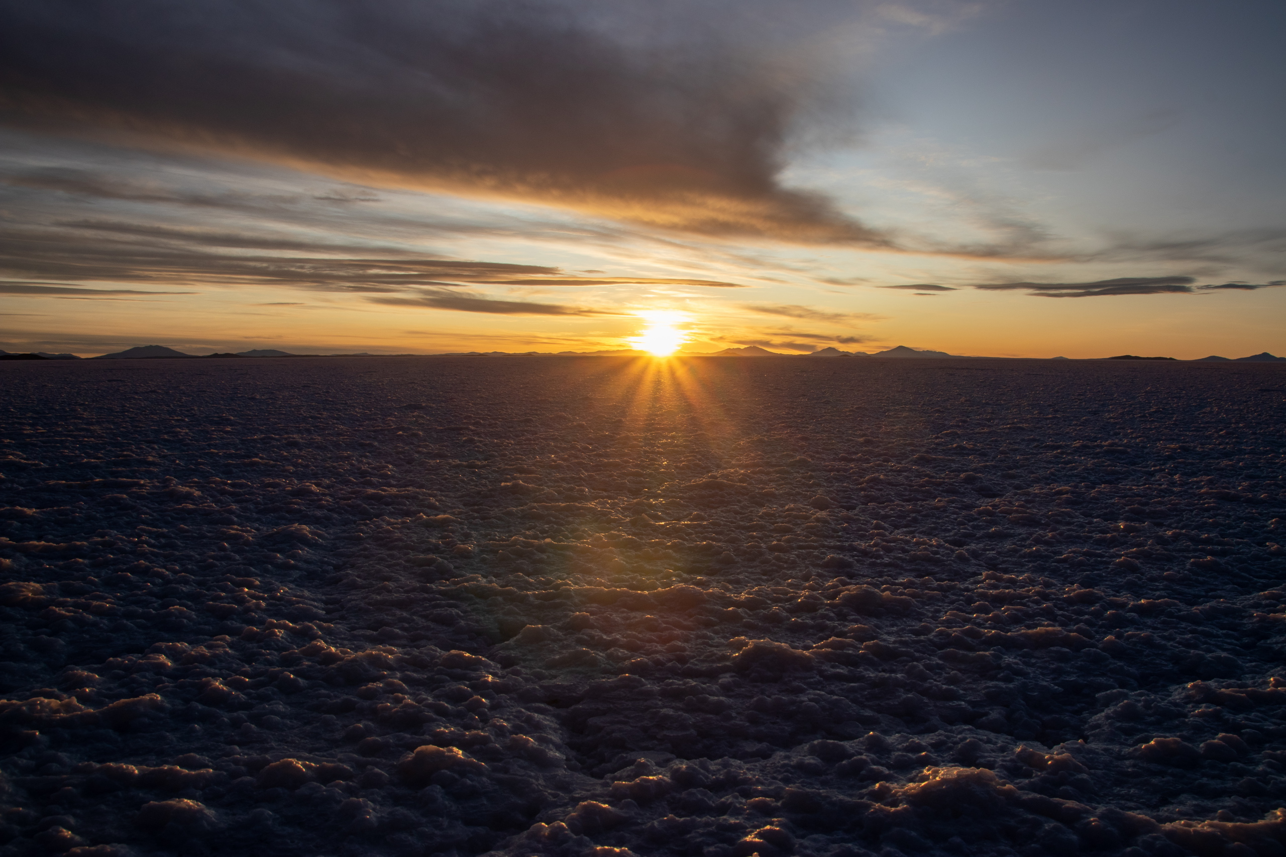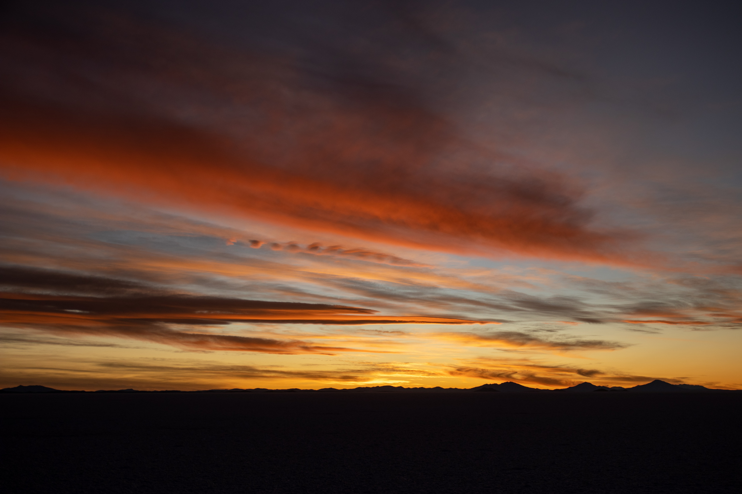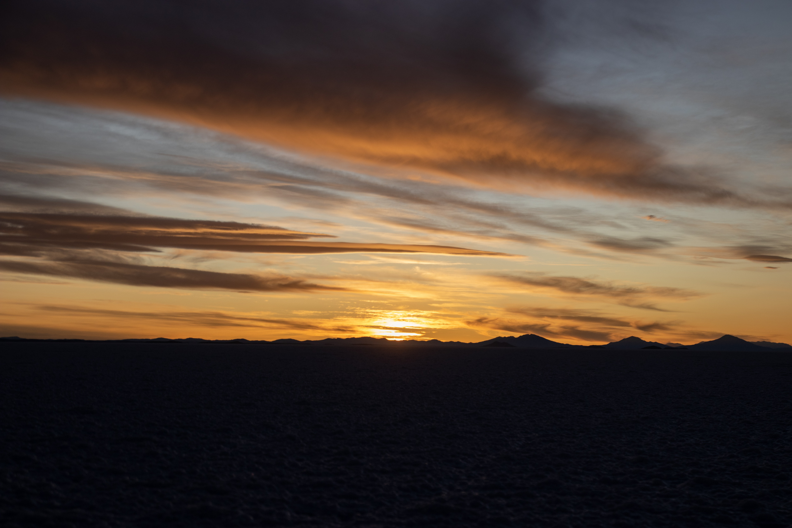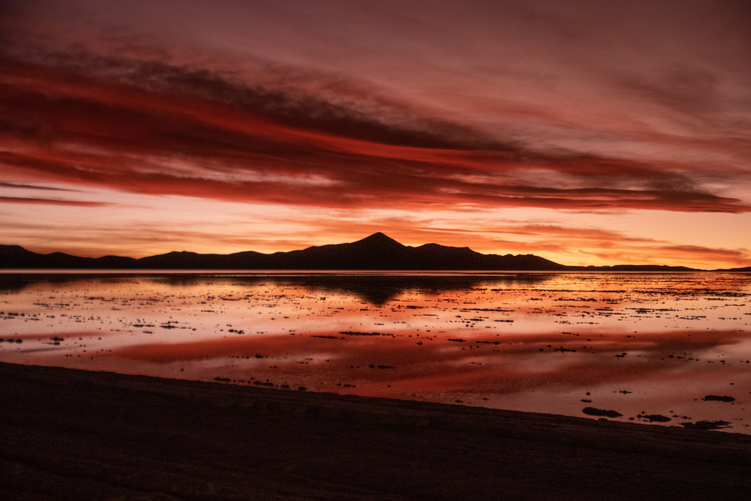 Zum Sonnenuntergang halten wir wieder mitten in der Salzwüste und sehen uns das Farbenspiel an. Kurz vor unserer Unterkunft sehen wir noch die Berge, die sich vor dem Dunkelrot des Himmels im Wasser spiegeln. Was für ein Anblick. Gegen acht Uhr checken wir im Hotel ein, das komplett aus Salzblöcken gebaut ist. Ich bekomme ein großes Doppelzimmern mit eigenem Bad. Generell ist die Unterkunft viel schöner als beschrieben. Beim Abendessen kommt auf, das die anderen über eine Online-Plattform gebucht haben und fast das Doppelte von meinem Preis bezahlt haben. Warum genau wissen wir aber nicht.