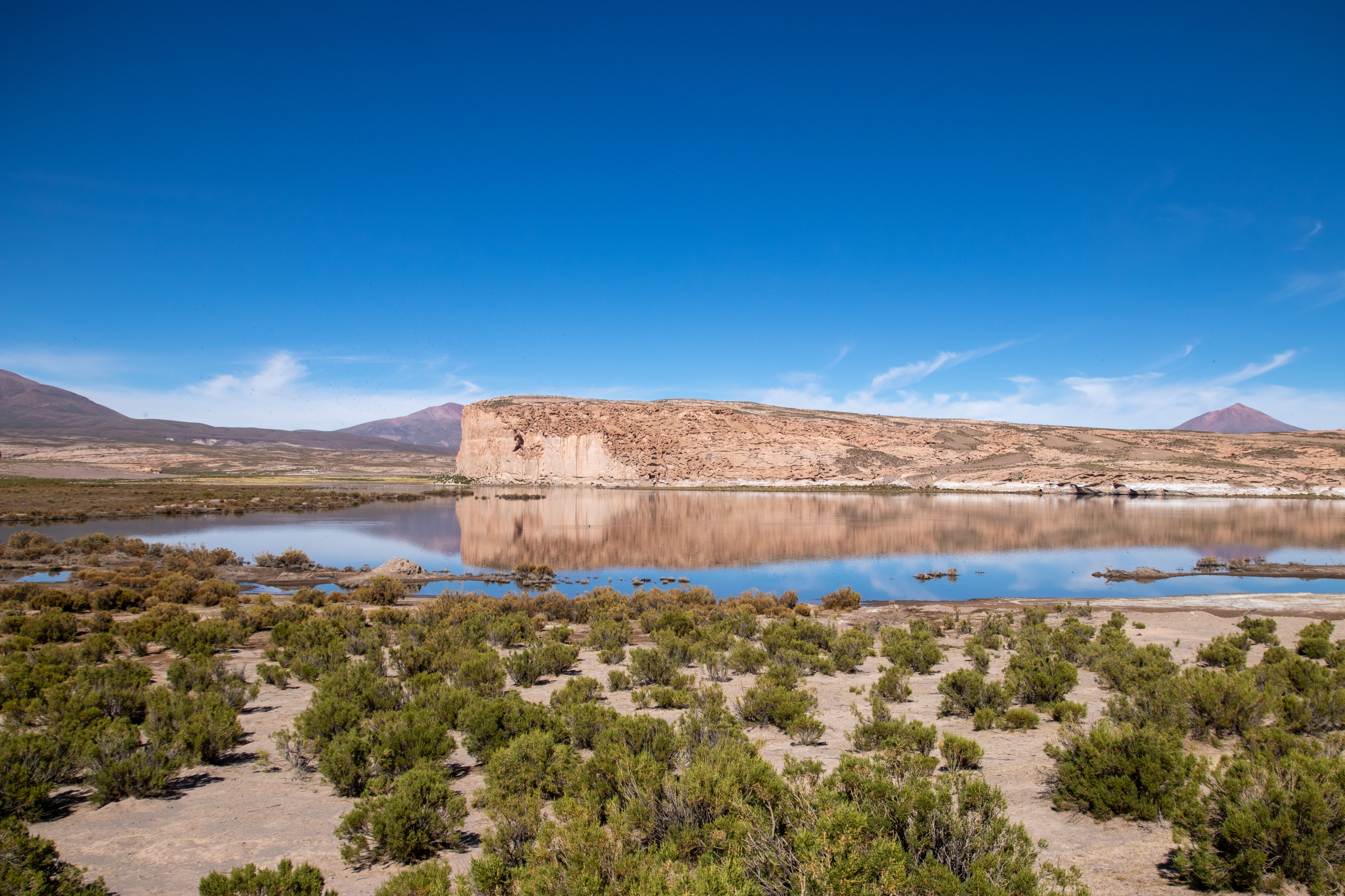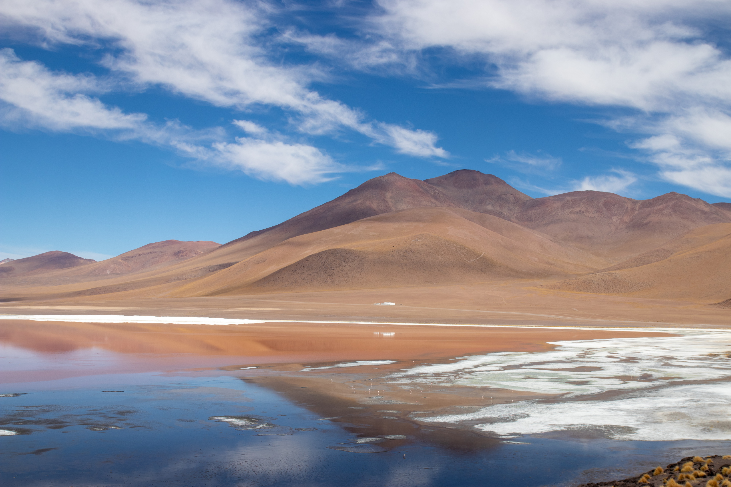 Wir fahren weiter zu den heißen Quellen Termas de Polques und können uns bei 38 ° Wassertemperatur so richtig gut aufwärmen. Ein Stück weiter südlich kommen wir zur Salvador Dali Wüste. Angeblich wurde er zu seinem Bildern durch diese Gegend inspiriert. Tatsächlich war er aber nie hier. Dennoch erinnert die Gegend an einige seiner Bilder. Normalerweise ginge es noch weiter nach Süden, aber aktuell macht die Polizei Schwierigkeiten und hält gerne einmal die Hand auf. Wir machen kehrt und fahren zur Laguna Colorada. Allerdings biegen wir ins Gelände ab. Ich frage Jose, ob das eine Abkürzung sei. Ja. Es sieht aber eher so aus, als würde er einen Weg suchen. Nach 20 Minuten Herumgurken drehen wir wieder um und nehmen die Straße, die sich in Blickweite befindet. Kann man am längsten Tag der Tour schon einmal machen. Die Laguna Colorada hat heute ein etwas intensiveres Rot, mit noch mehr Wind wäre es aber noch schöner, den die rote Farbe kommt von den aufgewirbelten roten Algen und dem hohen Mineralstoffgehalt.