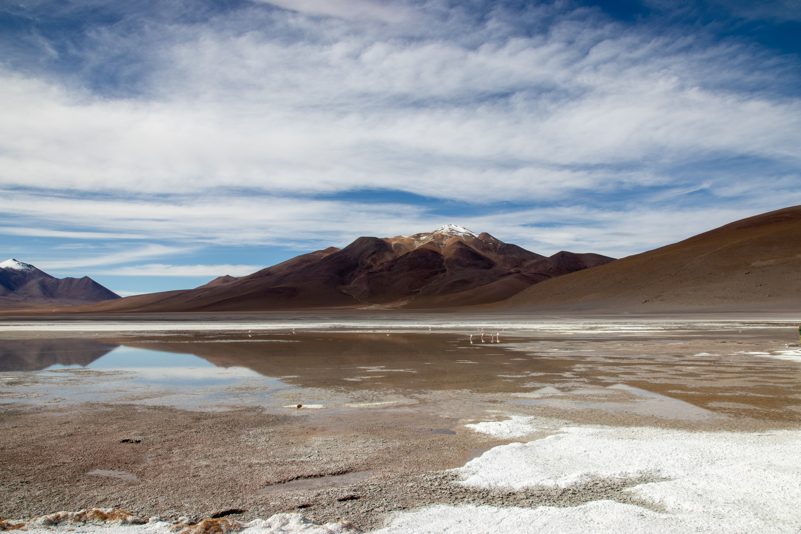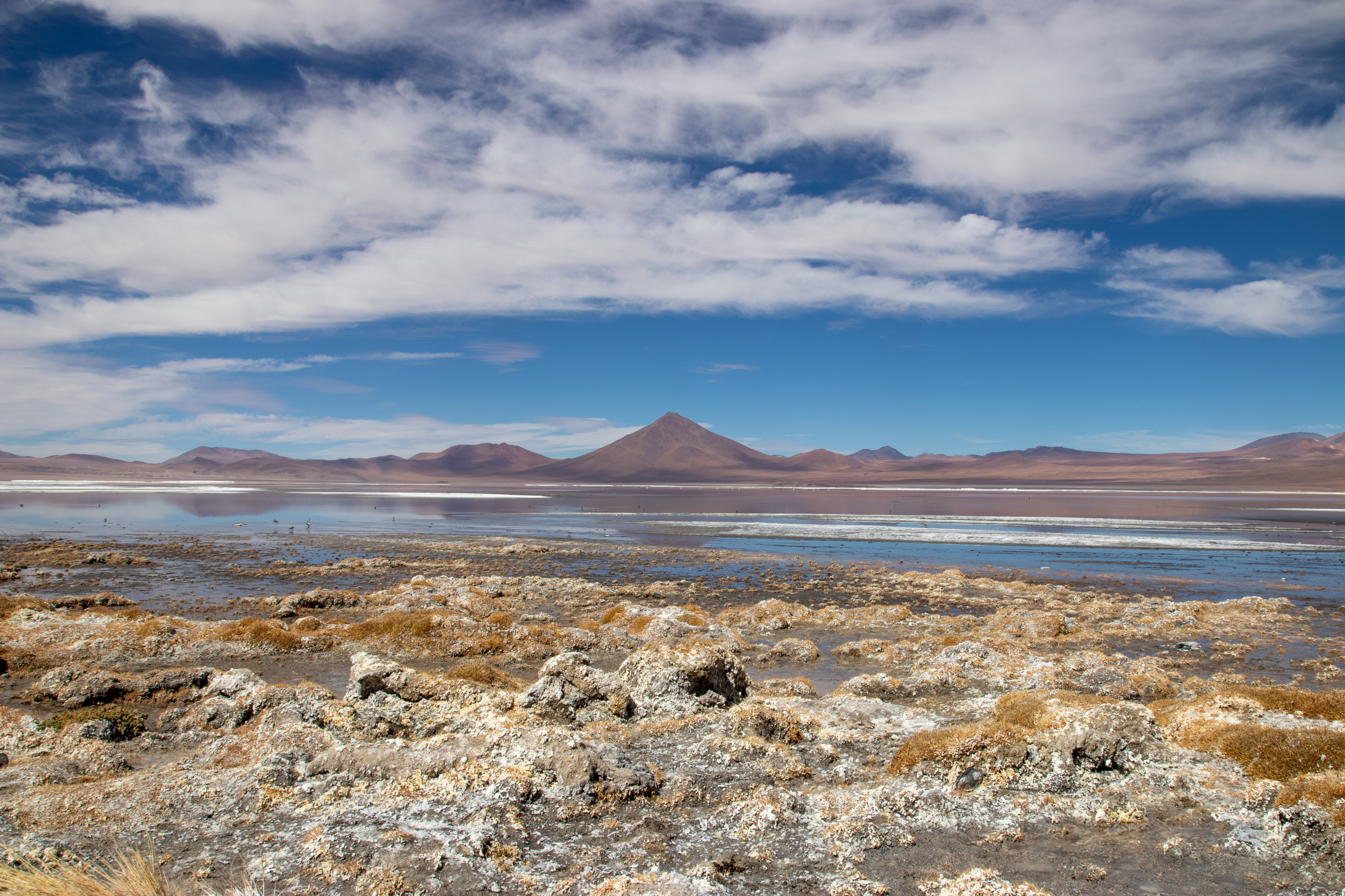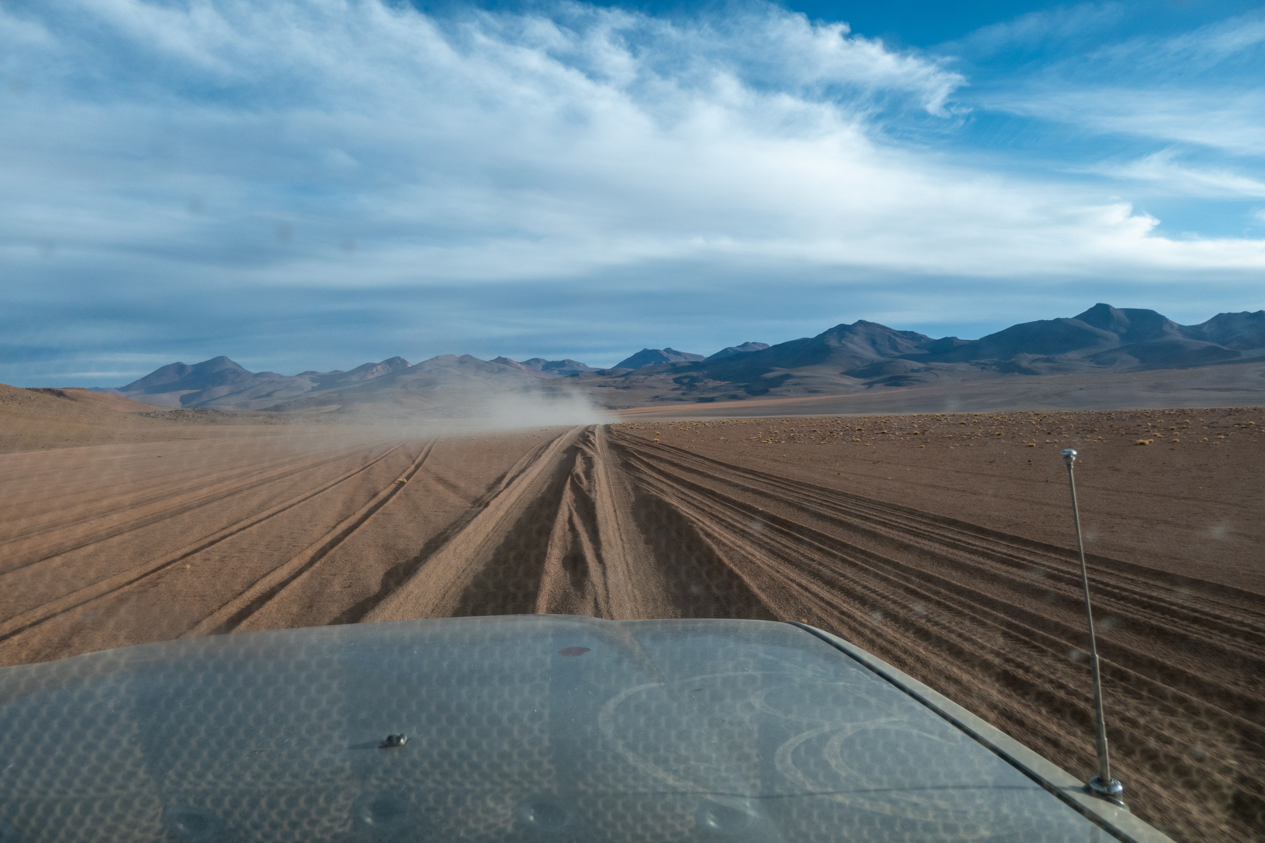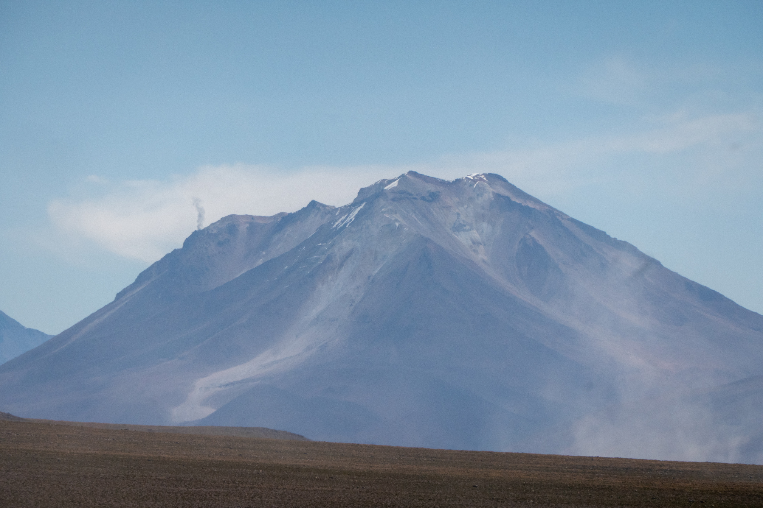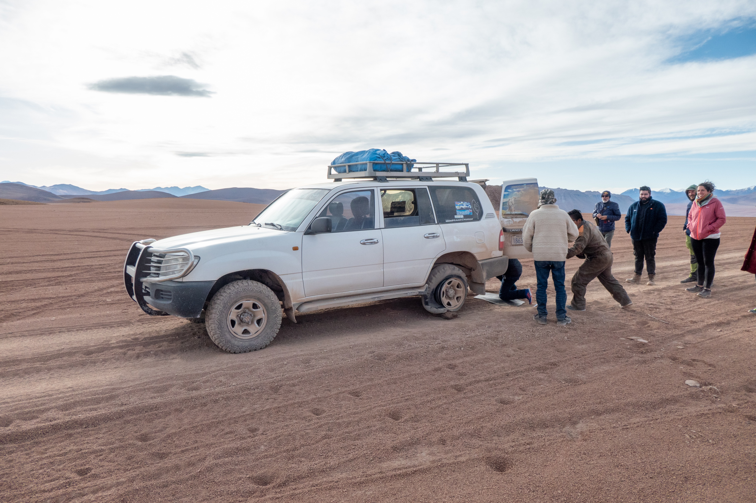 Am weiteren Weg kommen wir zu einem Aussichtspunkt von dem aus man zum aktiven Volcano Ollagüe sehen kann. An Nachmittag fahren wir zur Laguna Cañapa und noch zwei weiteren Lagunen, deren Namen ich mir nicht gemerkt habe. Bei einer riecht es intensiv nach Krebsen und bei der anderen tummeln sich über 1000 Flamingos. Genau am höchsten Punkt der Tour auf etwas über 4900 m hat das Fahrzeug eines anderen Unternehmens einen Platten. Unsere beiden Fahrer helfen. Es geht sehr hektisch ab, aber nach nur 15 Minuten sind sie fertig. Ziemlich schnell, wenn man bedenkt, dass wir uns in der Wüste befinden. Nach 20 Minuten hält der andere Wagen erneut. Von fünf Radmuttern fehlen drei. Alter. Eine wird gefunden, eine andere von unserem Rad genommen. Mit 4 von 5 bzw. 5 von 6 fahren wir mit der höchsten Geschwindigkeit der bisherigen Tour weiter. Es scheint knapp mit dem Sonnenuntergang zu werden.