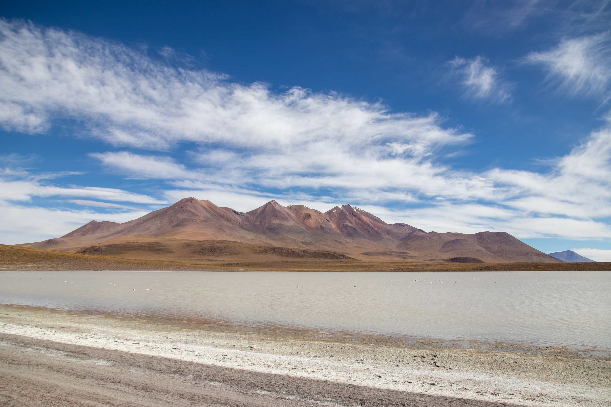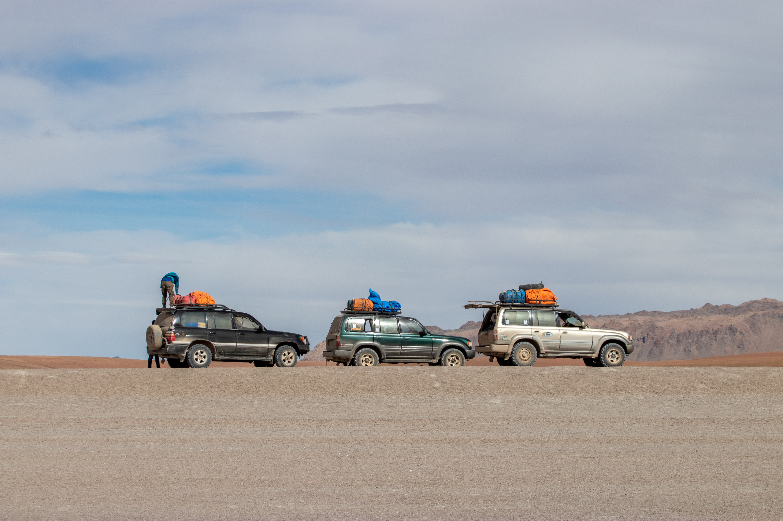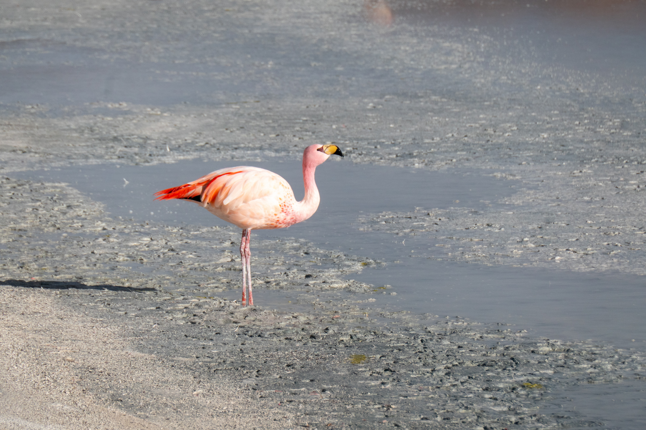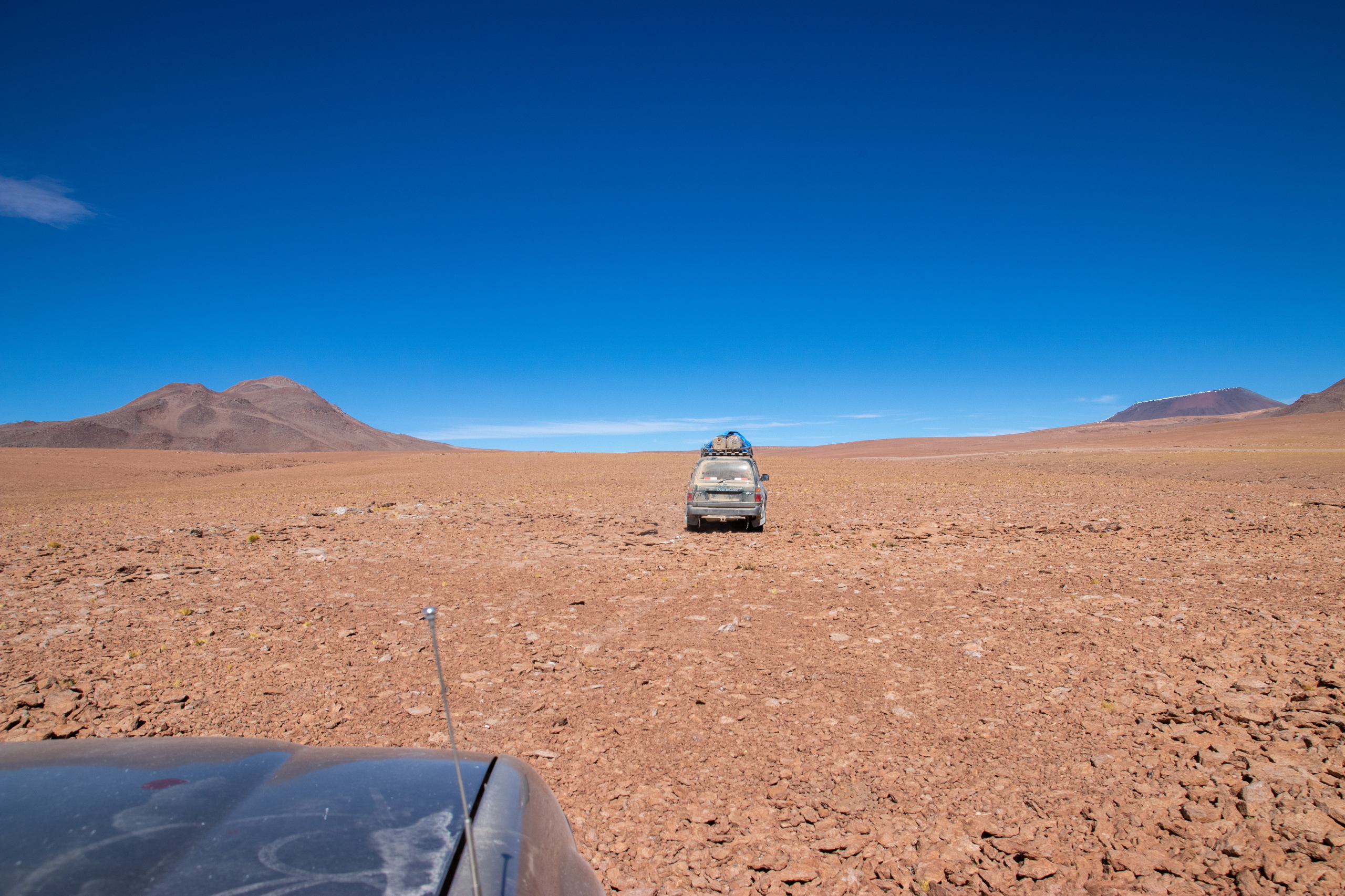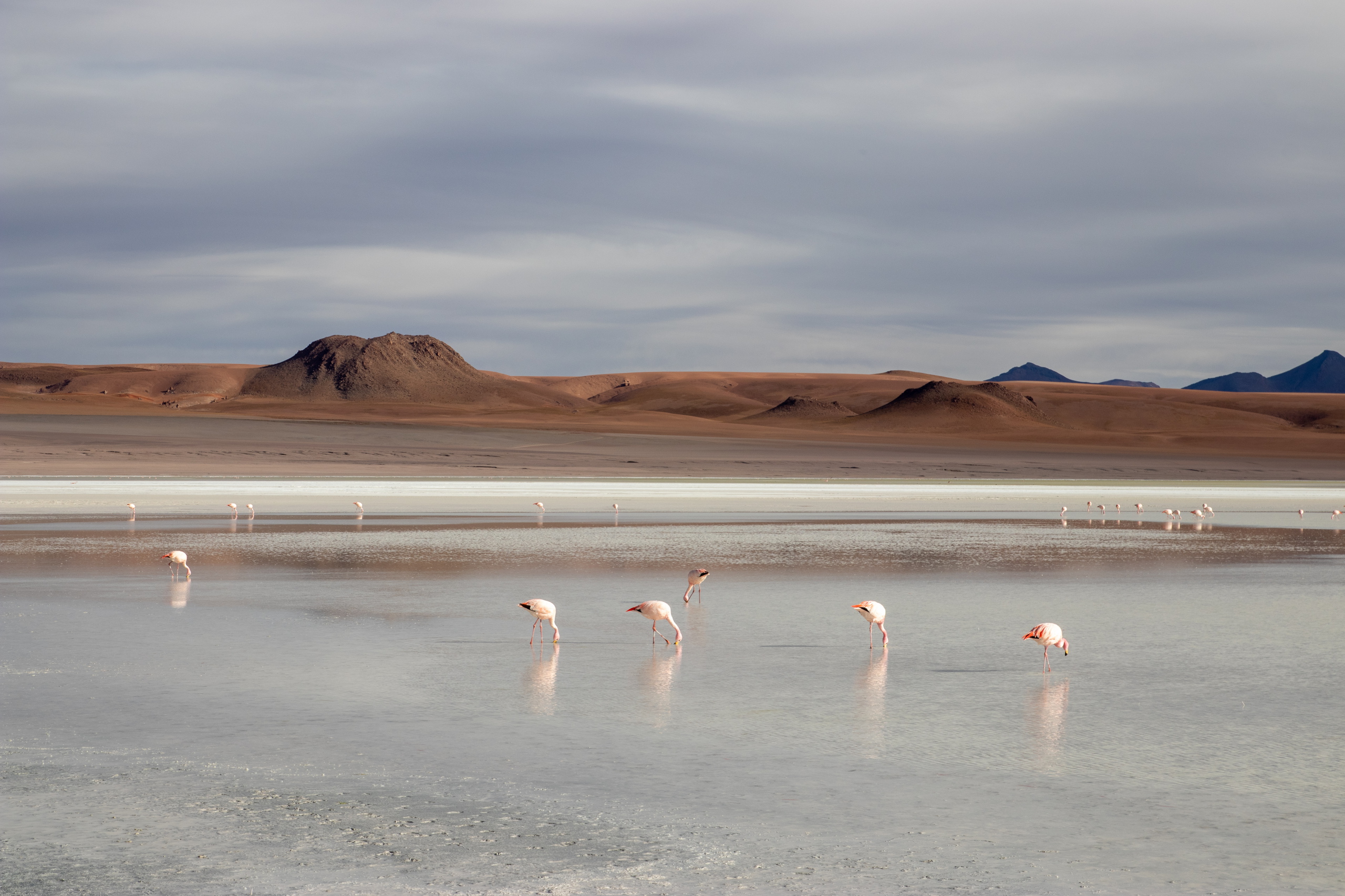 Am weiteren Weg kommen wir zu einem Aussichtspunkt von dem aus man zum aktiven Volcano Ollagüe sehen kann. An Nachmittag fahren wir zur Laguna Cañapa und noch zwei weiteren Lagunen, deren Namen ich mir nicht gemerkt habe. Bei einer riecht es intensiv nach Krebsen und bei der anderen tummeln sich über 1000 Flamingos. Genau am höchsten Punkt der Tour auf etwas über 4900 m hat das Fahrzeug eines anderen Unternehmens einen Platten. Unsere beiden Fahrer helfen. Es geht sehr hektisch ab, aber nach nur 15 Minuten sind sie fertig. Ziemlich schnell, wenn man bedenkt, dass wir uns in der Wüste befinden. Nach 20 Minuten hält der andere Wagen erneut. Von fünf Radmuttern fehlen drei. Alter. Eine wird gefunden, eine andere von unserem Rad genommen. Mit 4 von 5 bzw. 5 von 6 fahren wir mit der höchsten Geschwindigkeit der bisherigen Tour weiter. Es scheint knapp mit dem Sonnenuntergang zu werden.