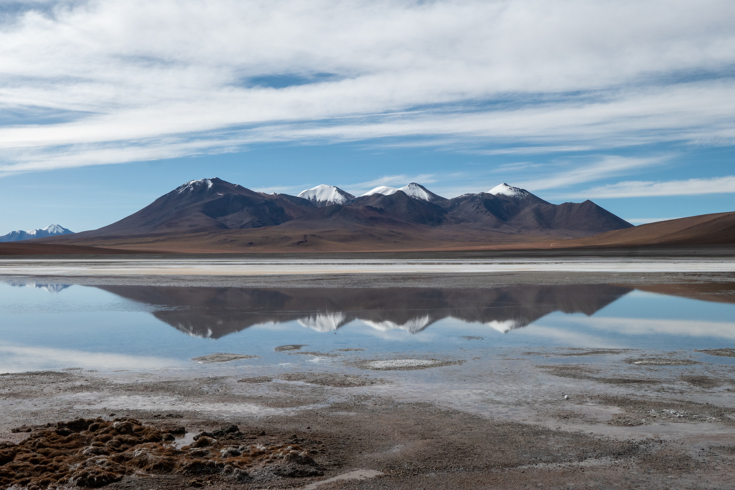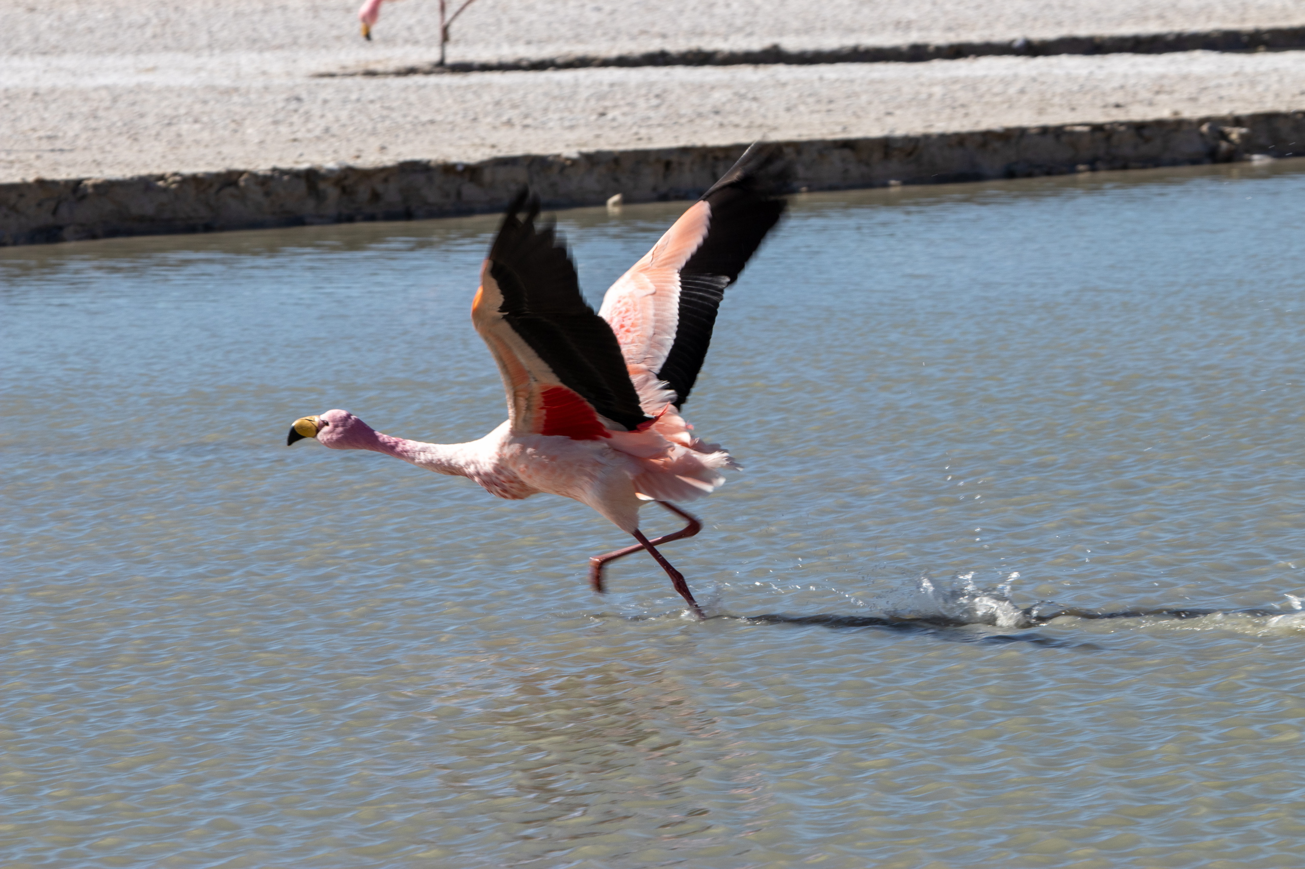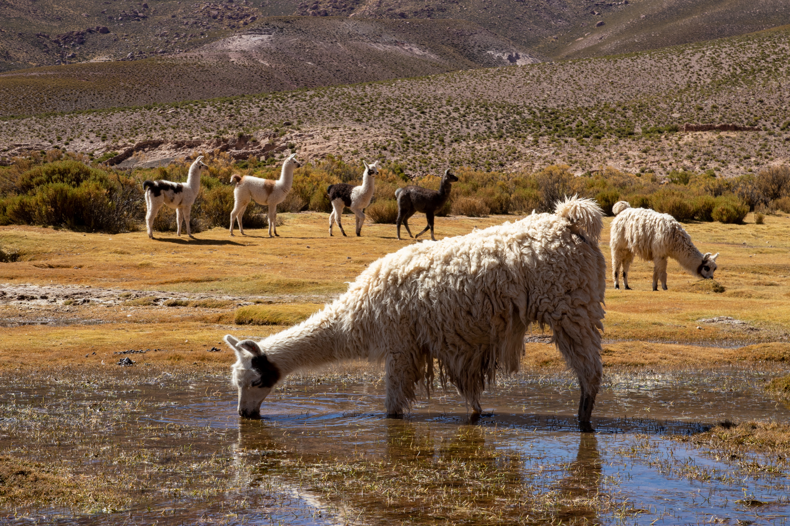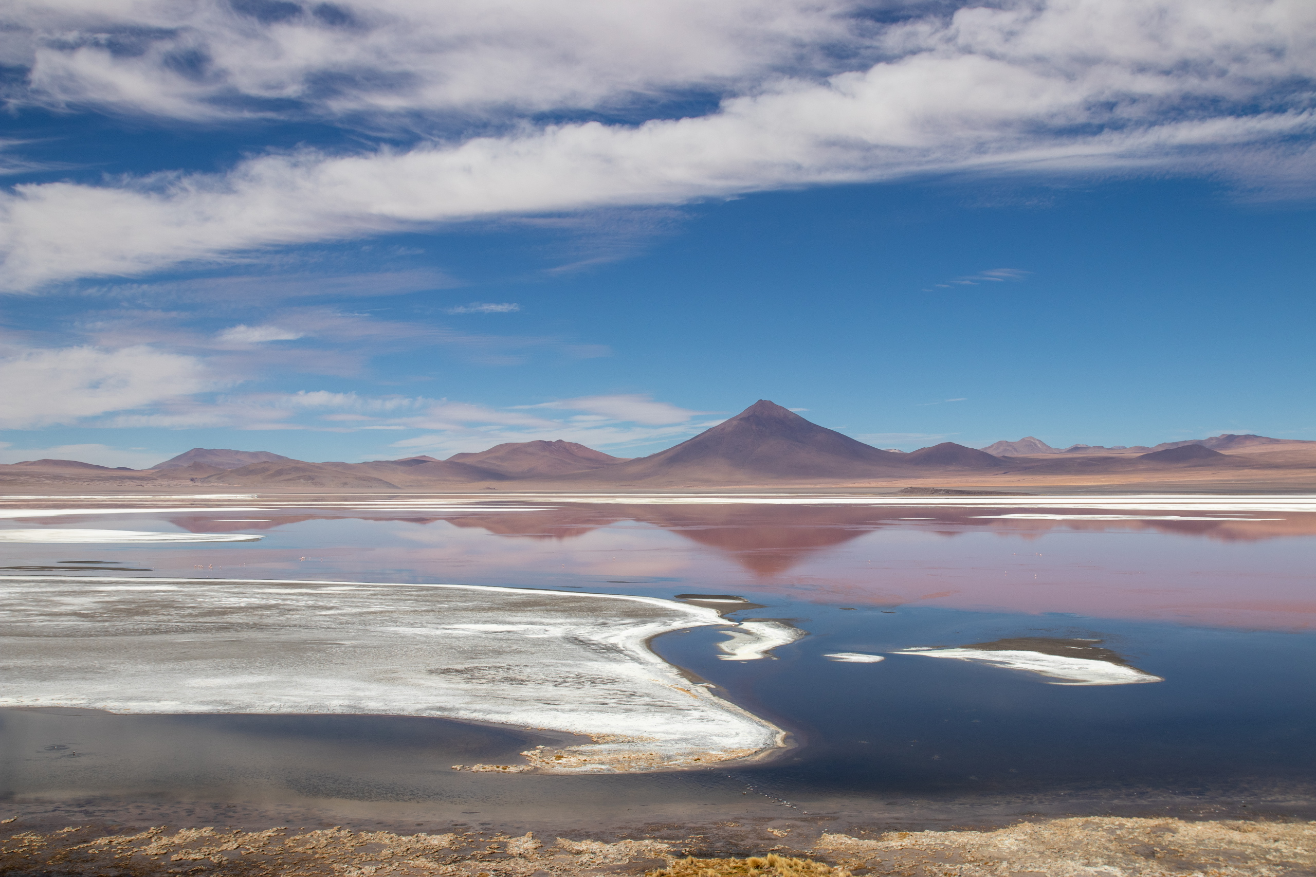 Am weiteren Weg kommen wir zu einem Aussichtspunkt von dem aus man zum aktiven Volcano Ollagüe sehen kann. An Nachmittag fahren wir zur Laguna Cañapa und noch zwei weiteren Lagunen, deren Namen ich mir nicht gemerkt habe. Bei einer riecht es intensiv nach Krebsen und bei der anderen tummeln sich über 1000 Flamingos. Genau am höchsten Punkt der Tour auf etwas über 4900 m hat das Fahrzeug eines anderen Unternehmens einen Platten. Unsere beiden Fahrer helfen. Es geht sehr hektisch ab, aber nach nur 15 Minuten sind sie fertig. Ziemlich schnell, wenn man bedenkt, dass wir uns in der Wüste befinden. Nach 20 Minuten hält der andere Wagen erneut. Von fünf Radmuttern fehlen drei. Alter. Eine wird gefunden, eine andere von unserem Rad genommen. Mit 4 von 5 bzw. 5 von 6 fahren wir mit der höchsten Geschwindigkeit der bisherigen Tour weiter. Es scheint knapp mit dem Sonnenuntergang zu werden.