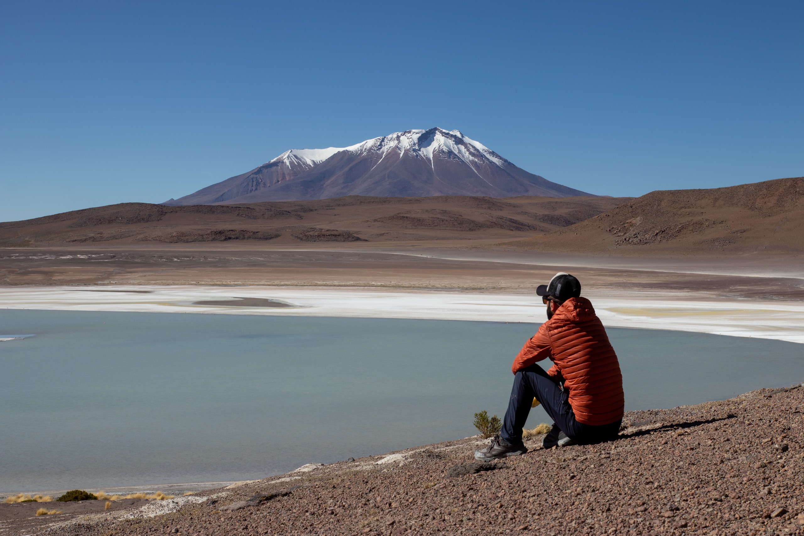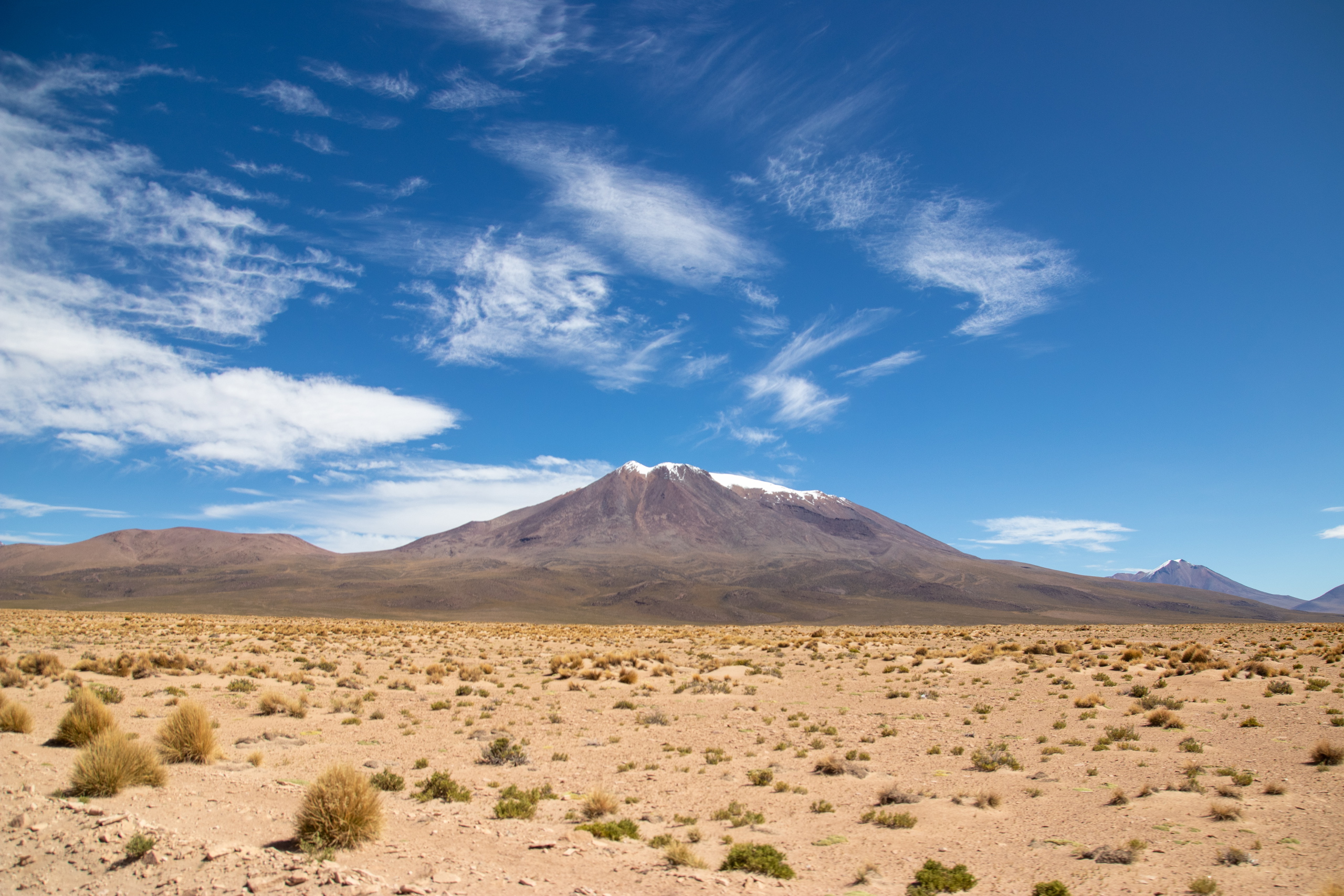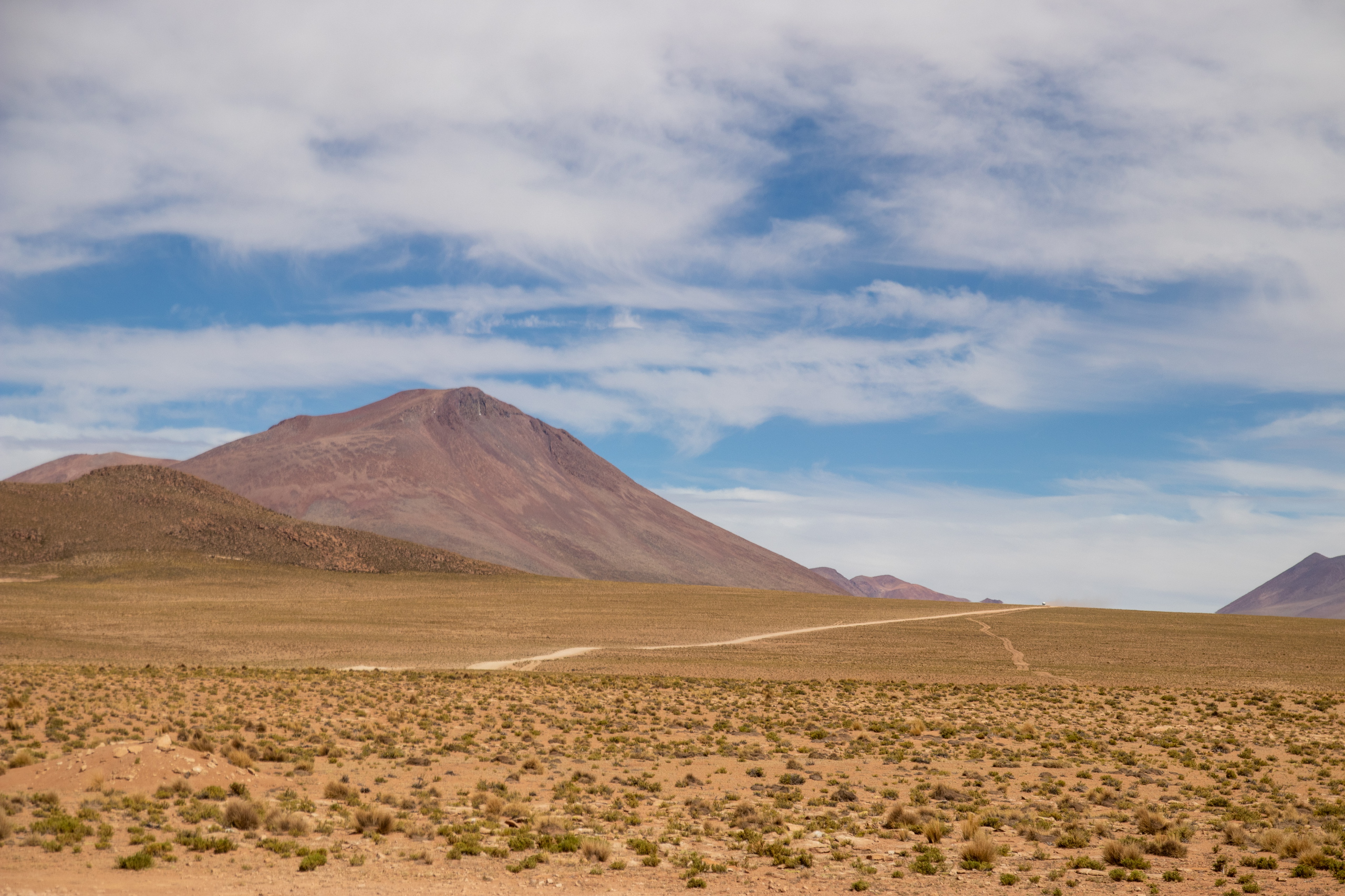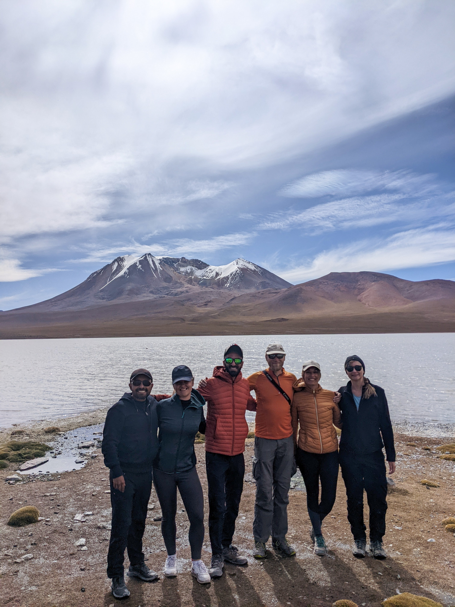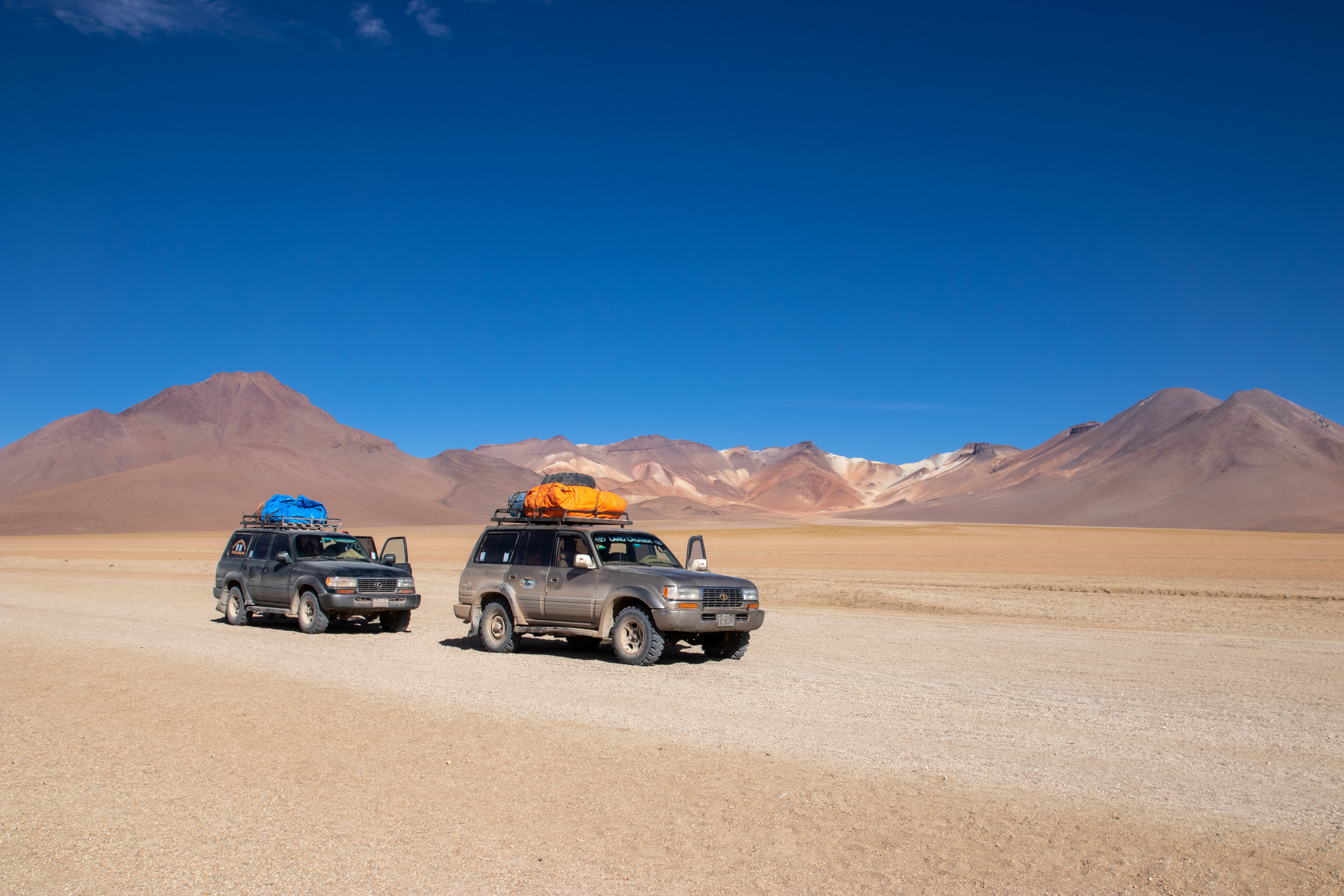 Am weiteren Weg kommen wir zu einem Aussichtspunkt von dem aus man zum aktiven Volcano Ollagüe sehen kann. An Nachmittag fahren wir zur Laguna Cañapa und noch zwei weiteren Lagunen, deren Namen ich mir nicht gemerkt habe. Bei einer riecht es intensiv nach Krebsen und bei der anderen tummeln sich über 1000 Flamingos. Genau am höchsten Punkt der Tour auf etwas über 4900 m hat das Fahrzeug eines anderen Unternehmens einen Platten. Unsere beiden Fahrer helfen. Es geht sehr hektisch ab, aber nach nur 15 Minuten sind sie fertig. Ziemlich schnell, wenn man bedenkt, dass wir uns in der Wüste befinden. Nach 20 Minuten hält der andere Wagen erneut. Von fünf Radmuttern fehlen drei. Alter. Eine wird gefunden, eine andere von unserem Rad genommen. Mit 4 von 5 bzw. 5 von 6 fahren wir mit der höchsten Geschwindigkeit der bisherigen Tour weiter. Es scheint knapp mit dem Sonnenuntergang zu werden.