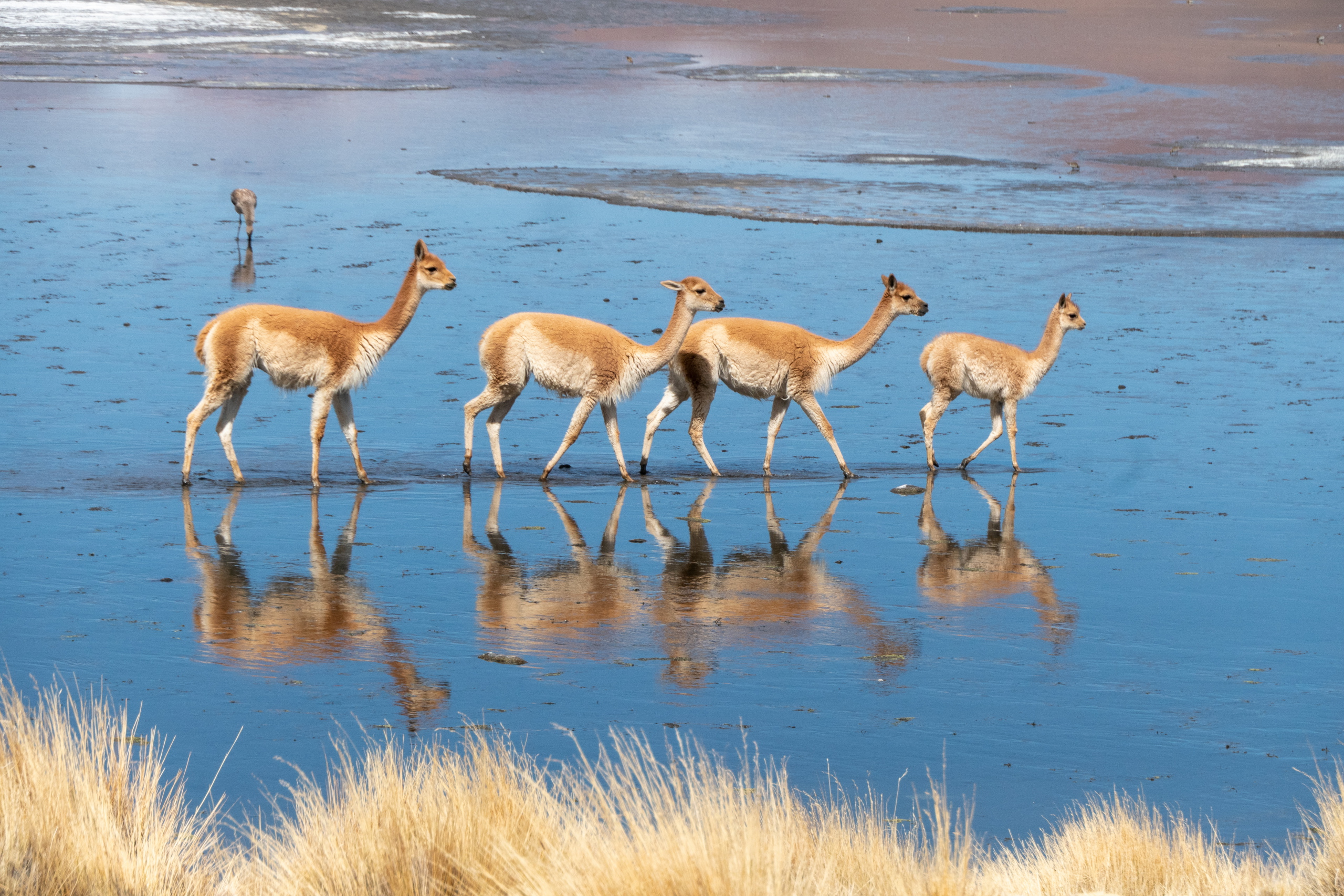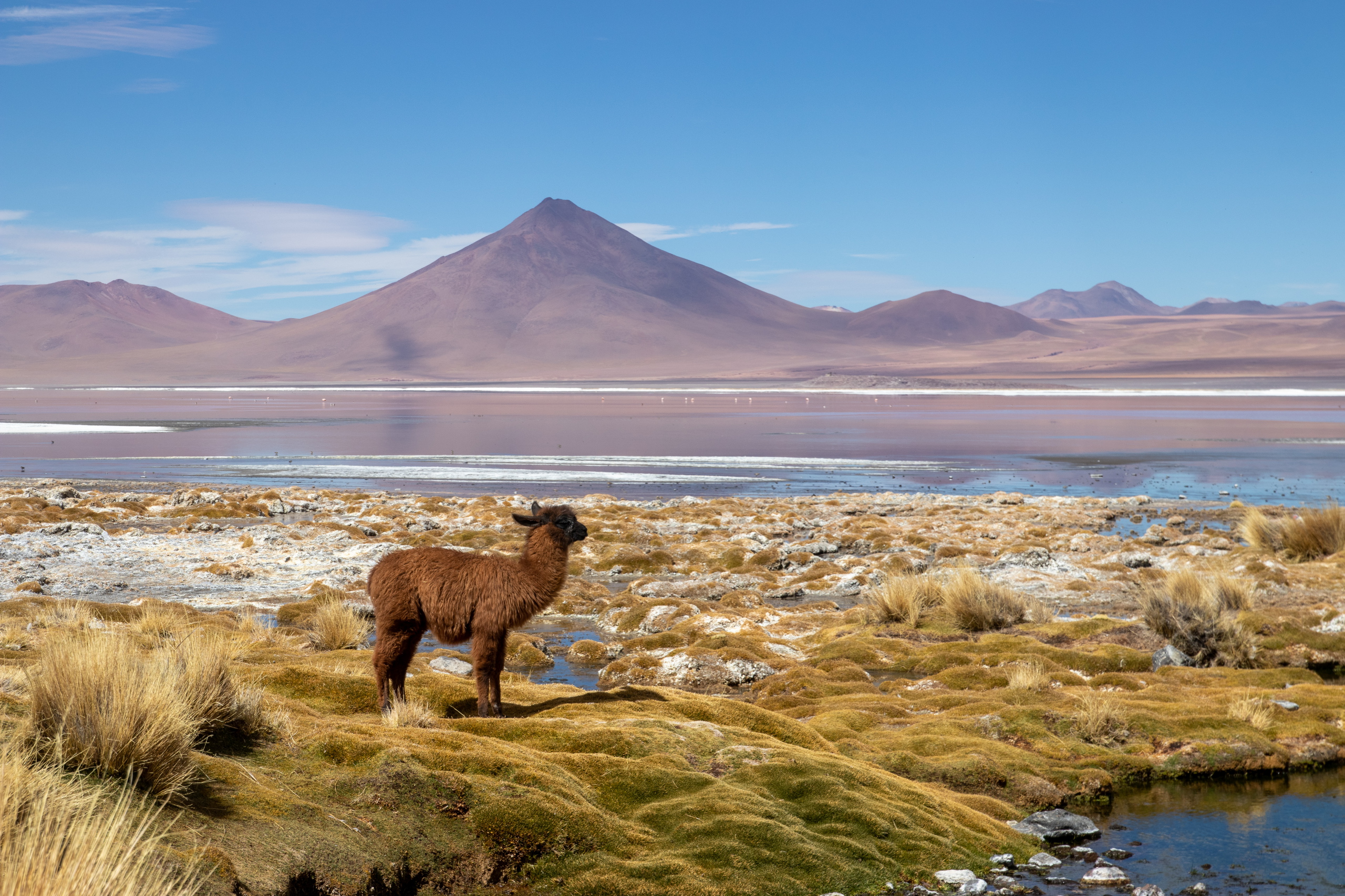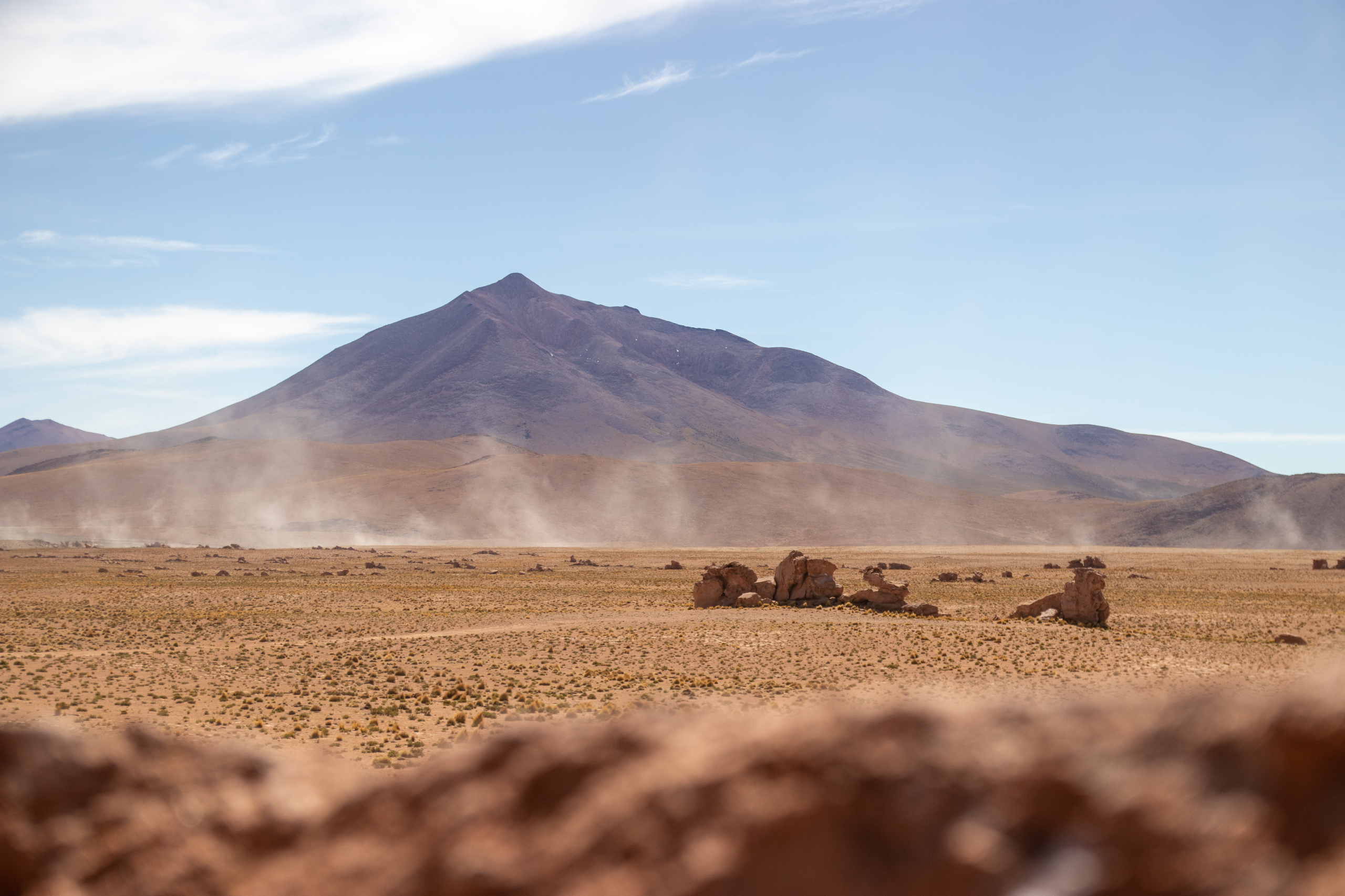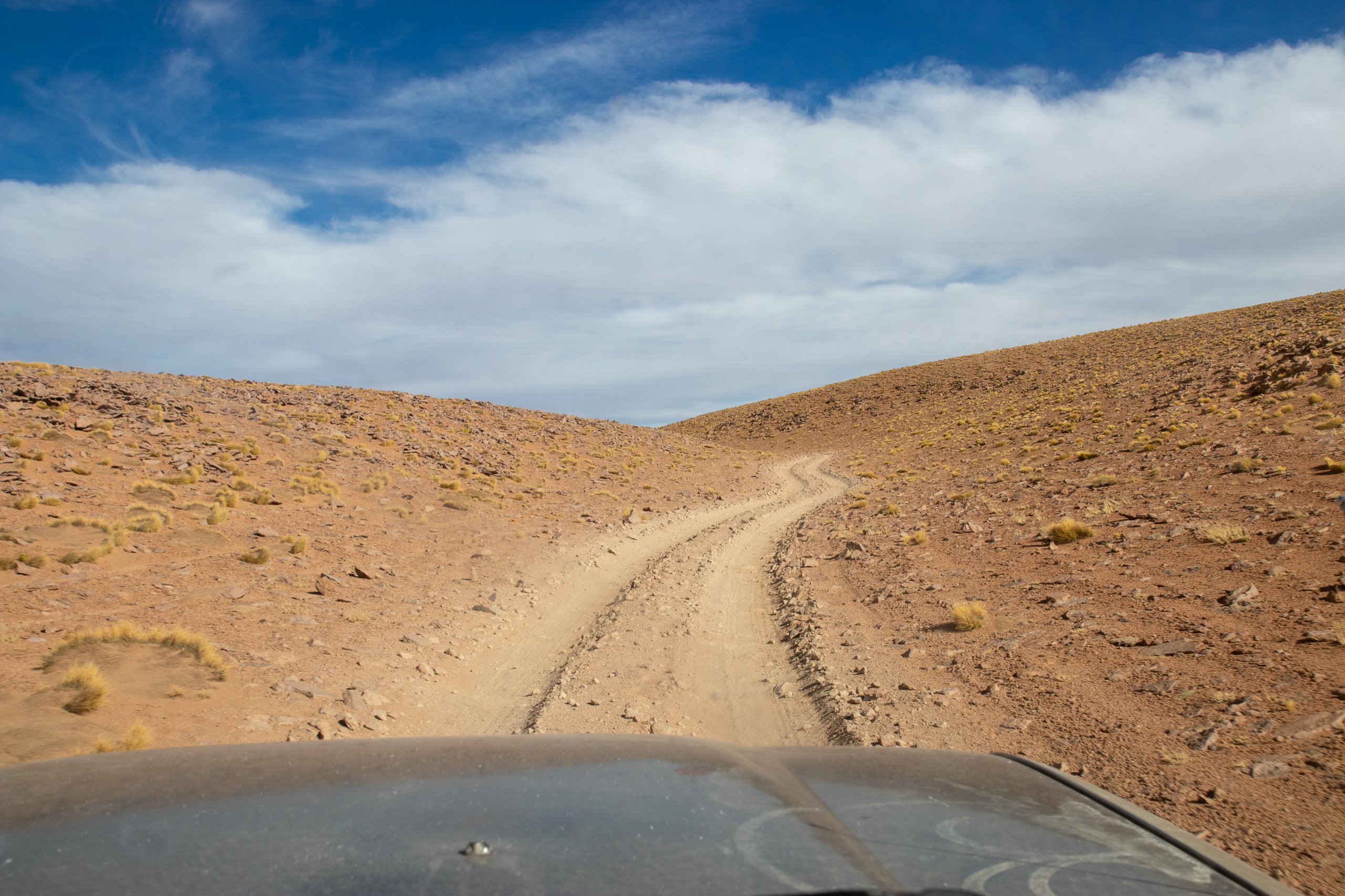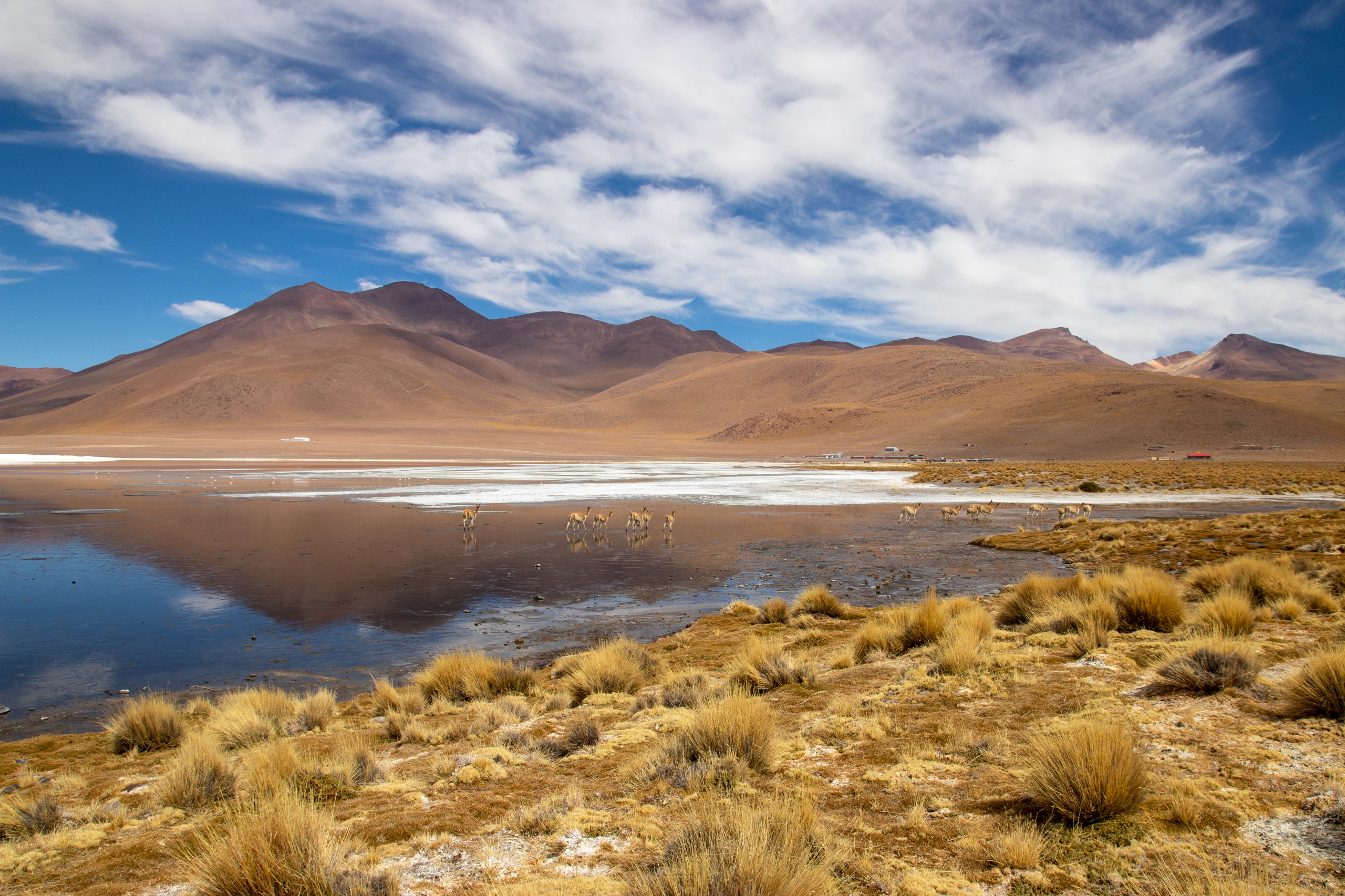 Am weiteren Weg kommen wir zu einem Aussichtspunkt von dem aus man zum aktiven Volcano Ollagüe sehen kann. An Nachmittag fahren wir zur Laguna Cañapa und noch zwei weiteren Lagunen, deren Namen ich mir nicht gemerkt habe. Bei einer riecht es intensiv nach Krebsen und bei der anderen tummeln sich über 1000 Flamingos. Genau am höchsten Punkt der Tour auf etwas über 4900 m hat das Fahrzeug eines anderen Unternehmens einen Platten. Unsere beiden Fahrer helfen. Es geht sehr hektisch ab, aber nach nur 15 Minuten sind sie fertig. Ziemlich schnell, wenn man bedenkt, dass wir uns in der Wüste befinden. Nach 20 Minuten hält der andere Wagen erneut. Von fünf Radmuttern fehlen drei. Alter. Eine wird gefunden, eine andere von unserem Rad genommen. Mit 4 von 5 bzw. 5 von 6 fahren wir mit der höchsten Geschwindigkeit der bisherigen Tour weiter. Es scheint knapp mit dem Sonnenuntergang zu werden.