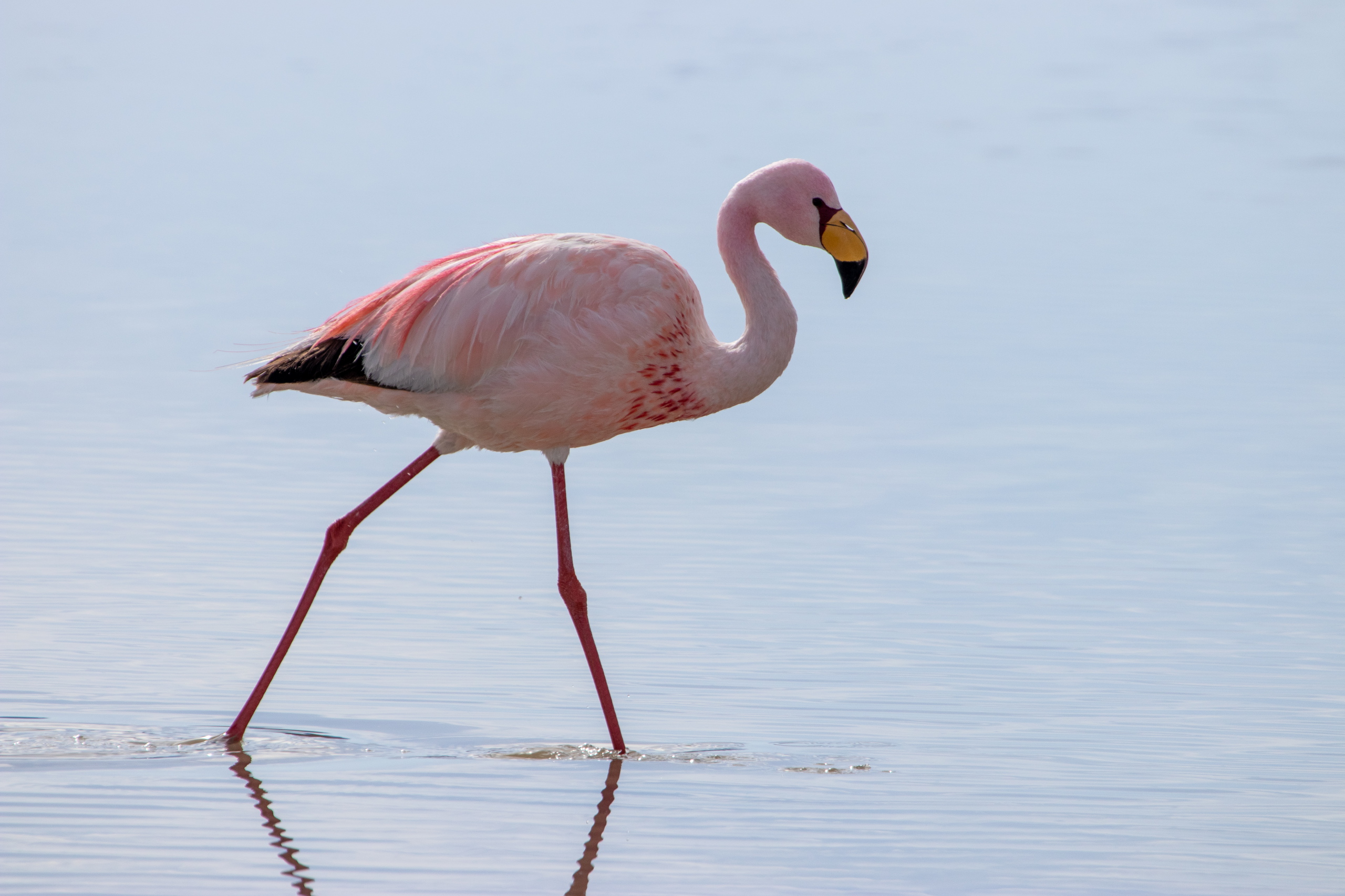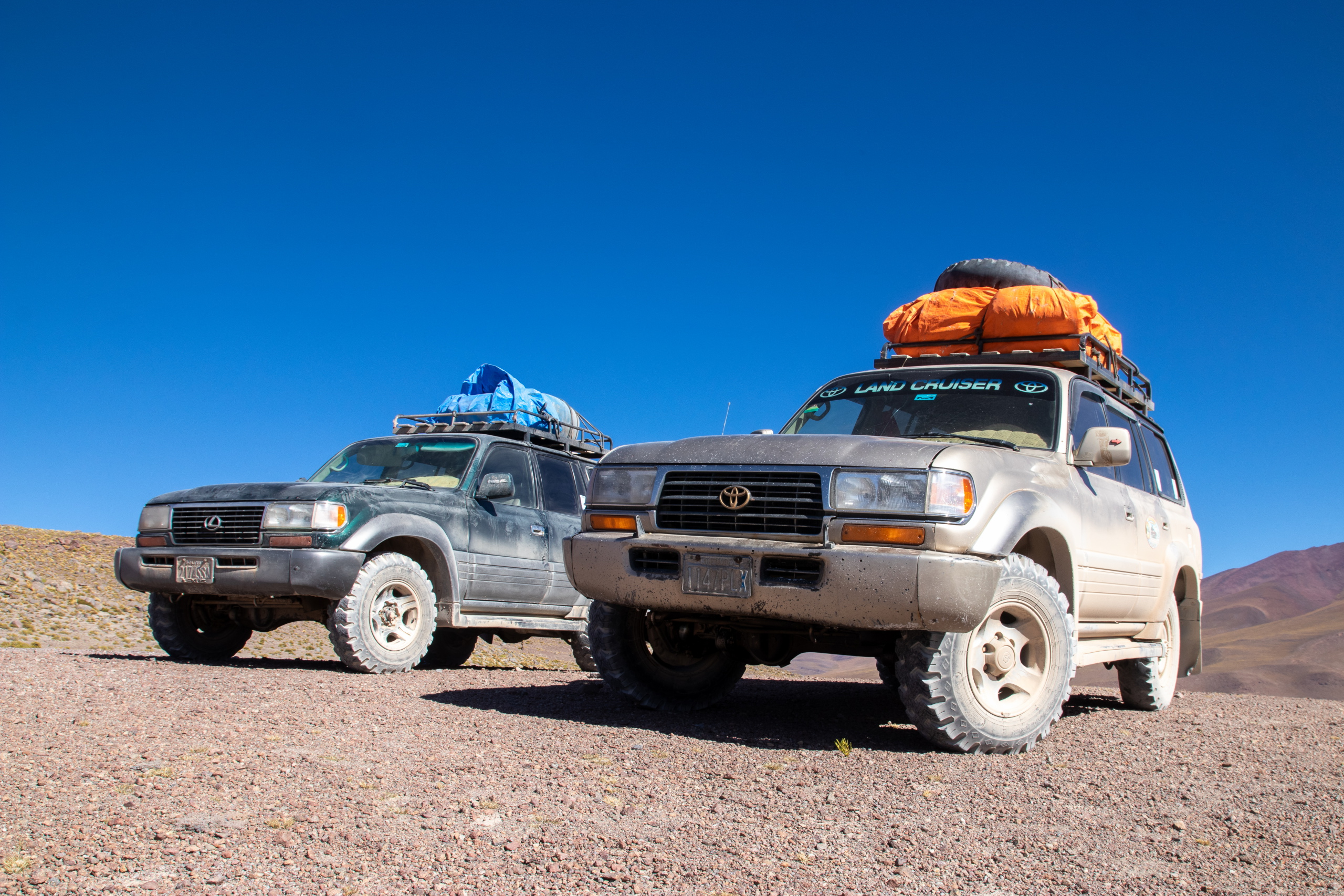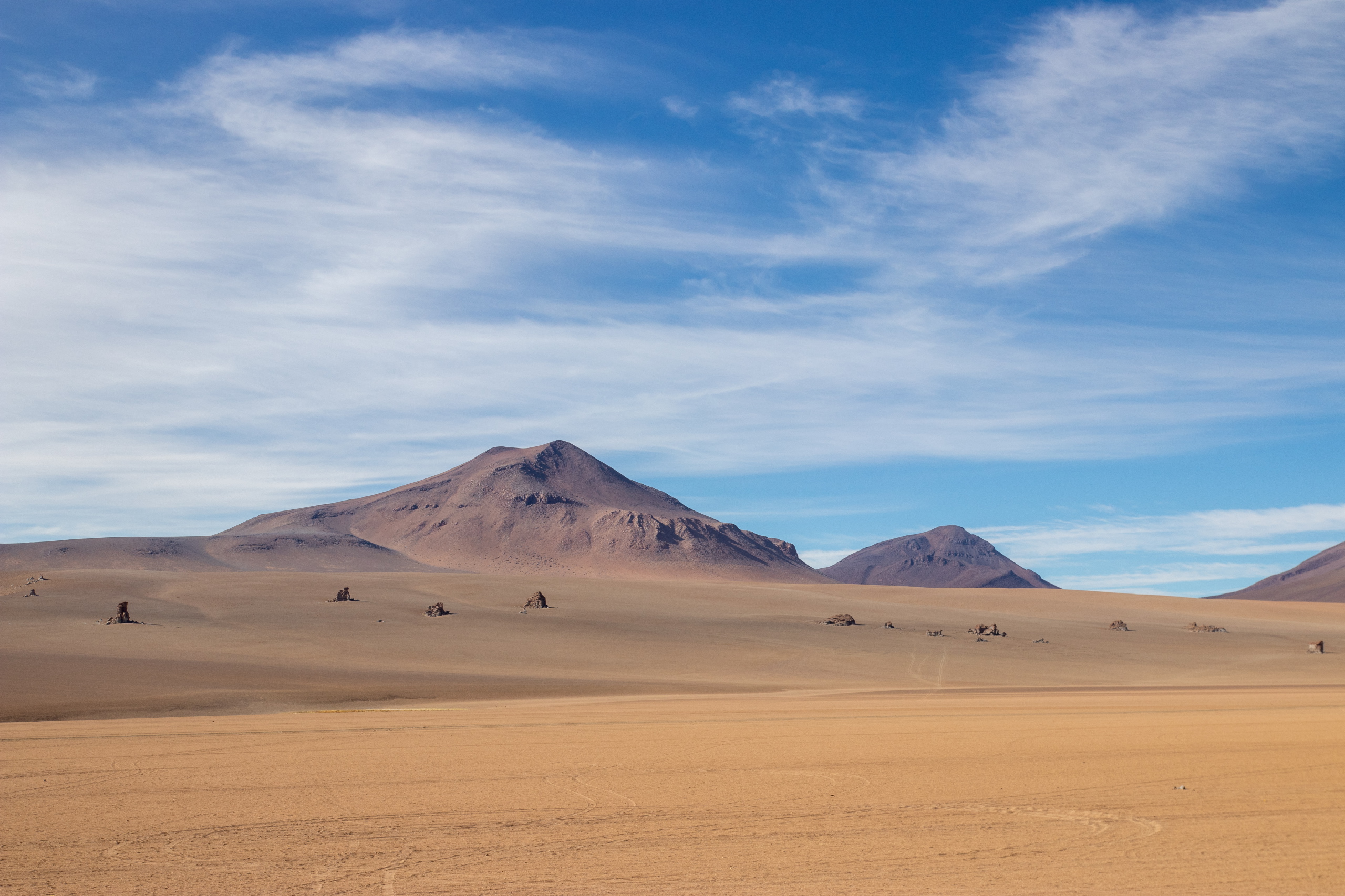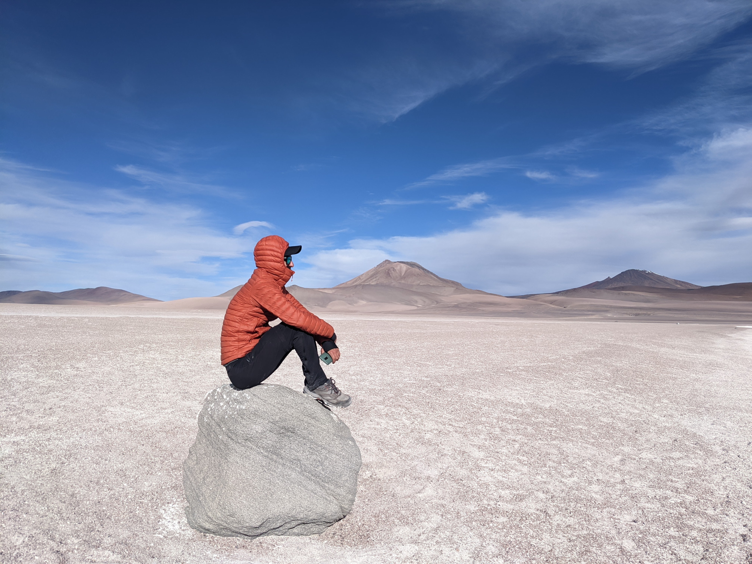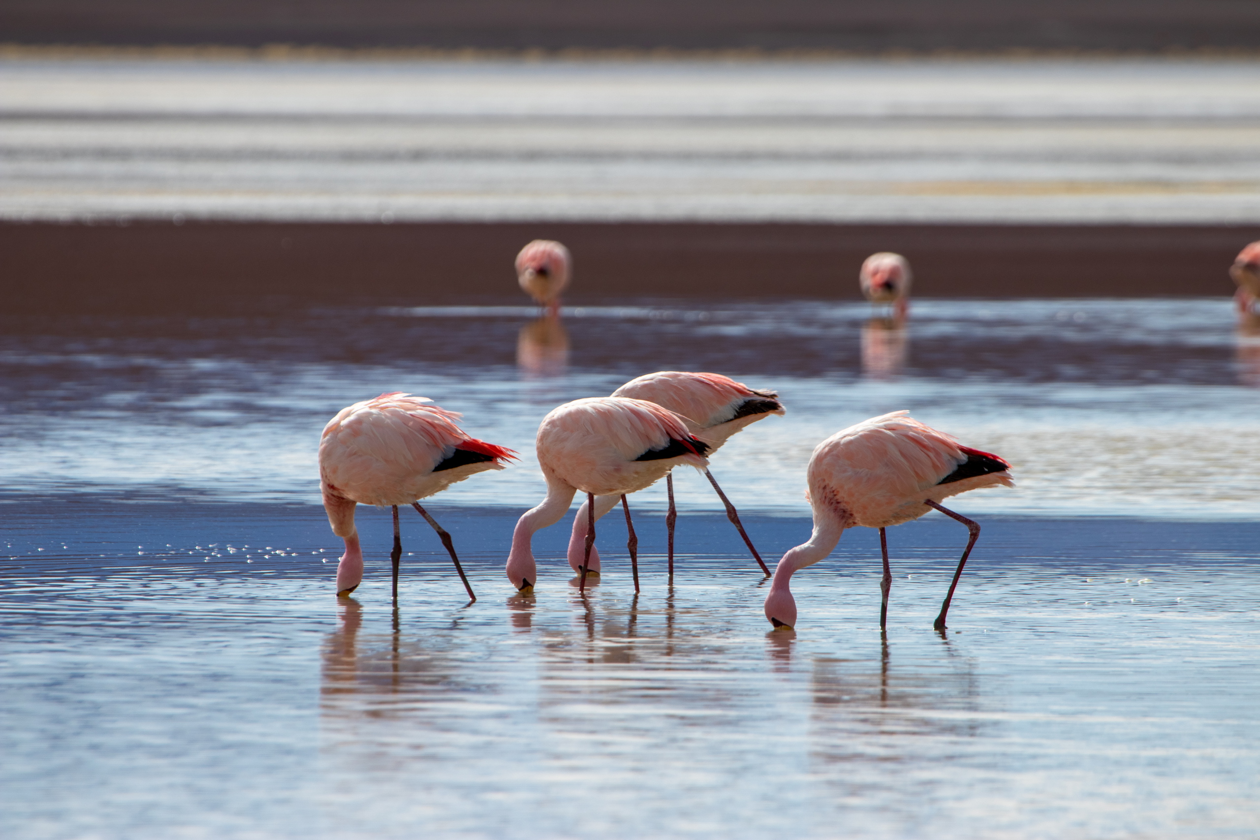 Am weiteren Weg kommen wir zu einem Aussichtspunkt von dem aus man zum aktiven Volcano Ollagüe sehen kann. An Nachmittag fahren wir zur Laguna Cañapa und noch zwei weiteren Lagunen, deren Namen ich mir nicht gemerkt habe. Bei einer riecht es intensiv nach Krebsen und bei der anderen tummeln sich über 1000 Flamingos. Genau am höchsten Punkt der Tour auf etwas über 4900 m hat das Fahrzeug eines anderen Unternehmens einen Platten. Unsere beiden Fahrer helfen. Es geht sehr hektisch ab, aber nach nur 15 Minuten sind sie fertig. Ziemlich schnell, wenn man bedenkt, dass wir uns in der Wüste befinden. Nach 20 Minuten hält der andere Wagen erneut. Von fünf Radmuttern fehlen drei. Alter. Eine wird gefunden, eine andere von unserem Rad genommen. Mit 4 von 5 bzw. 5 von 6 fahren wir mit der höchsten Geschwindigkeit der bisherigen Tour weiter. Es scheint knapp mit dem Sonnenuntergang zu werden.
