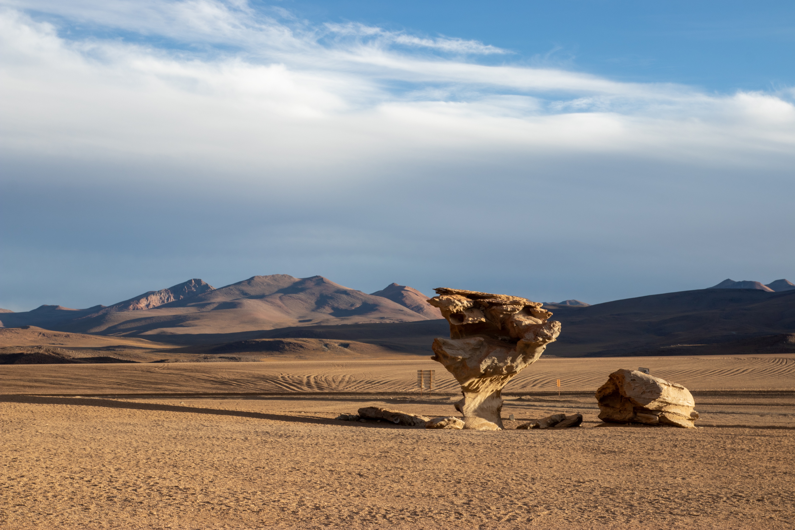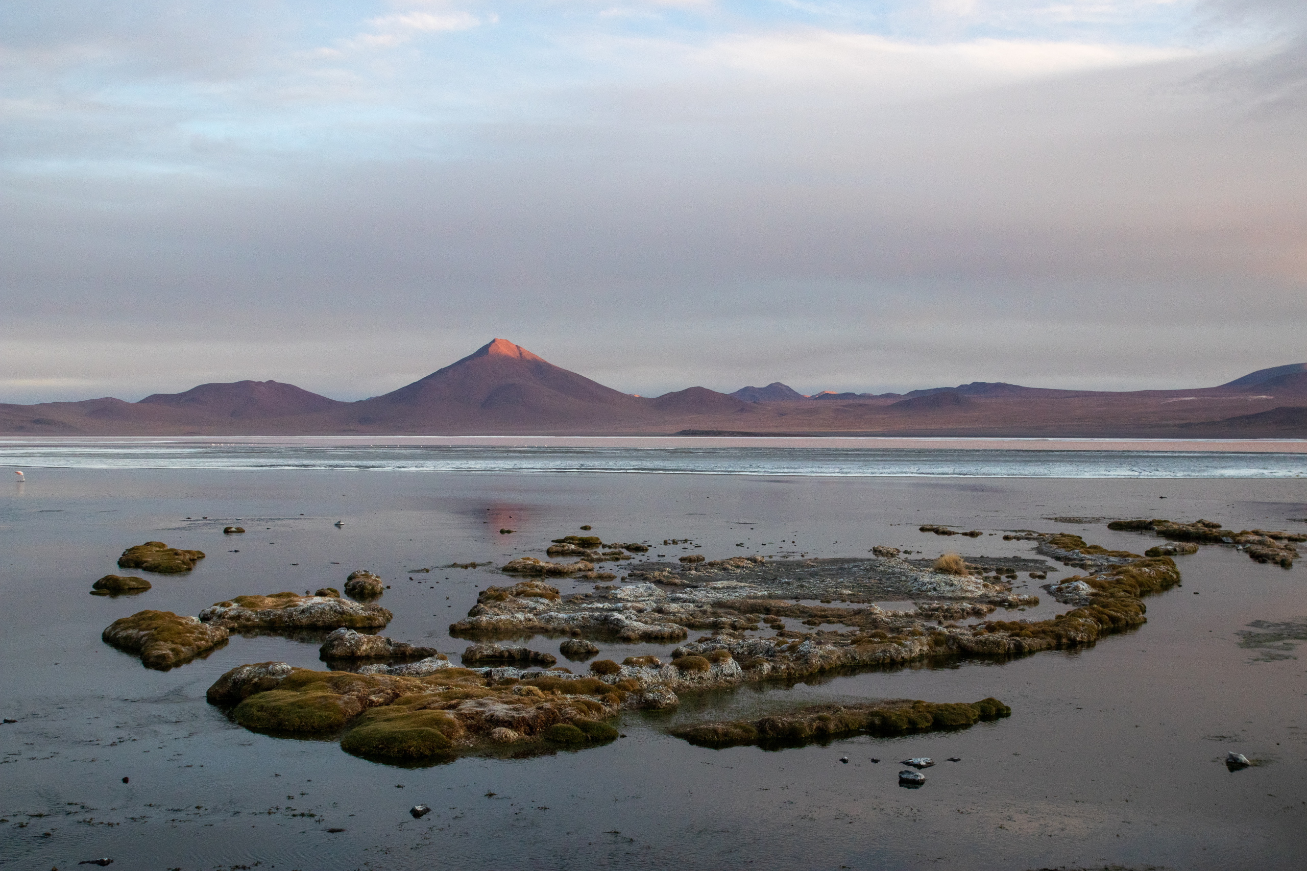Die Sonne steht schon tief, als wir zum versteinerten Baum, einer Felsformation, kommen. Interessanterweise kümmern sich die Guides nicht darum uns rechtzeitig wieder in die Autos zu jagen und es dauert bis alle eingestiegen sind. Darum fahren wir mit Vollgas weiter zur Laguna Colorada. Die Sonne geht gerade unter und scheint nur mehr die umliegenden Berge an. Es sieht sehr schön aus, nur vom Rot der Lagune ist nicht viel zu sehen. Jetzt teilt uns Jose mit, dass wir uns keine Sorgen machen müssen, da wir morgen um die Mittagszeit erneut hier sind. Dann, wenn das Rot am intensivsten ist. Die Info wäre etwas früher nicht schlecht gewesen.