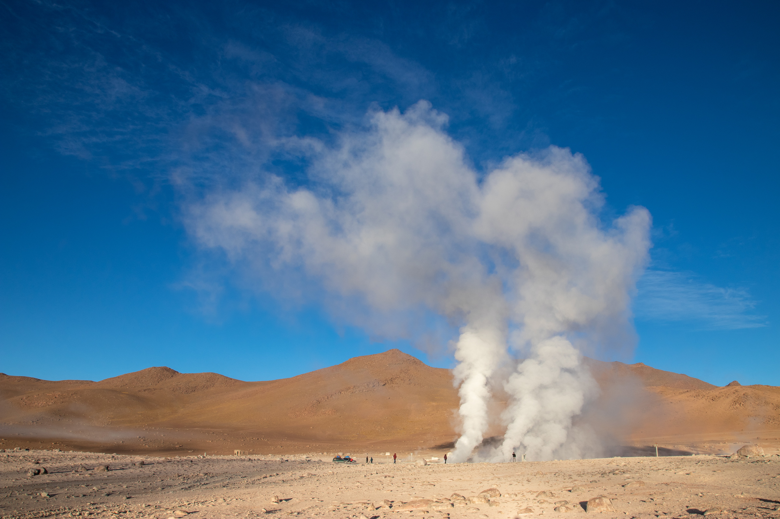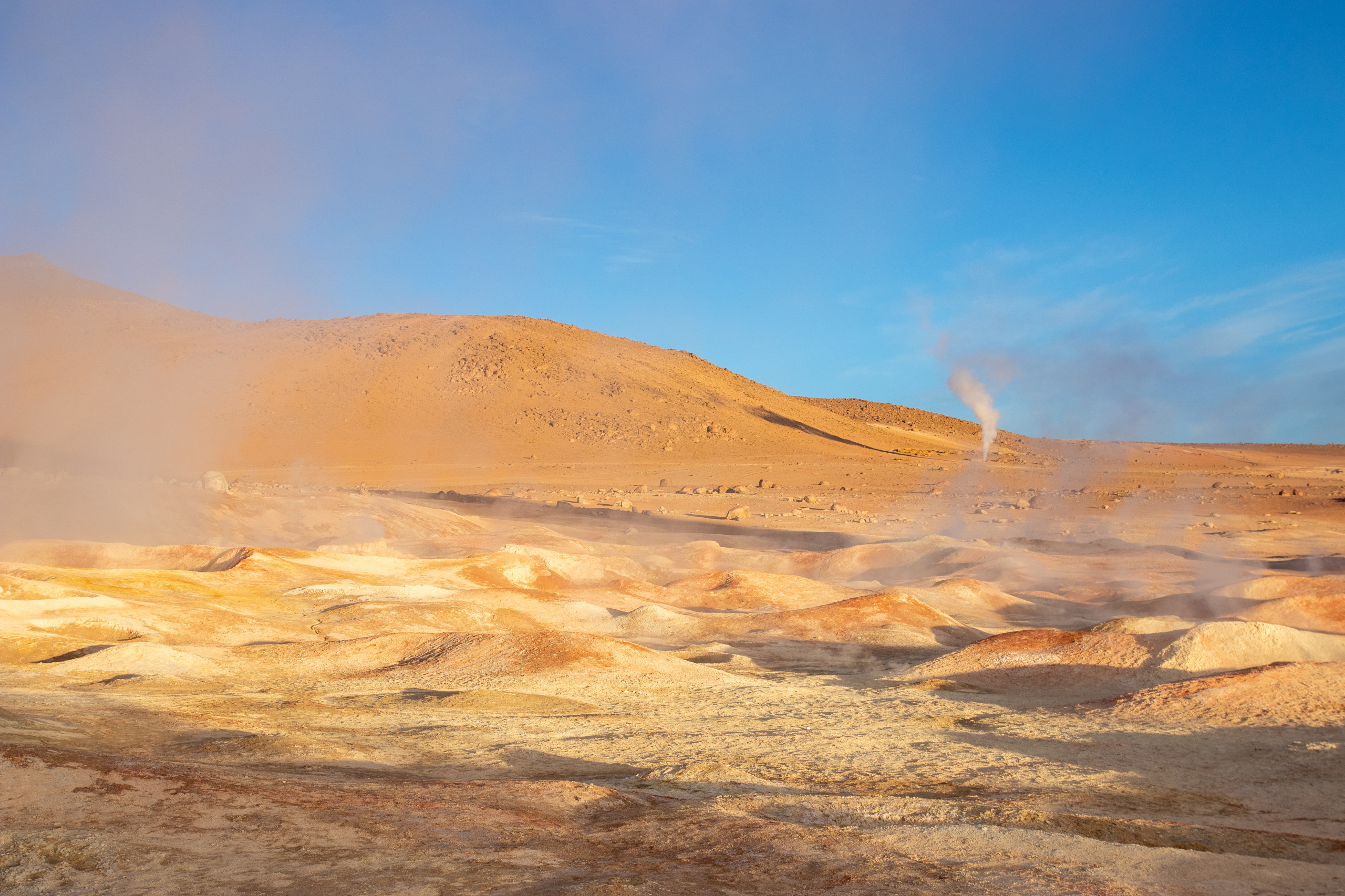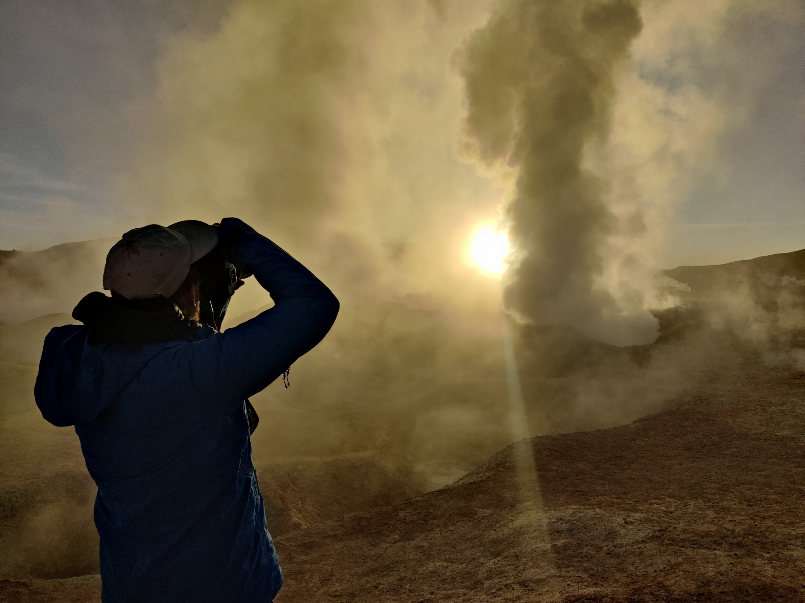 Heute müssen wir früh raus, dafür werden wir beim Frühstück mit Pancakes und Dulce de Leche belohnt. Es ist noch stockdunkel, als wir um halb sechs Uhr losfahren. Der Himmel beginnt sich langsam zu verfärben. Eine schmale Sichel liegt waagerecht über dem Horizont. Kurz vorm Sonnenaufgang erreichen wir die Geysire Sol de Mañana. Es pfaucht und dampft und wie schon bei den Geysiren in Chile lässt die Aktivität eine Zeit nach dem Sonnenaufgang nach.