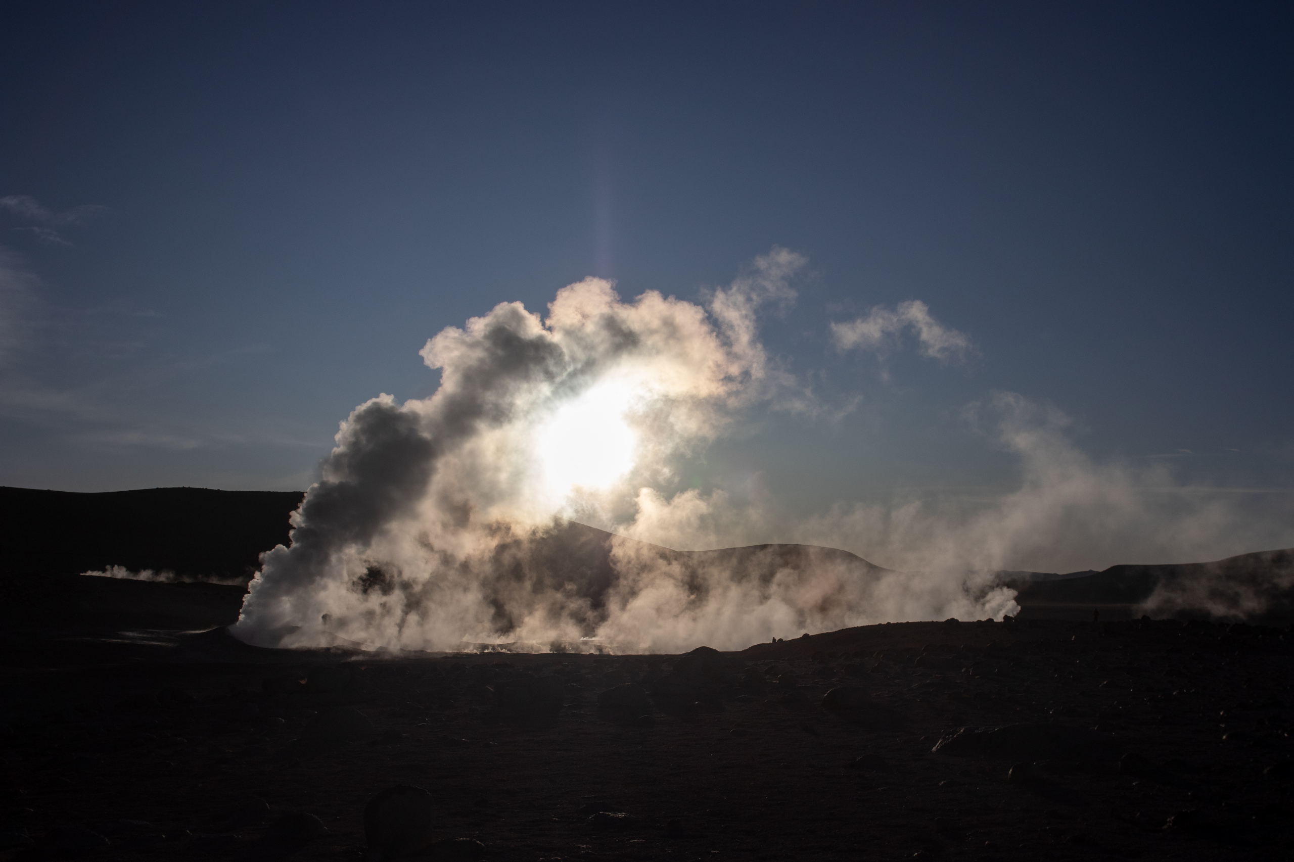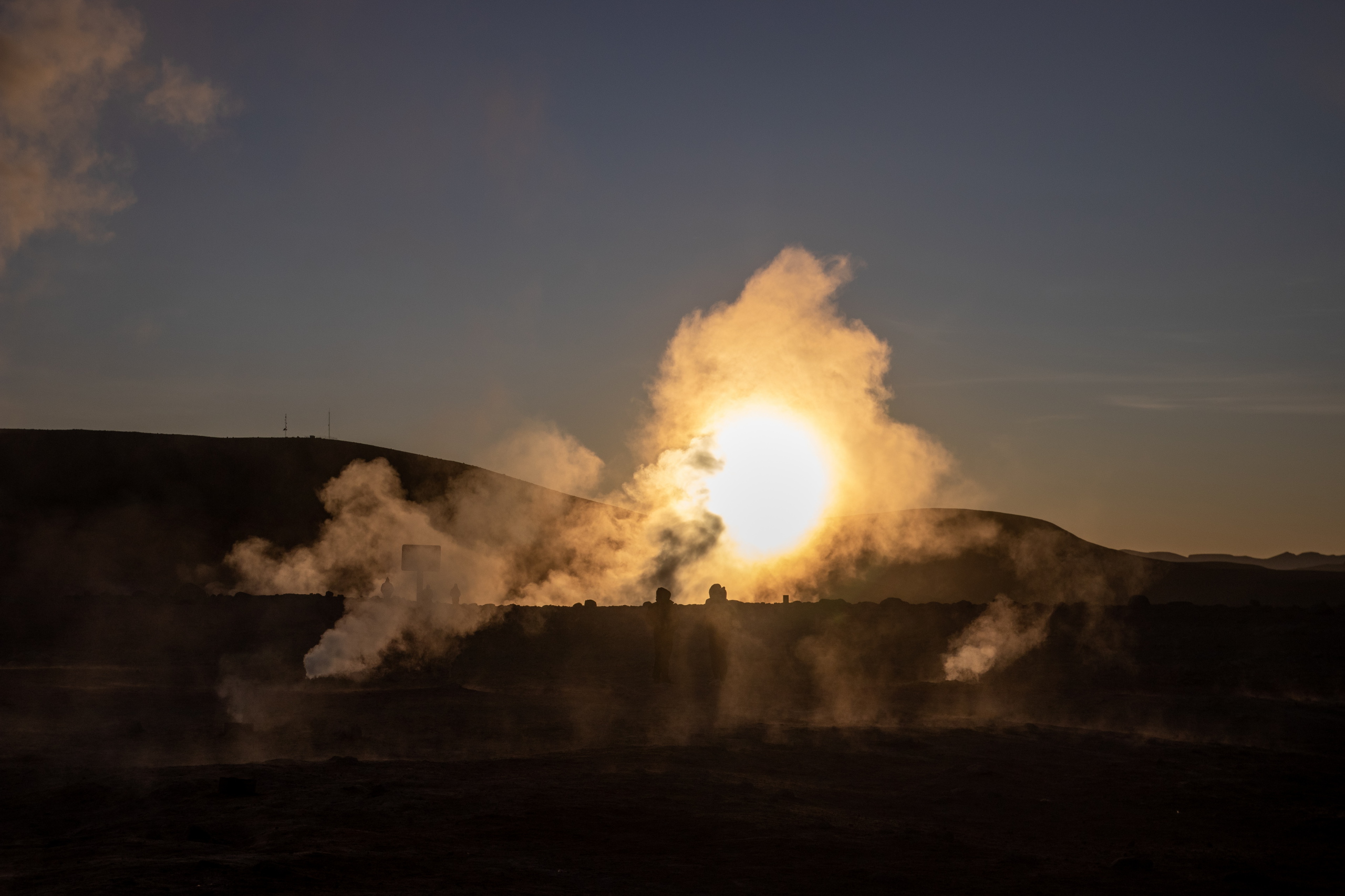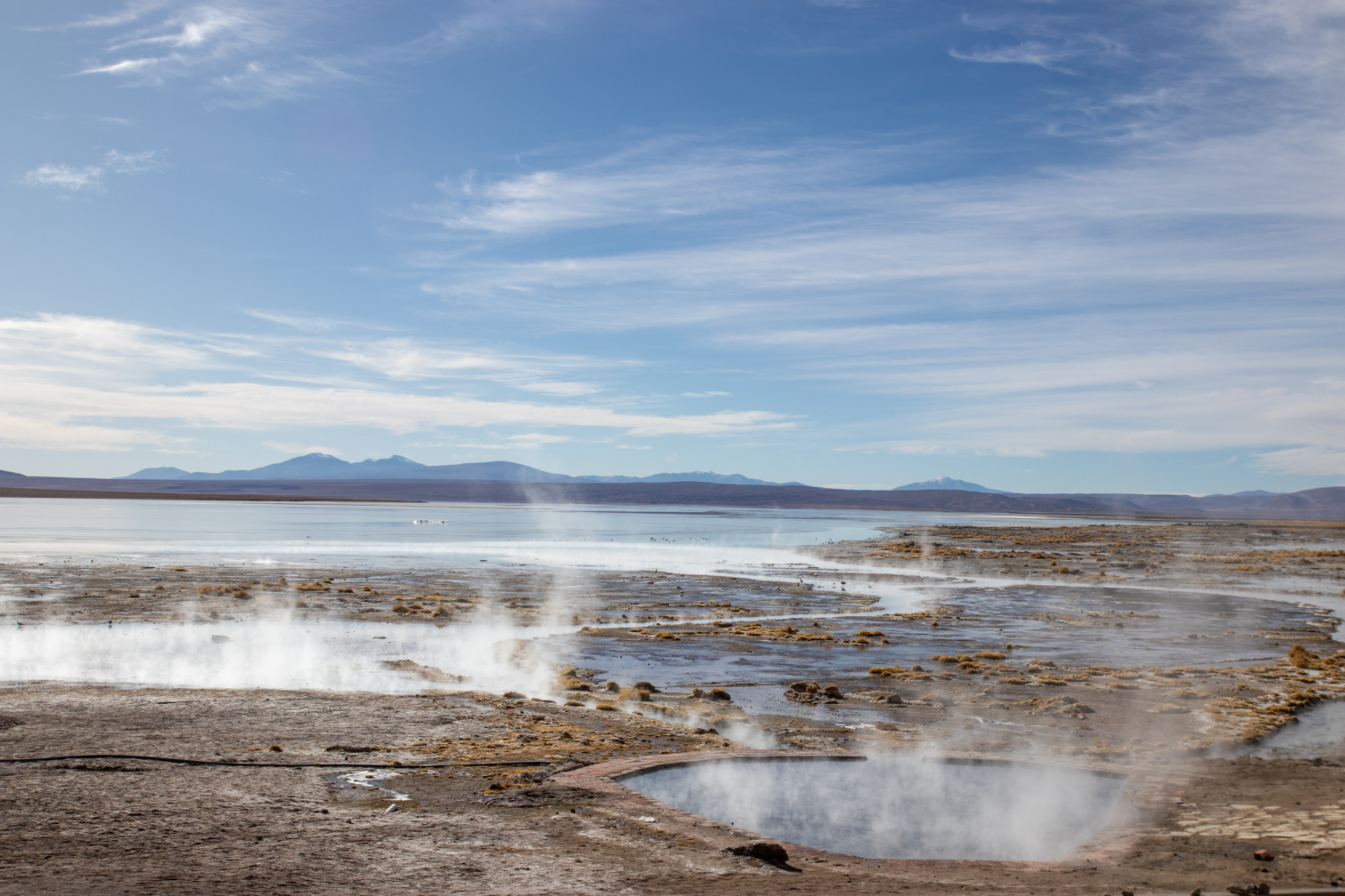 Heute müssen wir früh raus, dafür werden wir beim Frühstück mit Pancakes und Dulce de Leche belohnt. Es ist noch stockdunkel, als wir um halb sechs Uhr losfahren. Der Himmel beginnt sich langsam zu verfärben. Eine schmale Sichel liegt waagerecht über dem Horizont. Kurz vorm Sonnenaufgang erreichen wir die Geysire Sol de Mañana. Es pfaucht und dampft und wie schon bei den Geysiren in Chile lässt die Aktivität eine Zeit nach dem Sonnenaufgang nach.