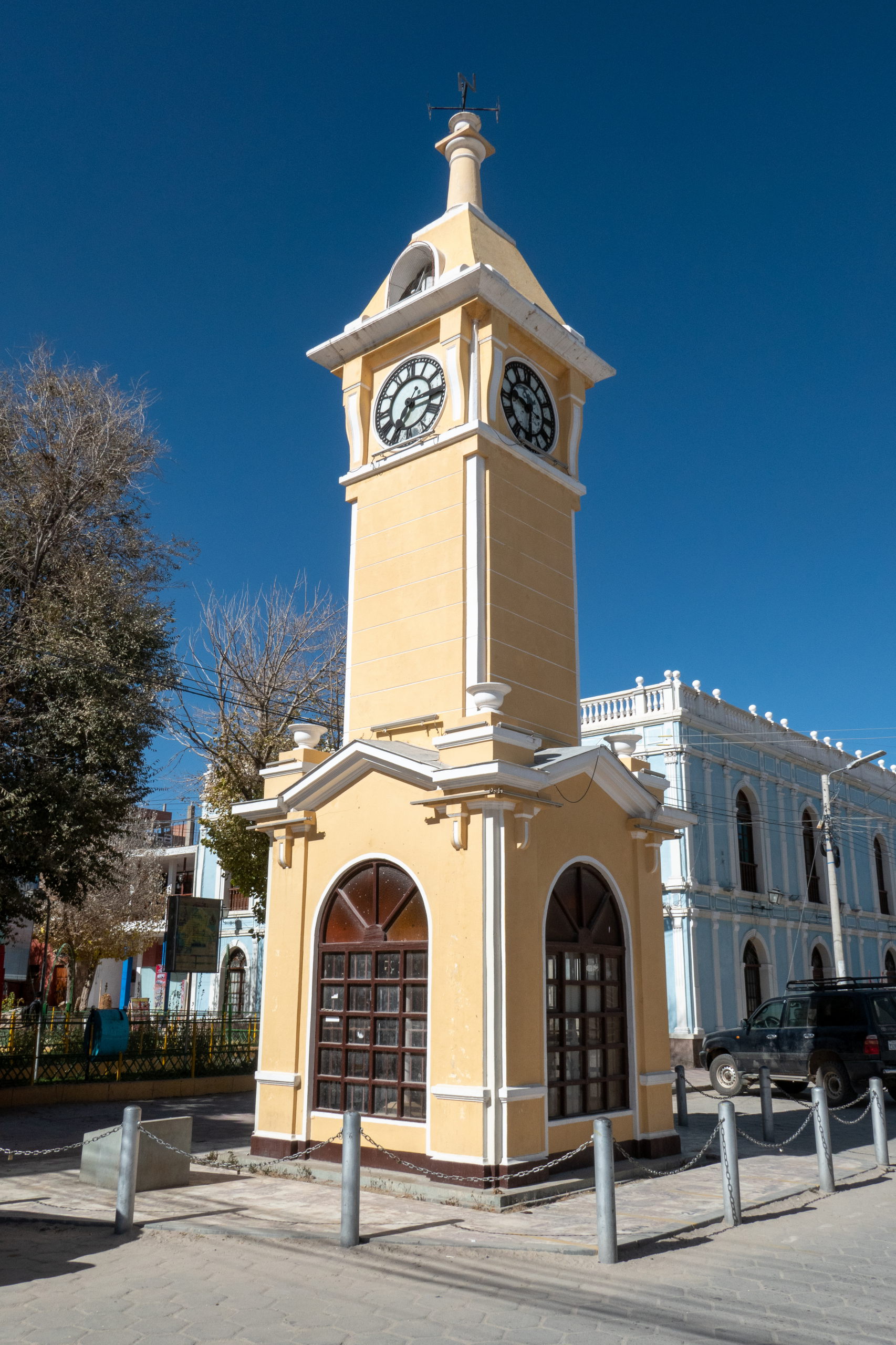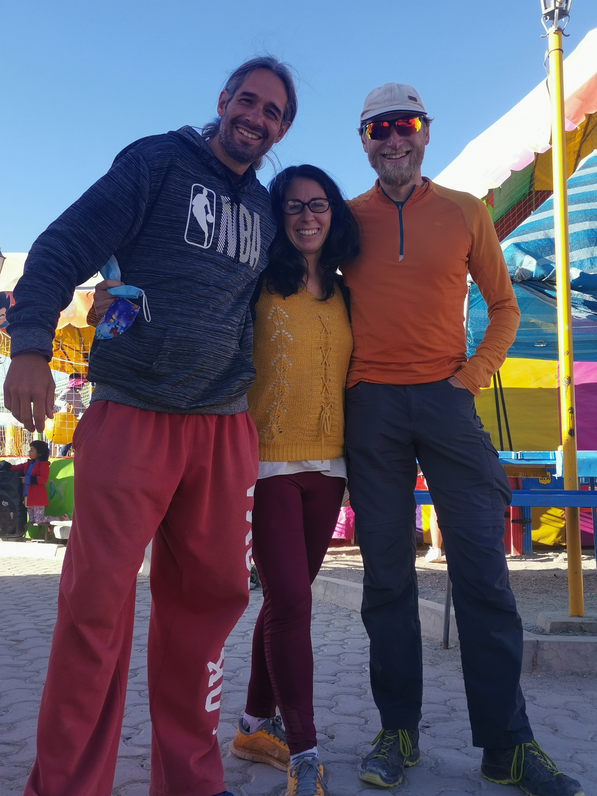 Am Plaza Prinzipal Aniceto Arce treffen wir zufällig auf Gemma und Jordi mit den beiden Mädels, die gerade einen äußerst geduldigen, kleinen Hund herum schleppen. 😁 Wir quatschen lange mit ihnen und gehen in ein winziges Restaurant vor dem ein riesiger Griller steht. Es gibt Rippchen vom Llama. Wow, schmecken die gut. Im Anschluss gehen wir noch zu einer Art Jahrmarkt für Kinder, wo sich die Mädels am Trampolin austoben dürfen. Nach einer Weile verabschieden wir uns und fragen uns bei weiteren Agenturen durch. Schließlich werden wir fündig und das zu einem viel günstigeren Preis. Zuschlag. Wir kaufen noch Bier für die perspektivischen Fotos und eines für gleich. Das es draußen schon dunkel und kalt ist, trinken wir das Bierchen im Hotel.