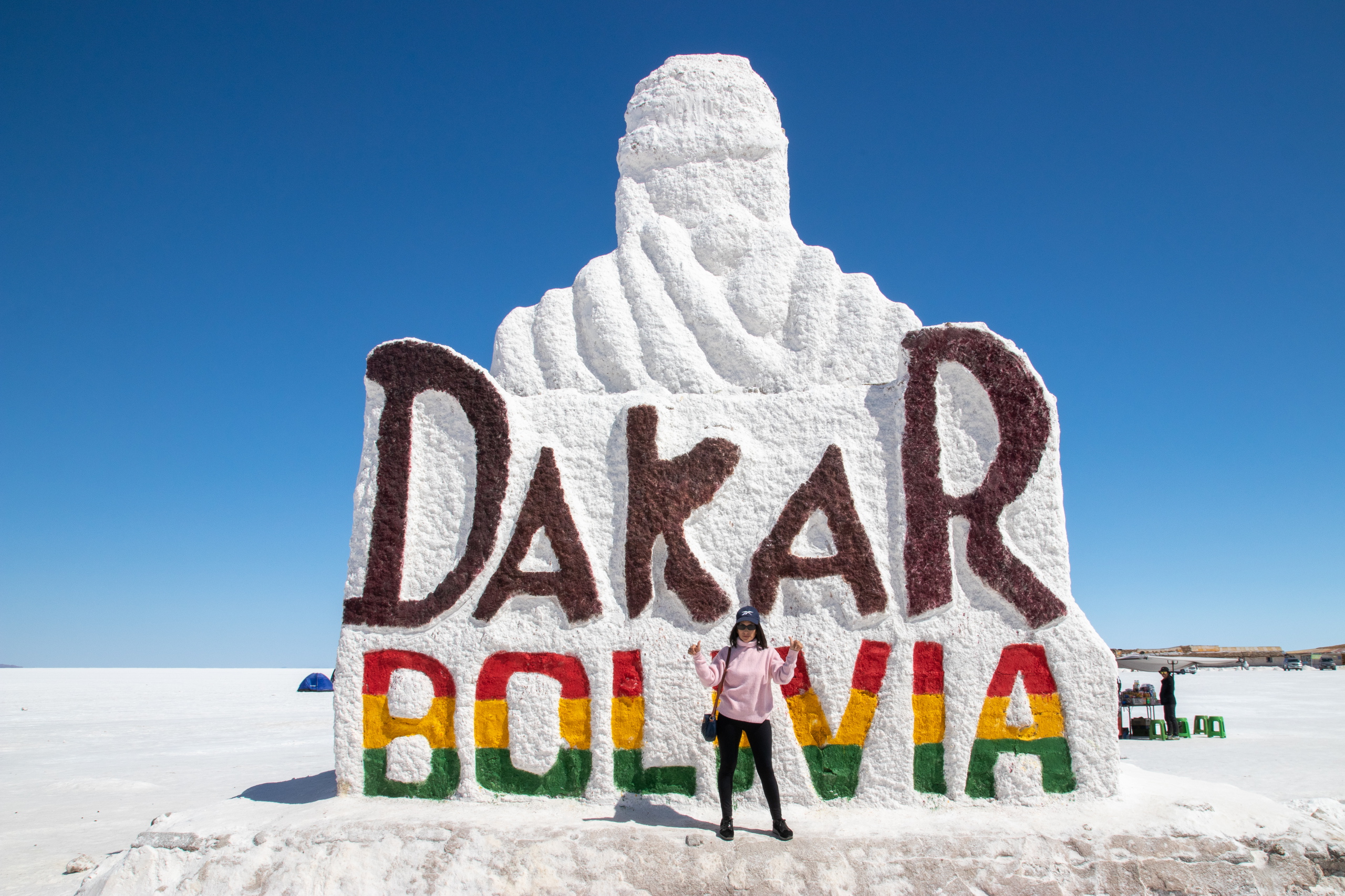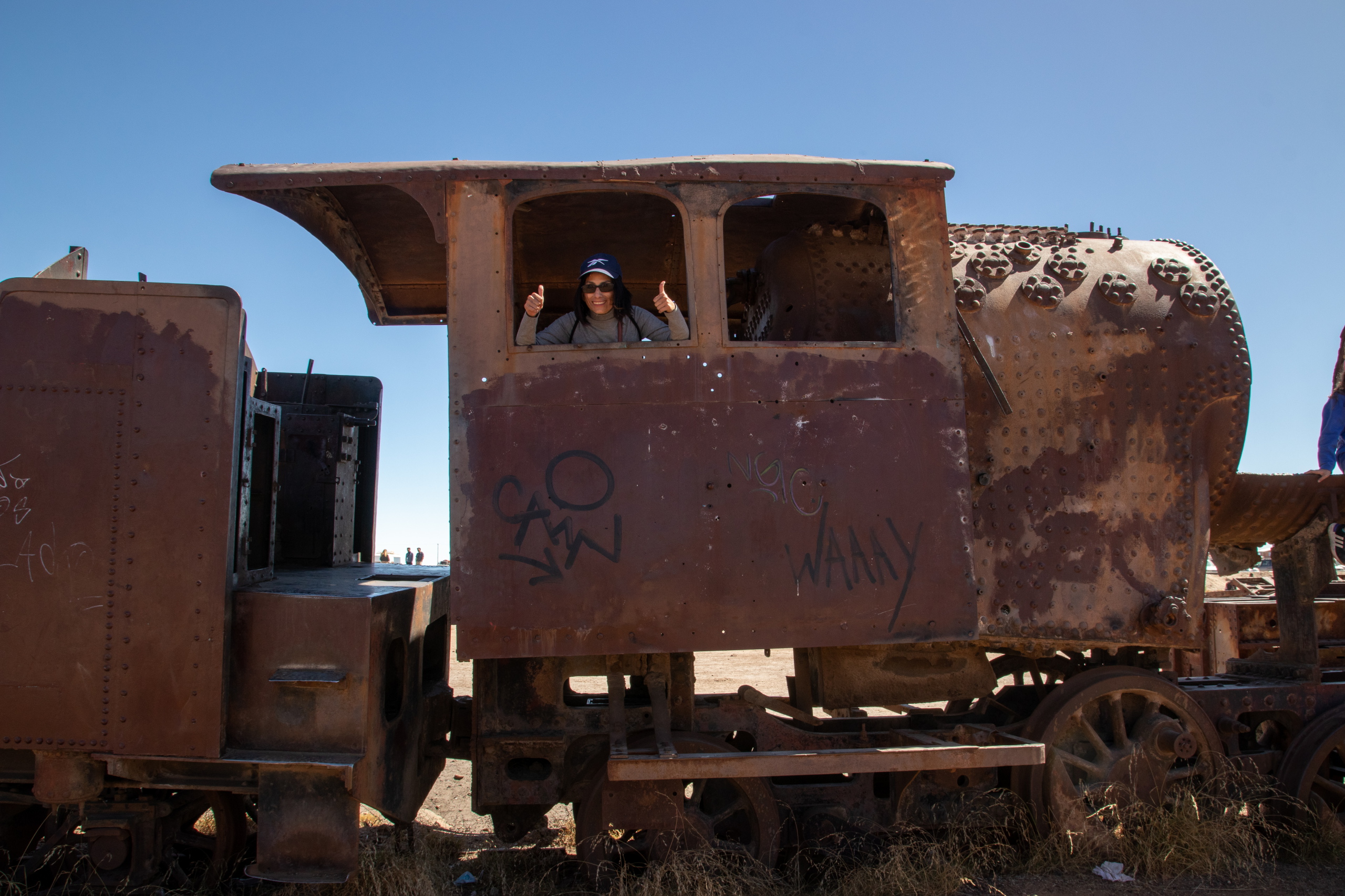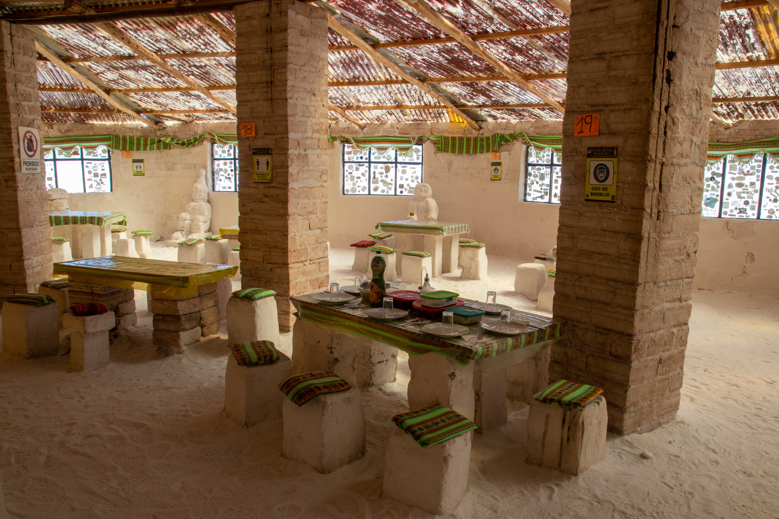 Nach dem Frühstück gehen wir zum Busterminal und ich kaufe ein Ticket für den Nachtbus nach La Paz. Im Anschluss geht es zur Agentur wo wir mit unserer Tour um halb elf Uhr starten. Die ersten beiden Punkte sind gleich zu meiner Tour und wir besichtigen den Cementerio de los Trenes und das Salzmuseum in Colchani. Die Ojos de Salar sind auch für mich neu. Hier quillt Wasser von den Flüssen unterhalb der Salar an die Oberfläche. Spannend, wenn man sich vorstellt, dass unter einem jede Menge Wasser ist. Im Anschluss geht es noch zum Monumento al Dakar und zum Saltzhotel.
