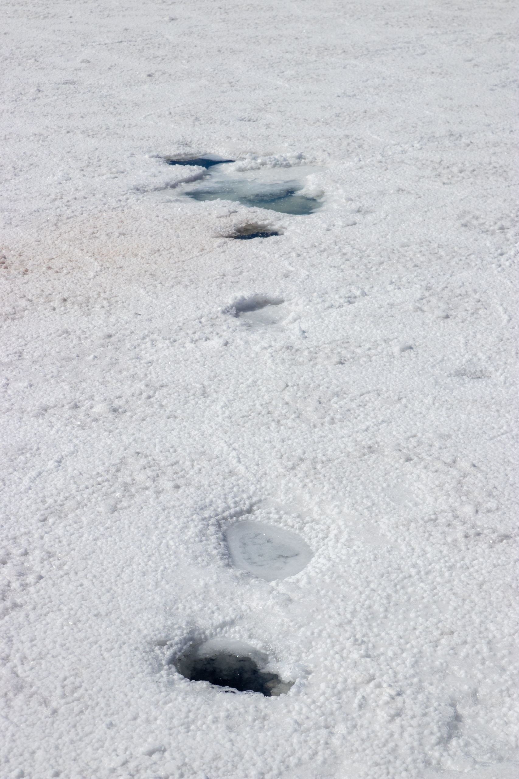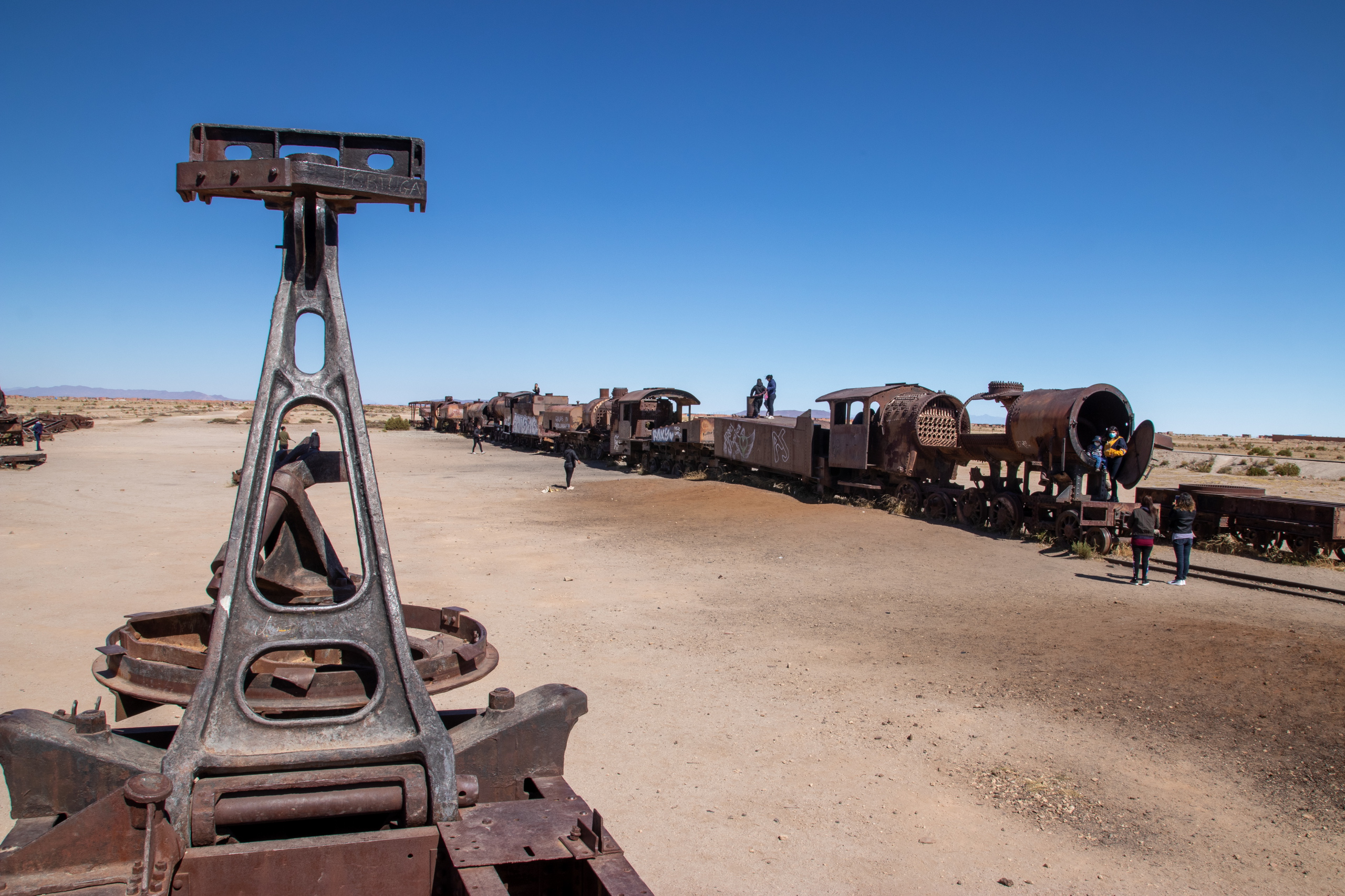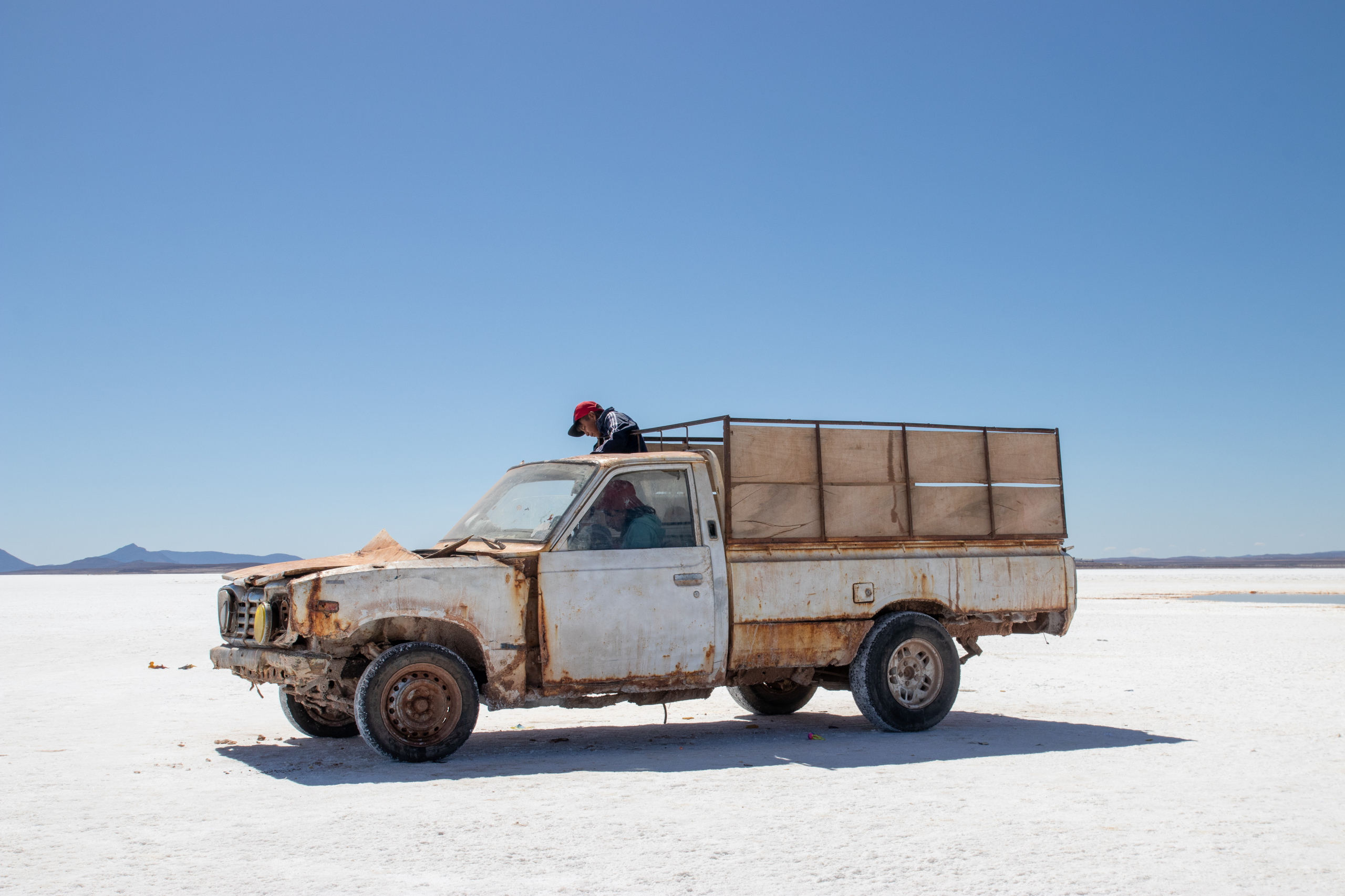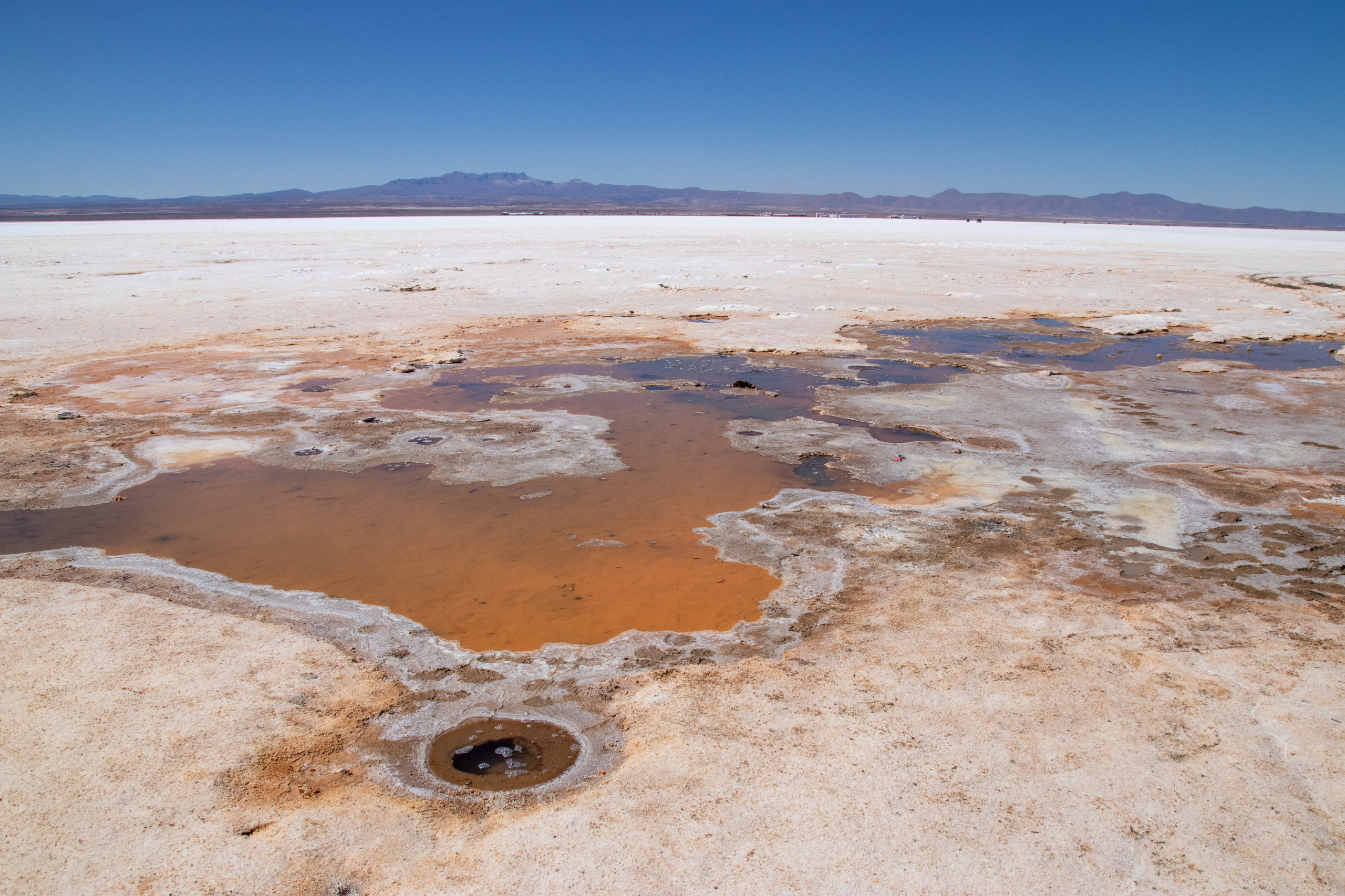 Nach dem Frühstück gehen wir zum Busterminal und ich kaufe ein Ticket für den Nachtbus nach La Paz. Im Anschluss geht es zur Agentur wo wir mit unserer Tour um halb elf Uhr starten. Die ersten beiden Punkte sind gleich zu meiner Tour und wir besichtigen den Cementerio de los Trenes und das Salzmuseum in Colchani. Die Ojos de Salar sind auch für mich neu. Hier quillt Wasser von den Flüssen unterhalb der Salar an die Oberfläche. Spannend, wenn man sich vorstellt, dass unter einem jede Menge Wasser ist. Im Anschluss geht es noch zum Monumento al Dakar und zum Saltzhotel.