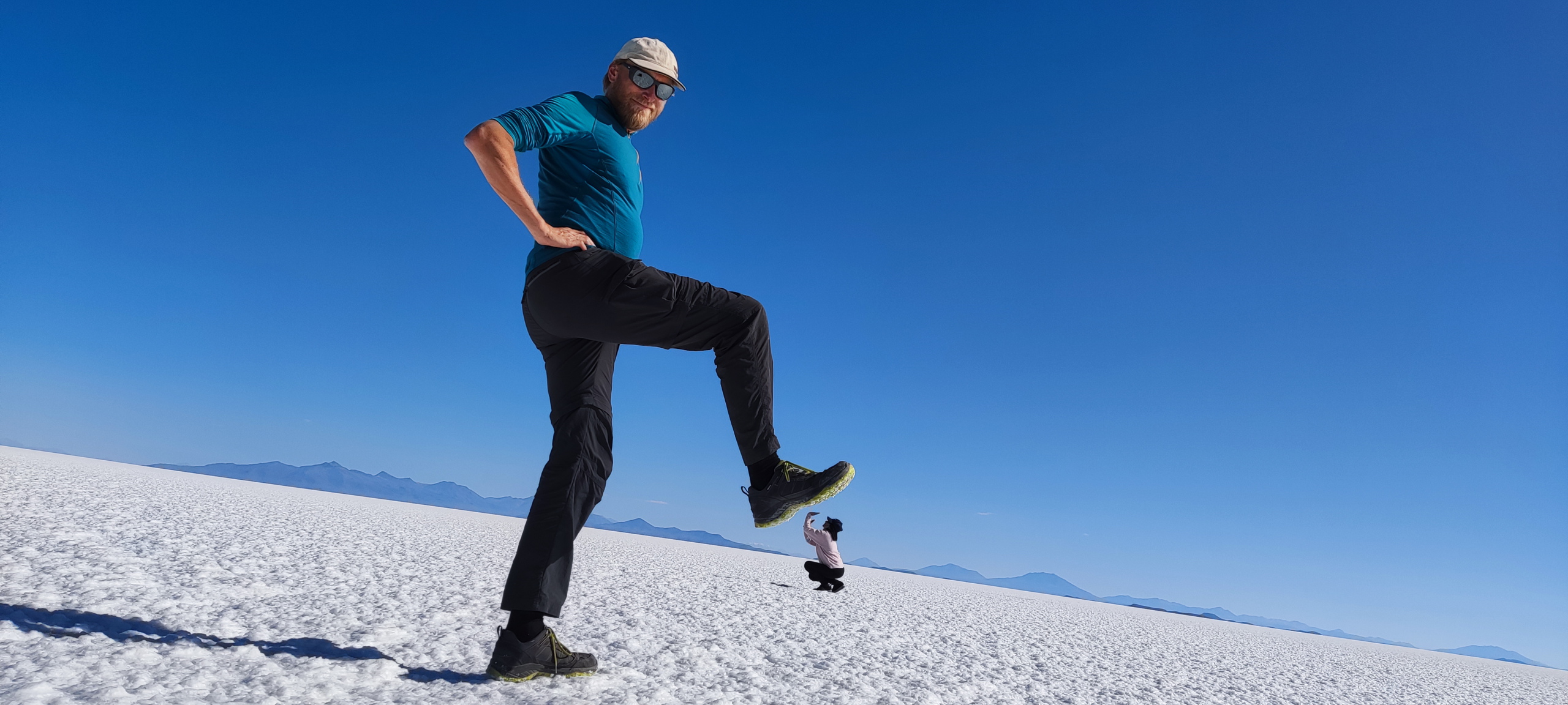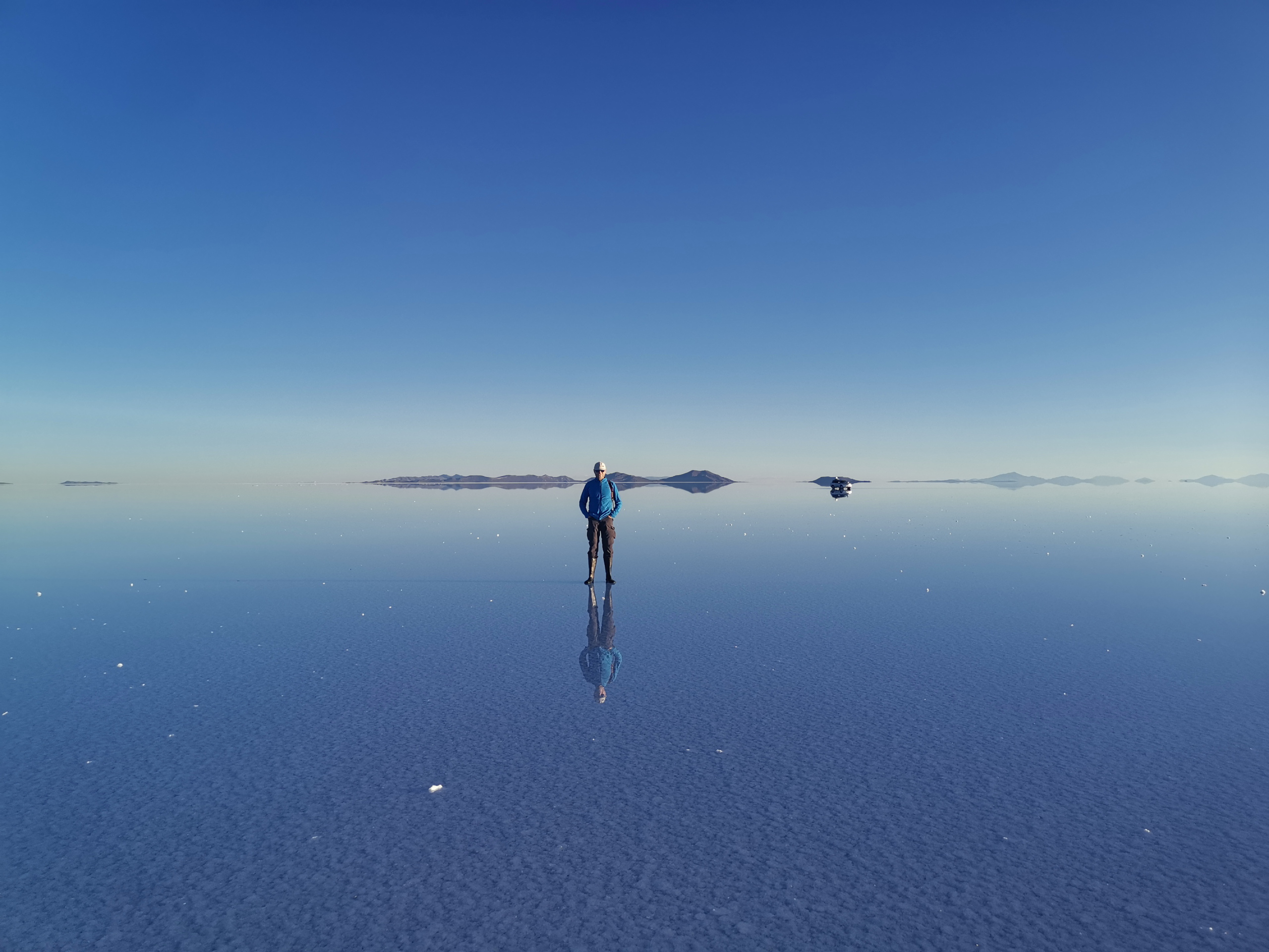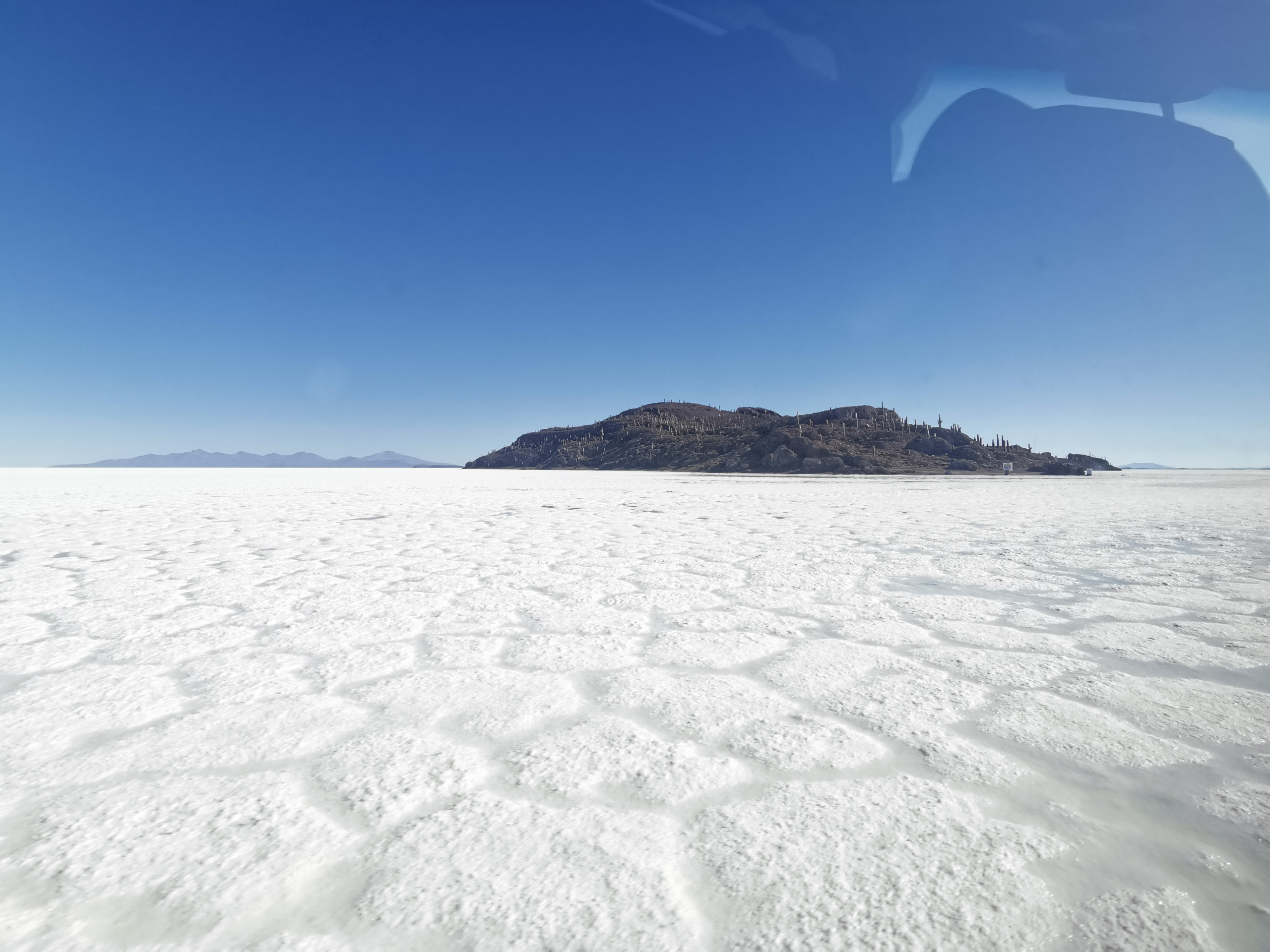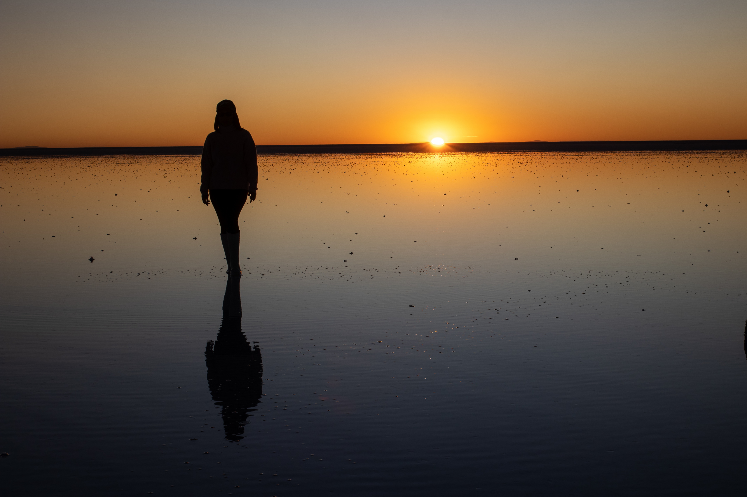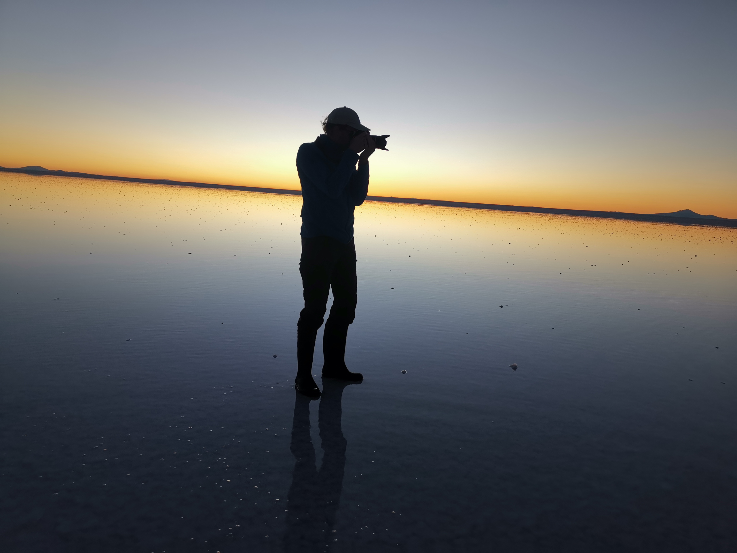 Bevor es weitergeht werden Gummistiefel ausgeteilt. Mit entspannten 140 Sachen krachen wir in Richtung Uyuni, wo noch Reste vom Wasser aus der Regenzeit sind. Es weht kein Lüftchen und das Wasser ist spiegelglatt. Wir machen viele Fotos und unser Fahrer macht ein Video, während er uns mit dem Auto umkreist. Der Sonnenuntergang fällt leider etwas mau aus, da die Wolken fehlen. Aber das ist Jammern auf hohem Niveau.